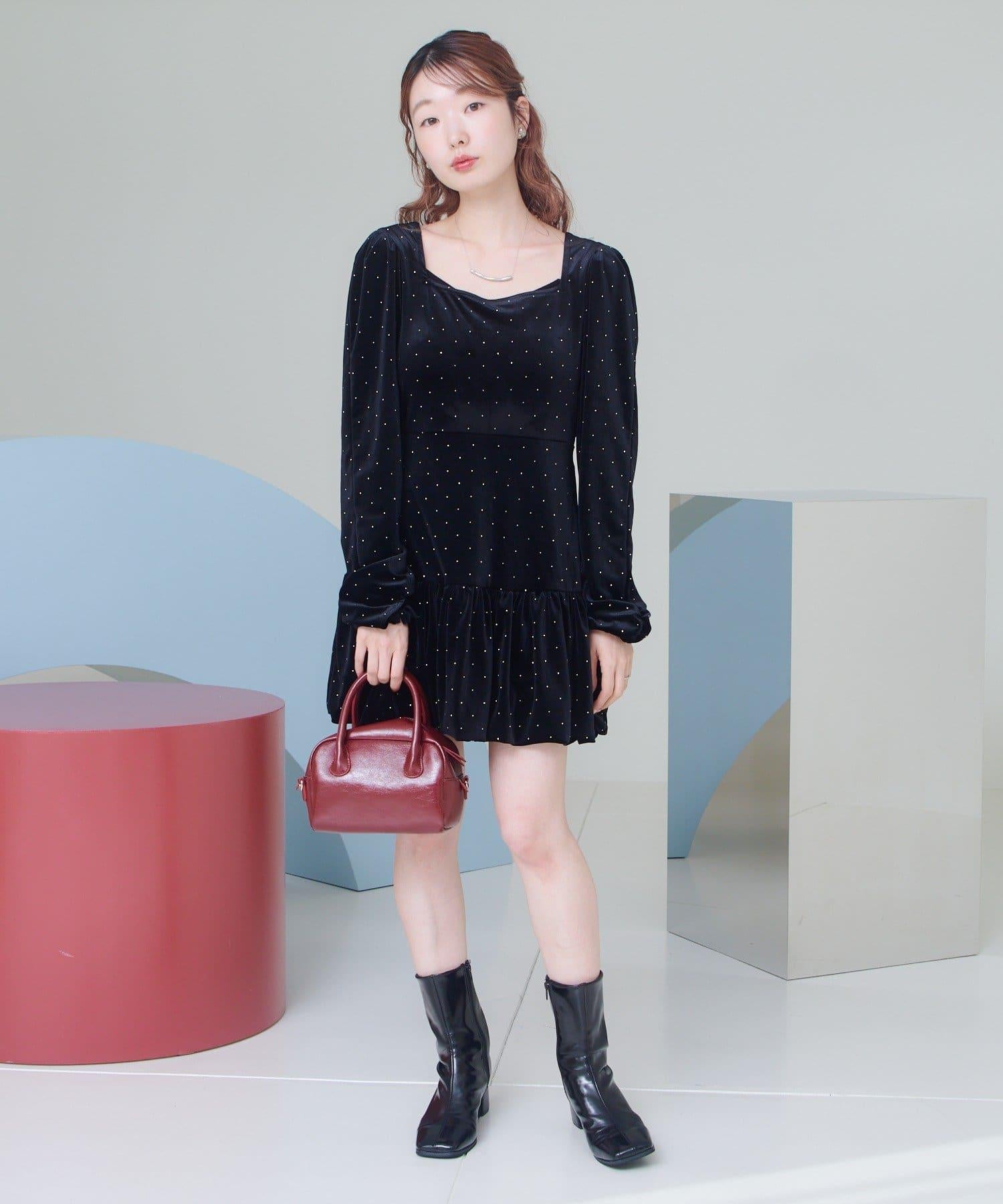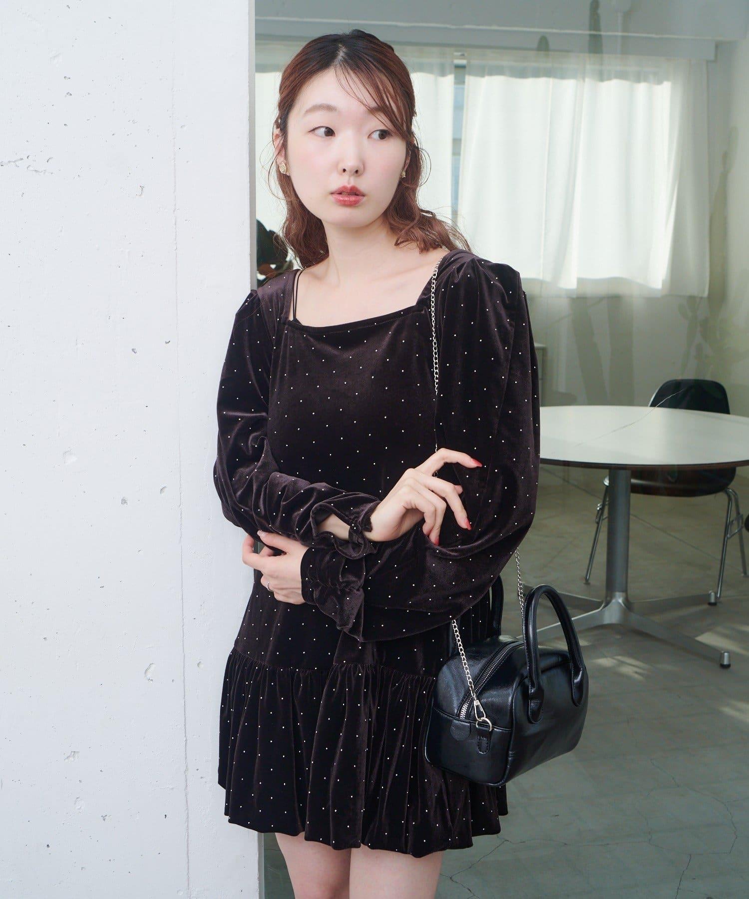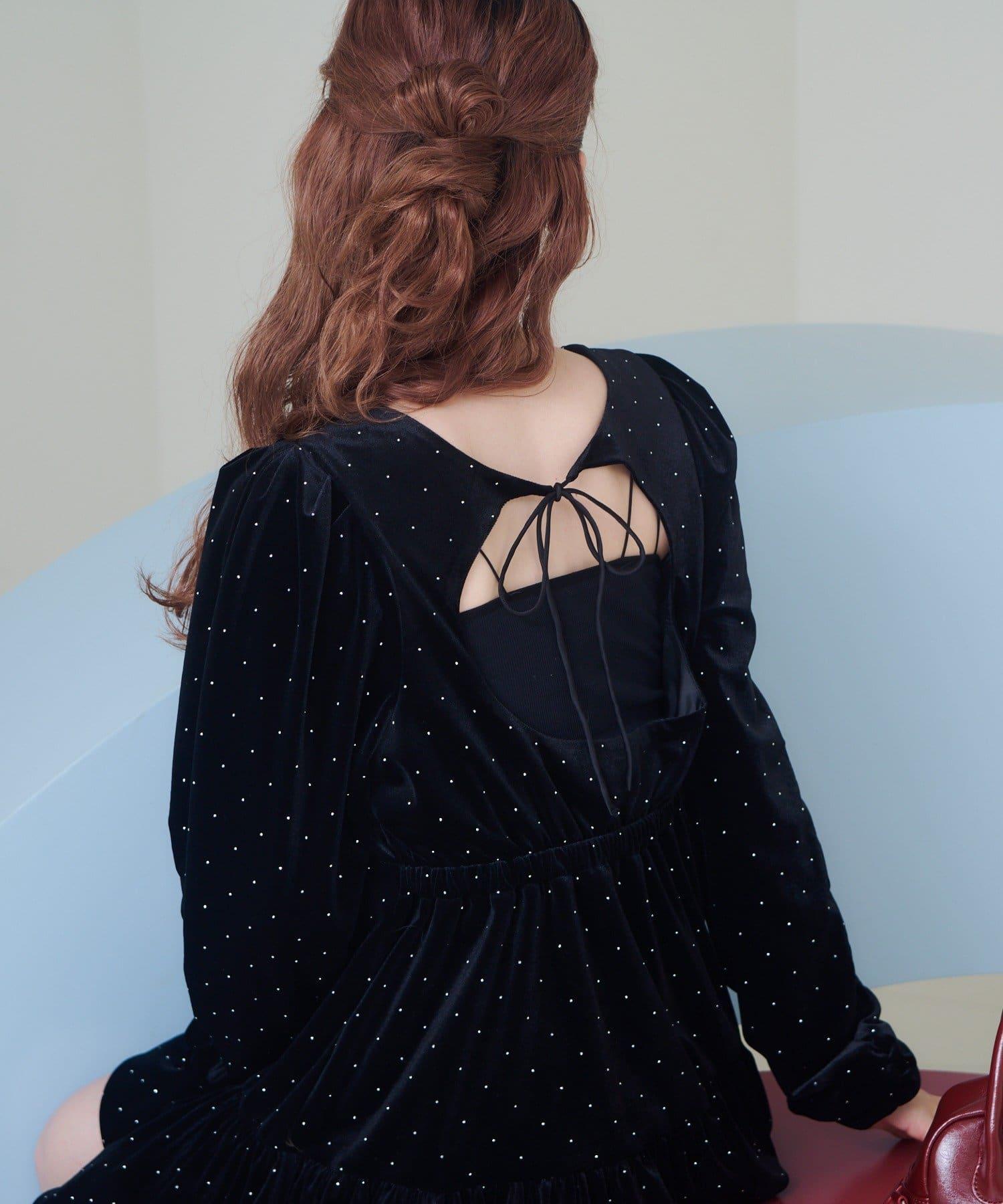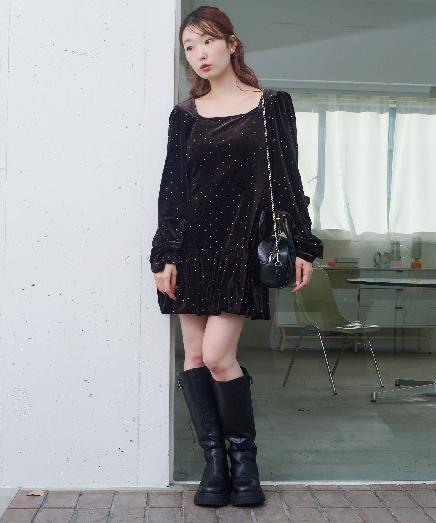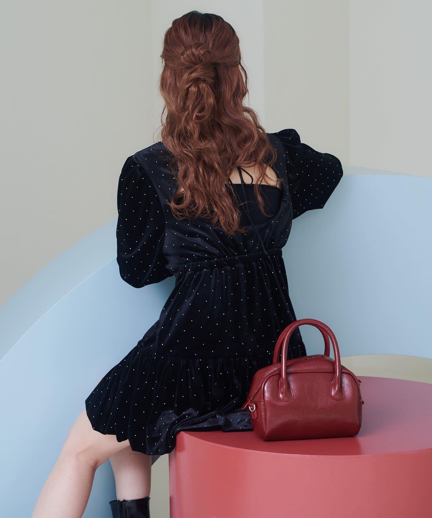 天鵝絨迷你連衣裙,飾有閃閃發光的精美鉚釘。