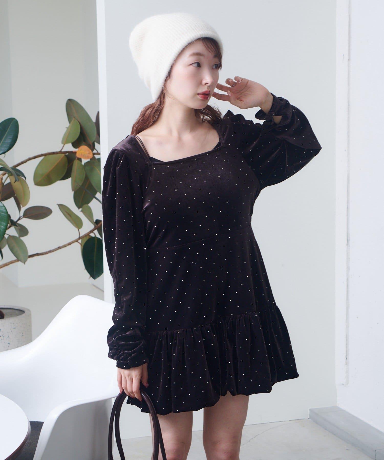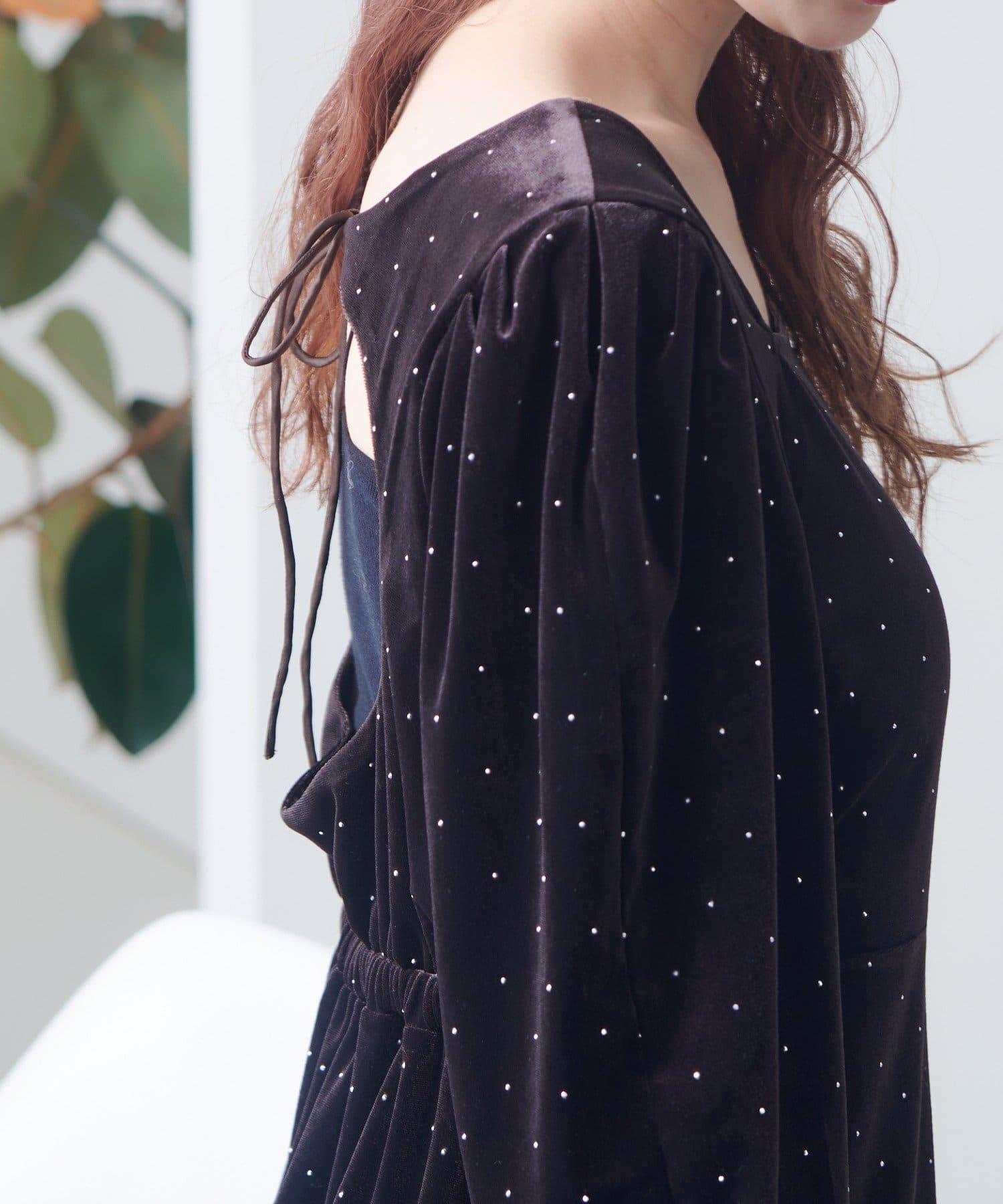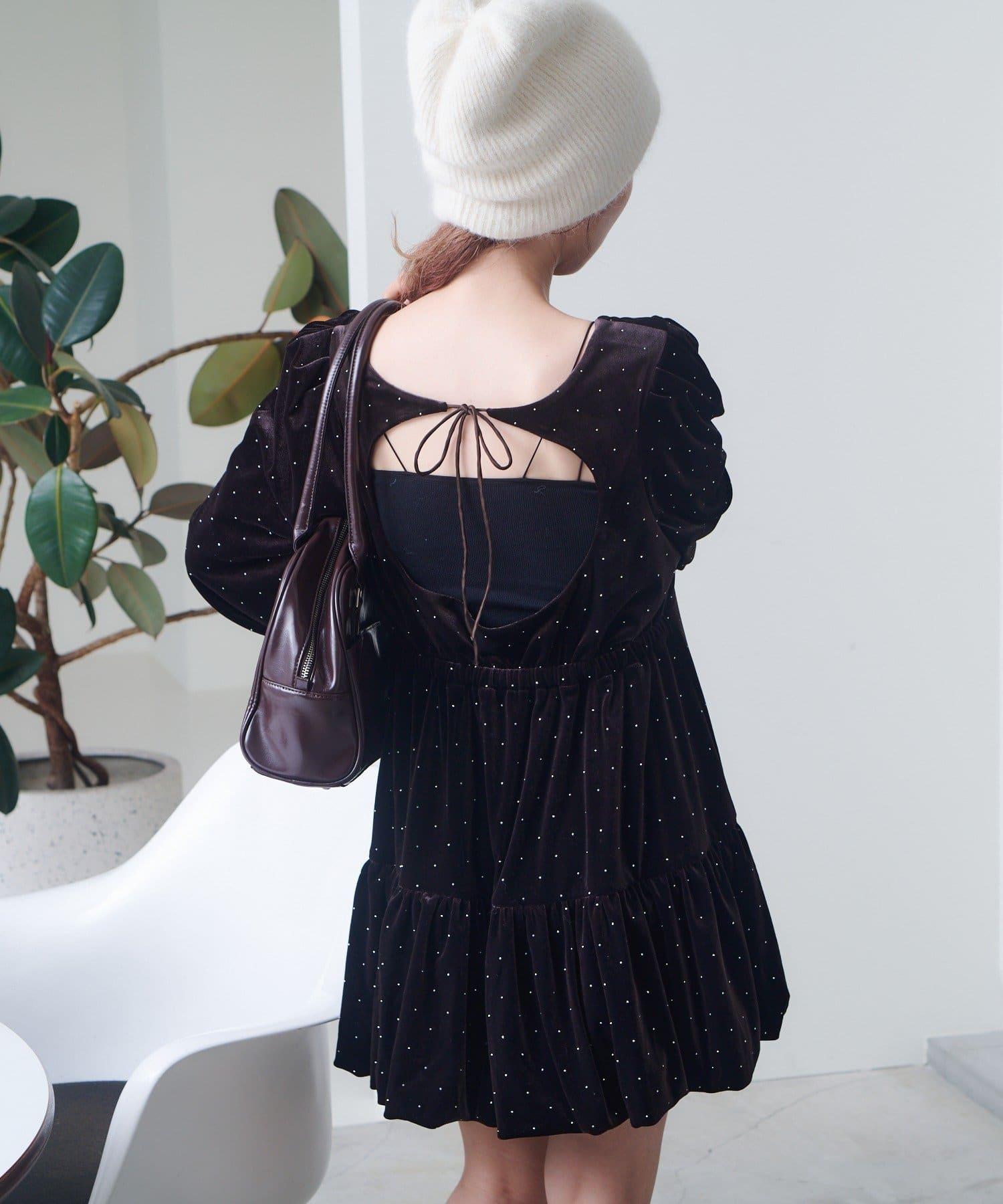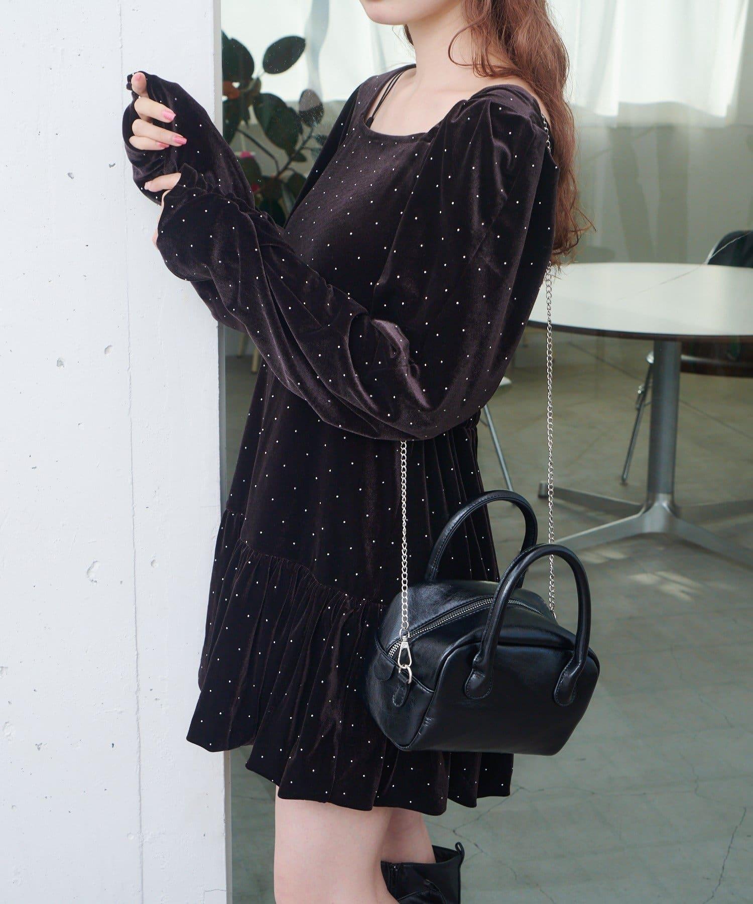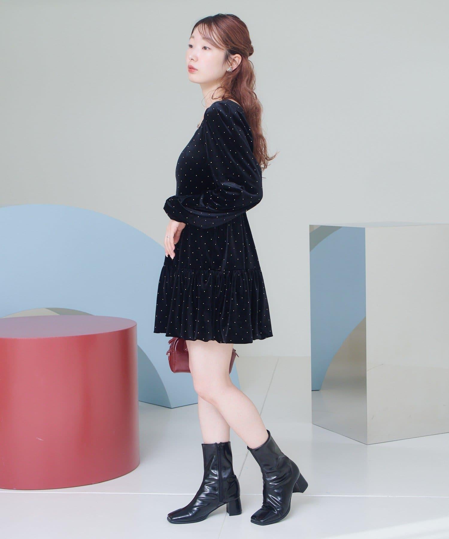 天鵝絨迷你連衣裙,飾有閃閃發光的精美鉚釘。