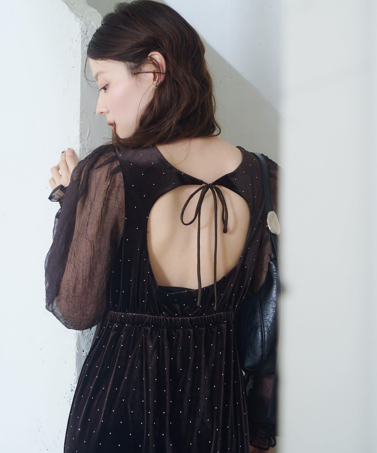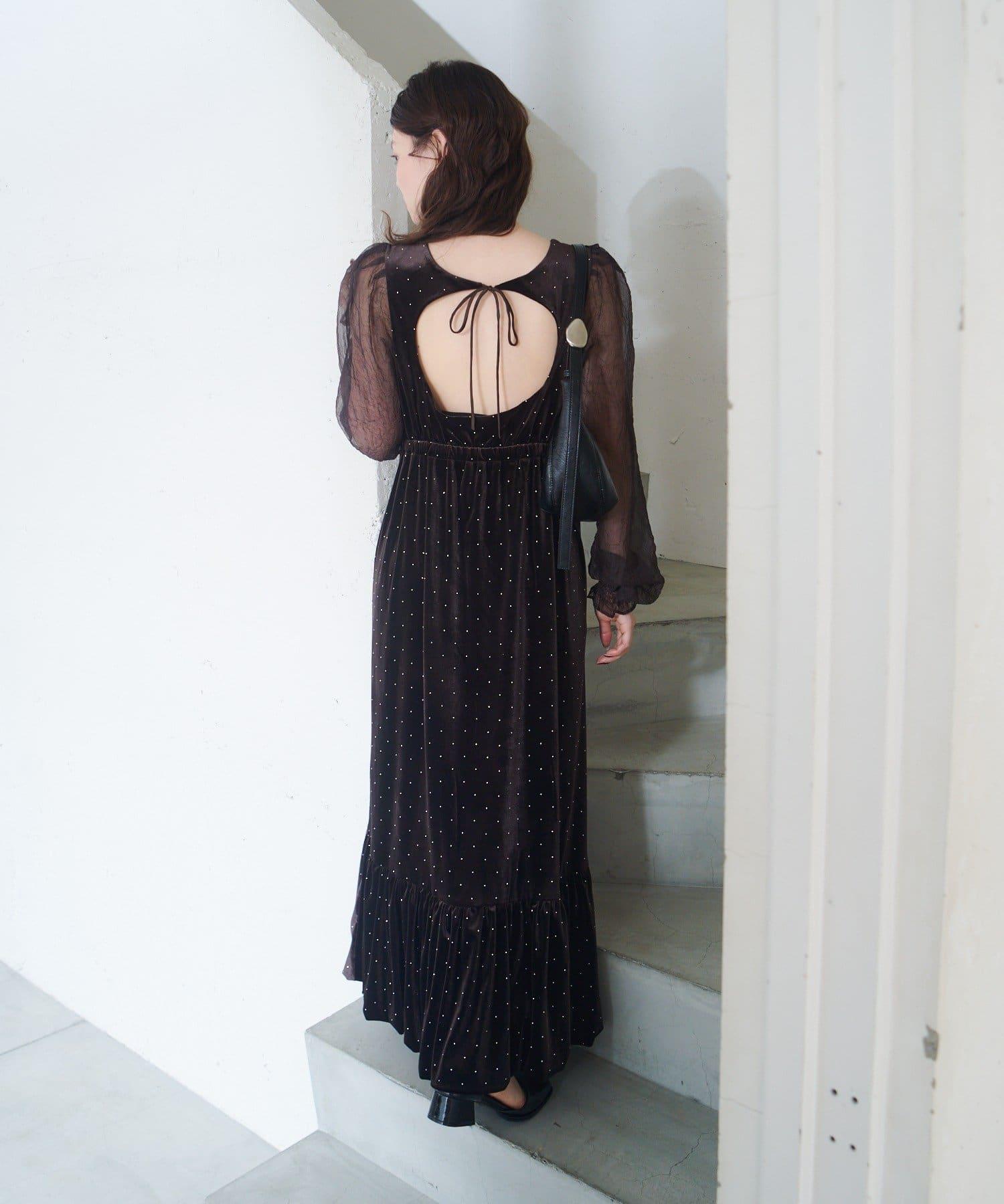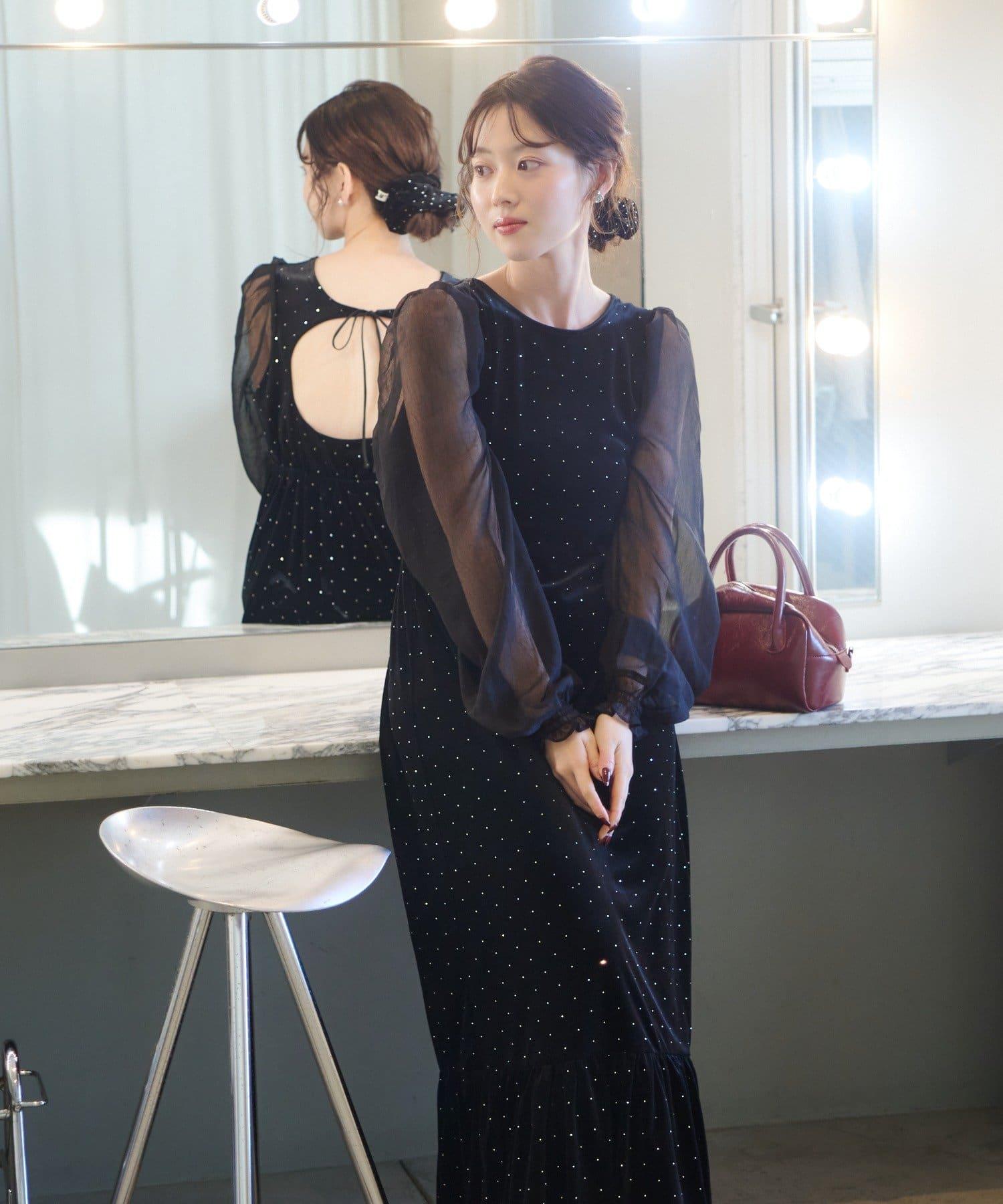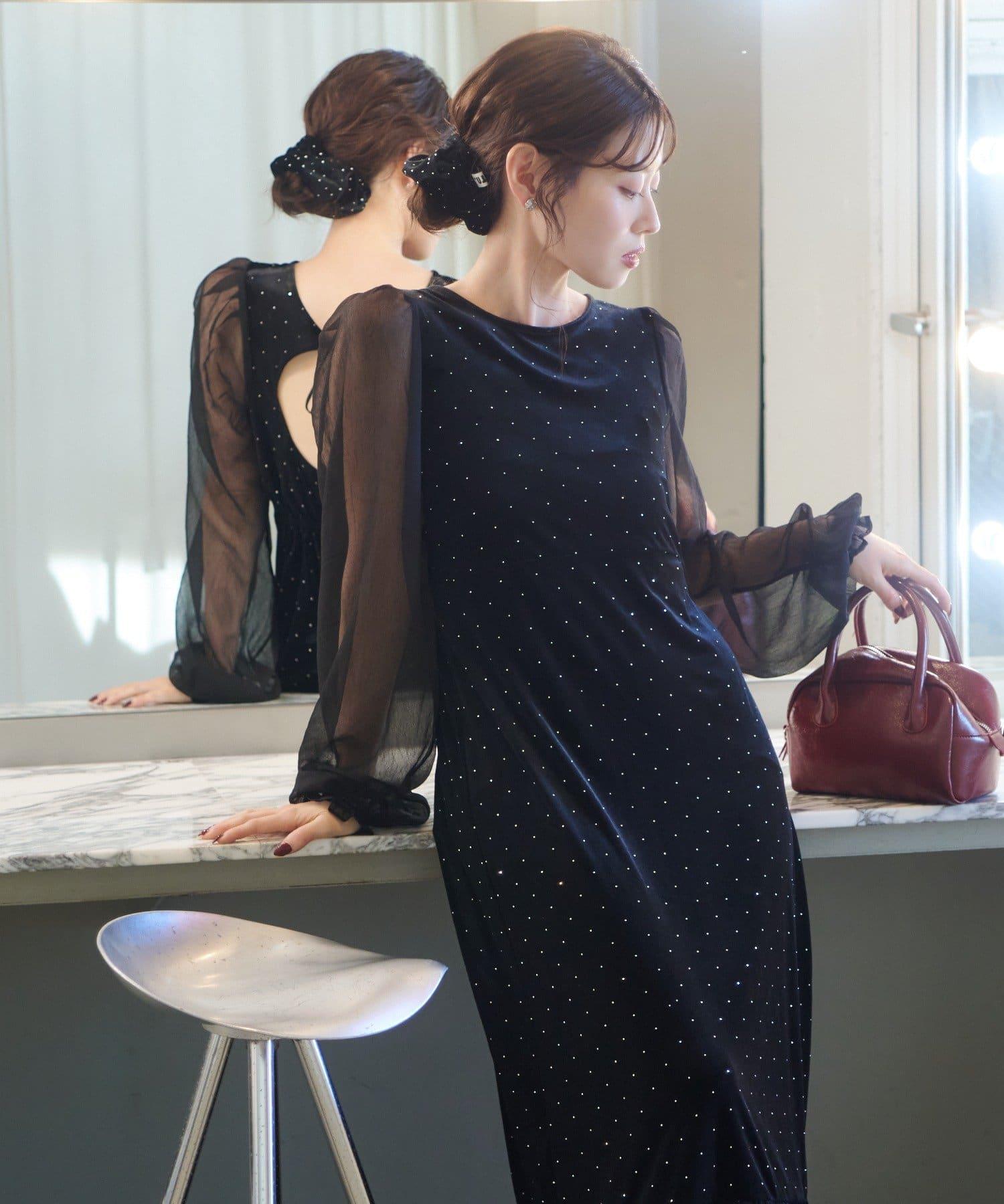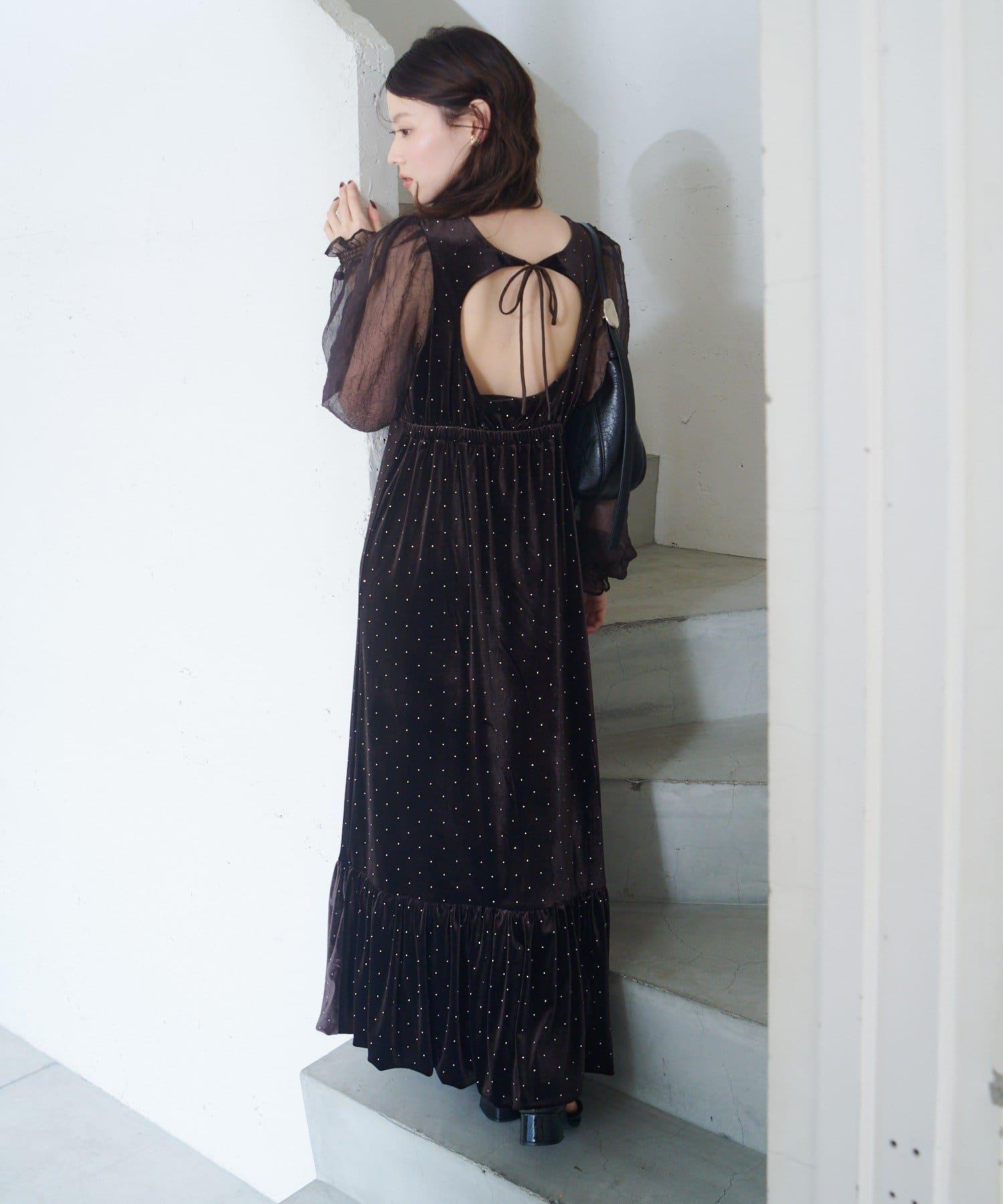 絲絨連衣裙,鉚釘散落其間,閃耀著微妙的光澤。