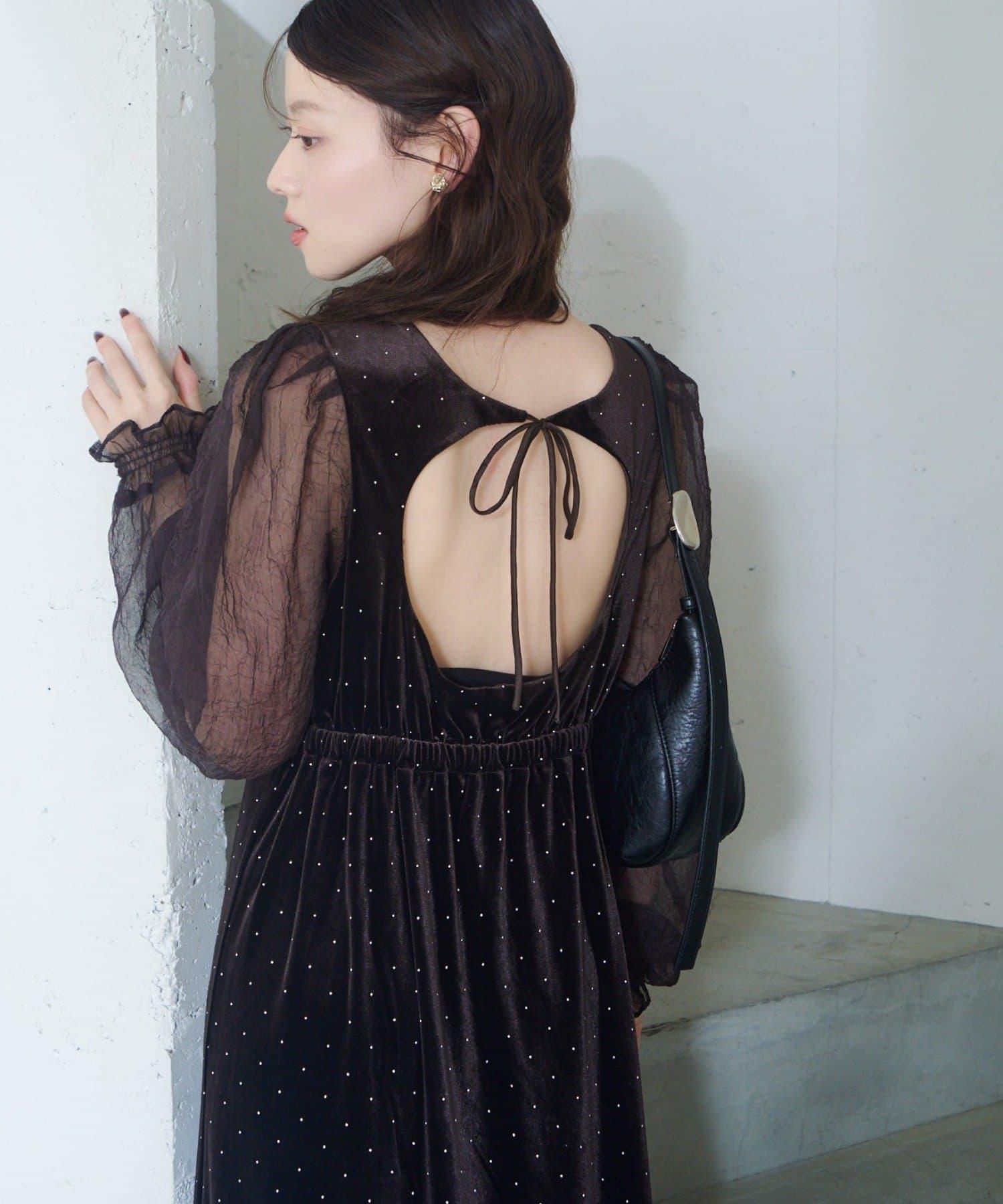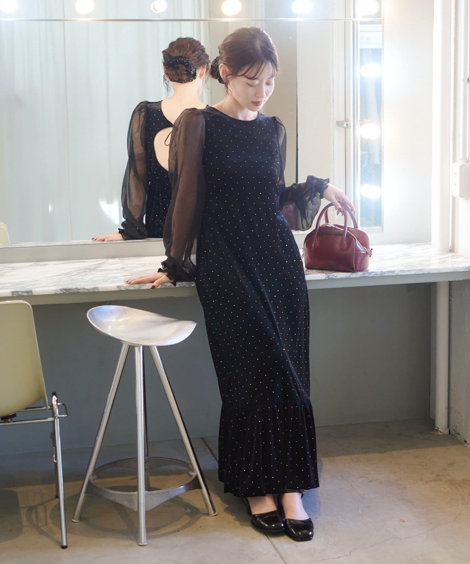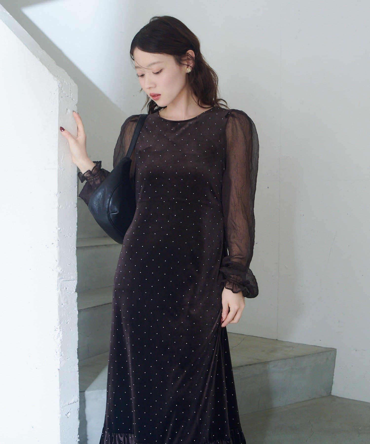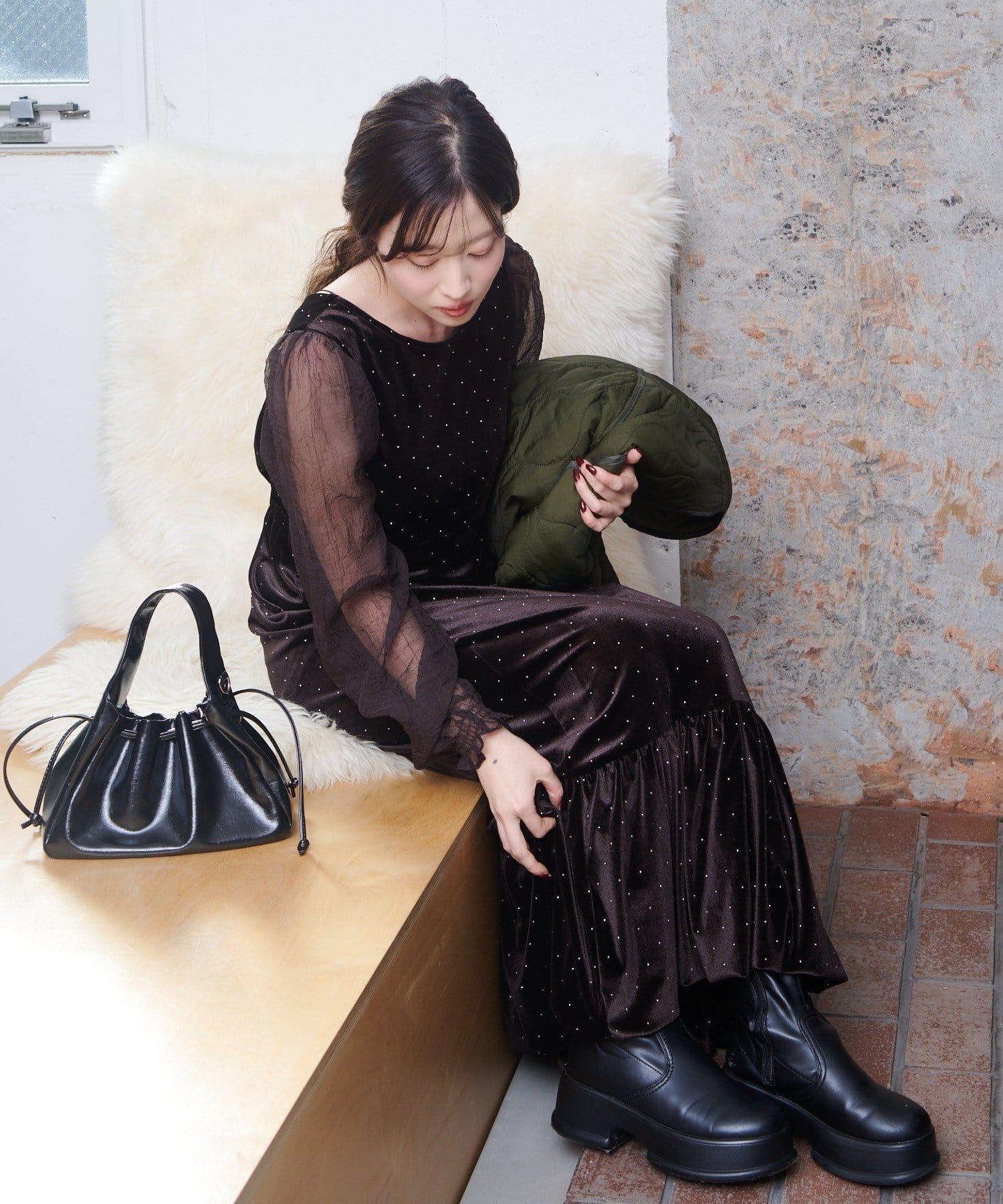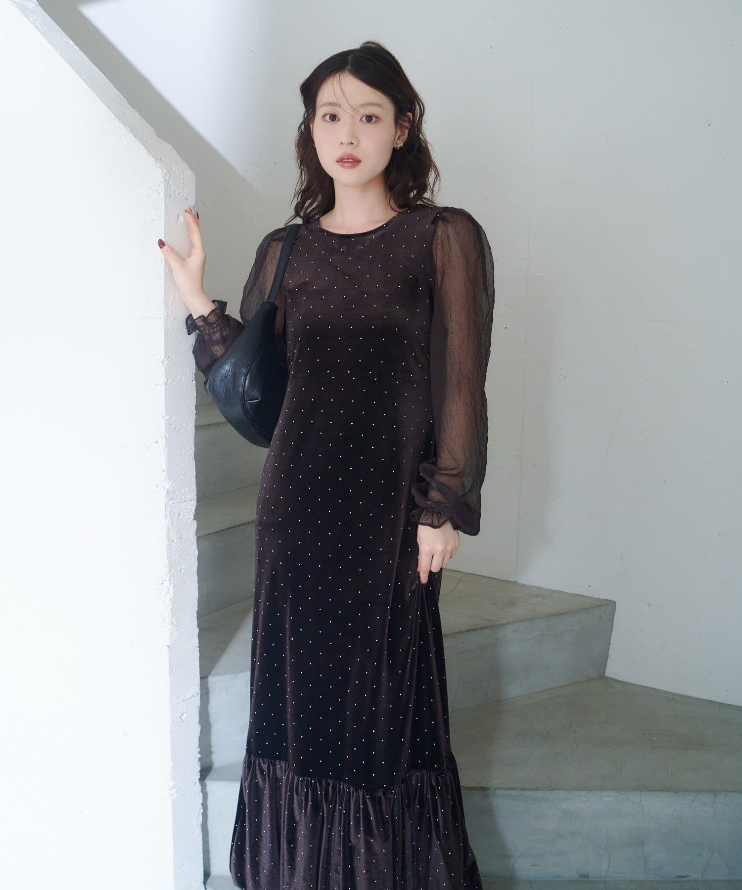 絲絨連衣裙,鉚釘散落其間,閃耀著微妙的光澤。
