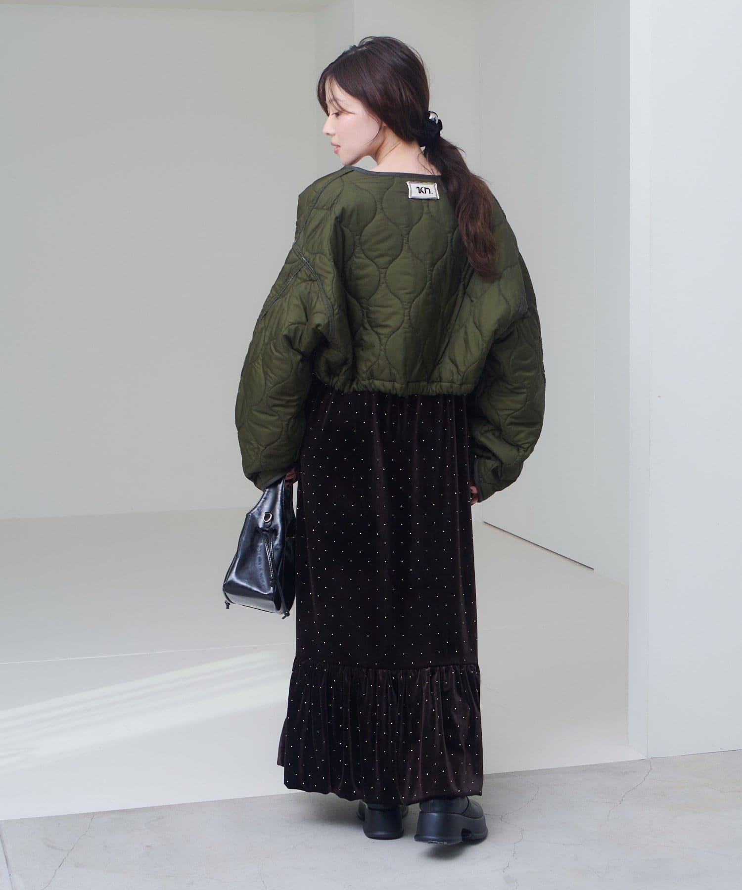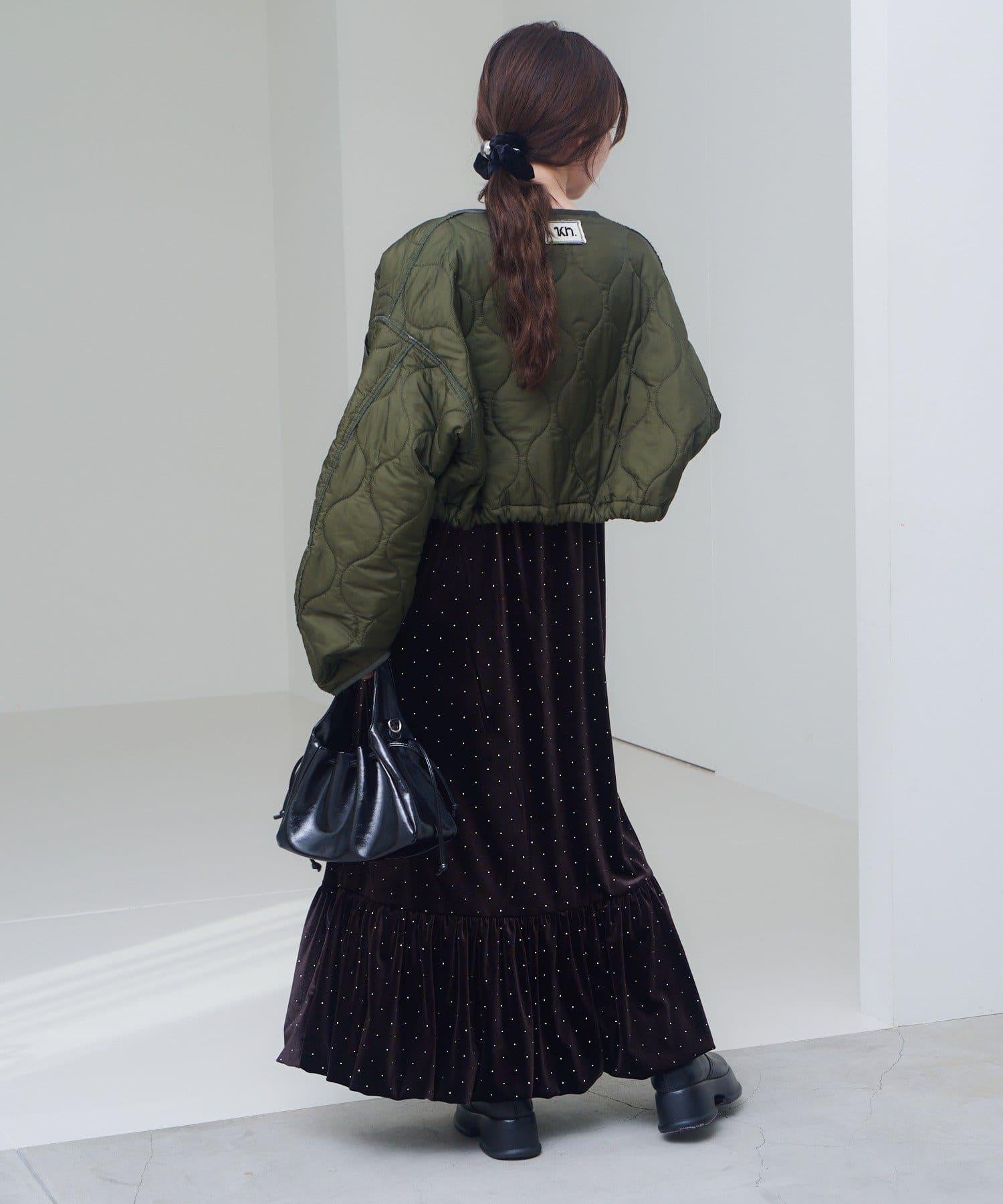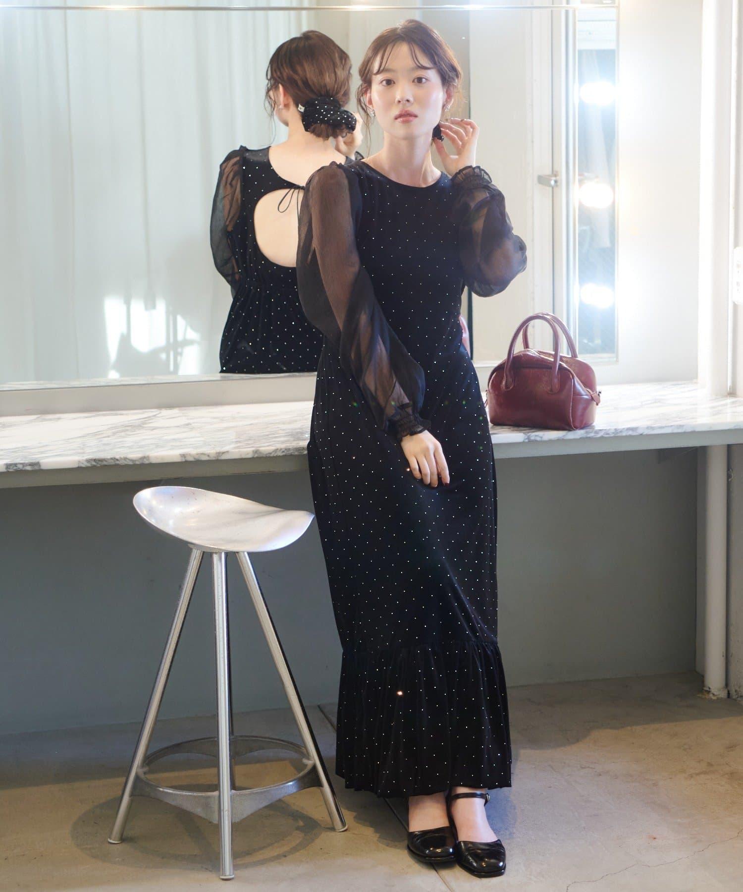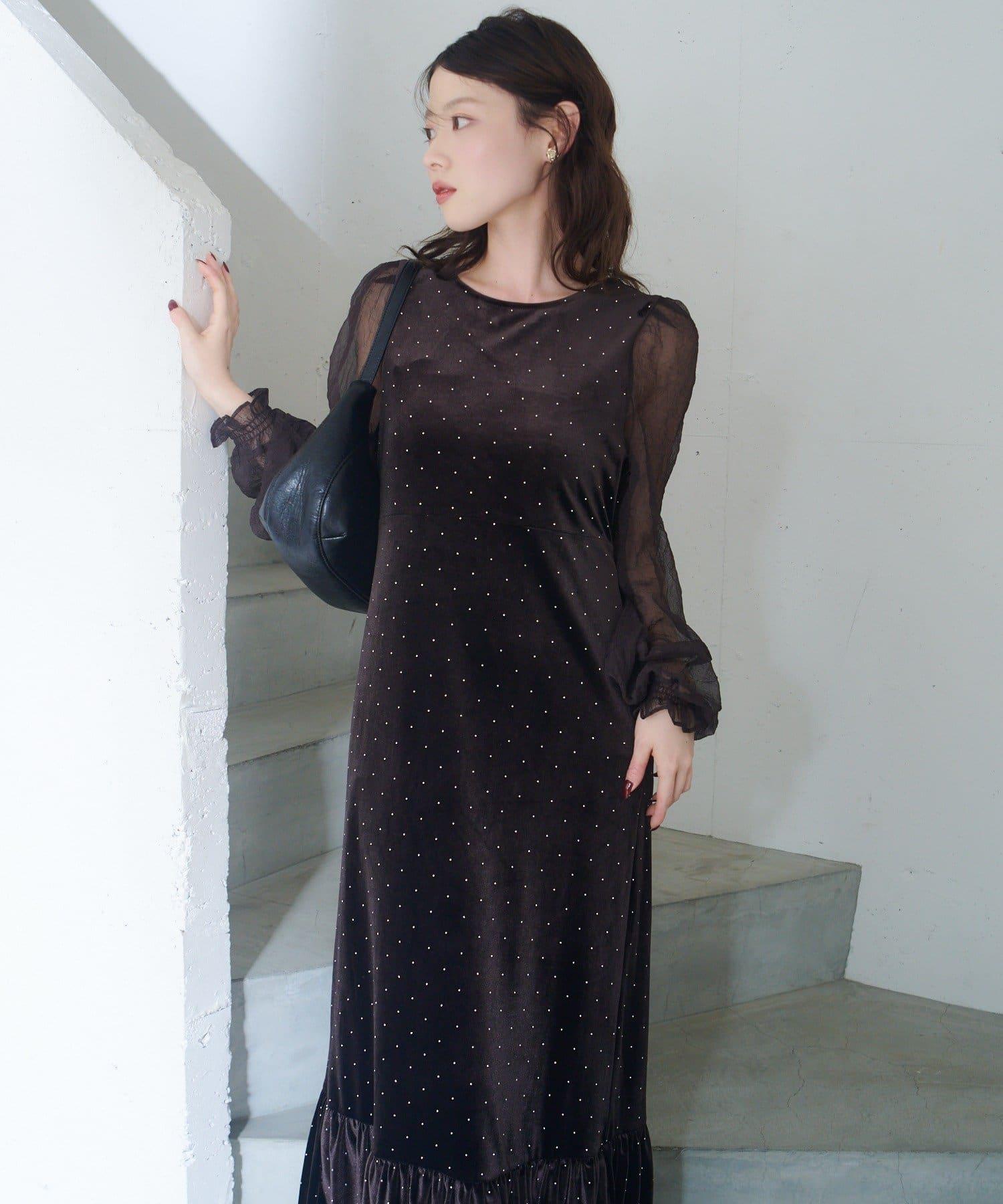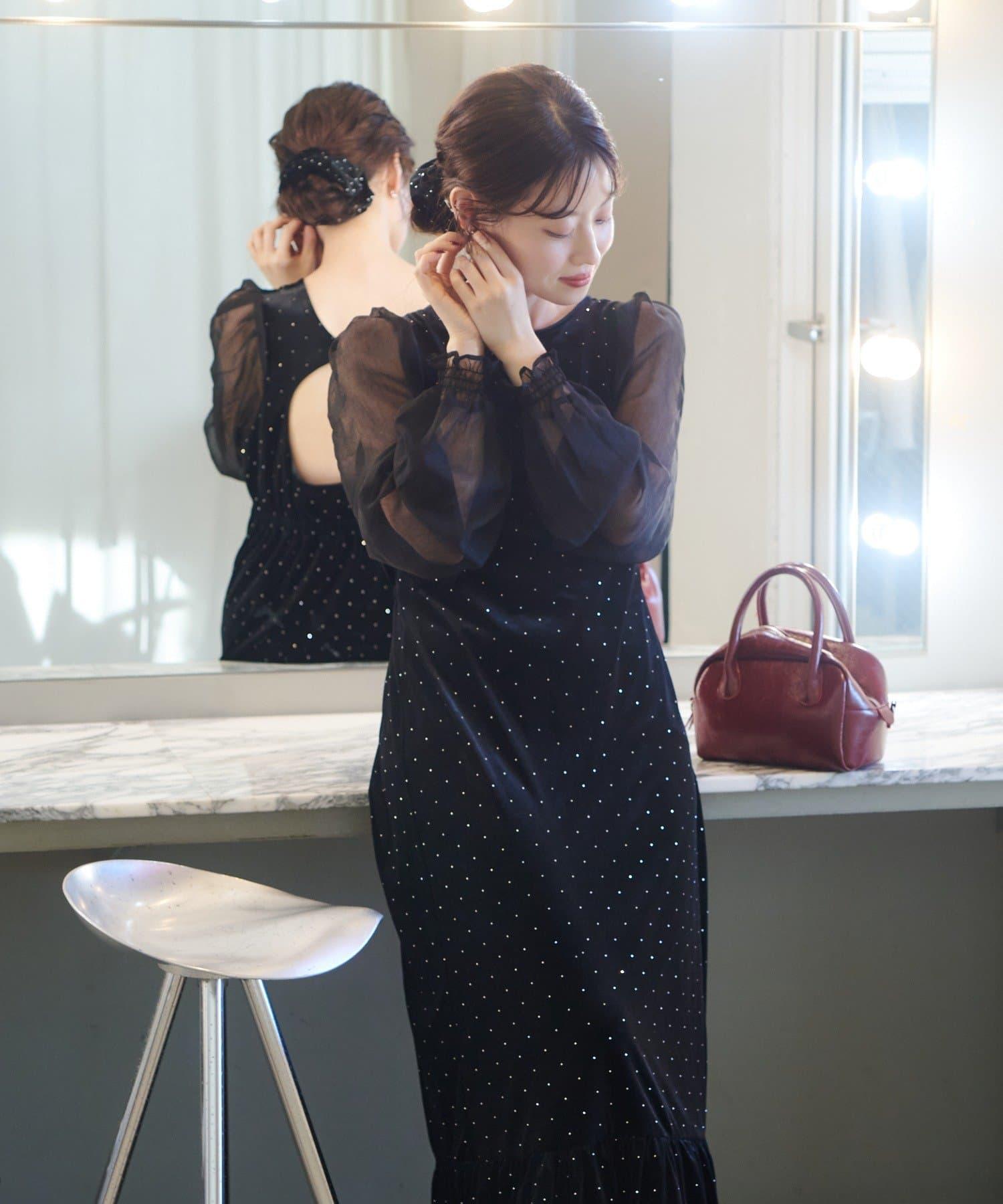 絲絨連衣裙,鉚釘散落其間,閃耀著微妙的光澤。