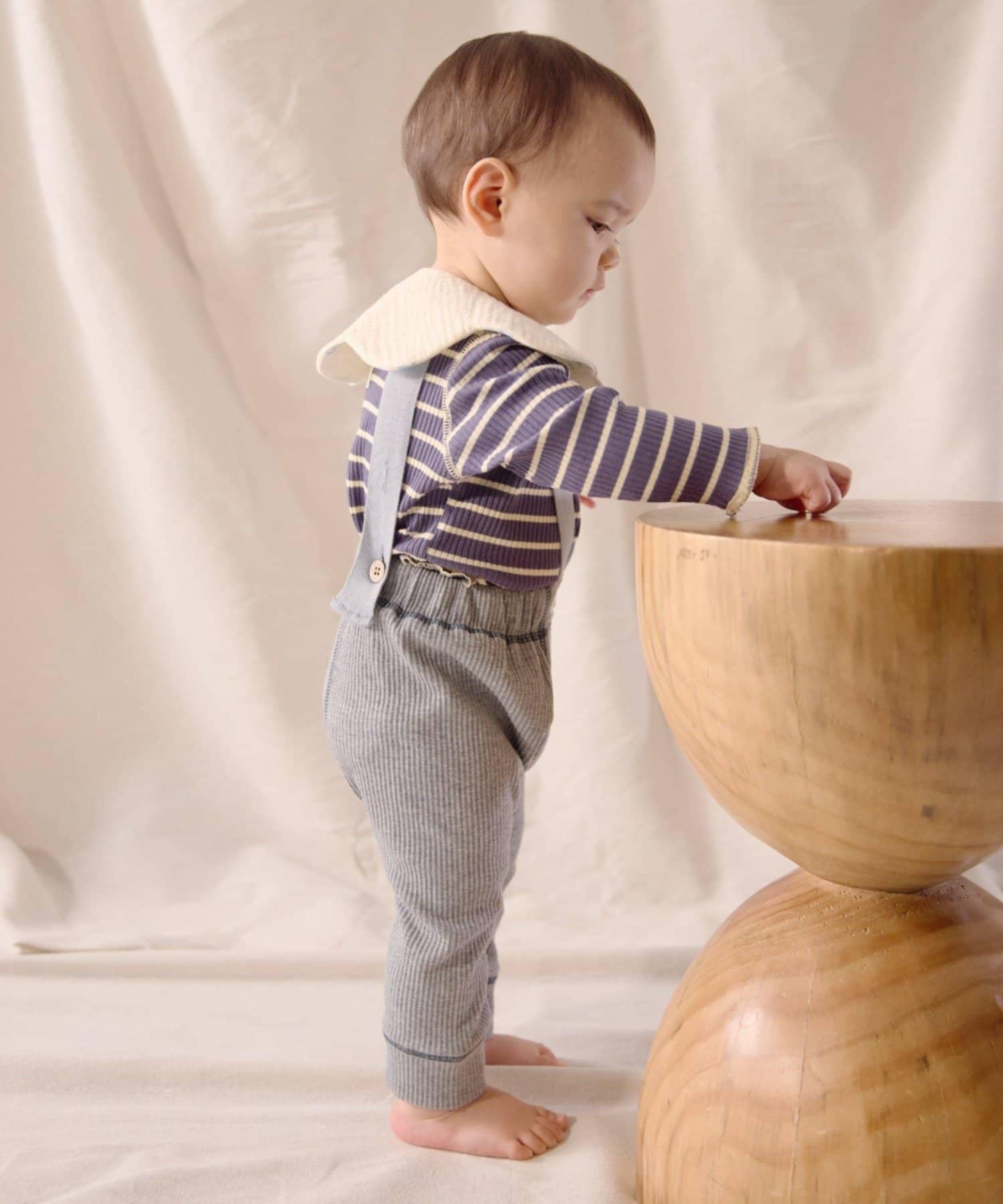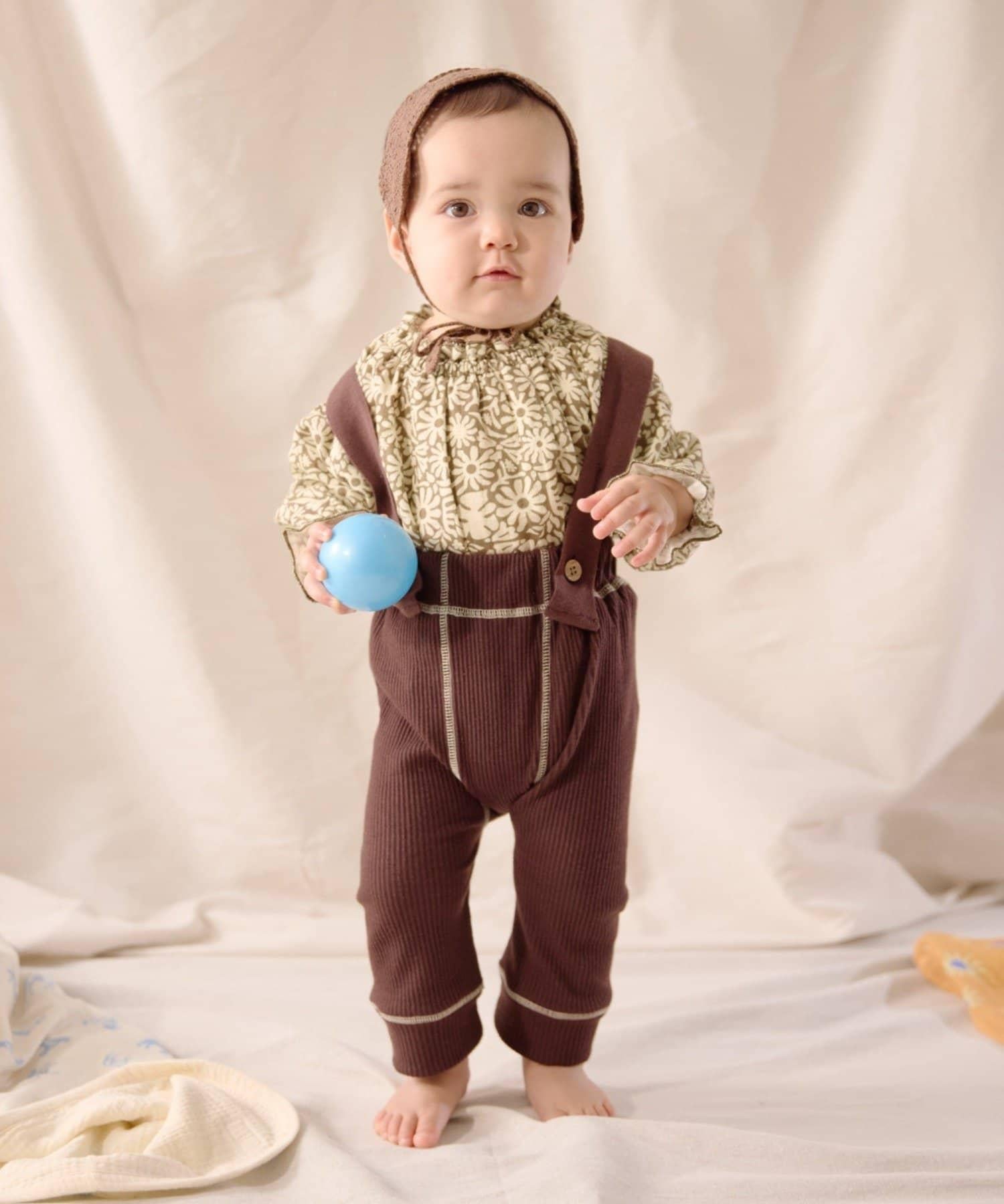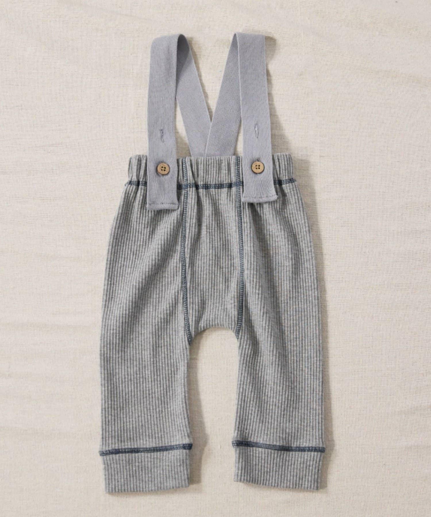 時尚單品,羅紋長褲上附有吊帶,便於活動。