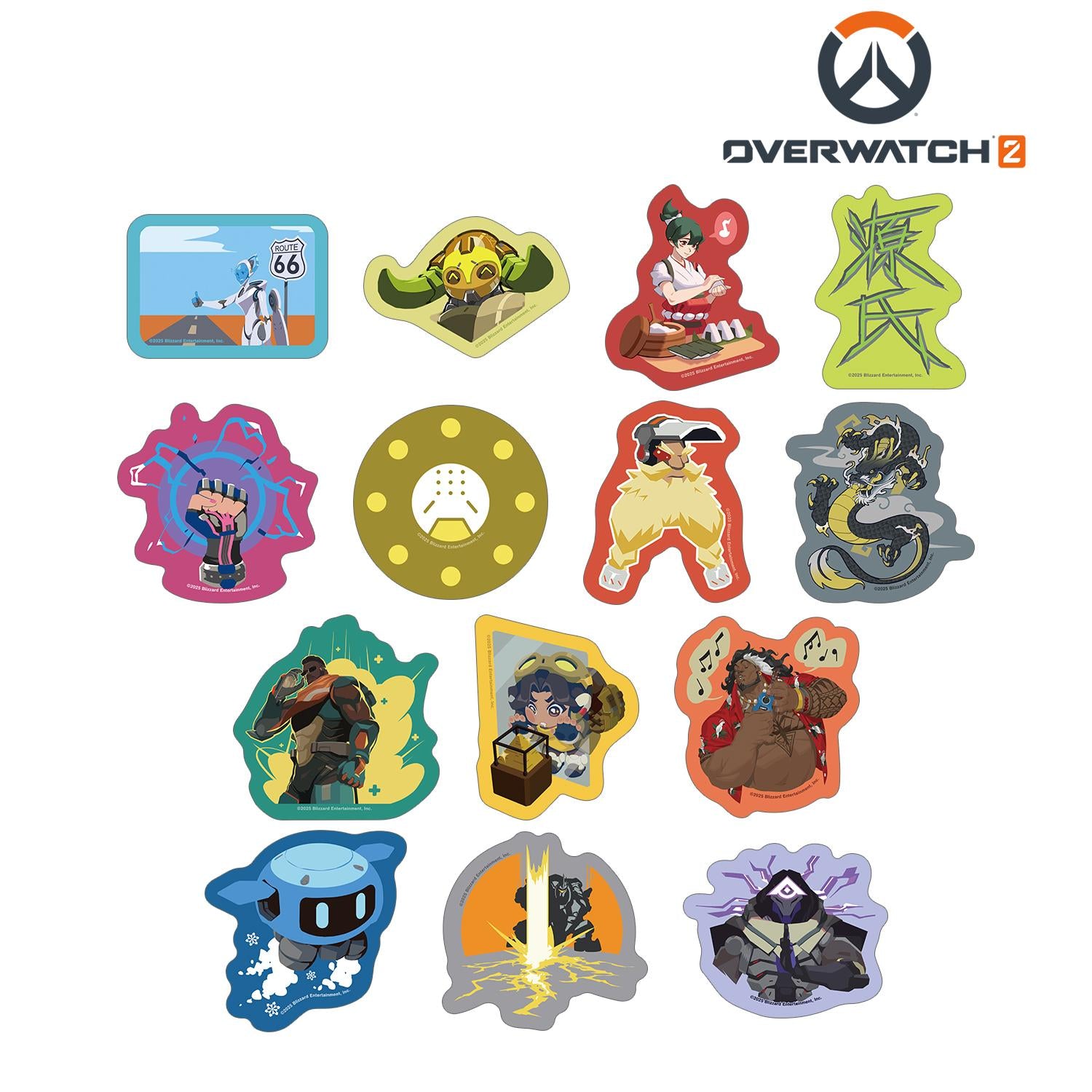 將 Echo、Olisa、Chirico、Genji、Zaria、Zenyatta、Torbjorn、Hanzo、Baptiste、Venture、Mauga、May、Reinhardt 和 Ramatla 的插圖以及角色名稱制成模切貼紙。