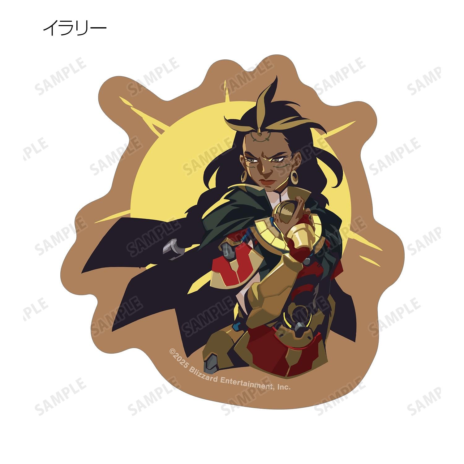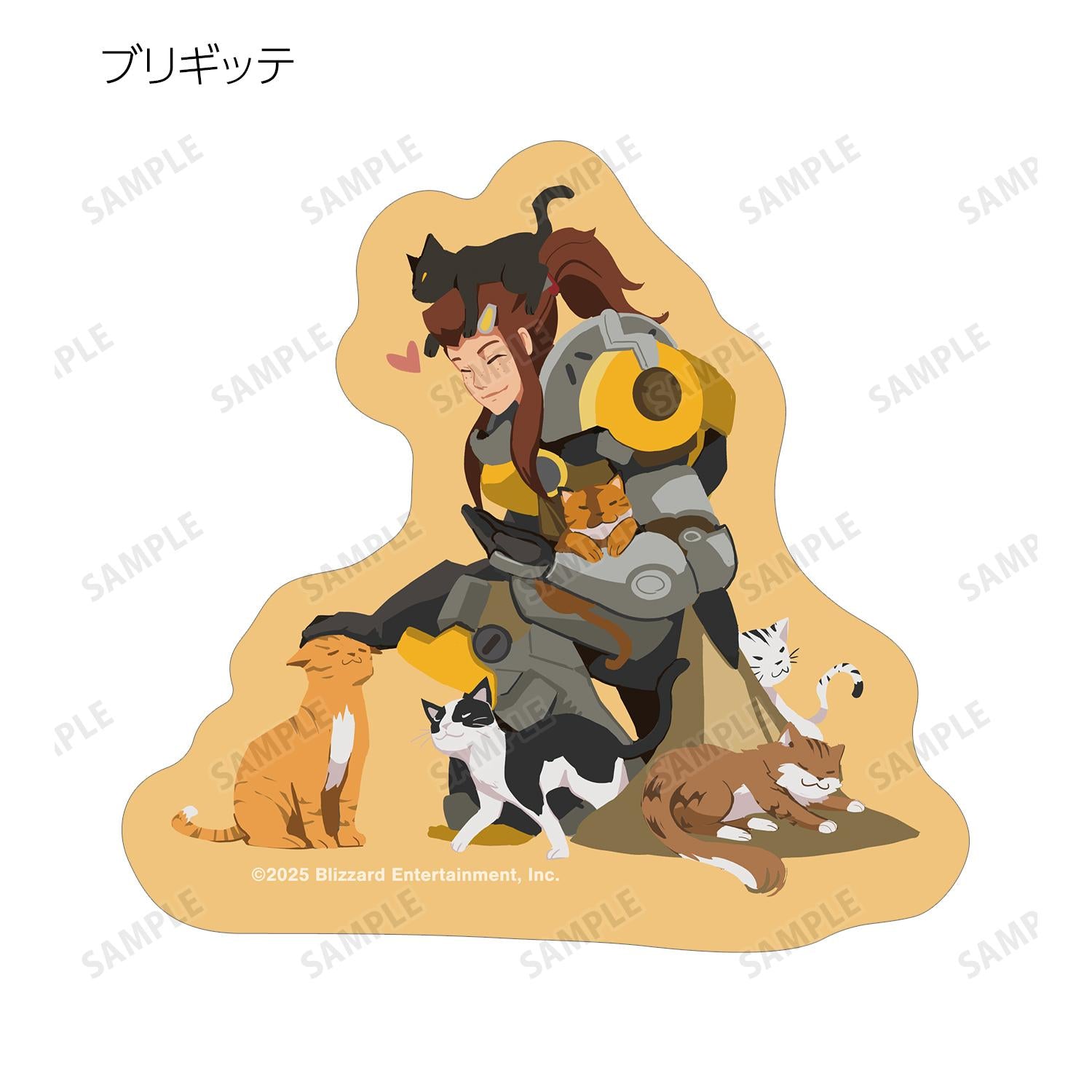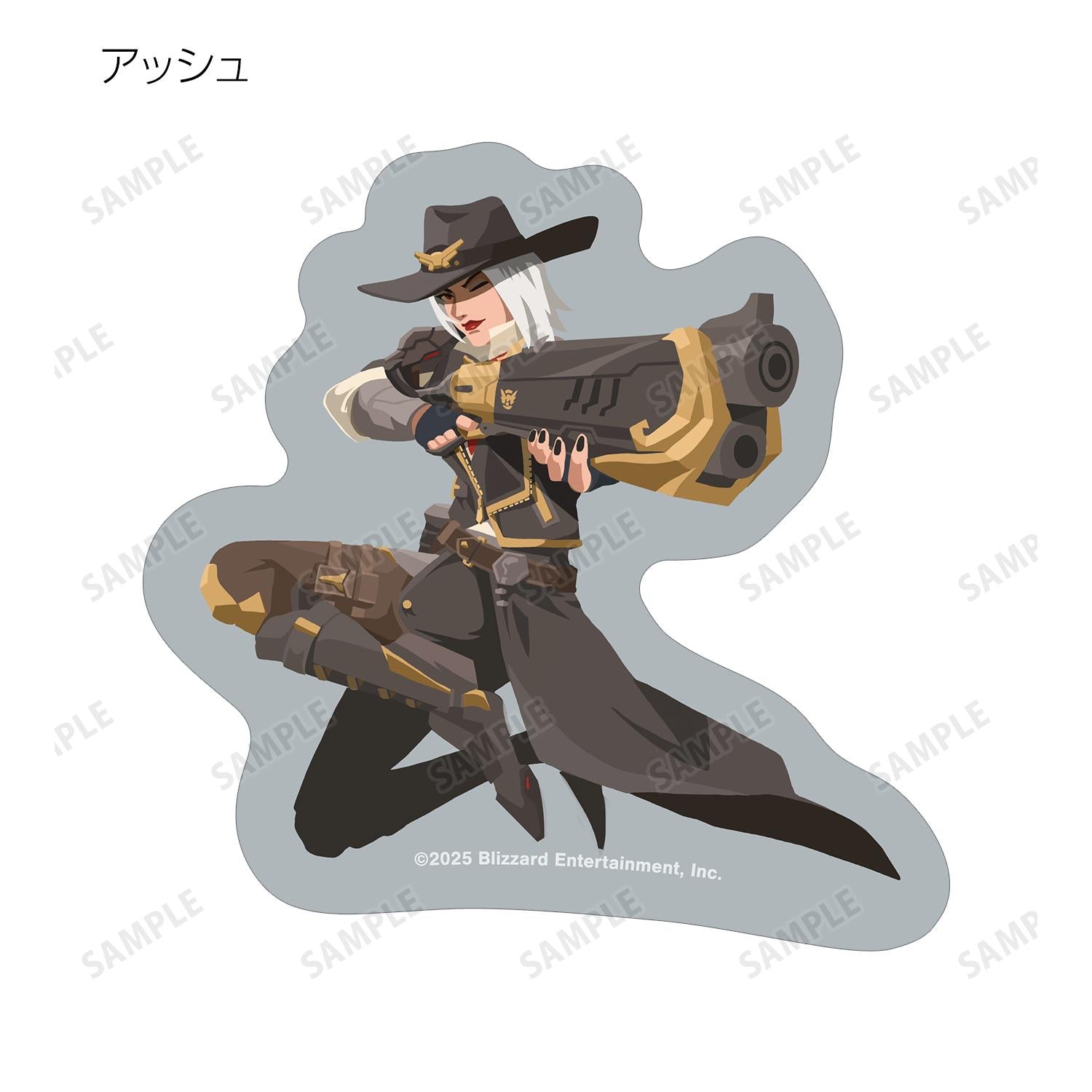 模切貼紙上有 D.Va、Ash、Ilary、Cassidy、Symmetra、Junkrat、Sojourn、Bastion、Brigitte、Mercy、Moira、Wrecking Ball 和 Roadhog 的插圖。