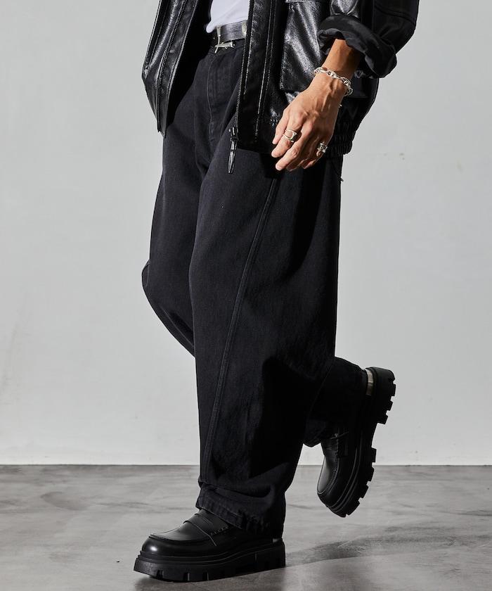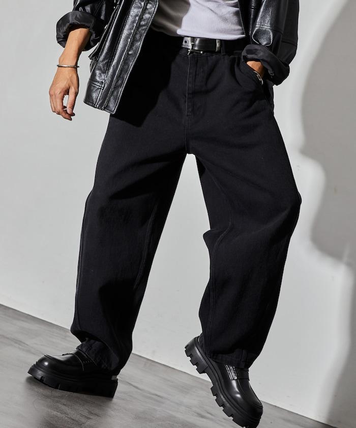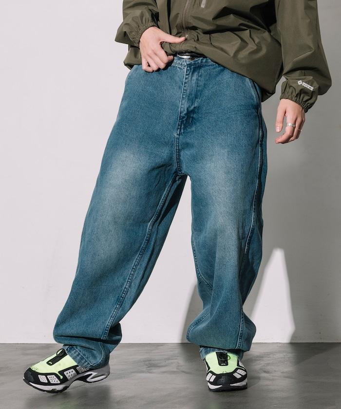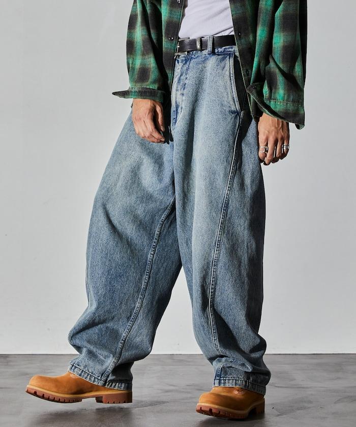 扭曲曲線牛仔長褲,採用特殊處理和立體剪裁。