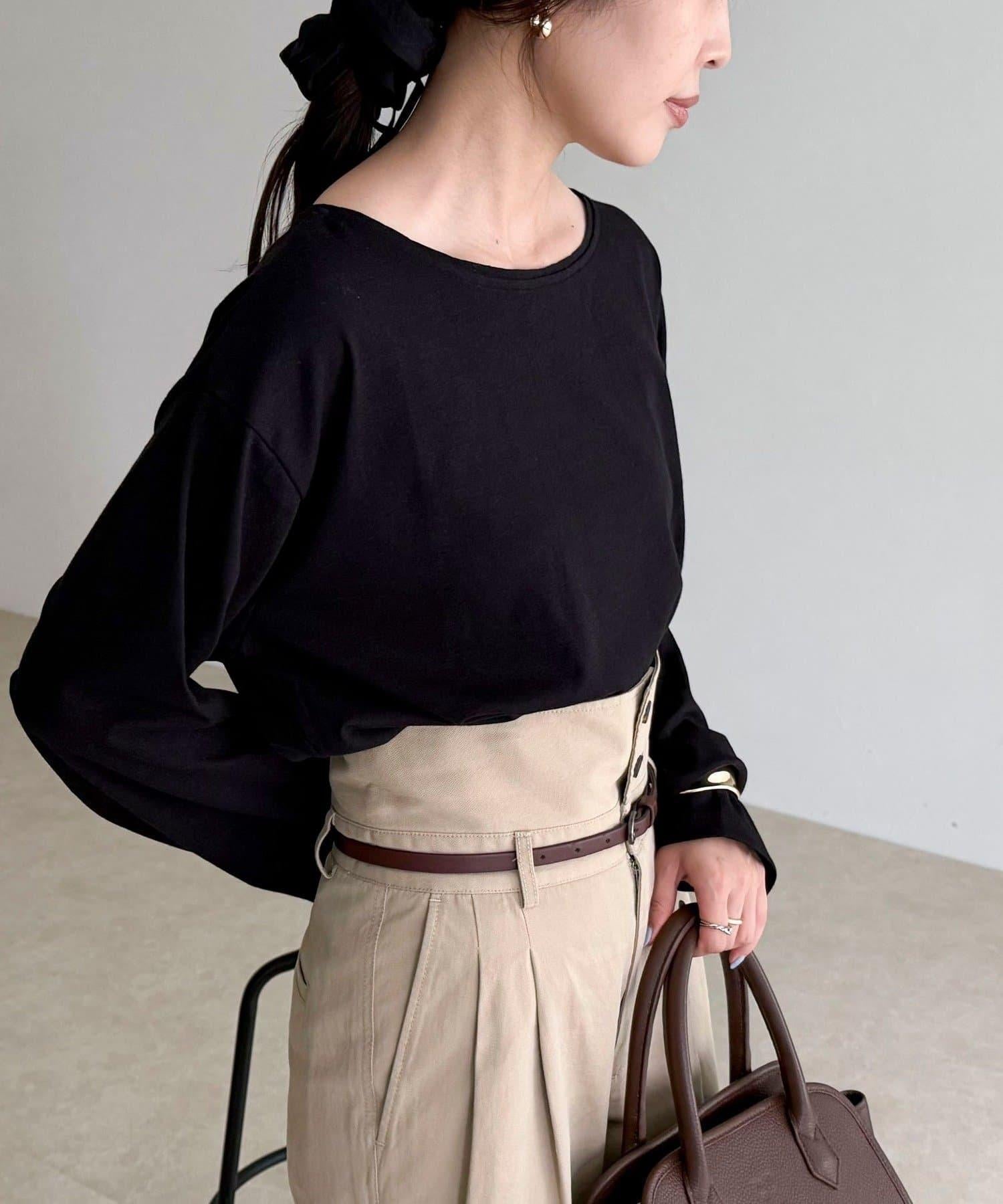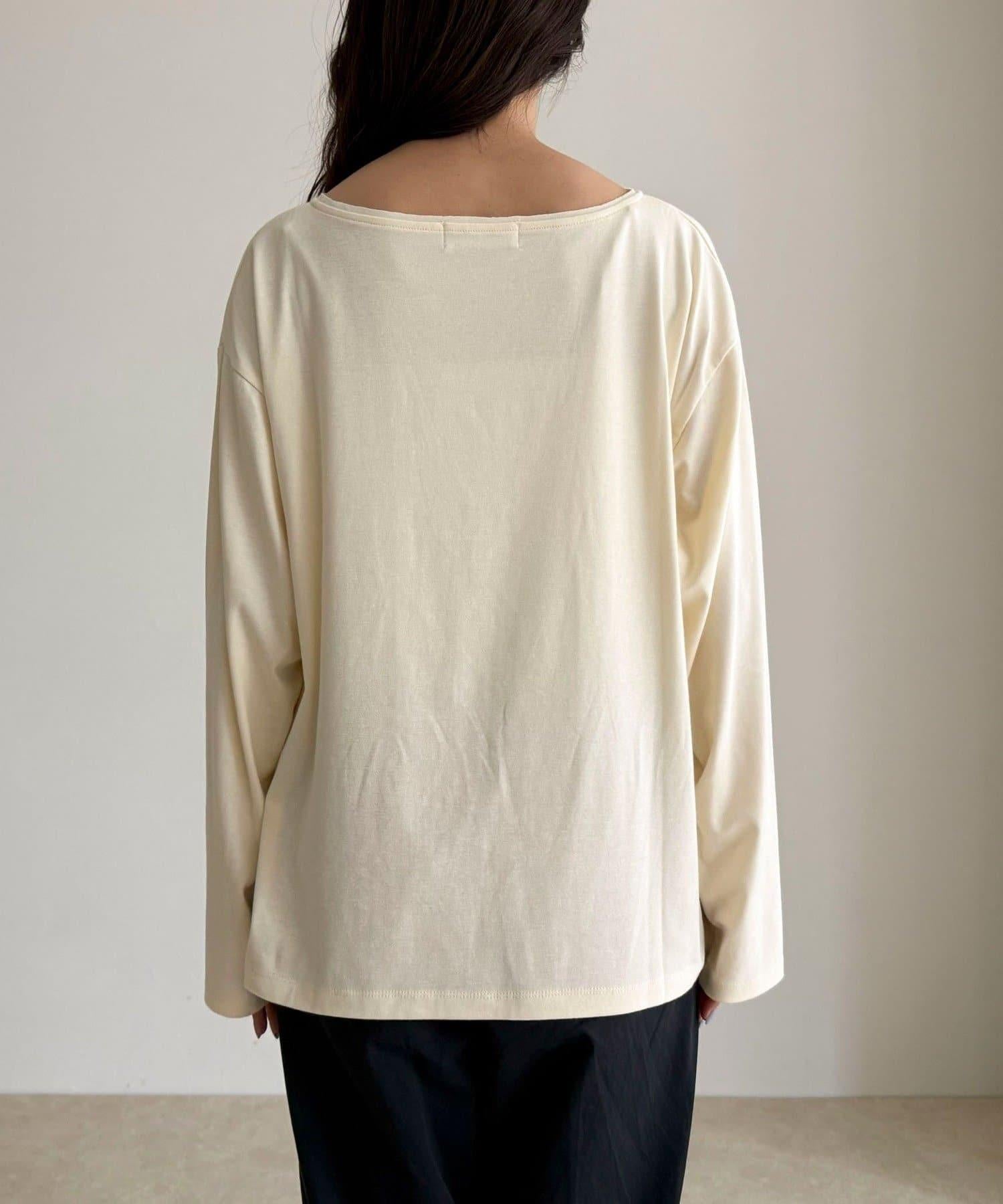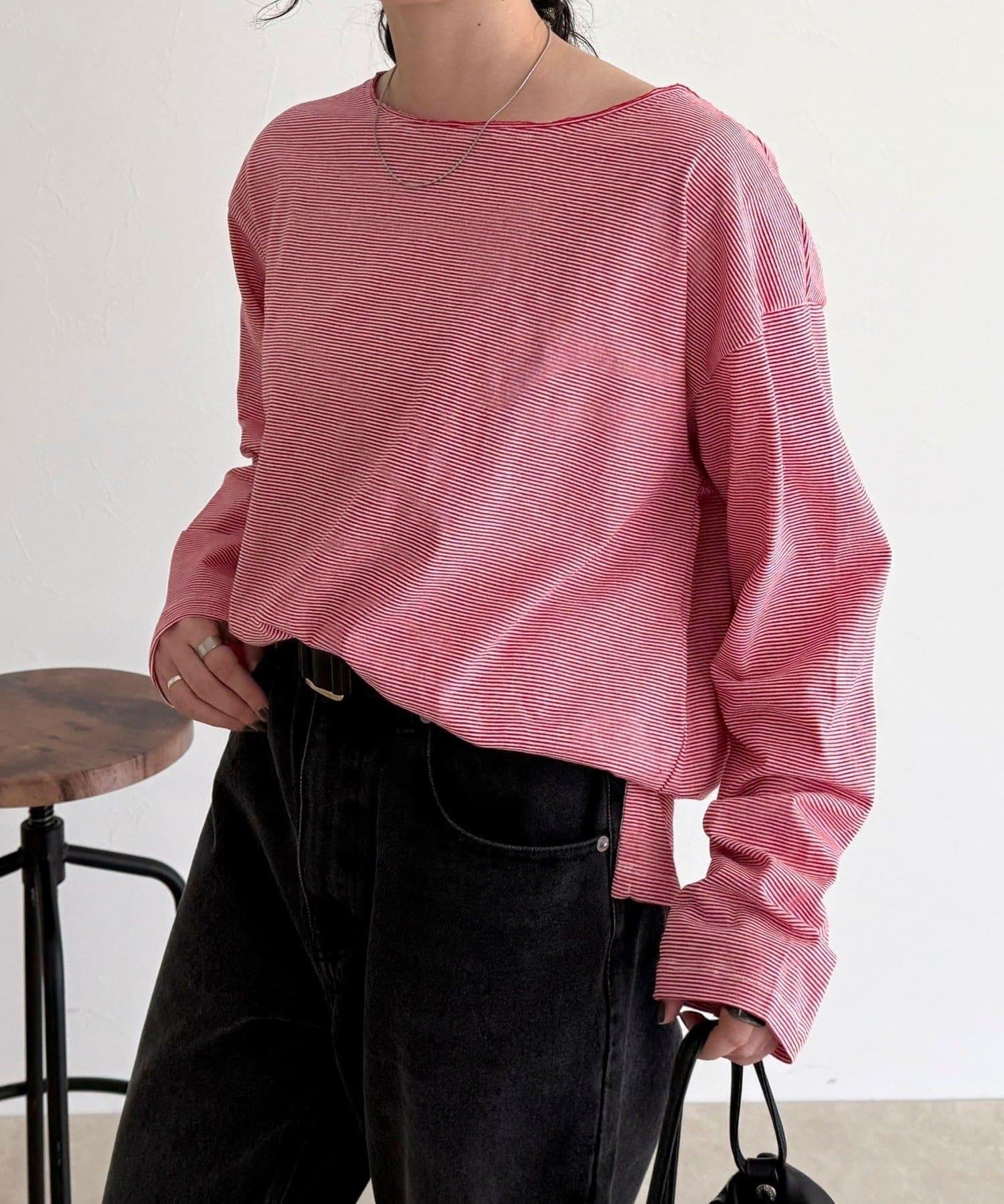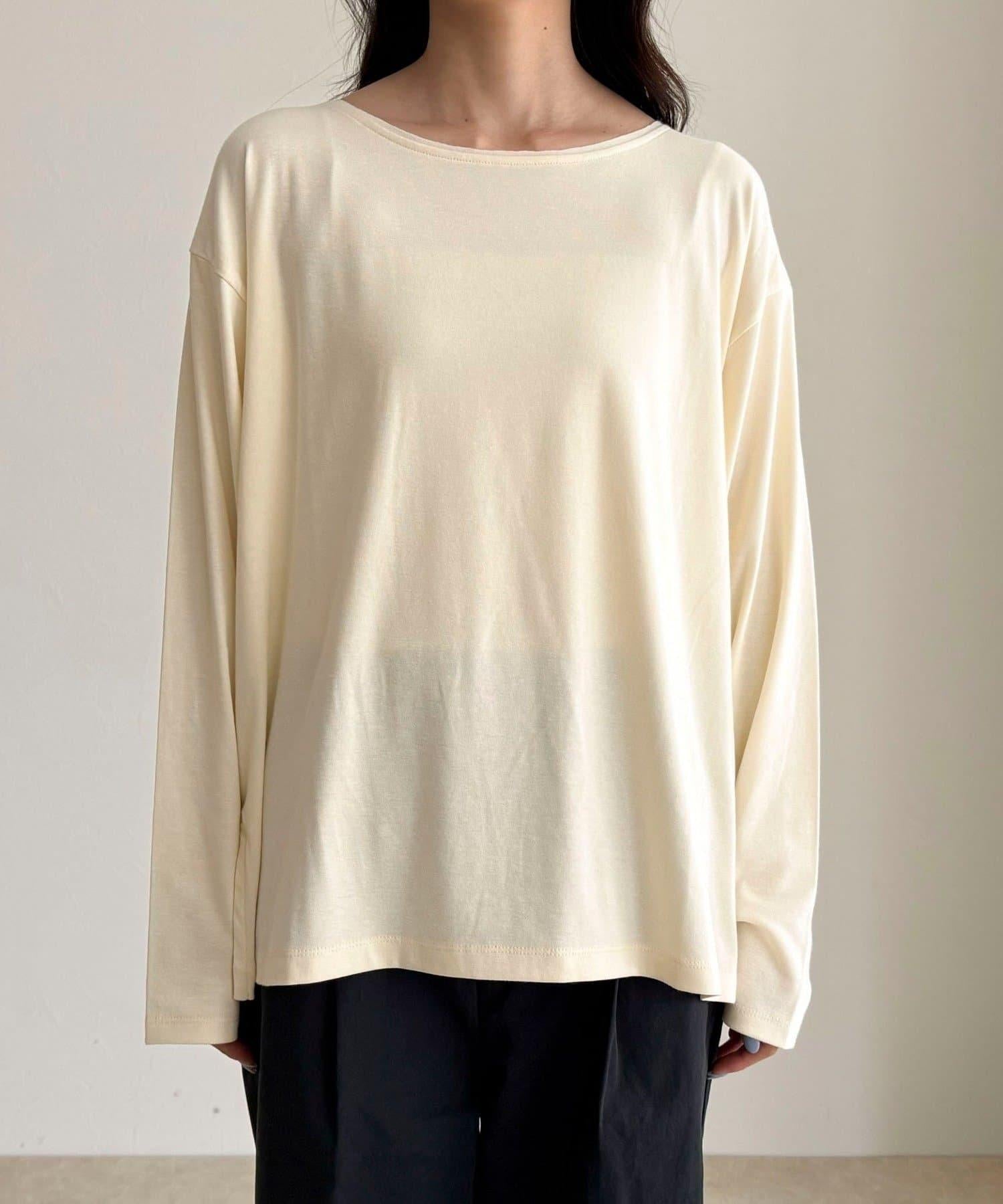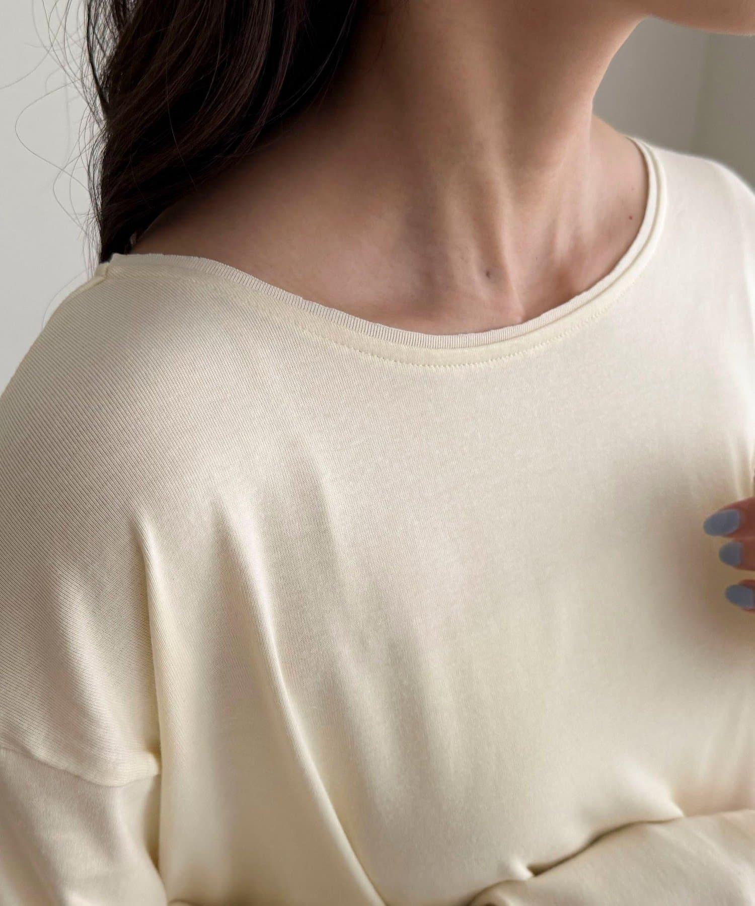 身高 156 厘米的工作人員:長度輕盈地掛在臀部,即使外穿也很整潔!船領設計讓頸部看起來乾淨利落,穿起來輕盈柔軟。它是一件百搭的上衣,還能遮蓋身形。