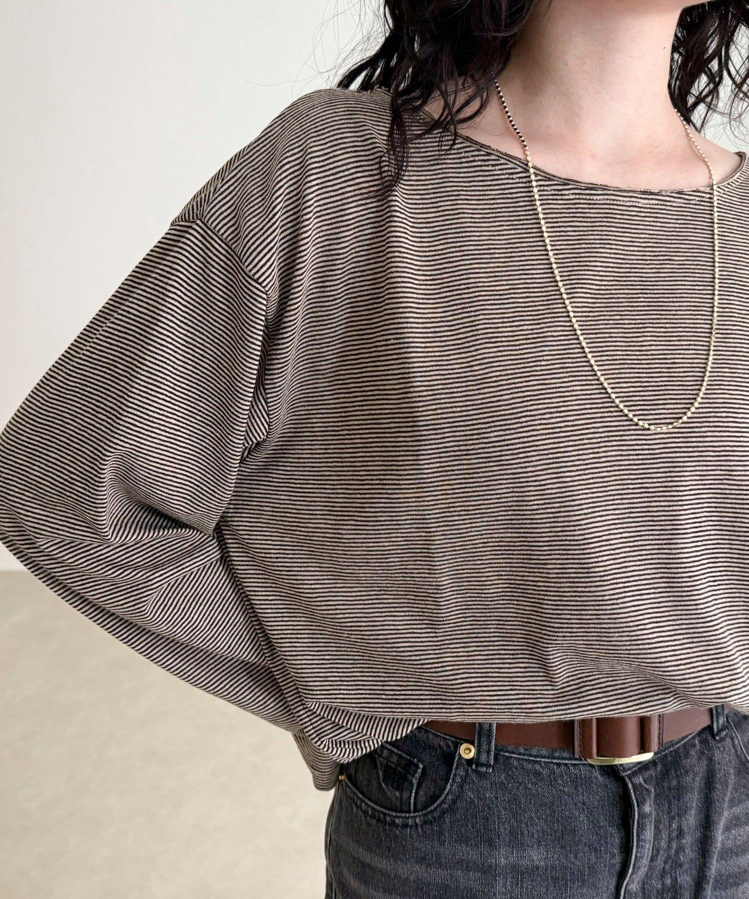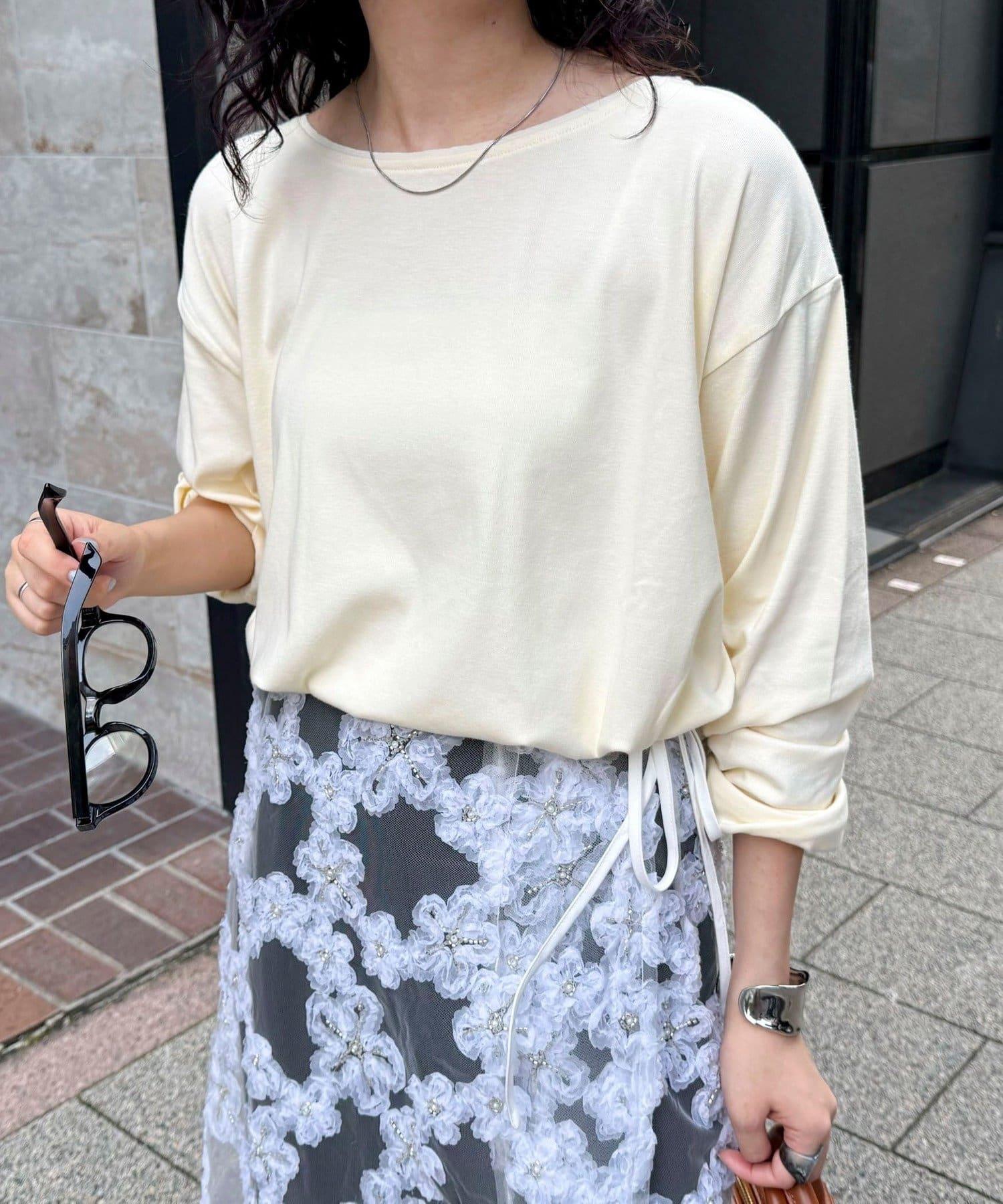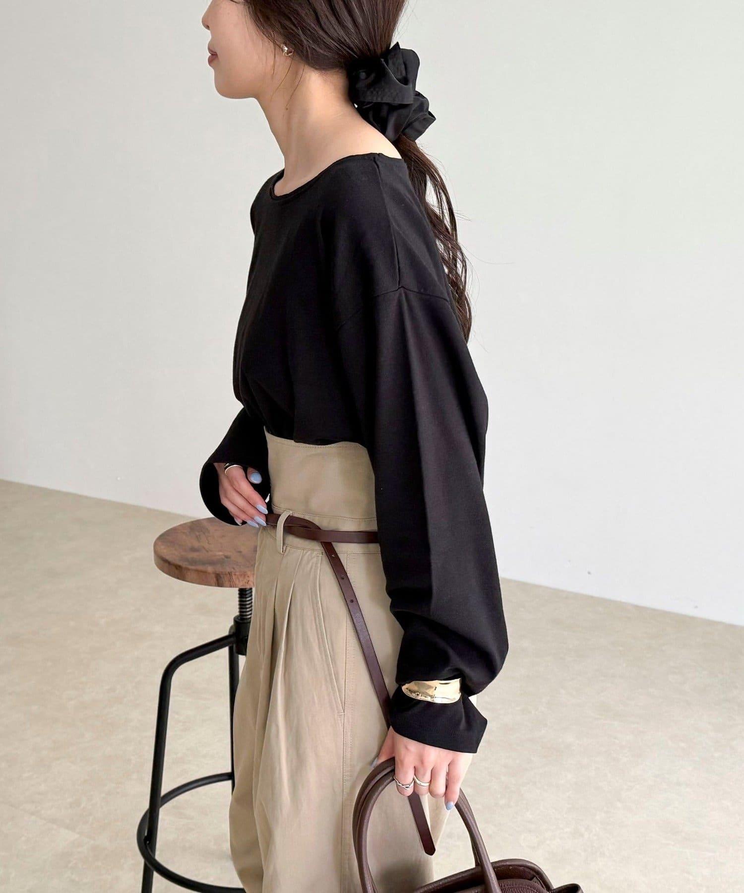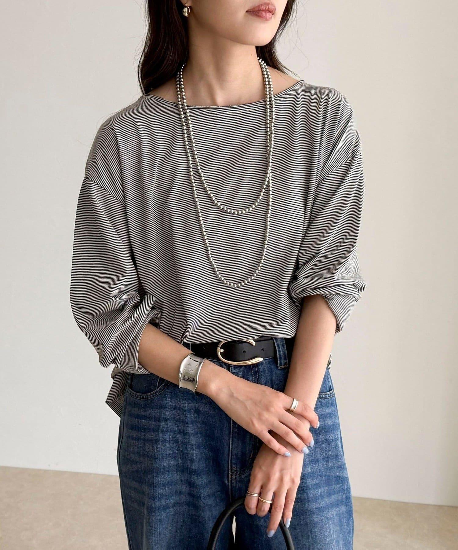 身高 156 厘米的工作人員:長度輕盈地掛在臀部,即使外穿也很整潔!船領設計讓頸部看起來乾淨利落,穿起來輕盈柔軟。它是一件百搭的上衣,還能遮蓋身形。