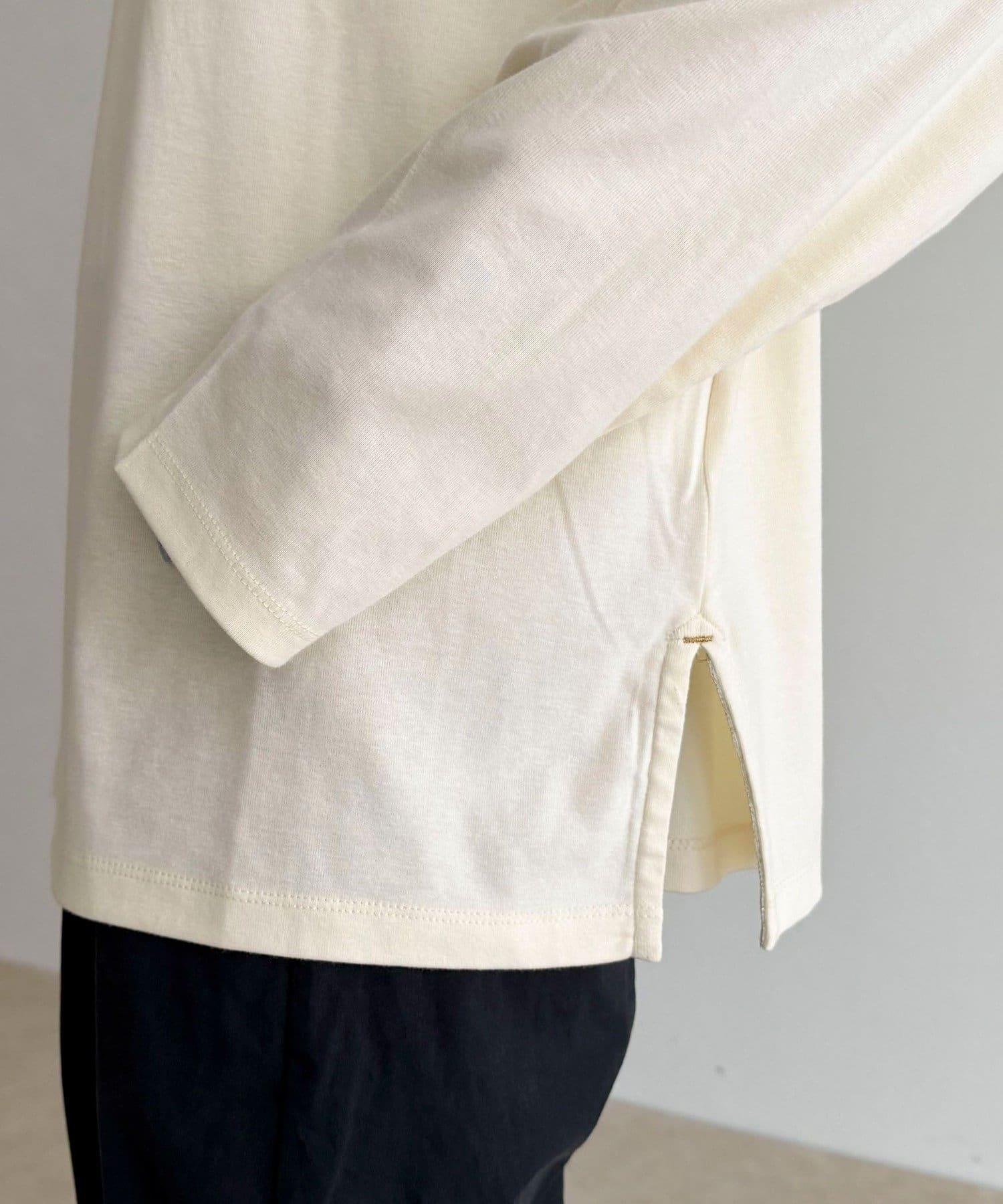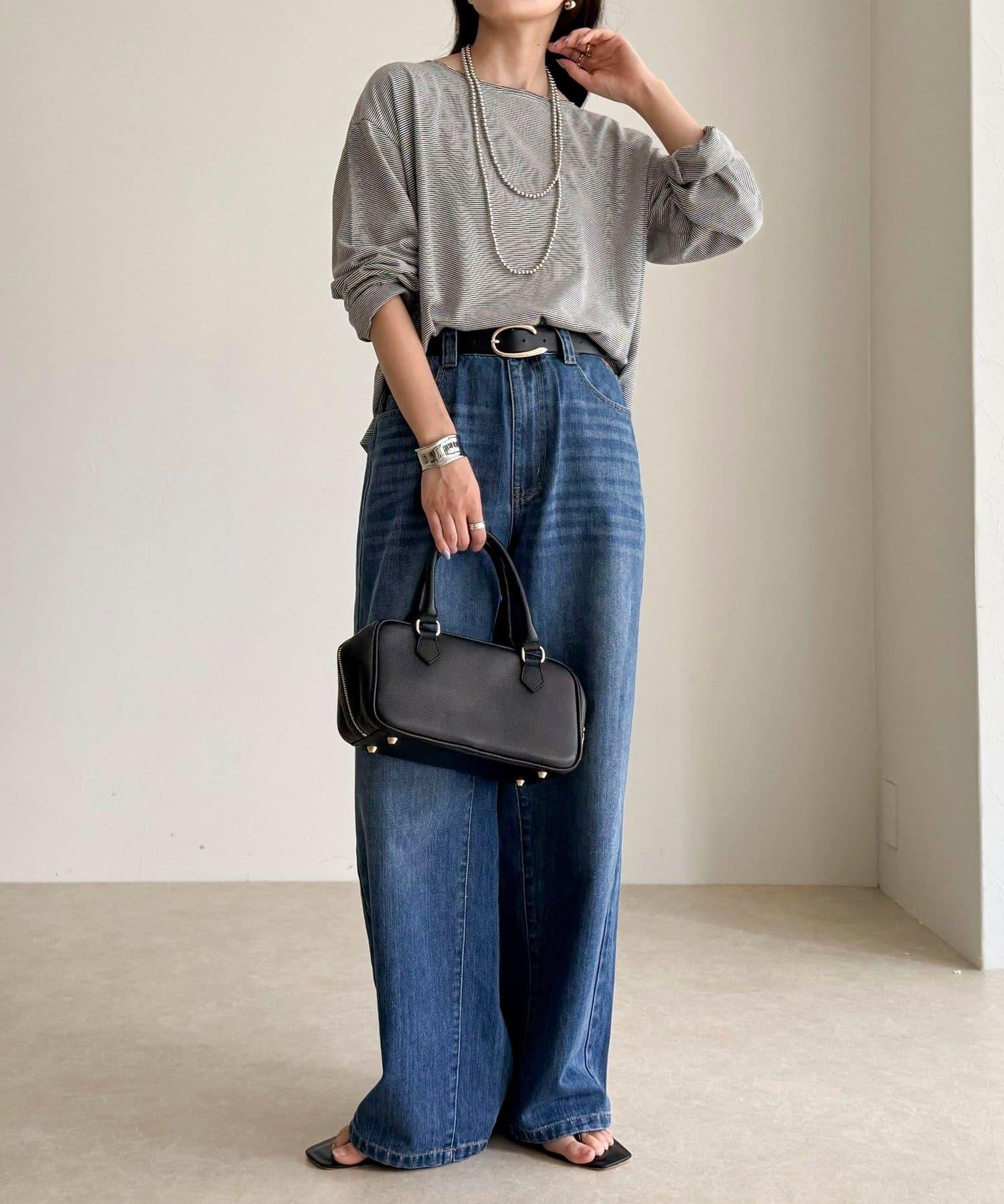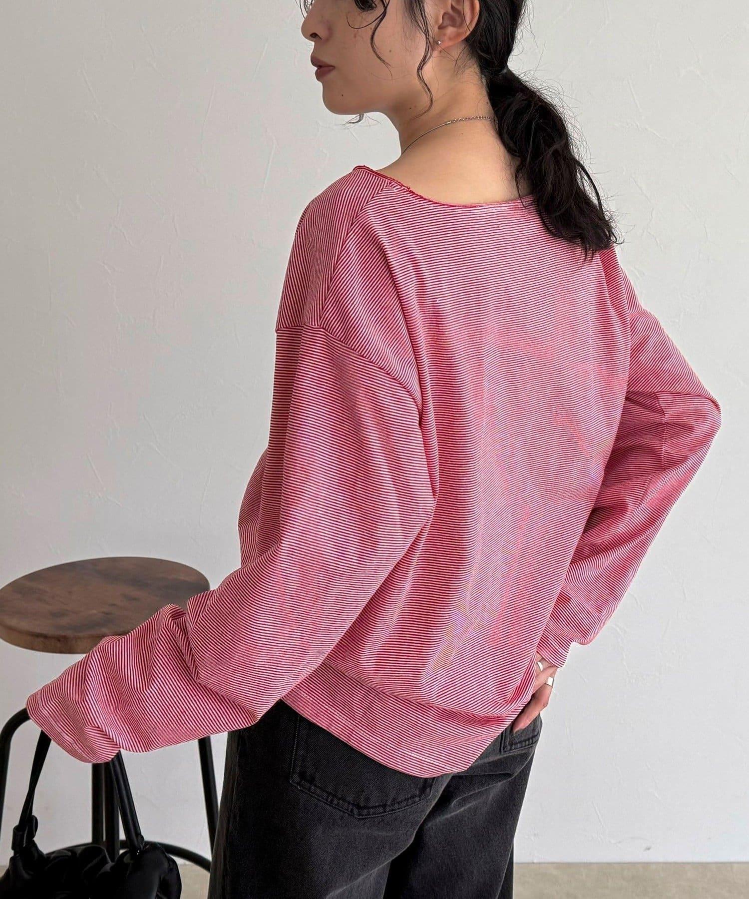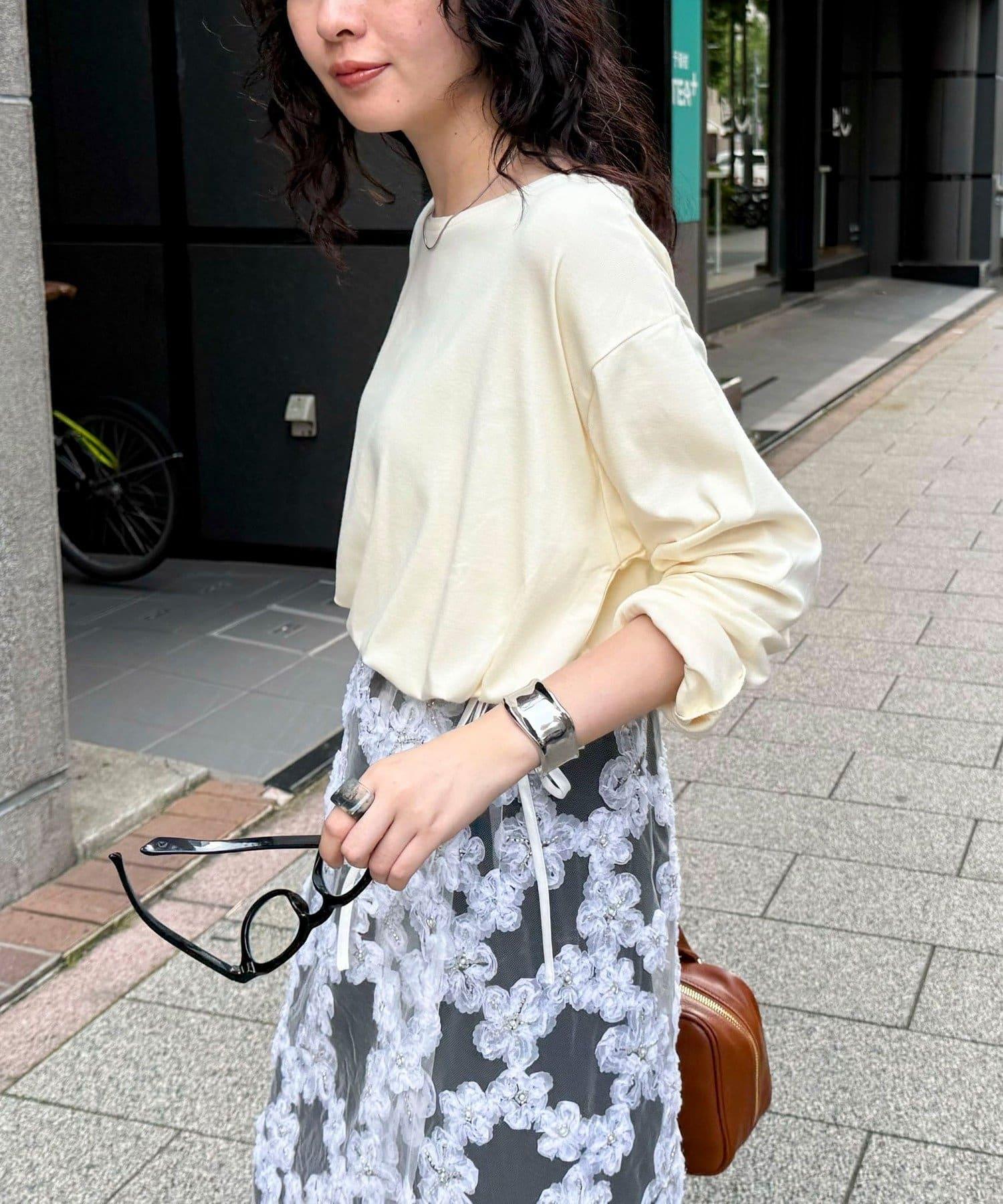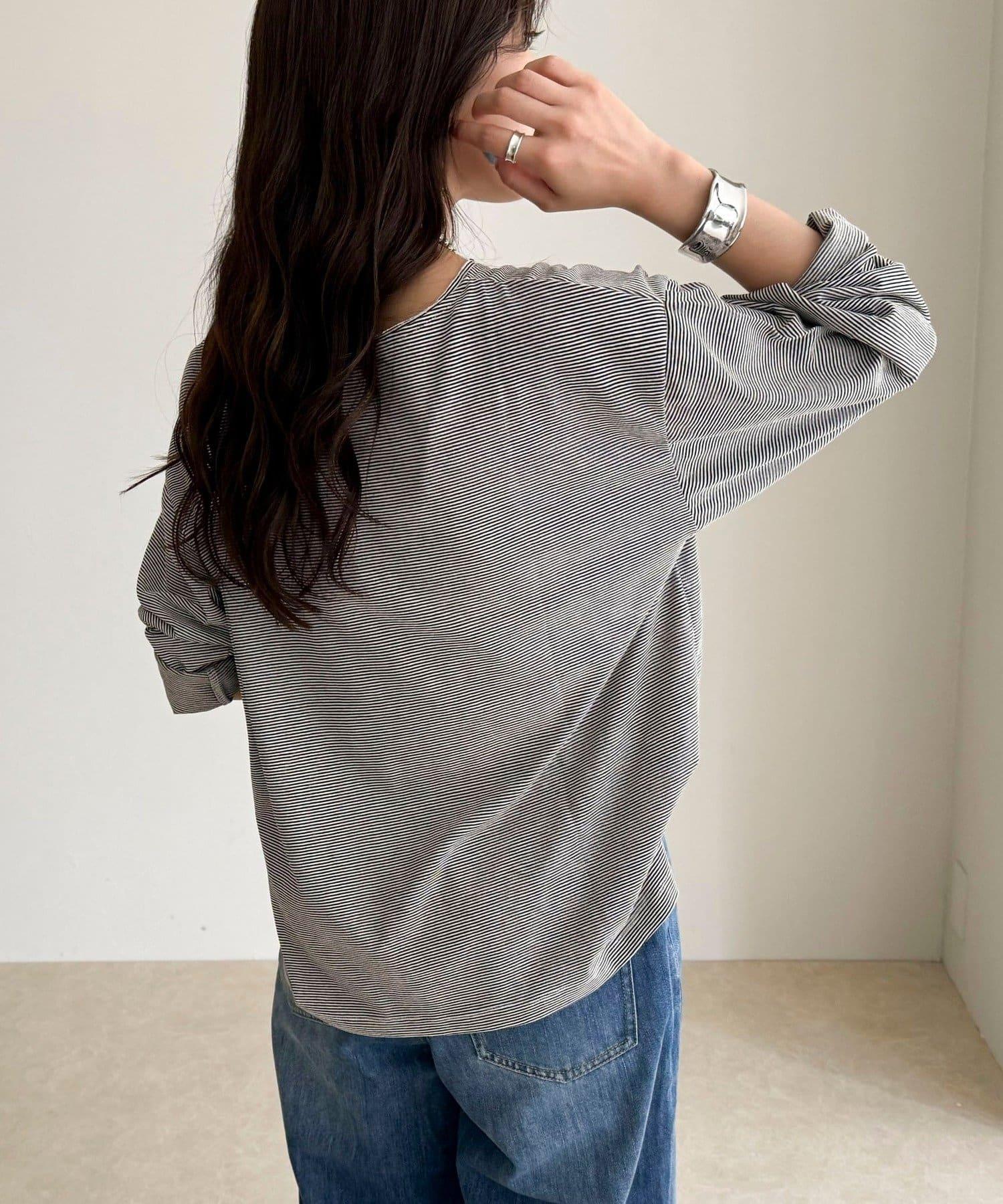 身高 156 厘米的工作人員:長度輕盈地掛在臀部,即使外穿也很整潔!船領設計讓頸部看起來乾淨利落,穿起來輕盈柔軟。它是一件百搭的上衣,還能遮蓋身形。