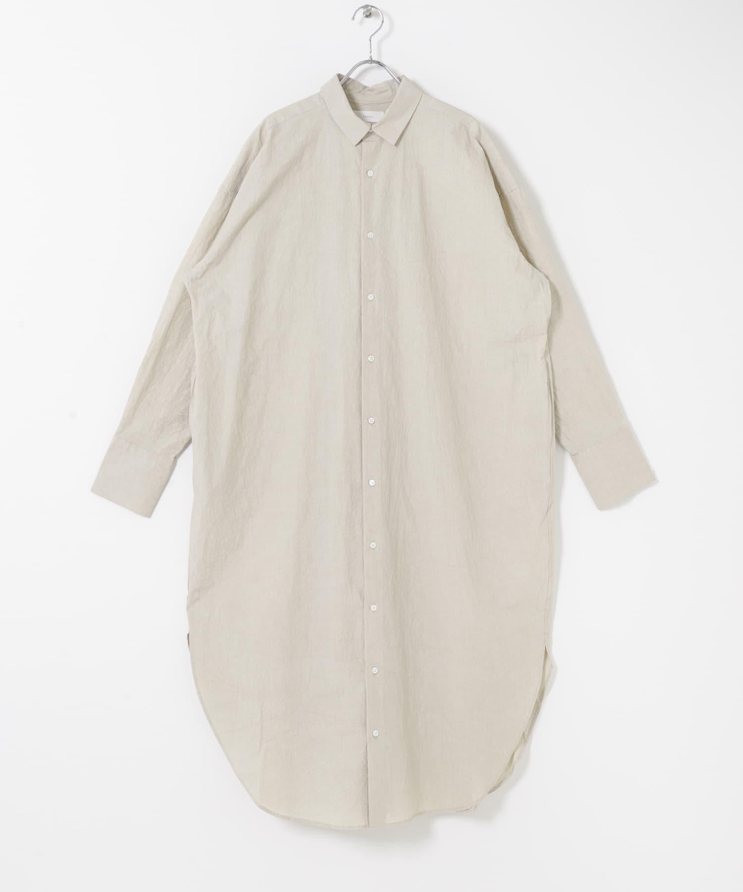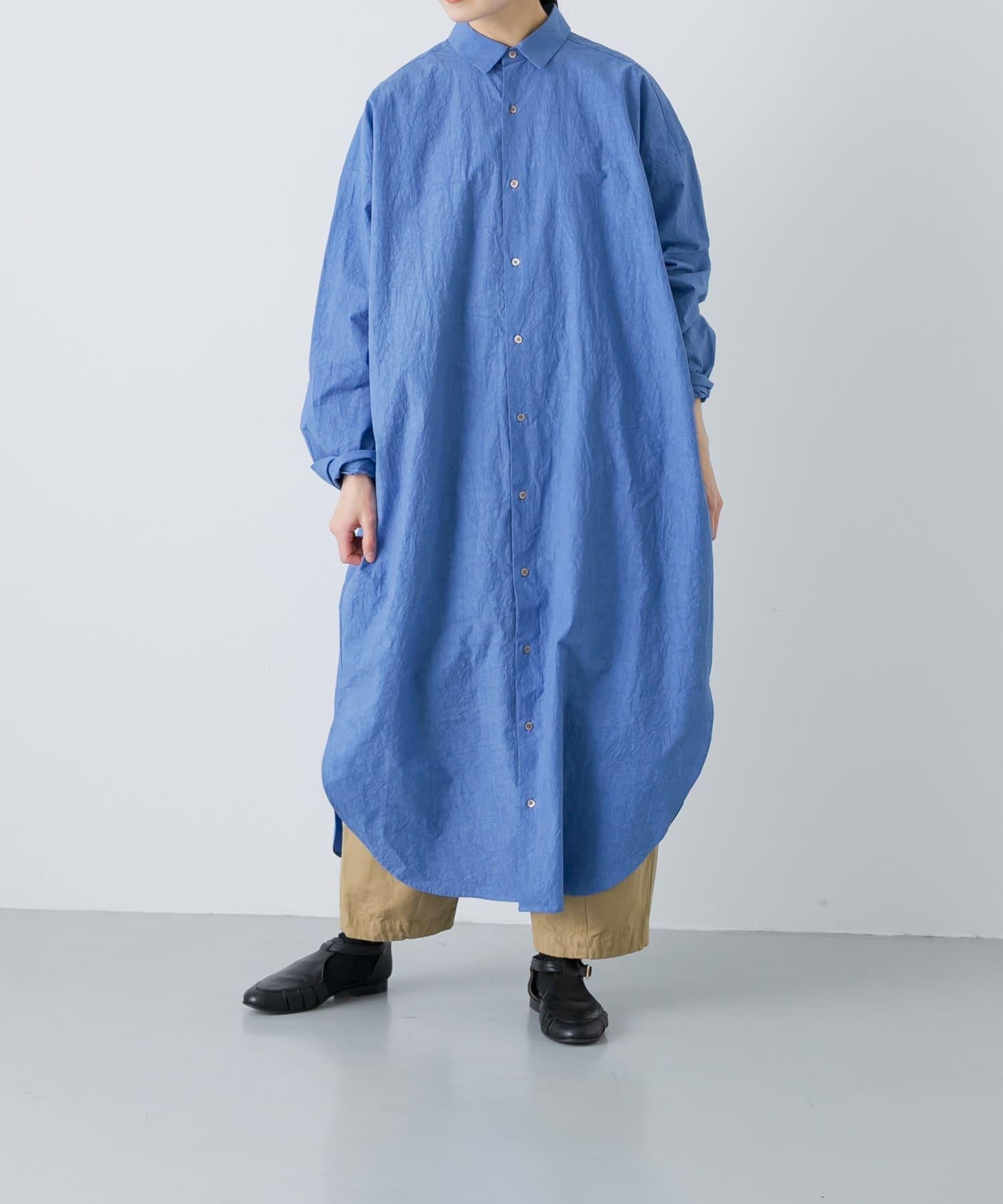 襯衫裙,氣場十足。寬大的輪廓營造出舒適的氛圍。也非常適合搭配馬甲、羊毛衫和針織套頭衫。從兩側開衩處露出的長褲營造出一種慵懶的感覺,儘管長度較長,卻給人一種輕盈而不厚重的印象。前開襟的設計意味著它還可以當外套穿。除了精心設計的圖案外,面料的質感也為其高品質的外觀做出了貢獻。採用小鍋小批量染色的特殊工藝,使其具有獨特的凹凸色澤和質感。