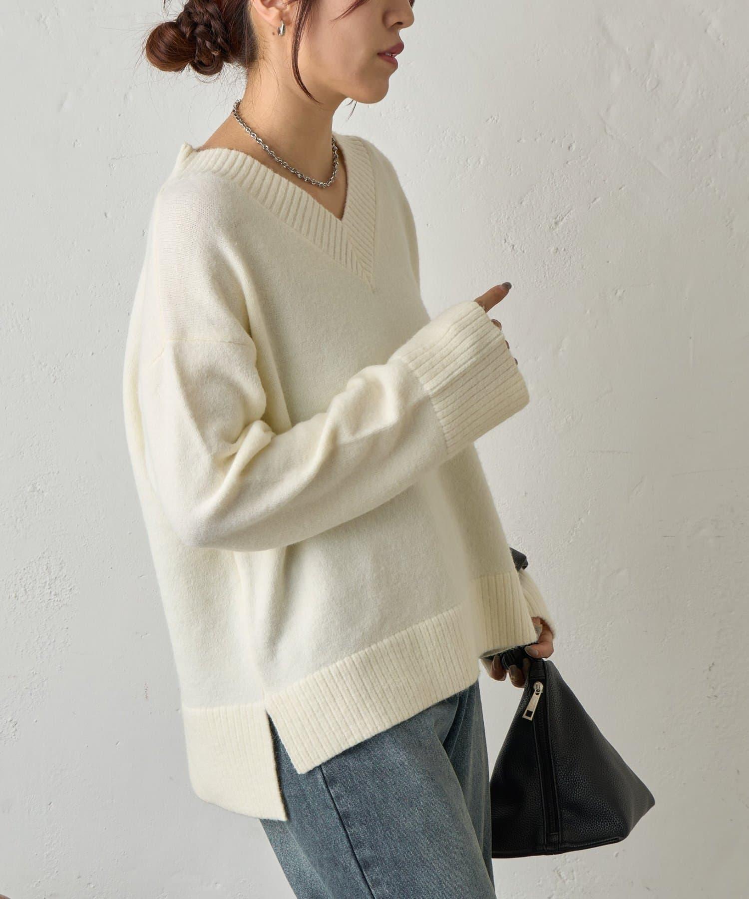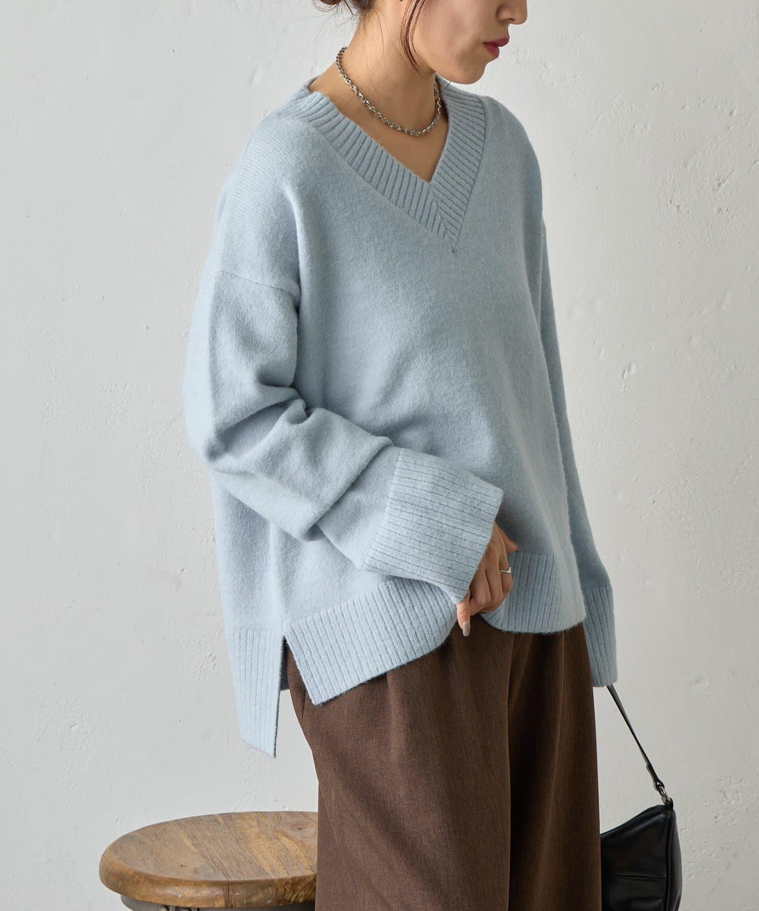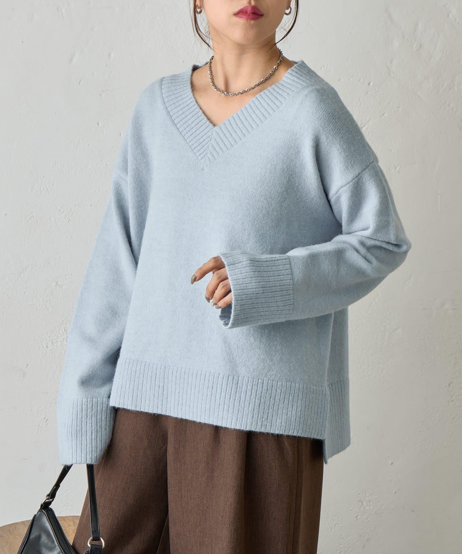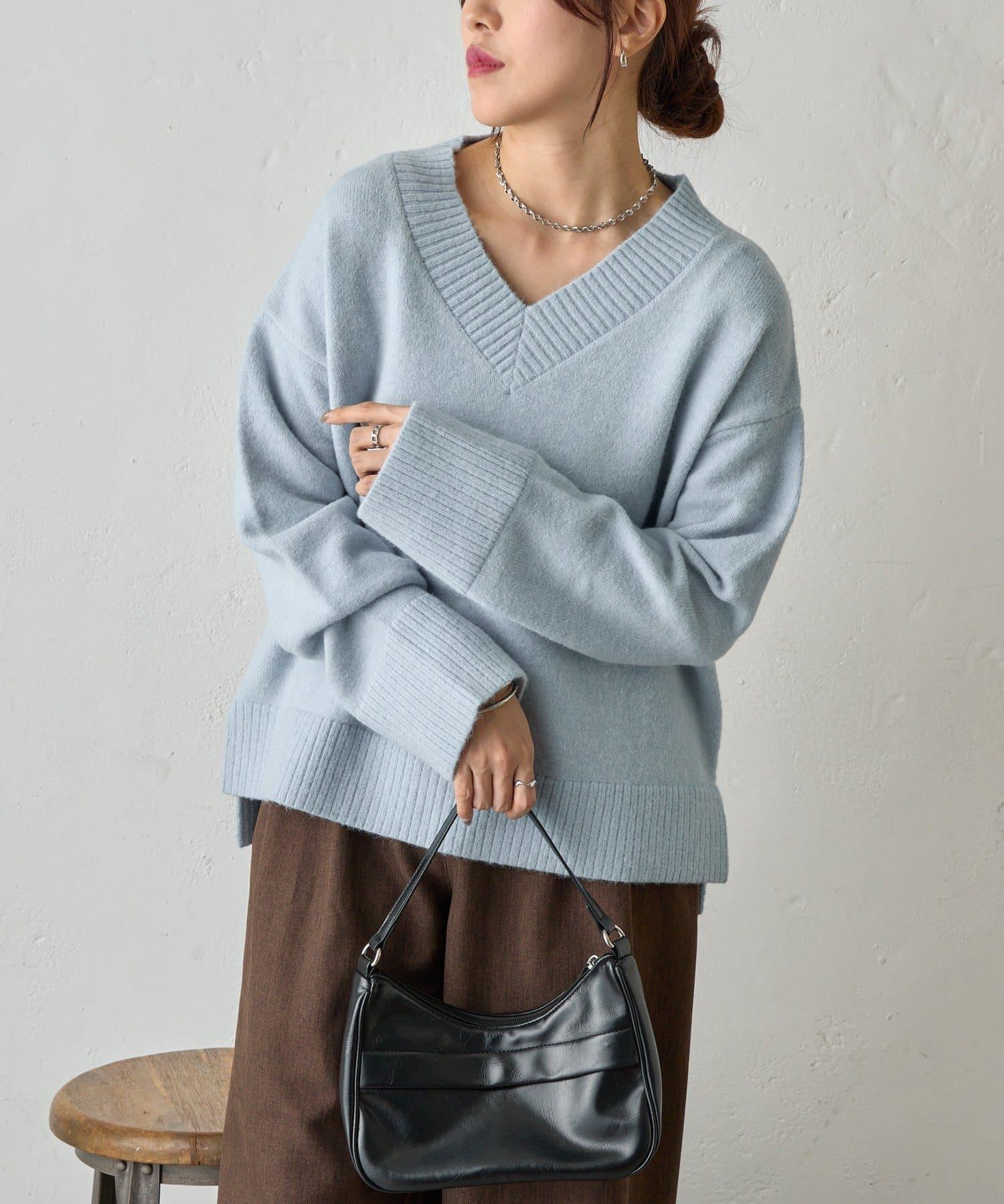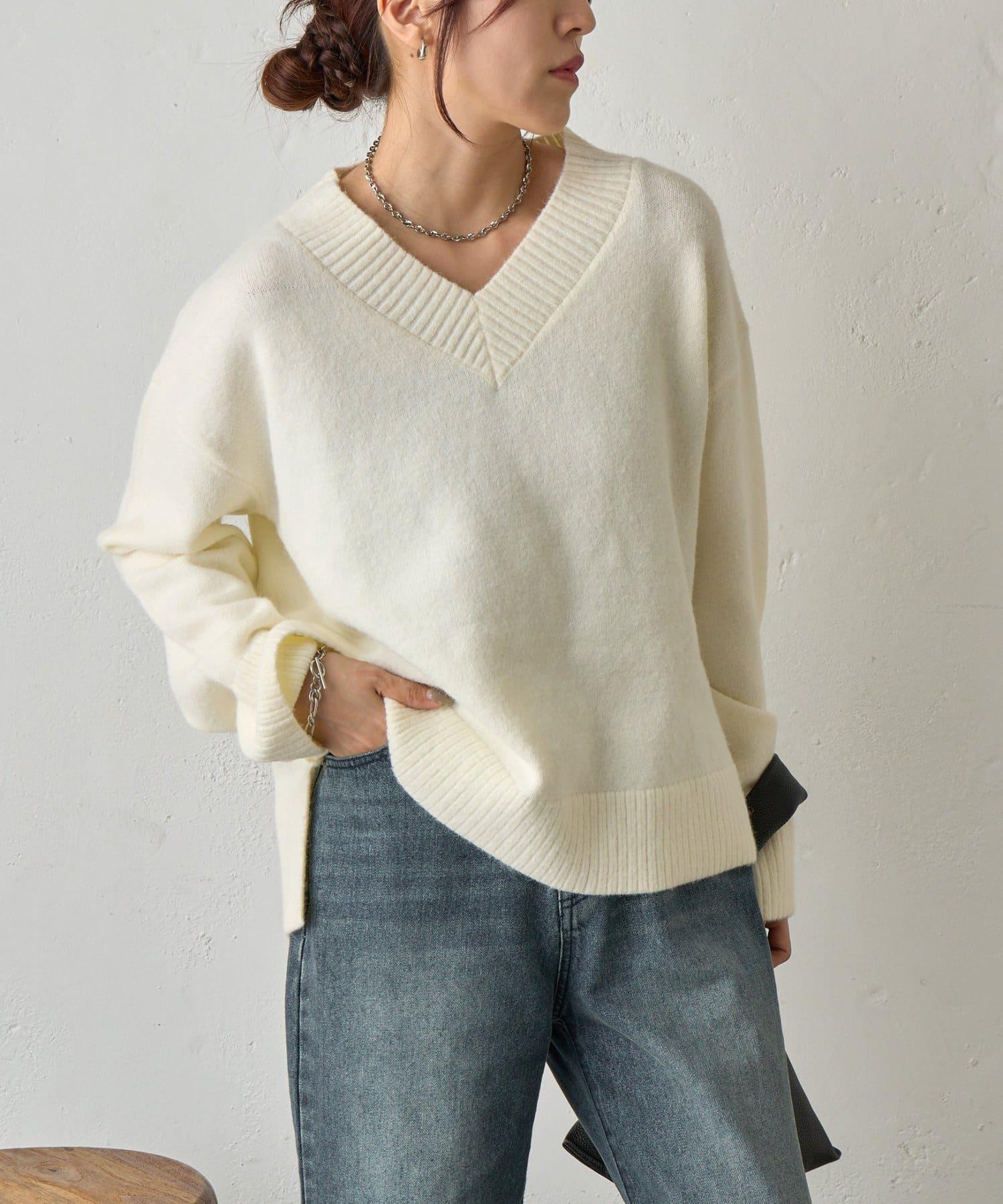 [寬鬆 V 領針織衫,蓬鬆觸感]