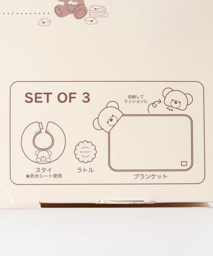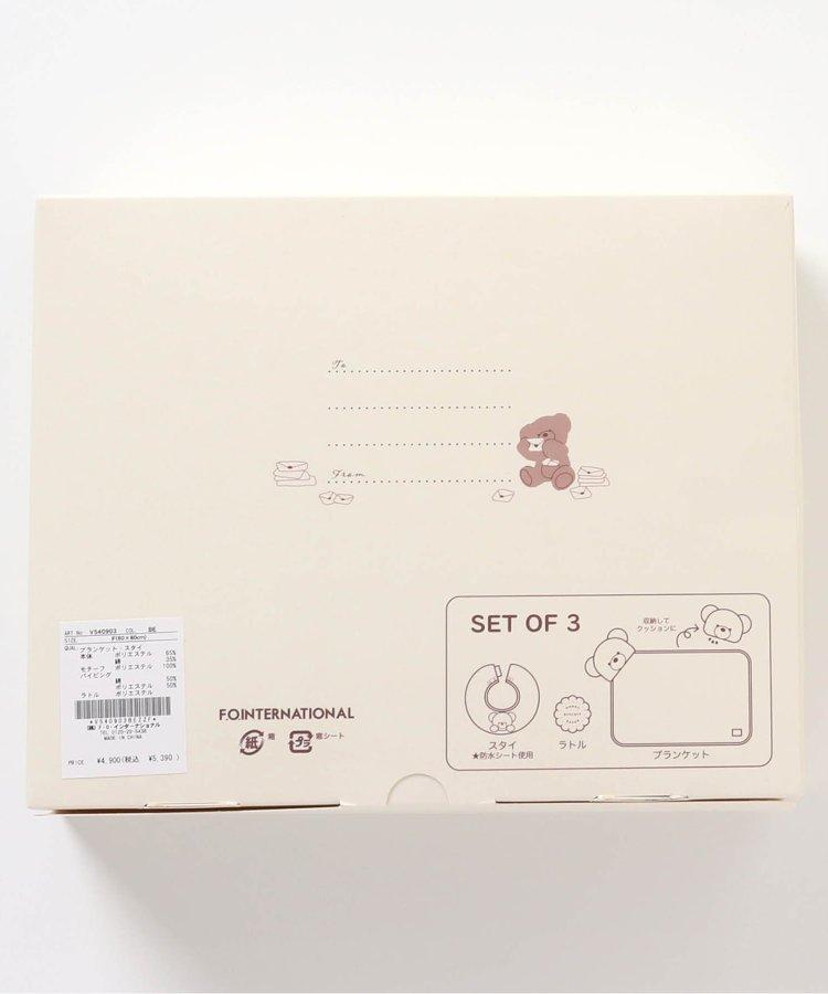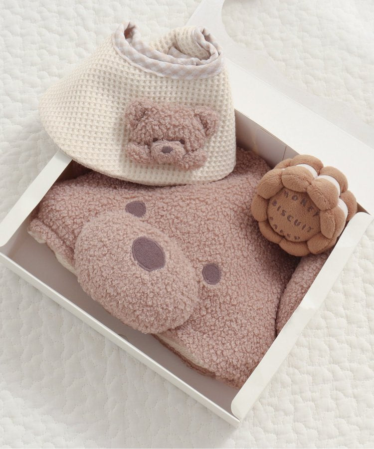 禮品套裝包含三件物品:一個玩具、一個撥浪鼓和一條毯子。