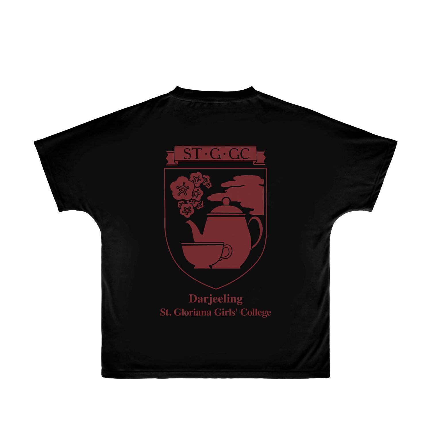 這款全圖案 T 恤上印有大吉嶺的原創插圖和聖格洛麗亞娜學院的校徽。