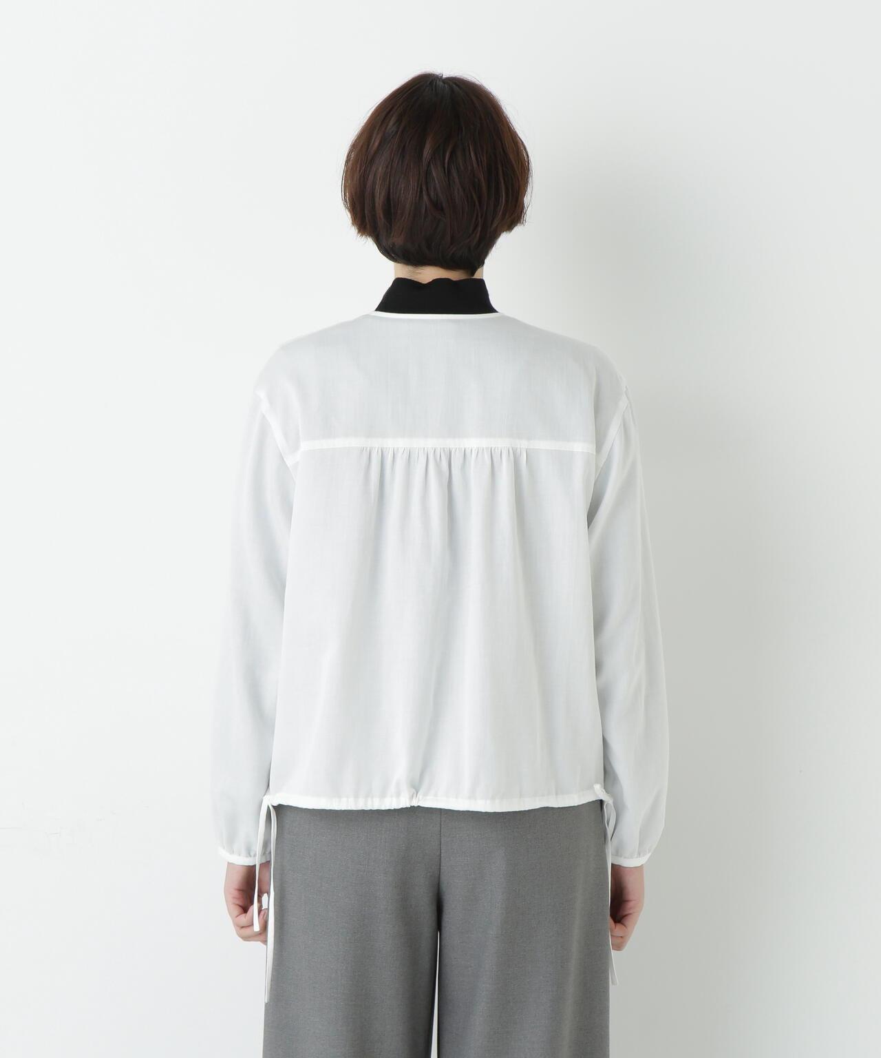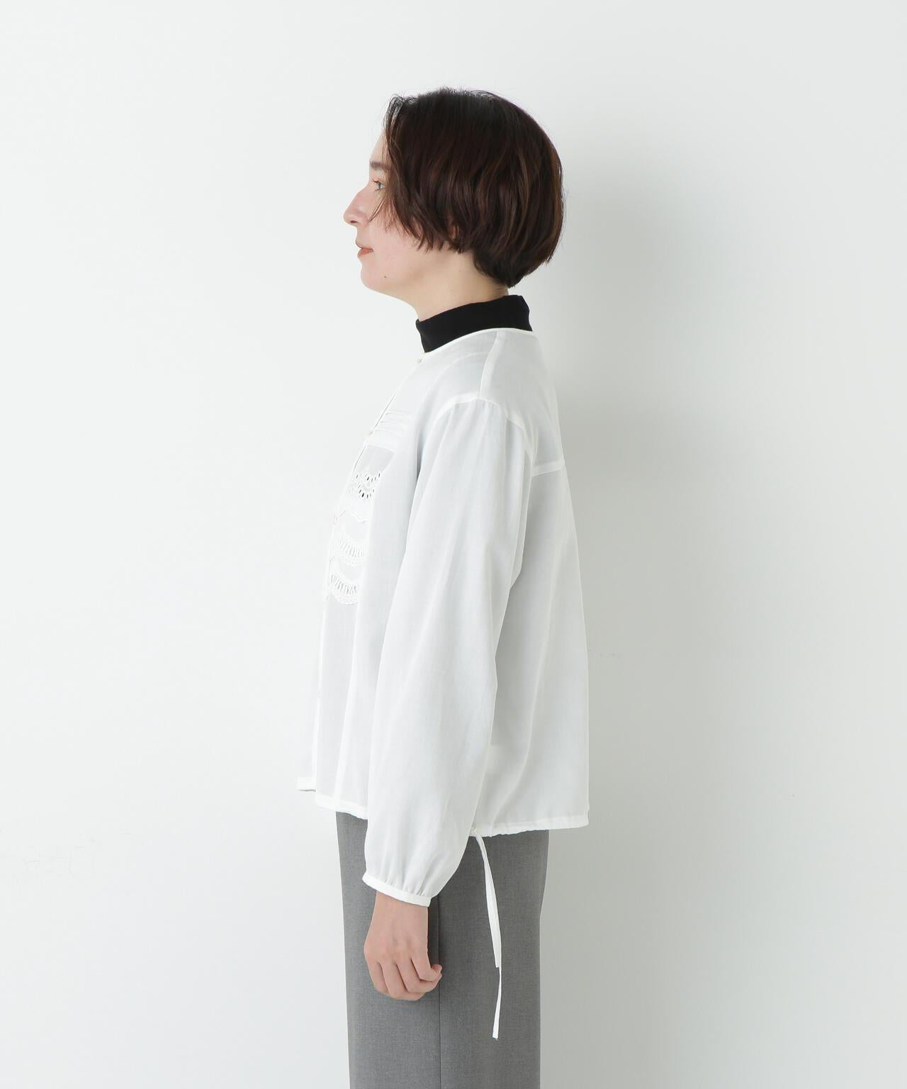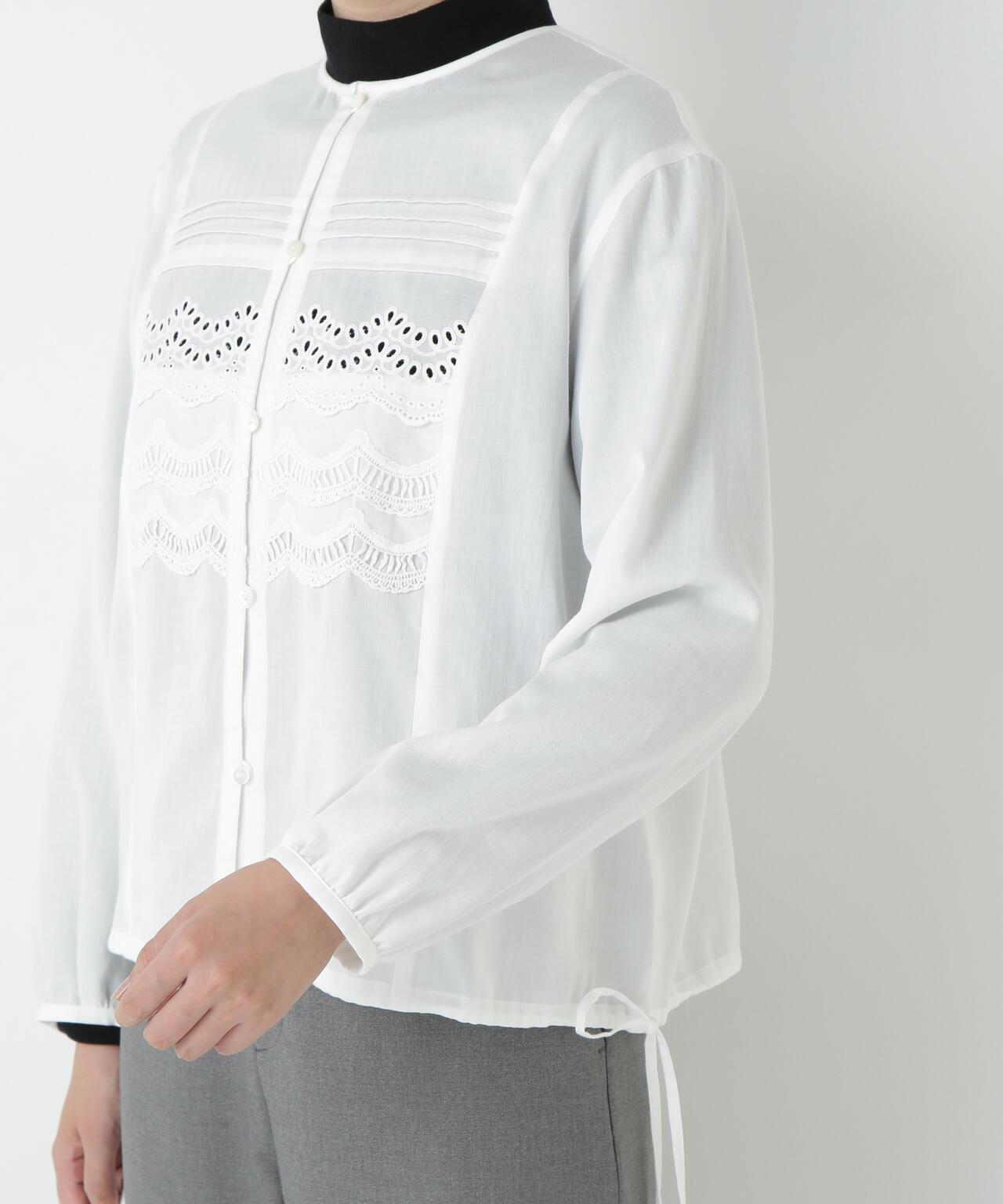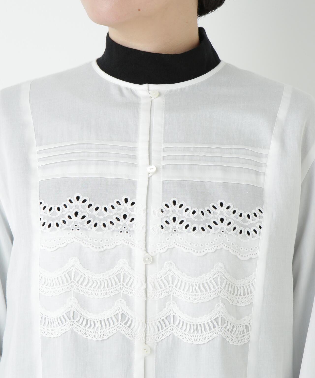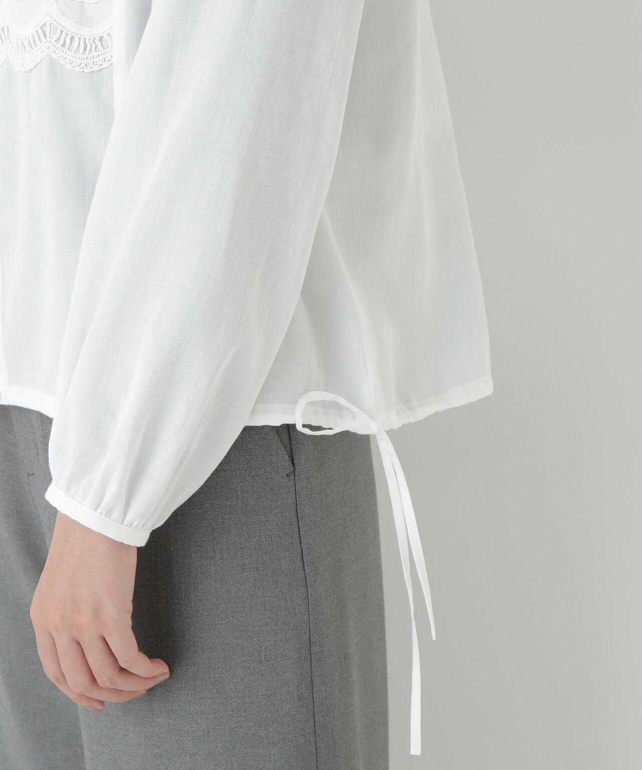 輕柔質感設計的襯衫,配以奢華的棉質蕾絲 [設計特色] 這是一款外觀華麗的襯衫,配以奢華的棉質蕾絲。襯衫下襬有抽繩設計,前襟可敞開穿著。上衣由 100% 純棉緞面製成,具有天然纖維特有的柔和質感和手感。蕾絲則採用兩種按需染色的蕾絲,盡顯奢華。推薦搭配】袖口稍寬,專為疊穿設計,是一款易於疊穿的單品。可與龜毛衫或長 T 進行疊穿,適合長季節穿著。