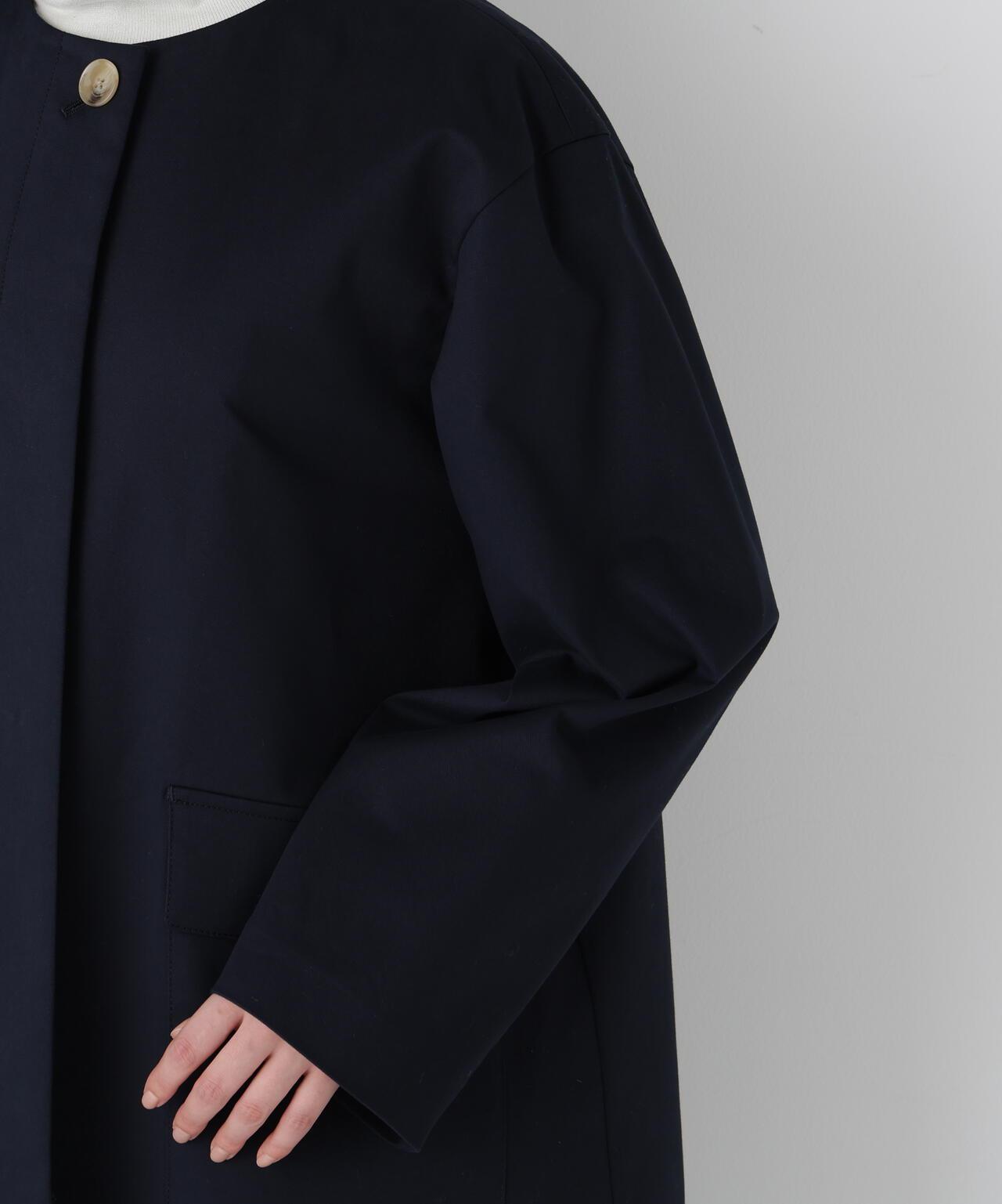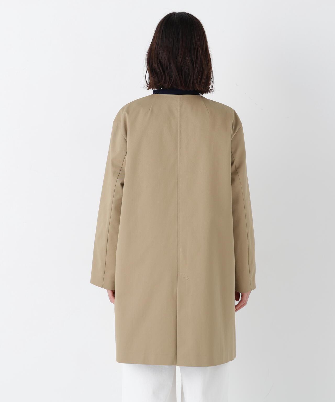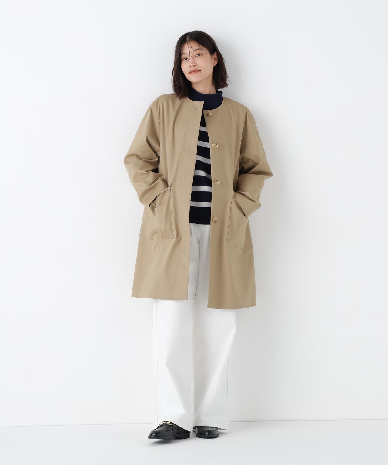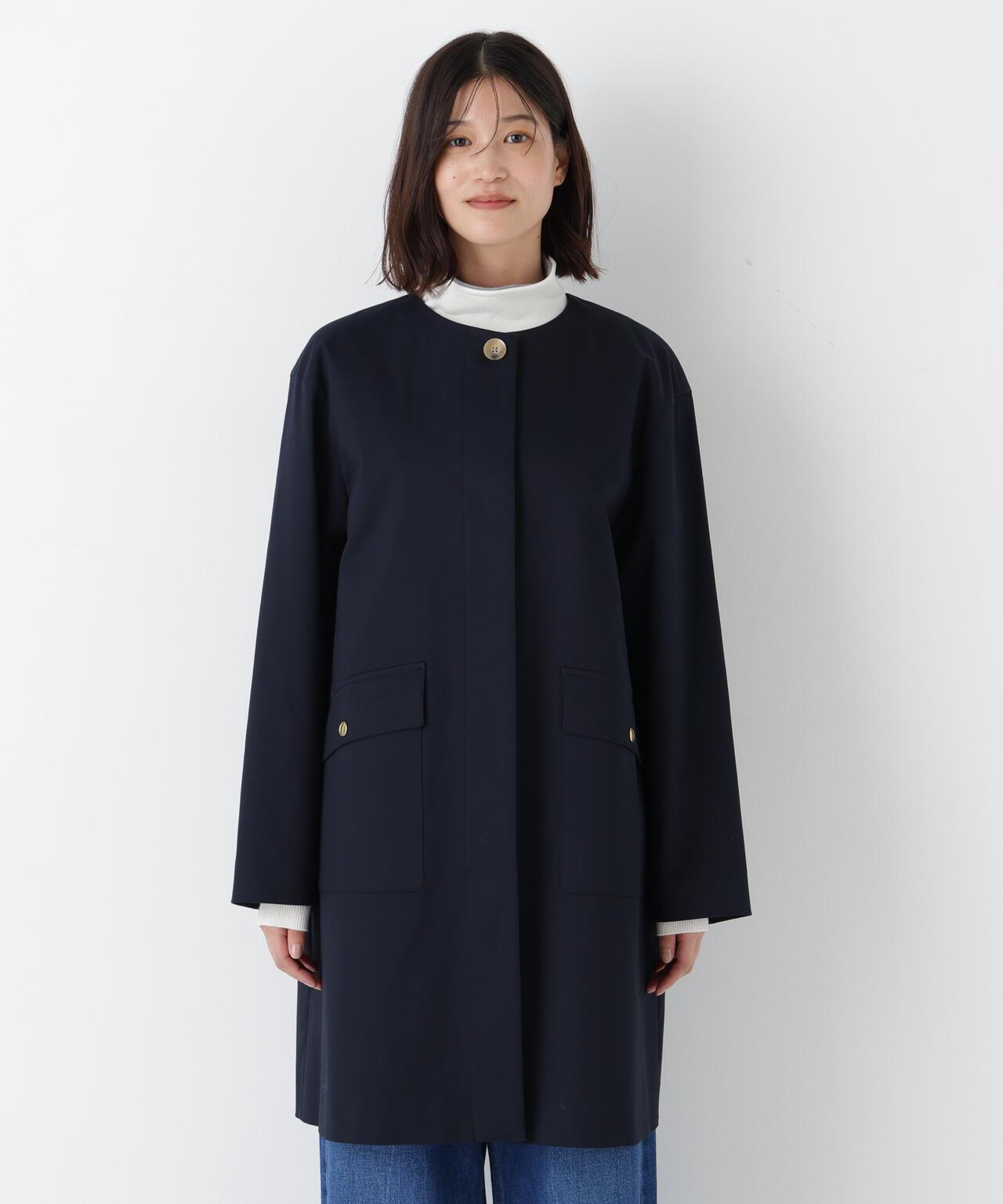 無領大衣,適用於各種場合 [設計要點] 翻蓋口袋上的金屬圓點紐扣給人一種奢華的感覺。內襯可拆卸,以適應不同的溫度。內側滾邊採用自由女神圖案,每次穿脫都能看到令人興奮的設計。彈力加貝爾面料由有機棉製成。長棉布的使用營造出光滑的質感。長度可與長褲或裙子搭配。領子是無領的,因此與荷葉邊襯衫和高領毛衣都很搭。
