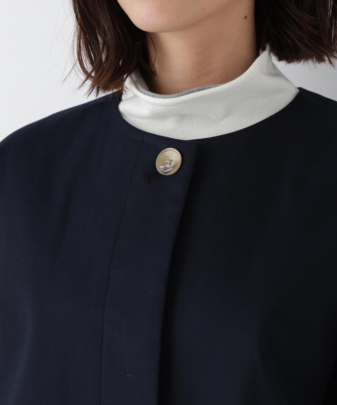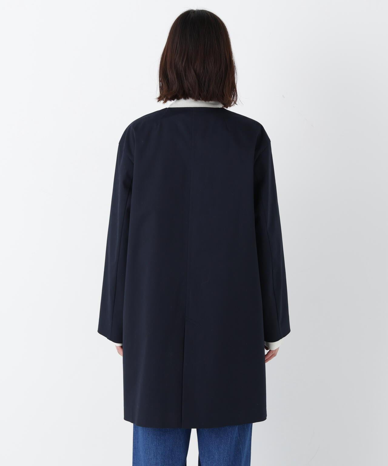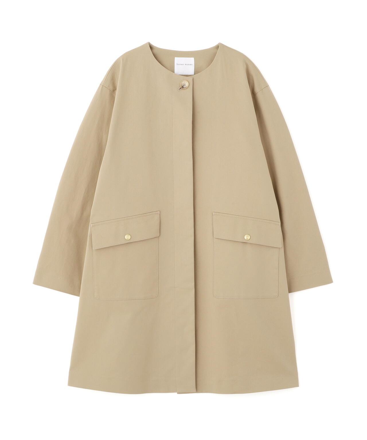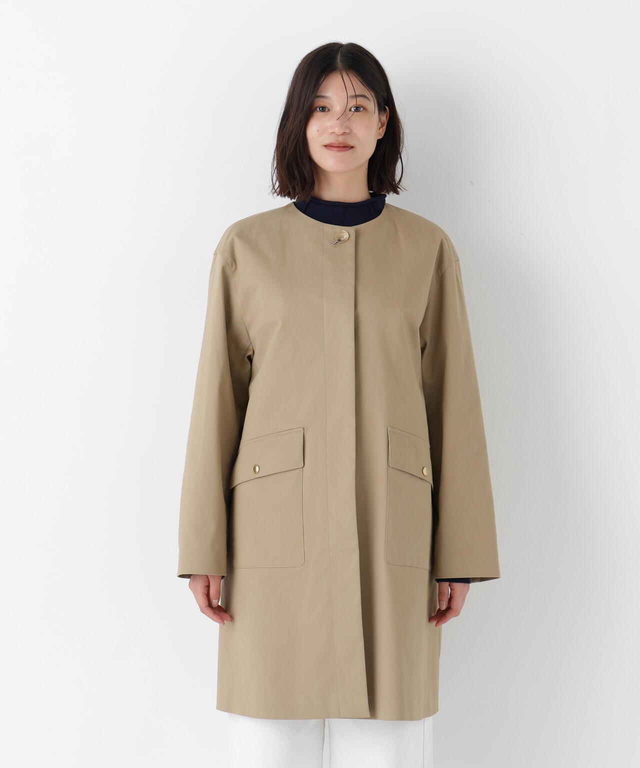 無領大衣,適用於各種場合 [設計要點] 翻蓋口袋上的金屬圓點紐扣給人一種奢華的感覺。內襯可拆卸,以適應不同的溫度。內側滾邊採用自由女神圖案,每次穿脫都能看到令人興奮的設計。彈力加貝爾面料由有機棉製成。長棉布的使用營造出光滑的質感。長度可與長褲或裙子搭配。領子是無領的,因此與荷葉邊襯衫和高領毛衣都很搭。