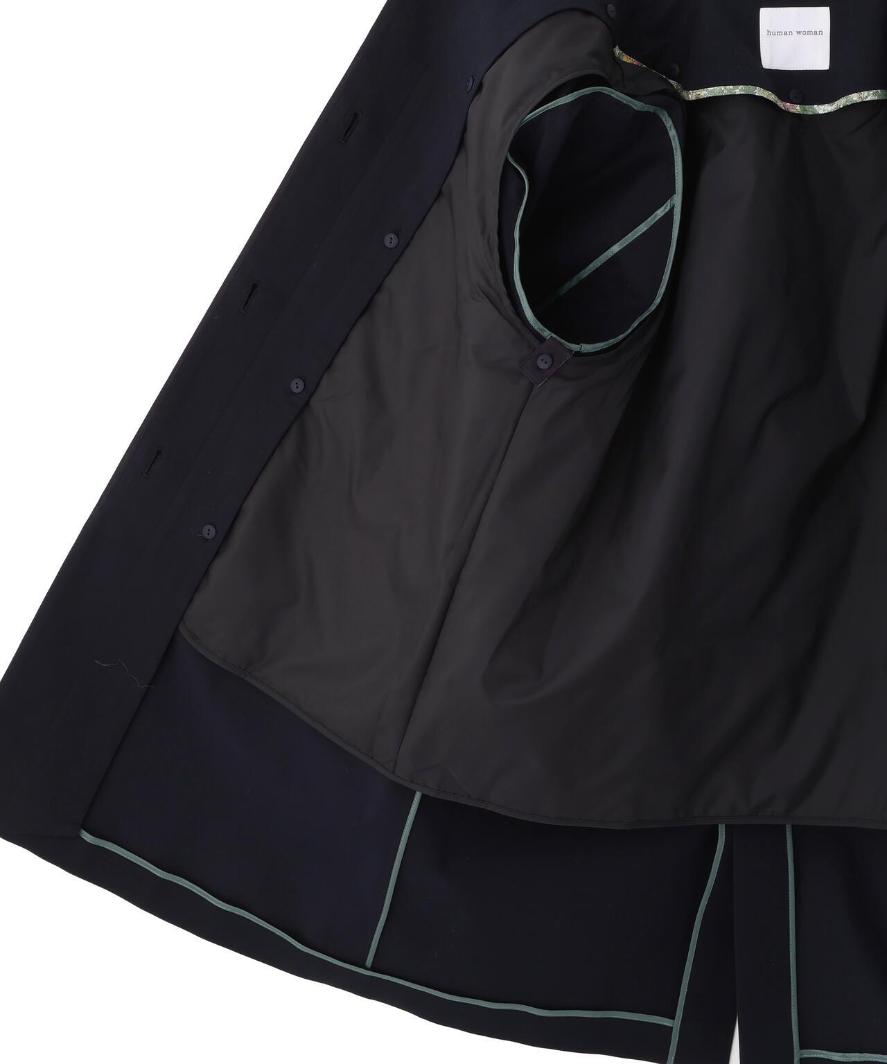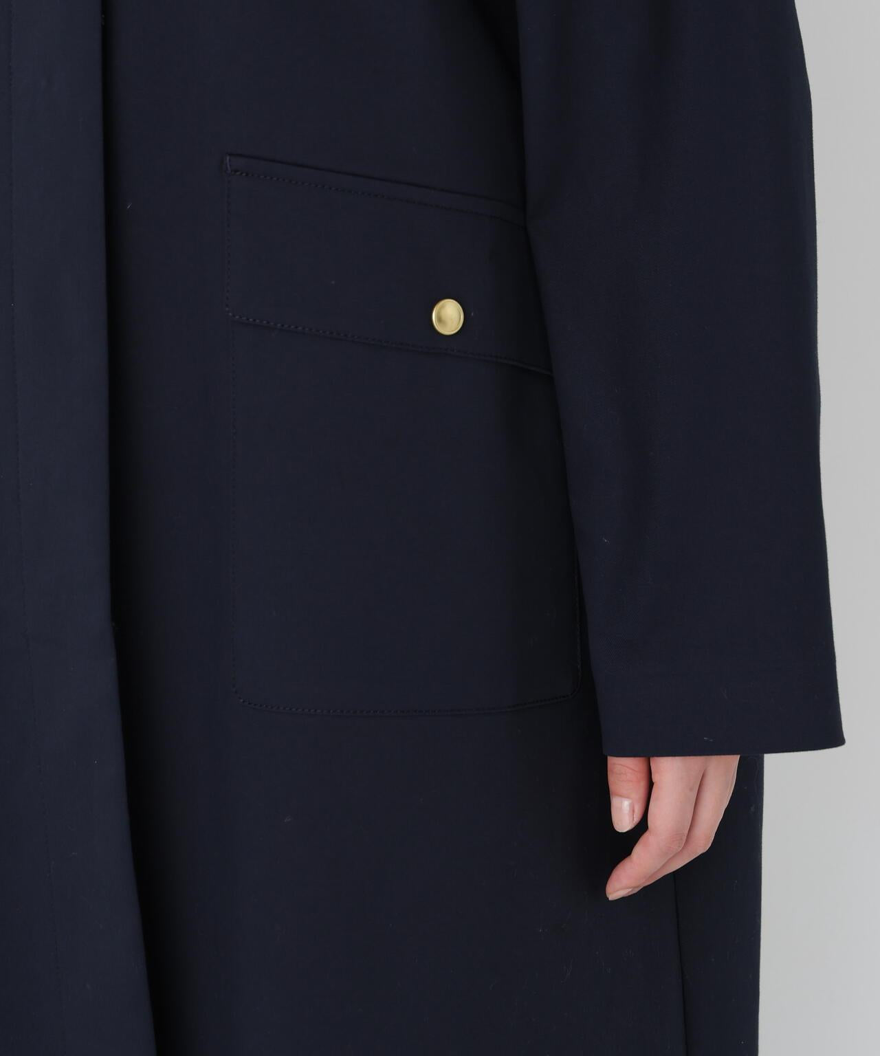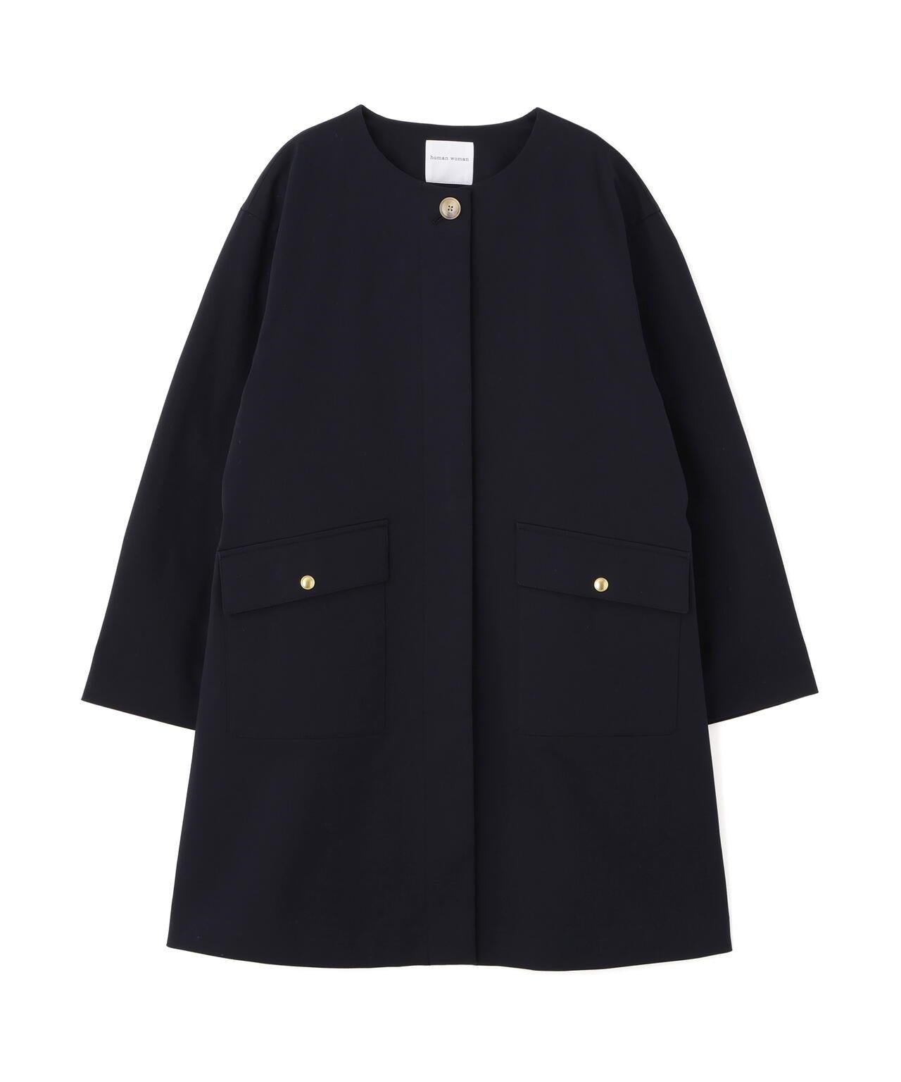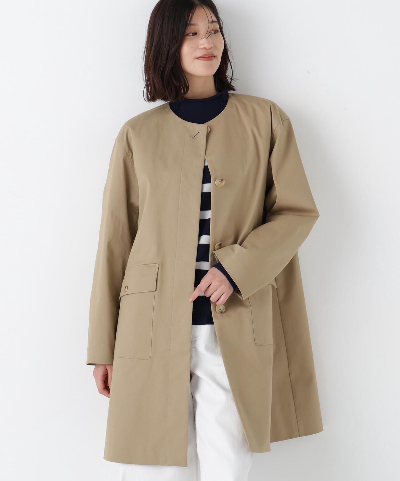 無領大衣,適用於各種場合 [設計要點] 翻蓋口袋上的金屬圓點紐扣給人一種奢華的感覺。內襯可拆卸,以適應不同的溫度。內側滾邊採用自由女神圖案,每次穿脫都能看到令人興奮的設計。彈力加貝爾面料由有機棉製成。長棉布的使用營造出光滑的質感。長度可與長褲或裙子搭配。領子是無領的,因此與荷葉邊襯衫和高領毛衣都很搭。