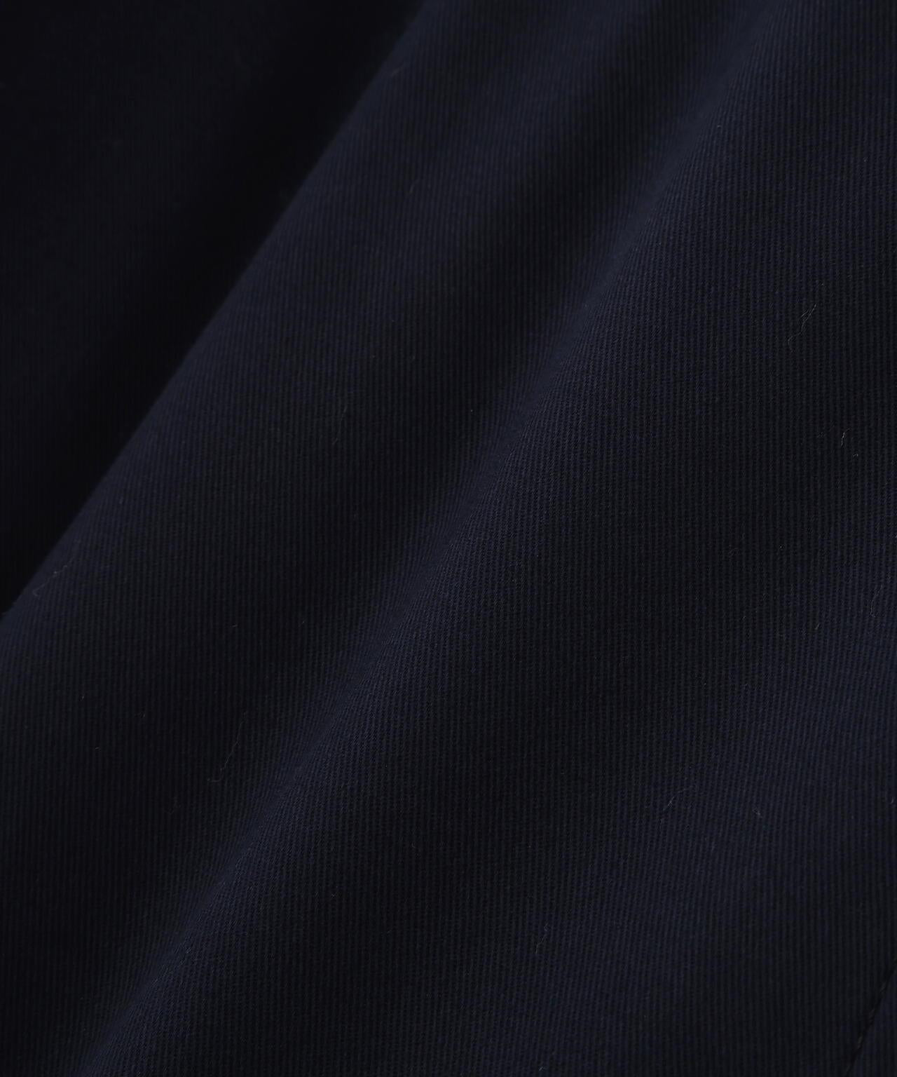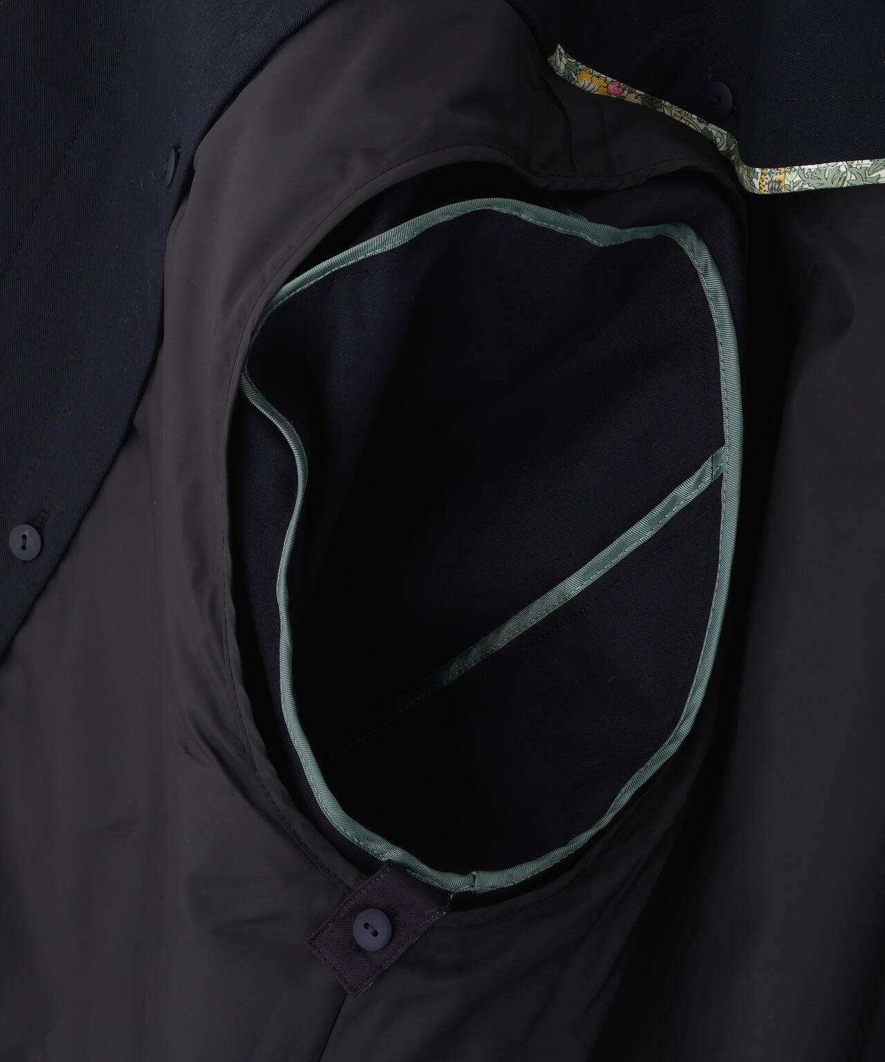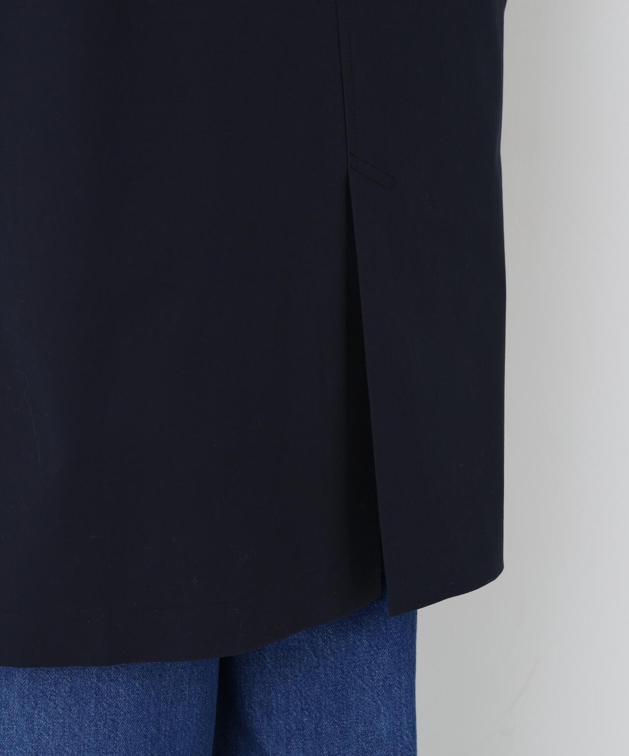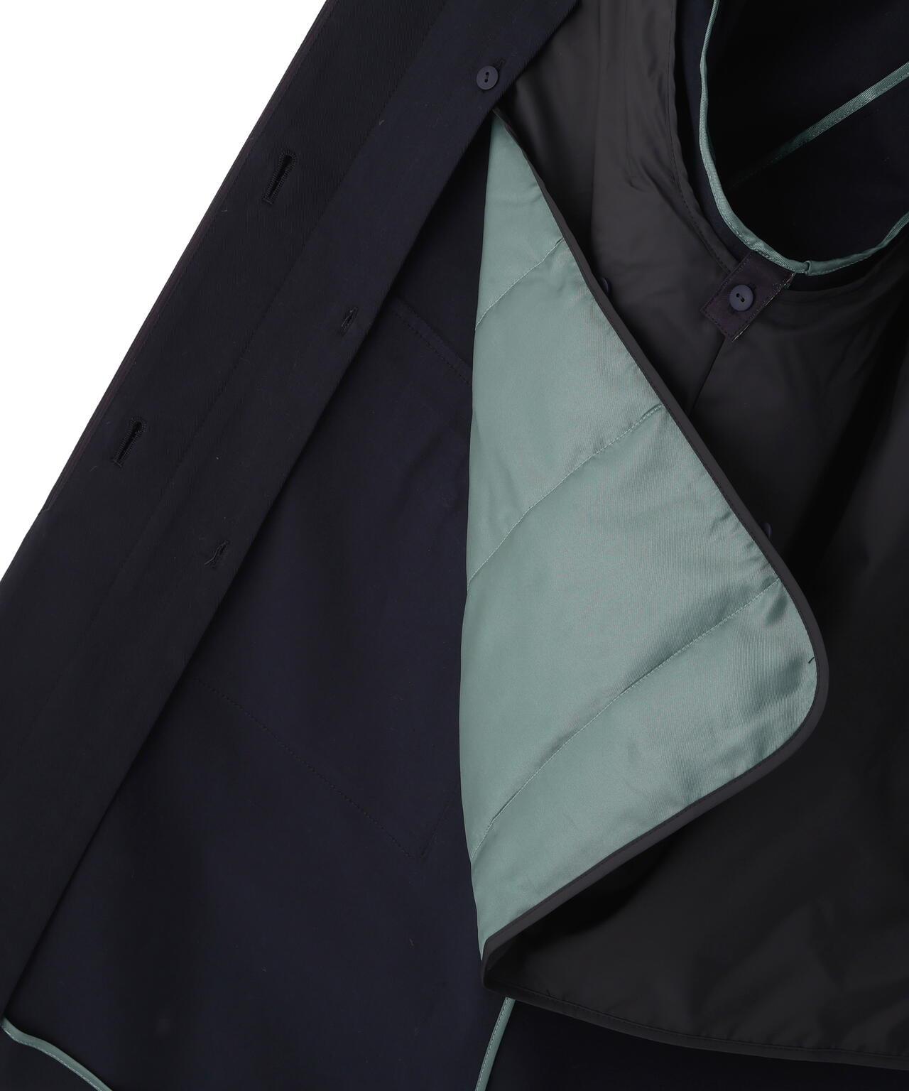 無領大衣,適用於各種場合 [設計要點] 翻蓋口袋上的金屬圓點紐扣給人一種奢華的感覺。內襯可拆卸,以適應不同的溫度。內側滾邊採用自由女神圖案,每次穿脫都能看到令人興奮的設計。彈力加貝爾面料由有機棉製成。長棉布的使用營造出光滑的質感。長度可與長褲或裙子搭配。領子是無領的,因此與荷葉邊襯衫和高領毛衣都很搭。