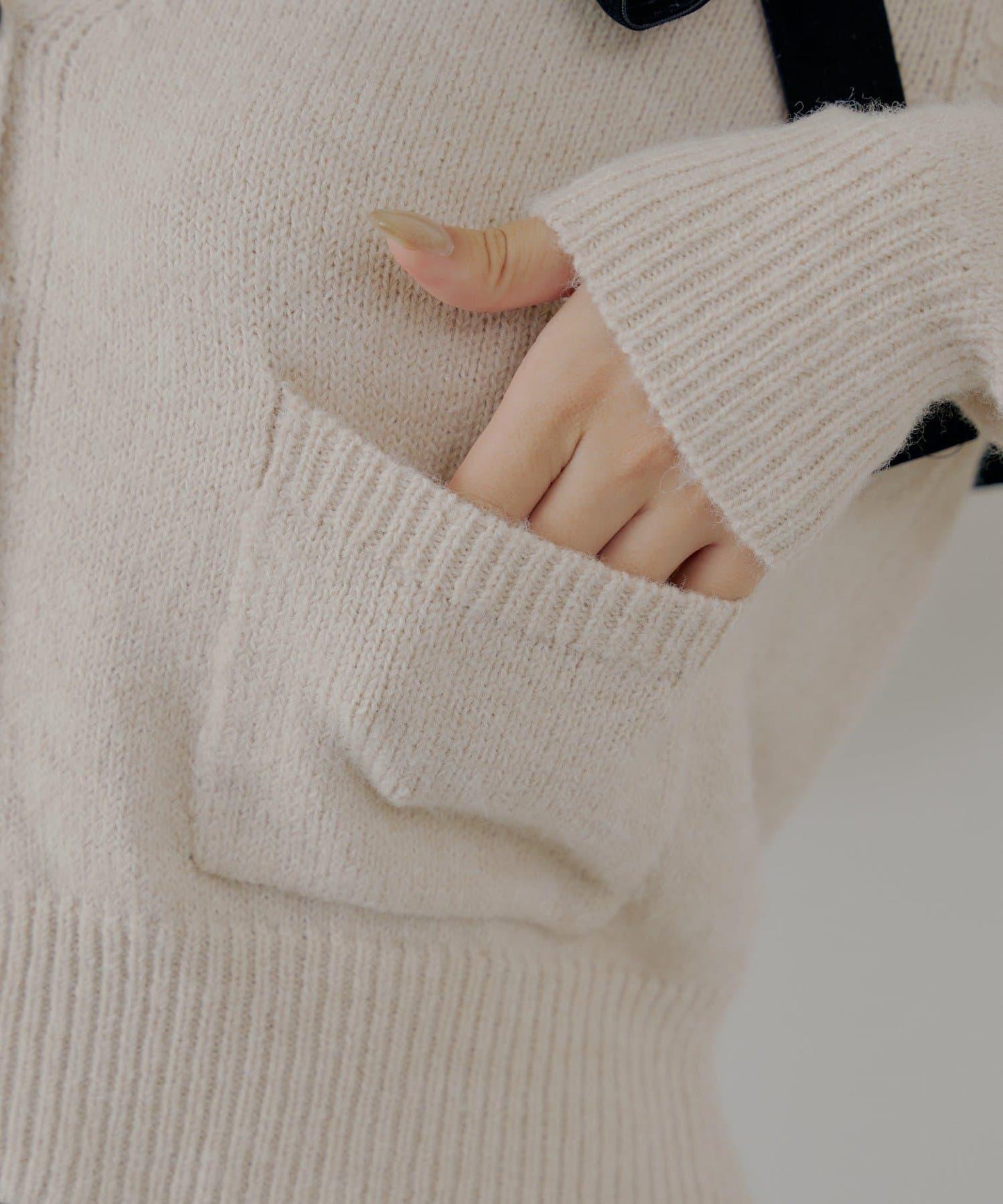 帶口袋肩部蝴蝶結寬鬆針織開衫
