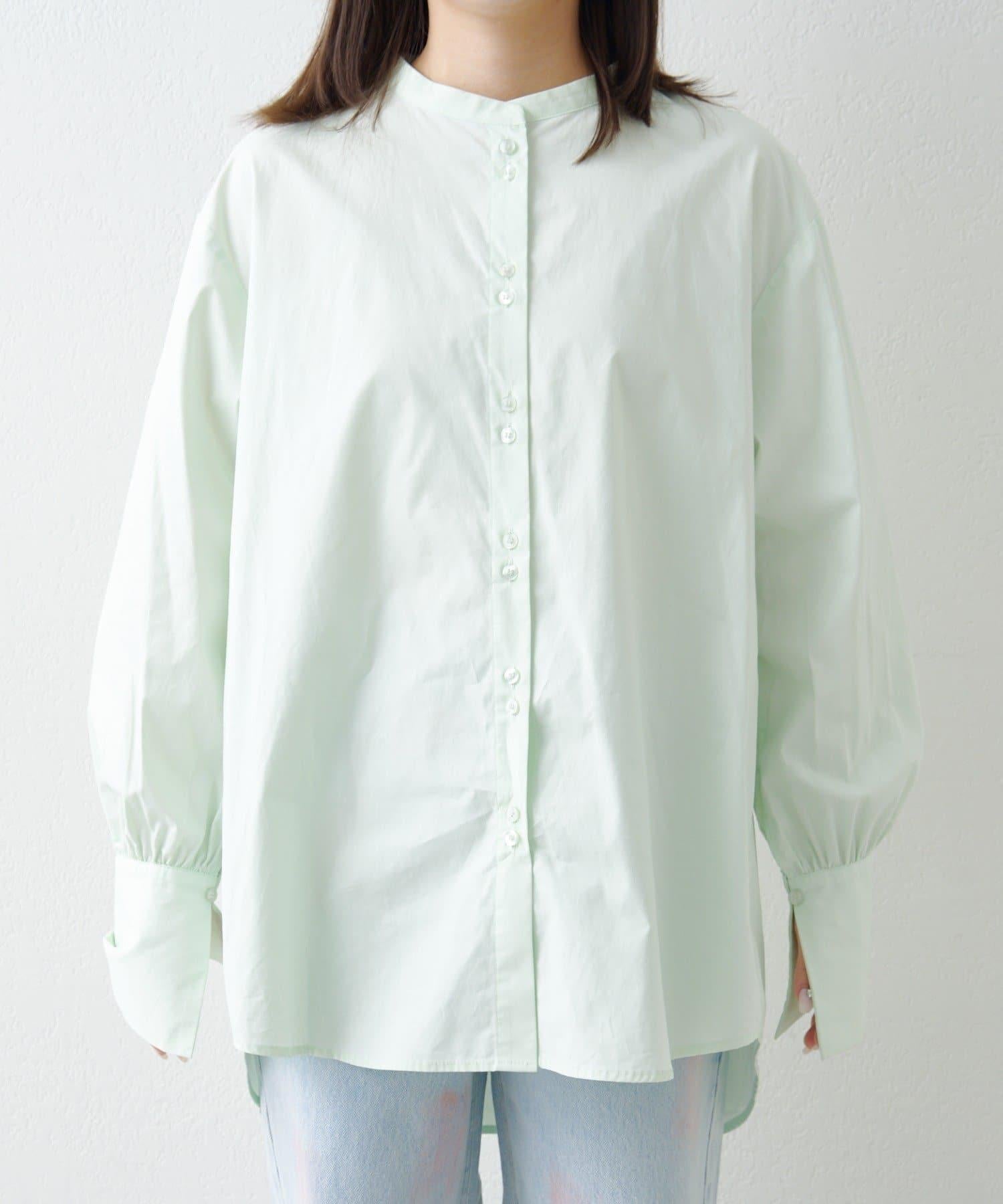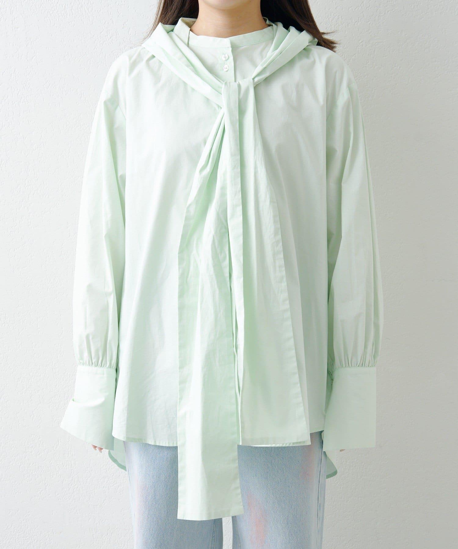 無領襯衫,輕盈的連帽設計引人注目。