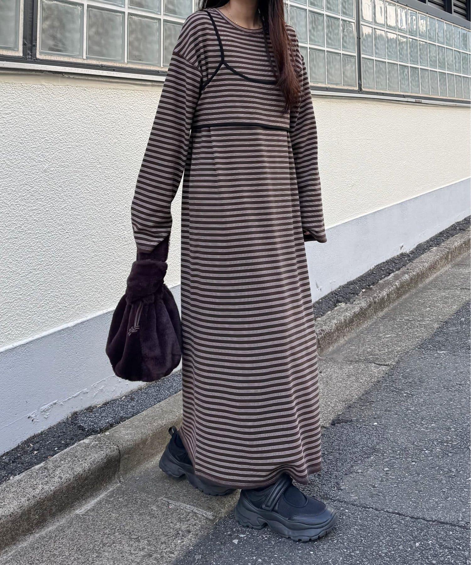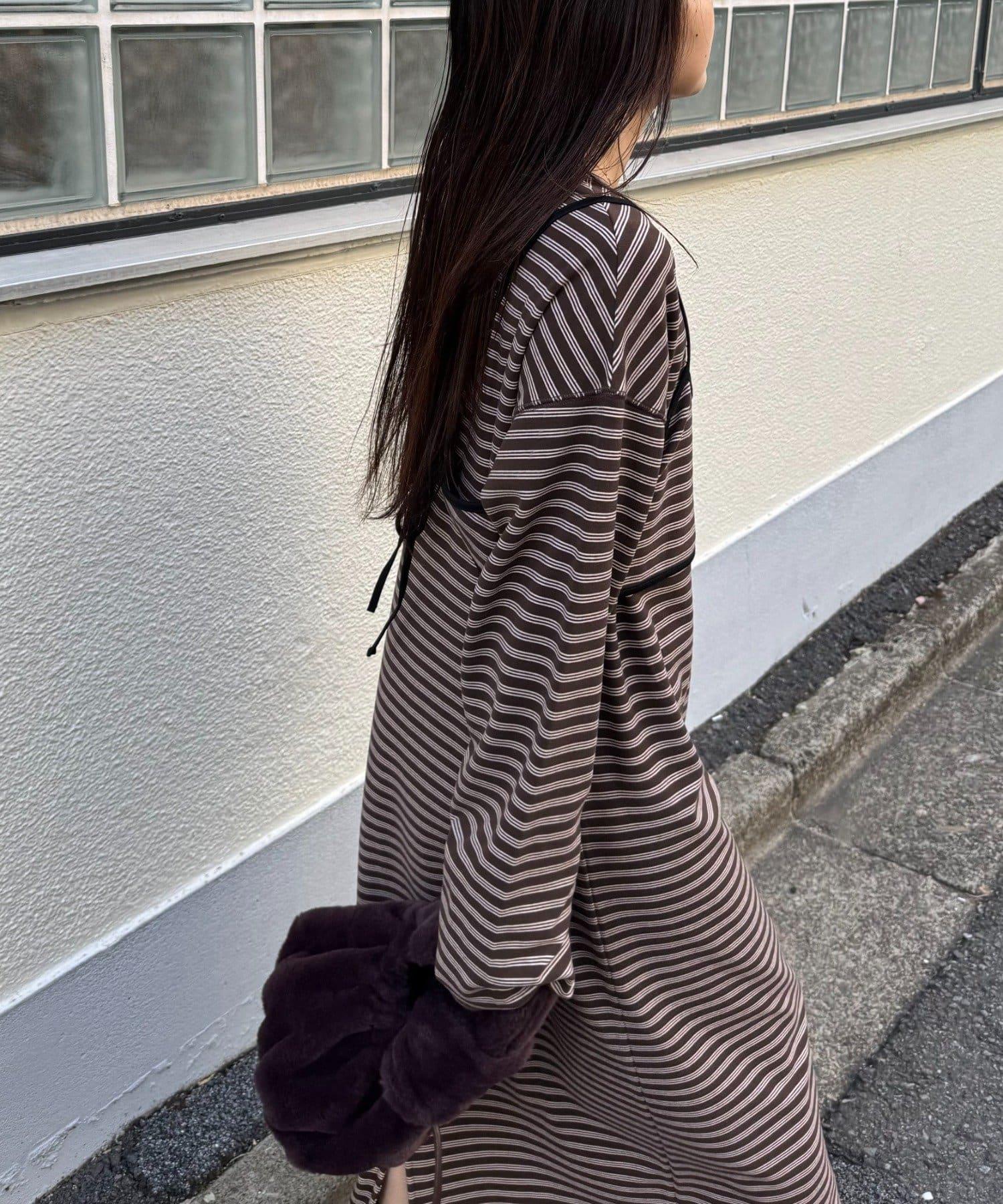 【帶束身胸衣】法蘭絨條紋拼接連衣裙