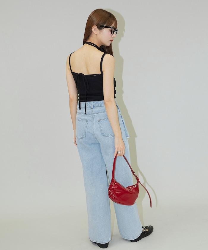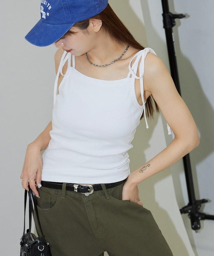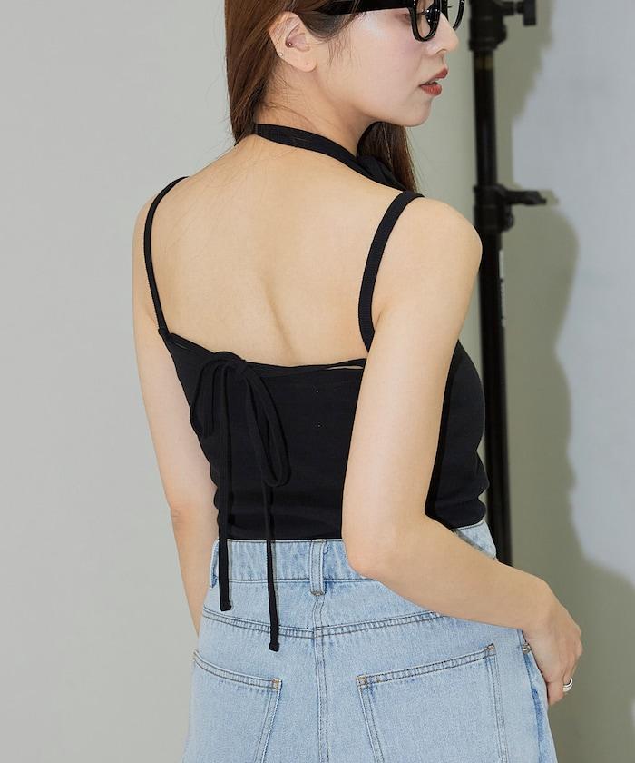 吊帶衫採用羅紋面料,設計休閒,前後各有一條緞帶,可在背後系成雙緞帶,也可作為肩帶或像choker一樣系在脖子上。