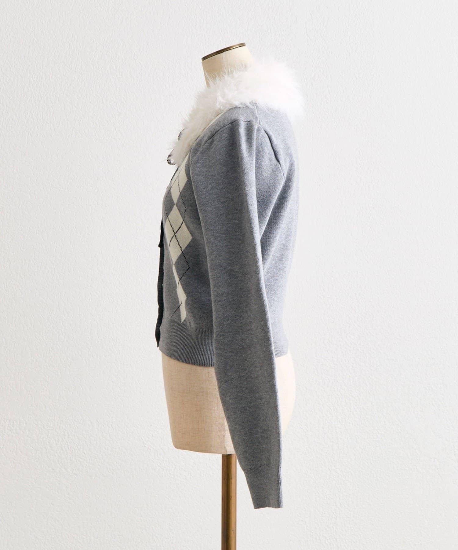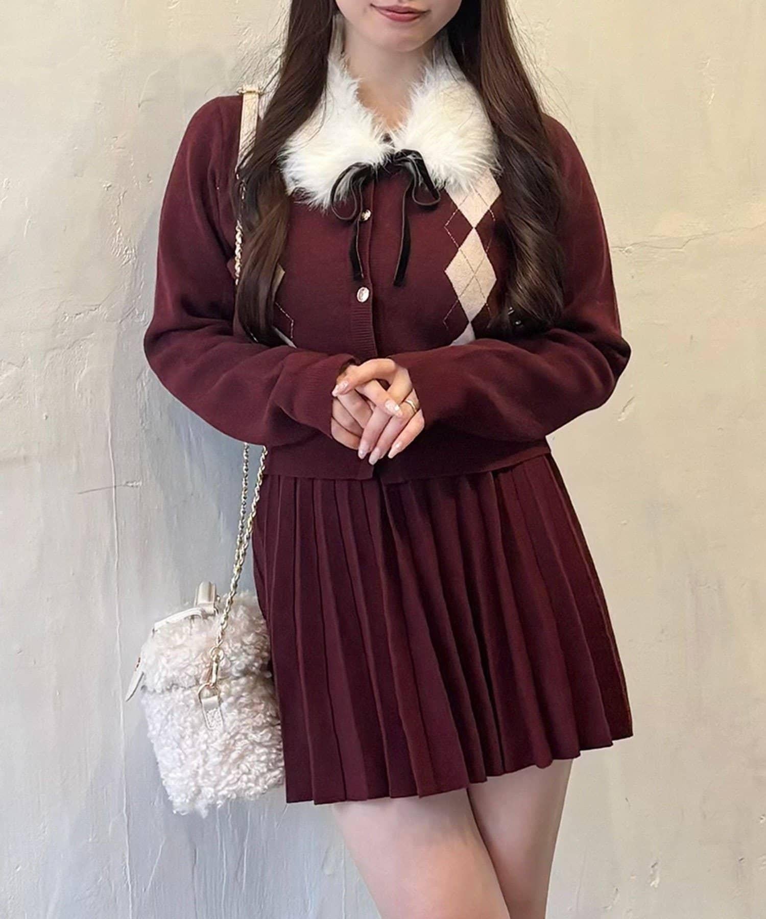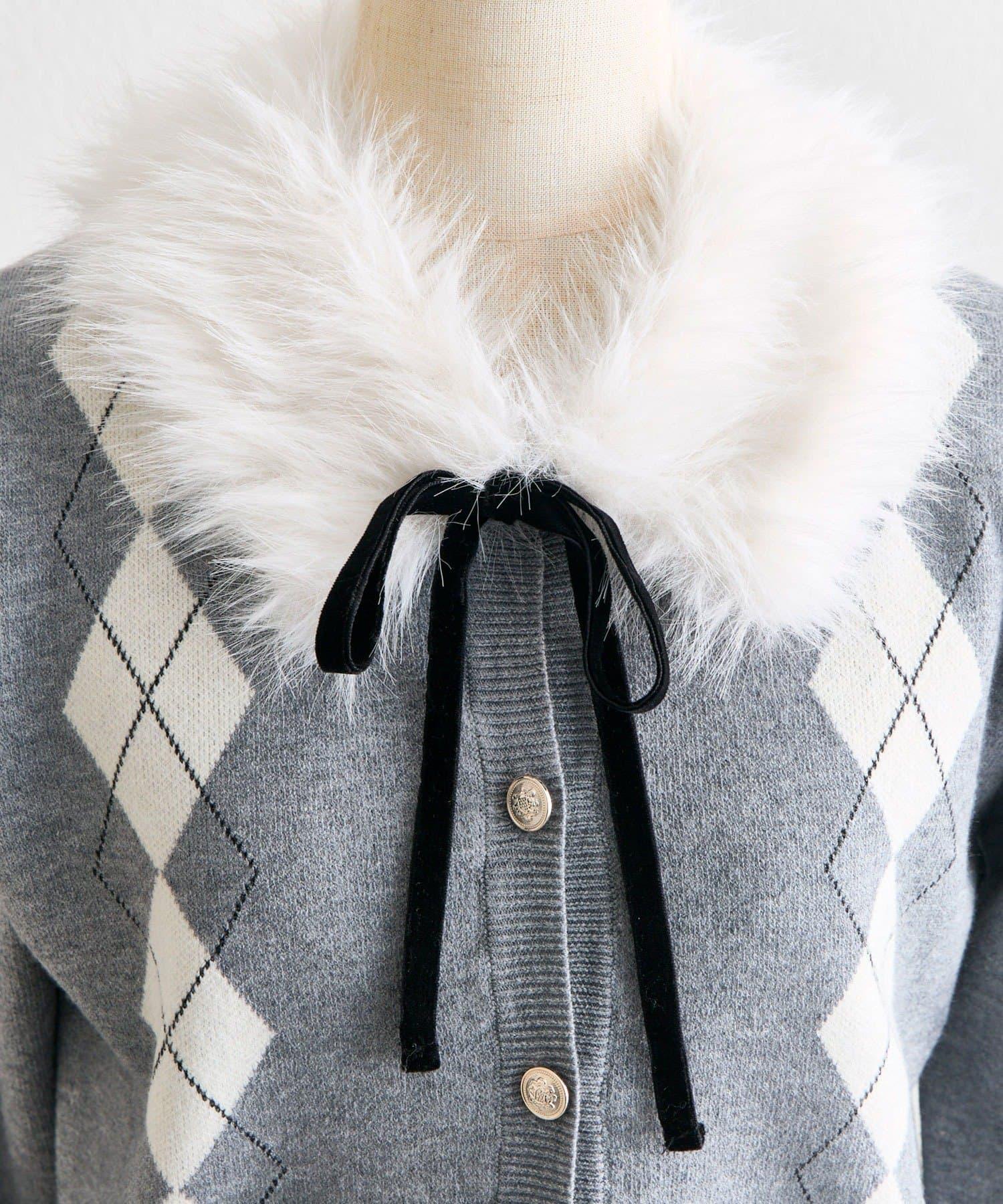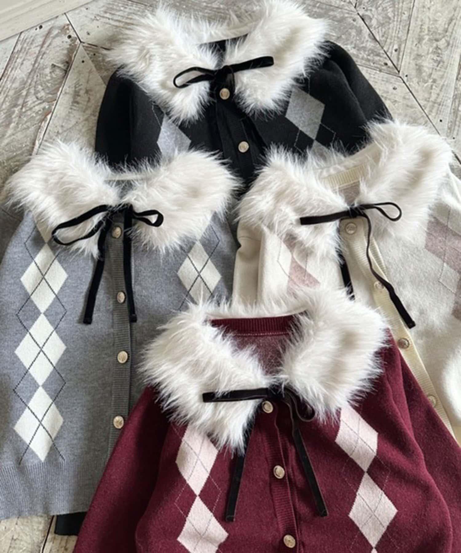 這套針織衫的毛皮飾帶搭配絲絨緞帶和閃亮紗線的菱形格紋。