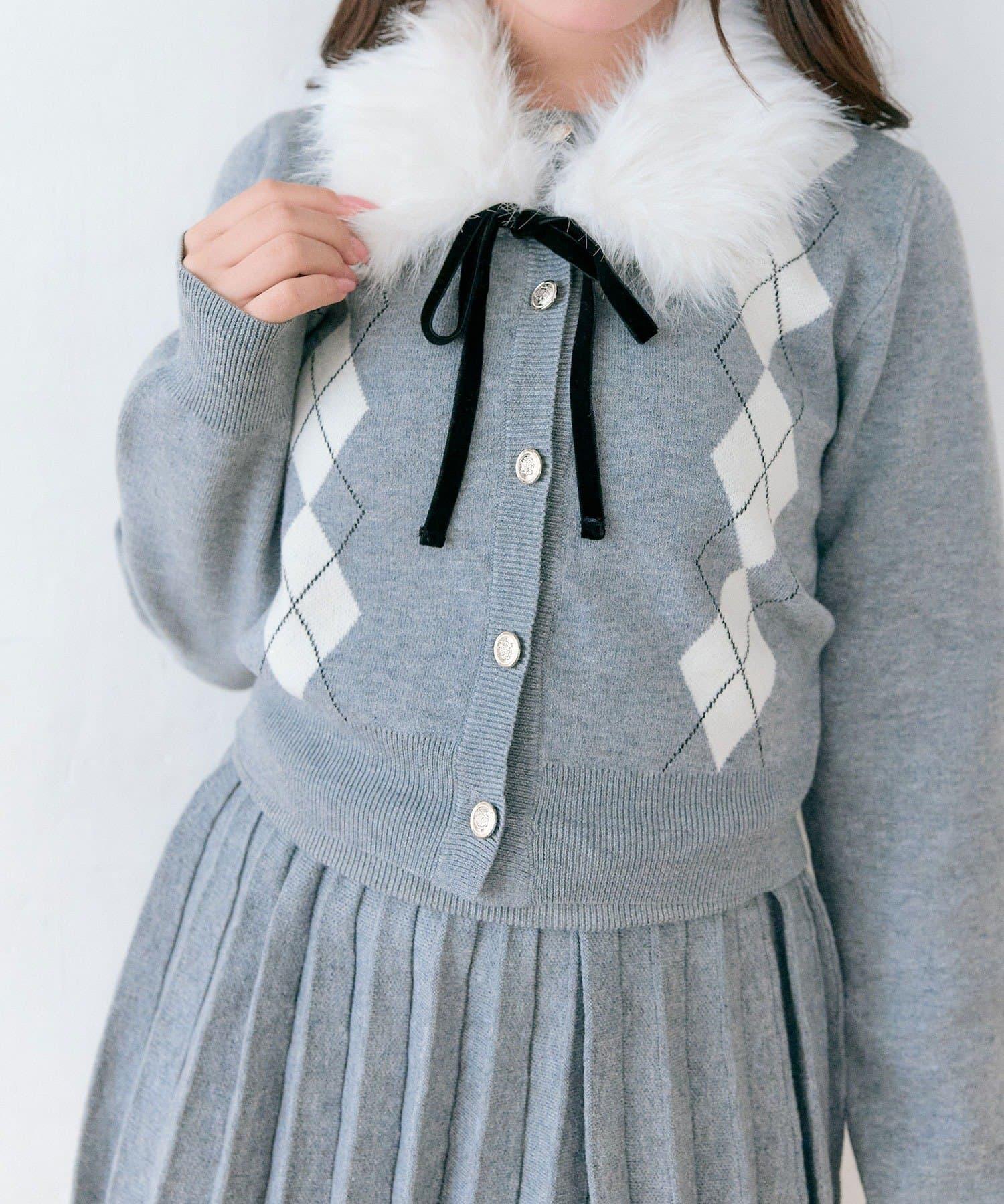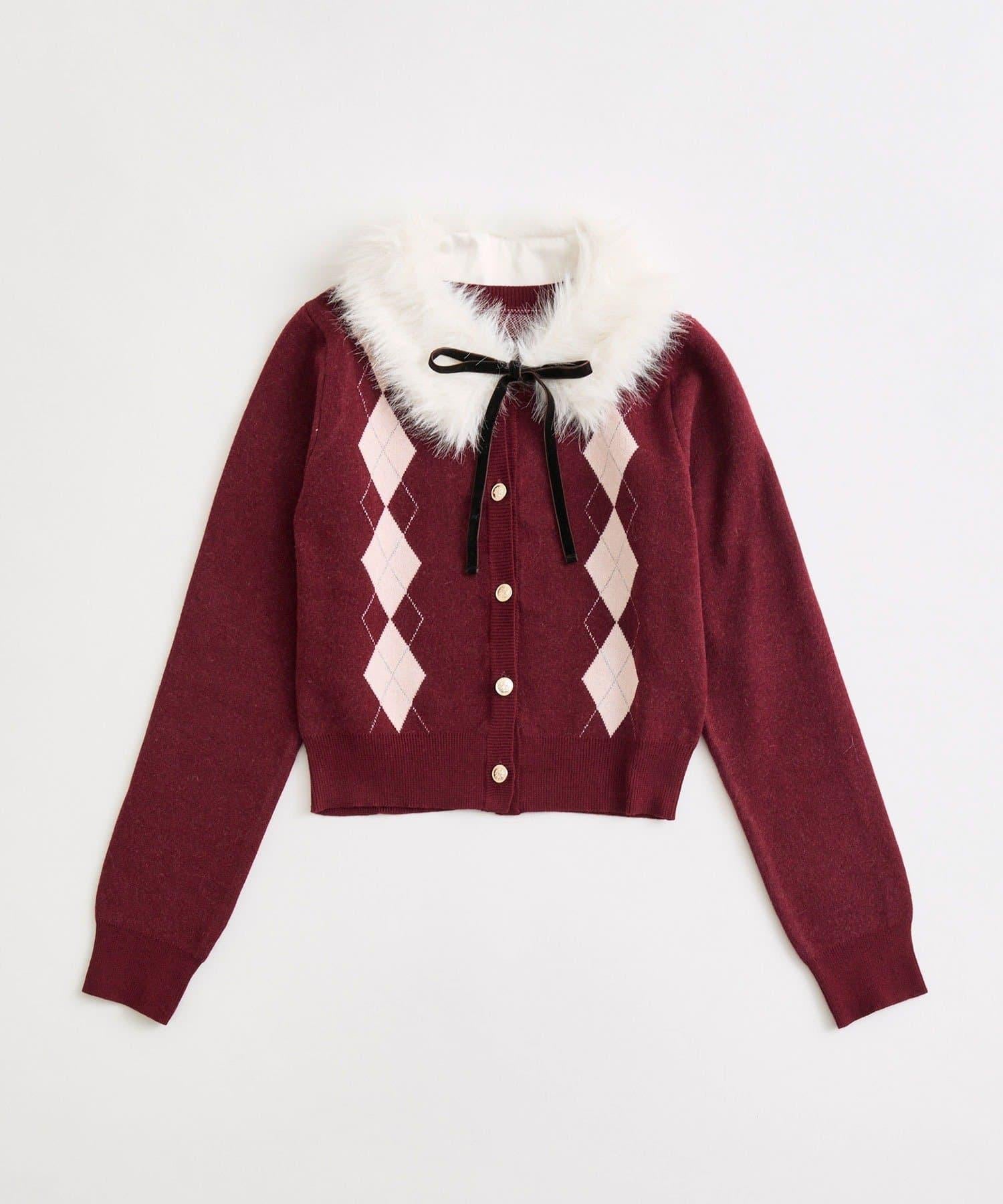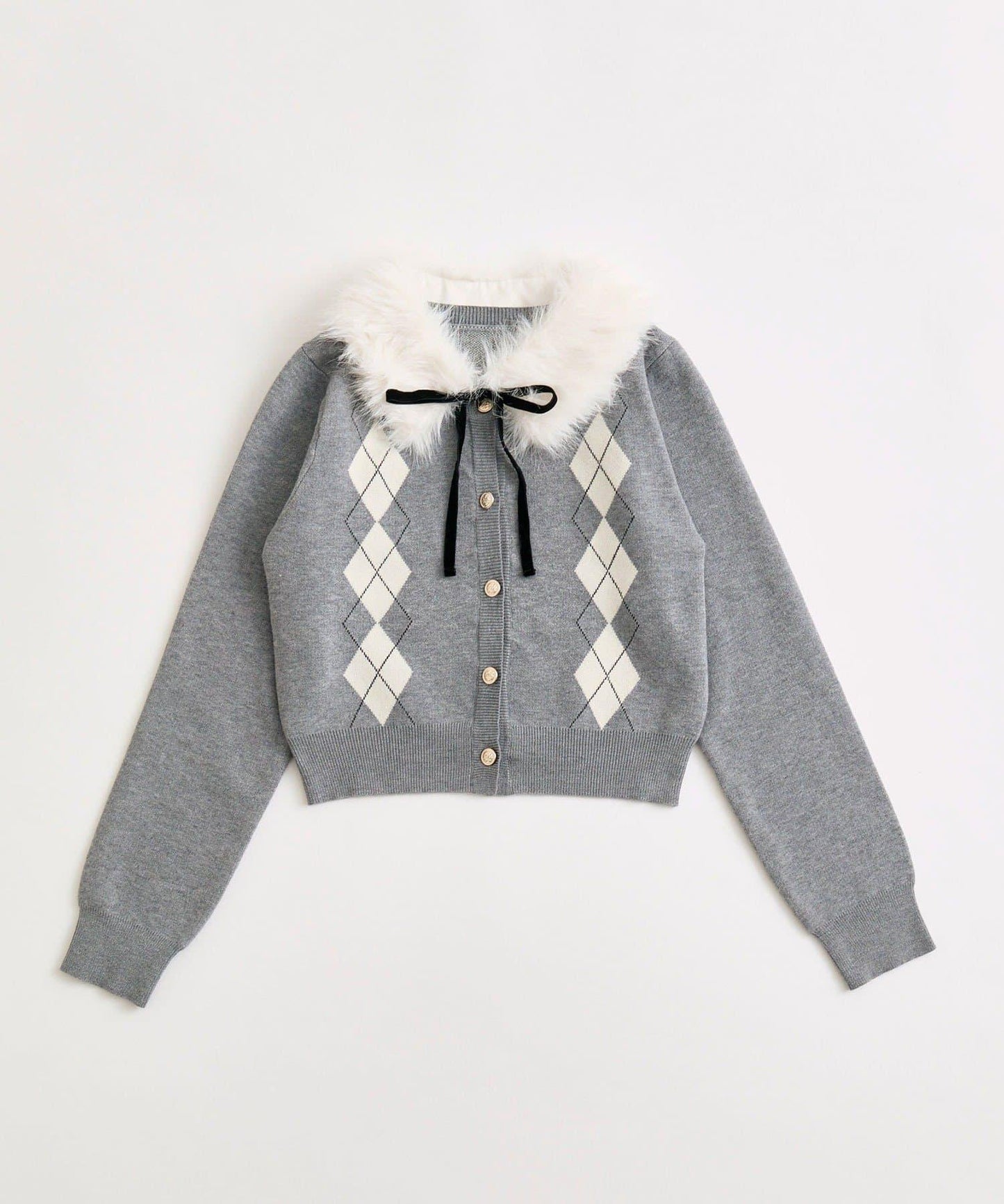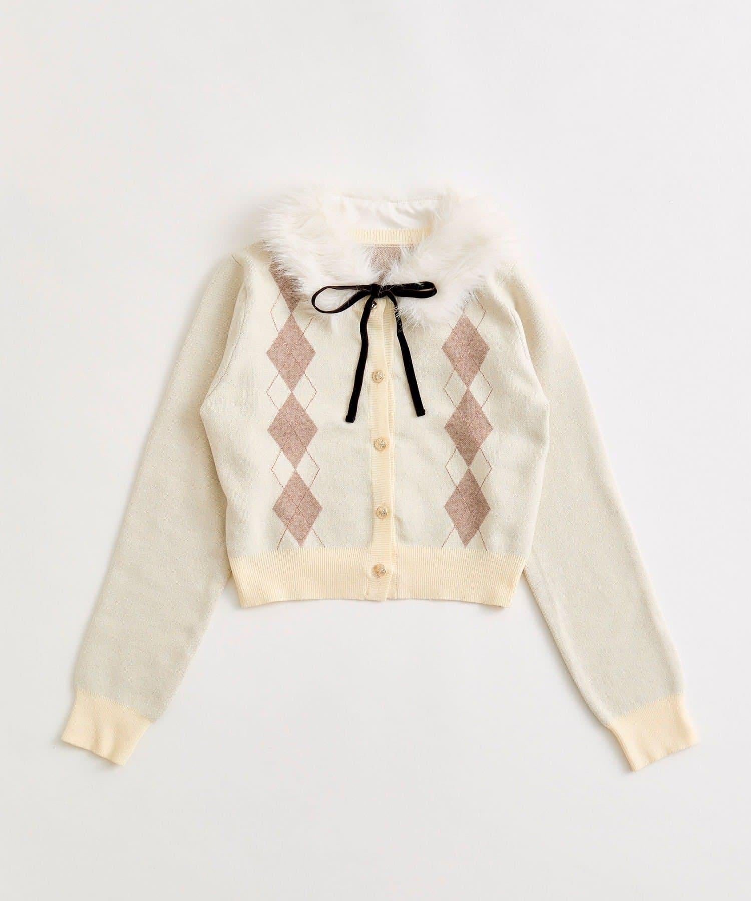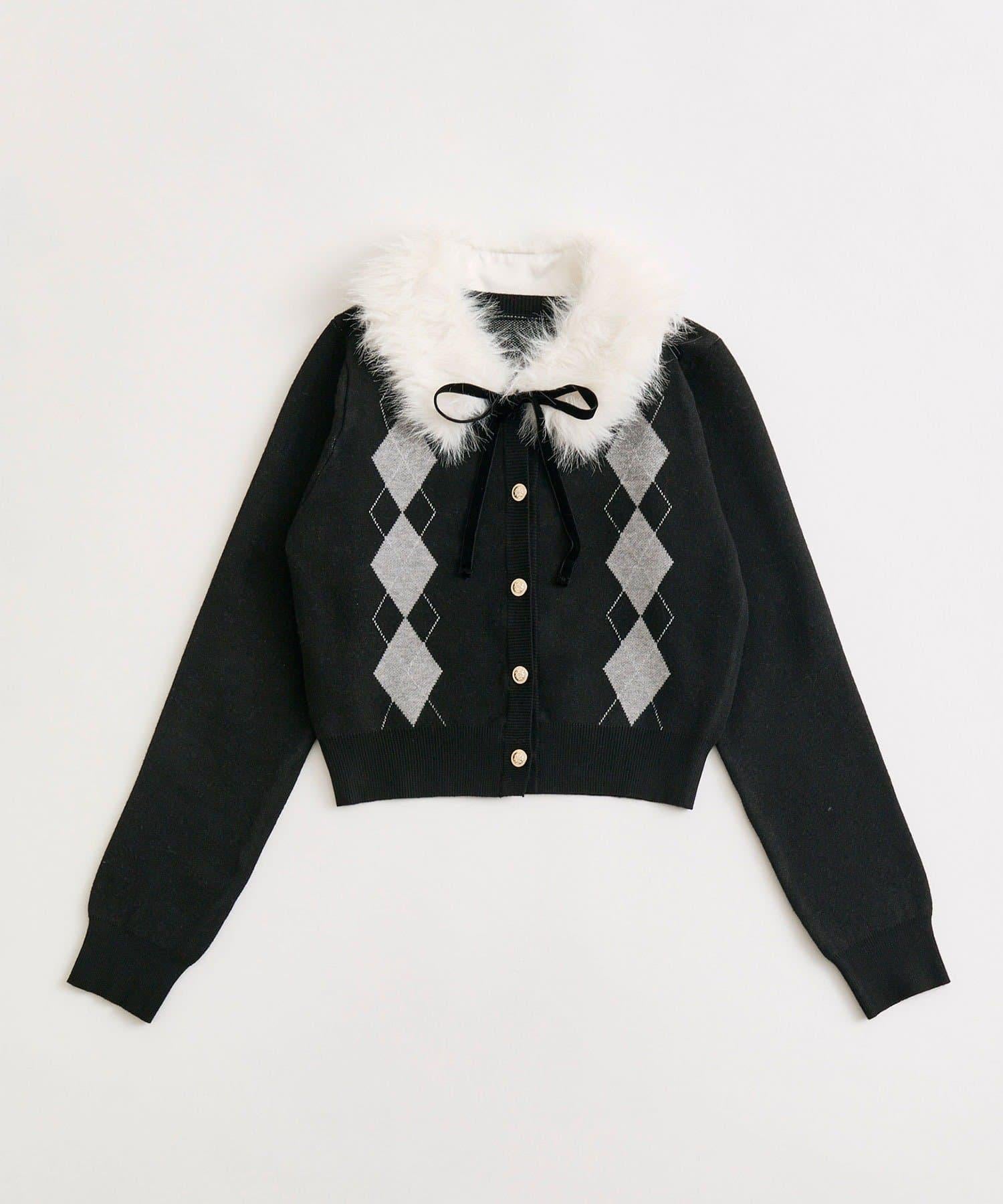 這套針織衫的毛皮飾帶搭配絲絨緞帶和閃亮紗線的菱形格紋。
