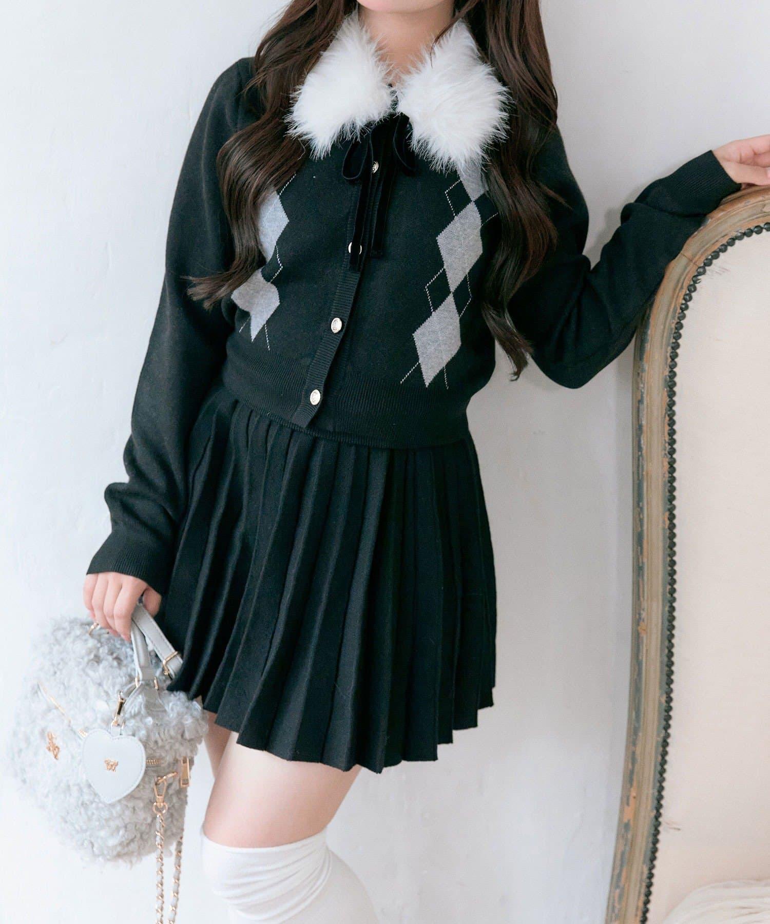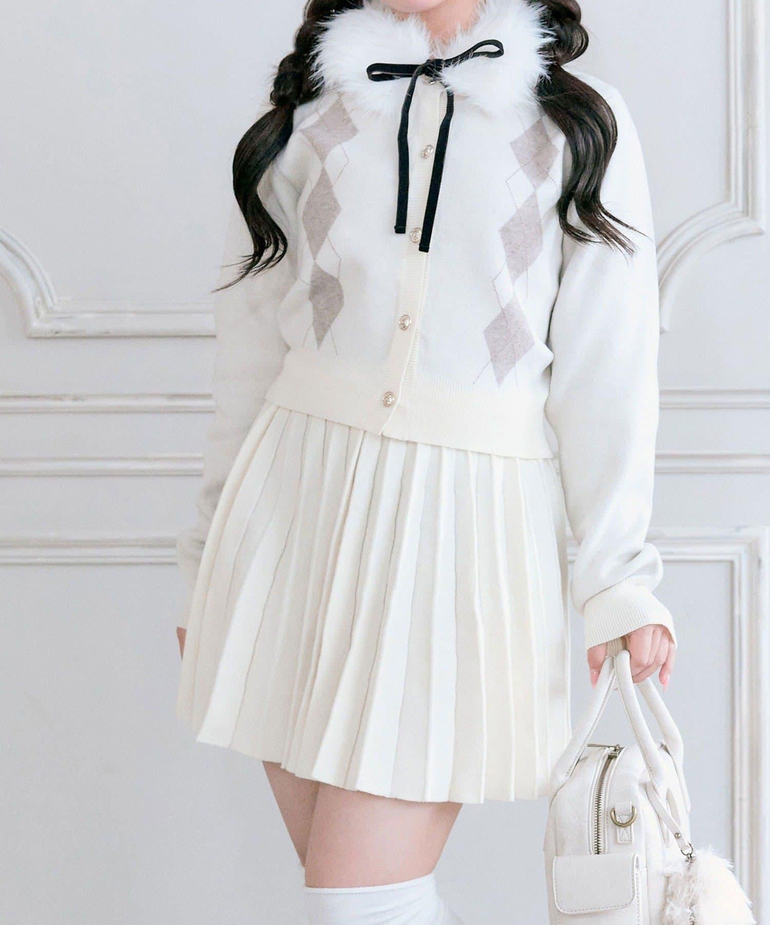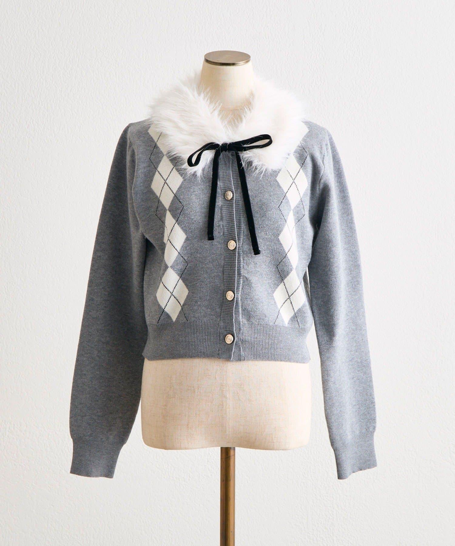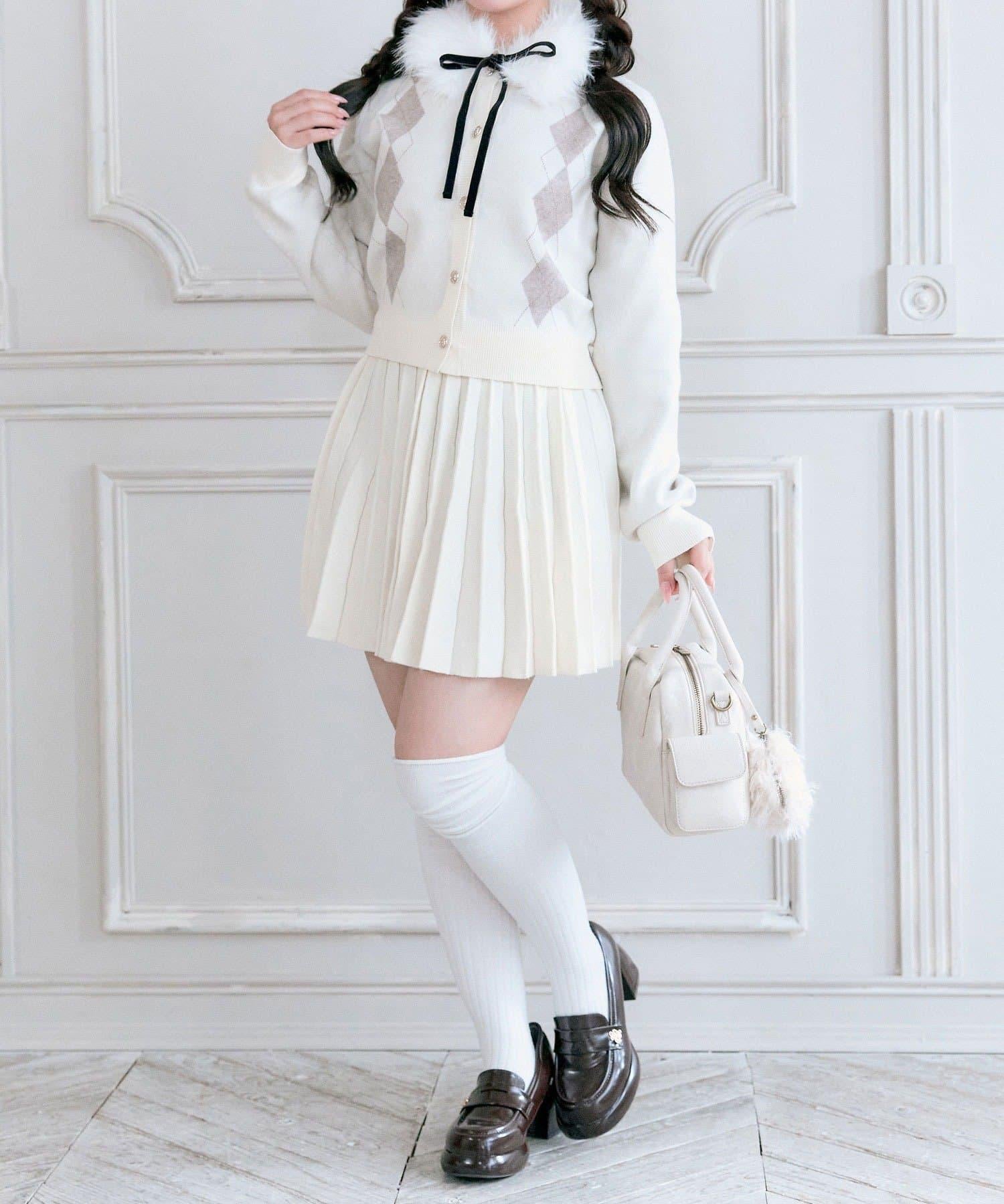 這套針織衫的毛皮飾帶搭配絲絨緞帶和閃亮紗線的菱形格紋。