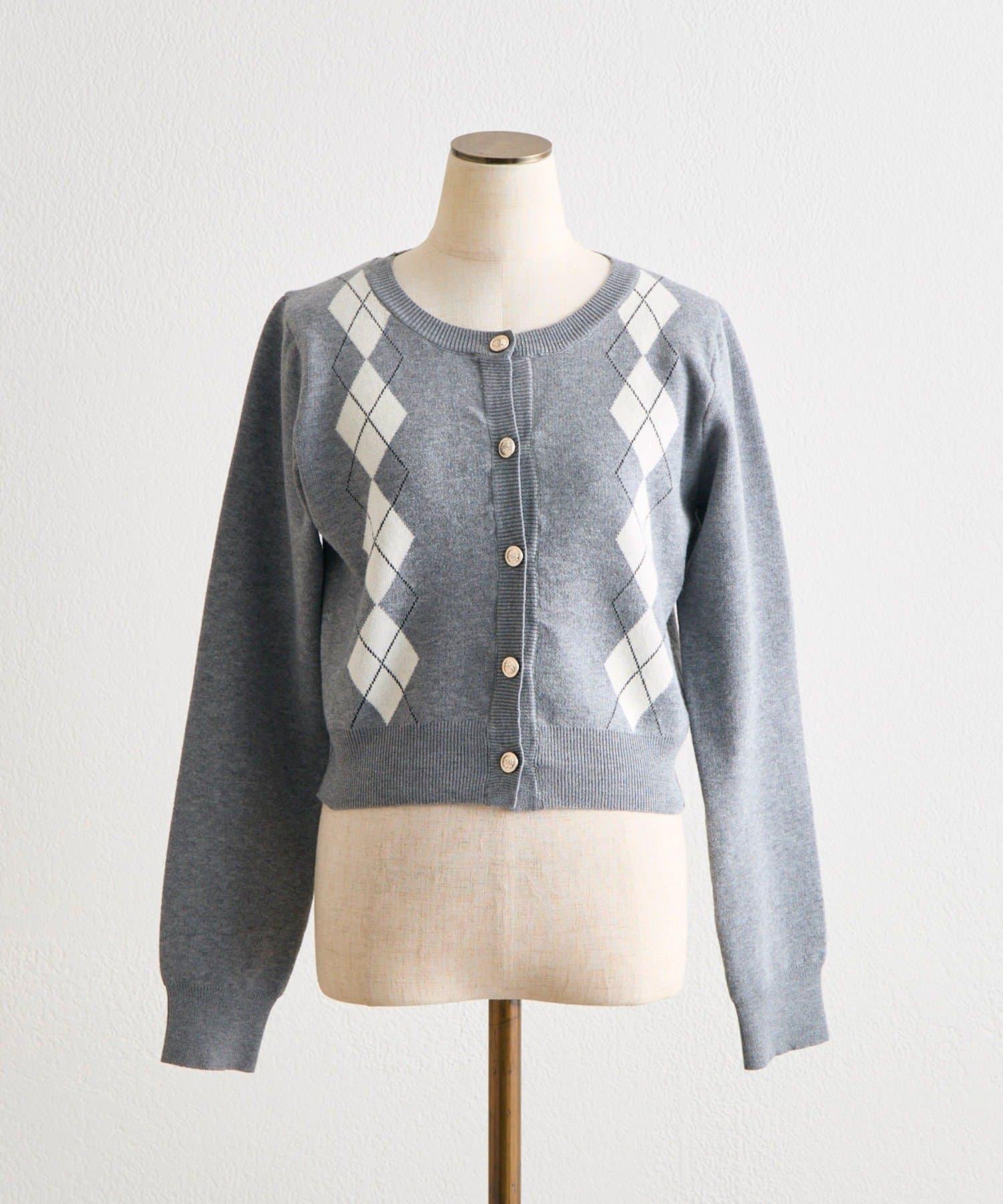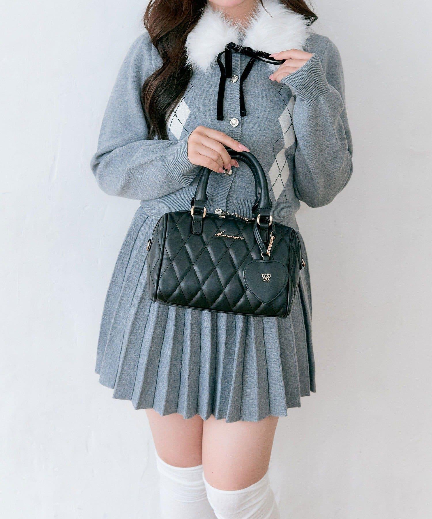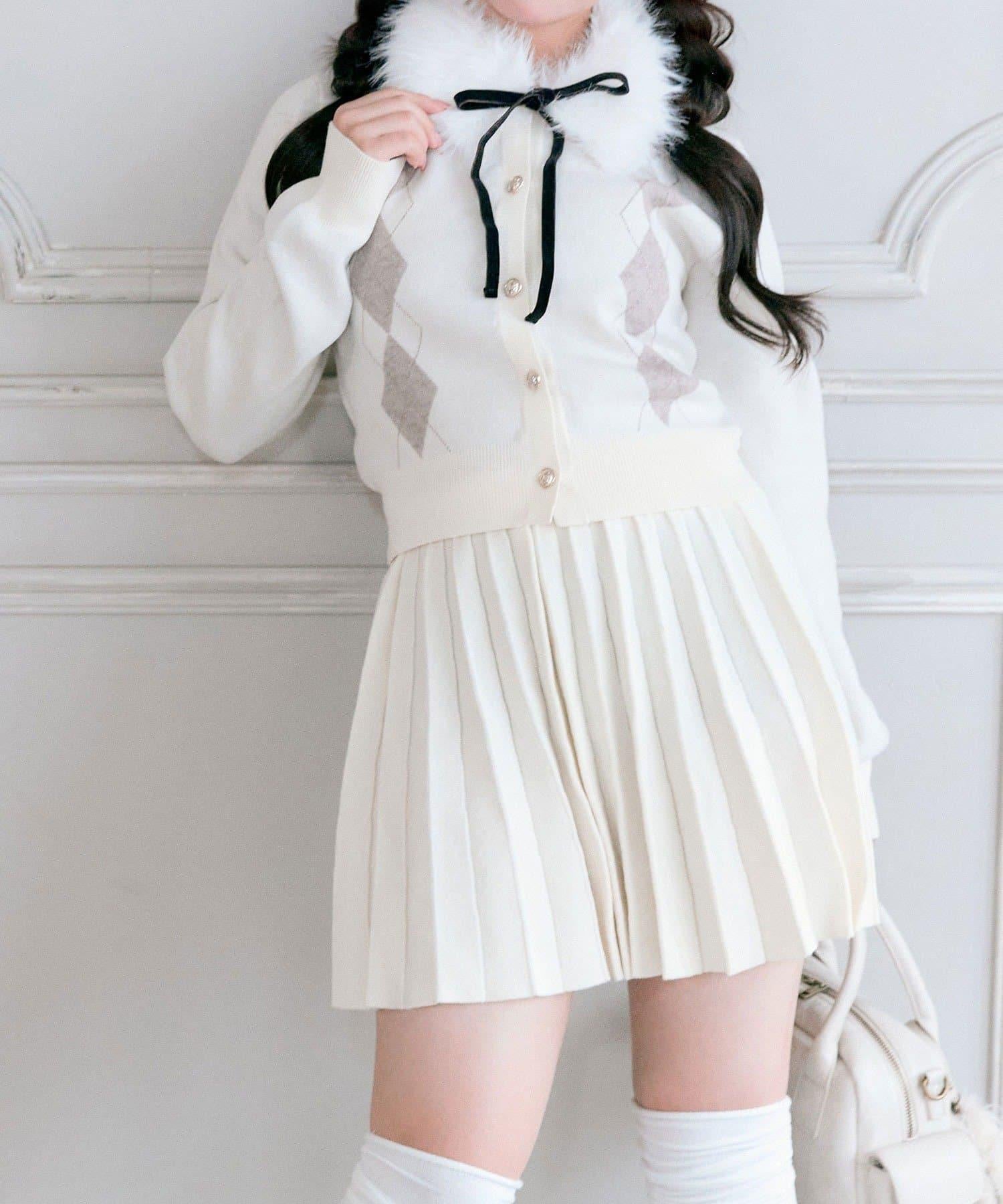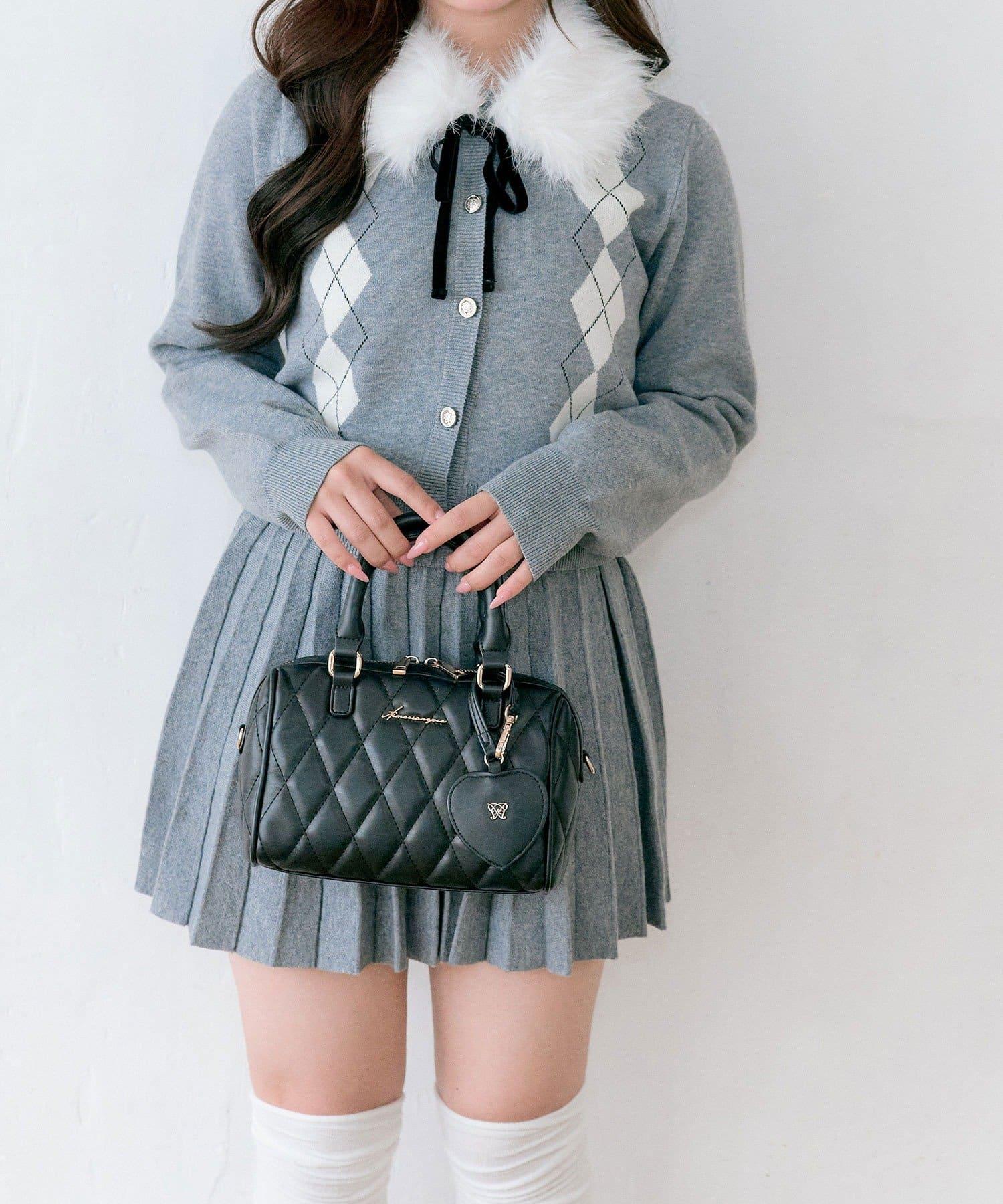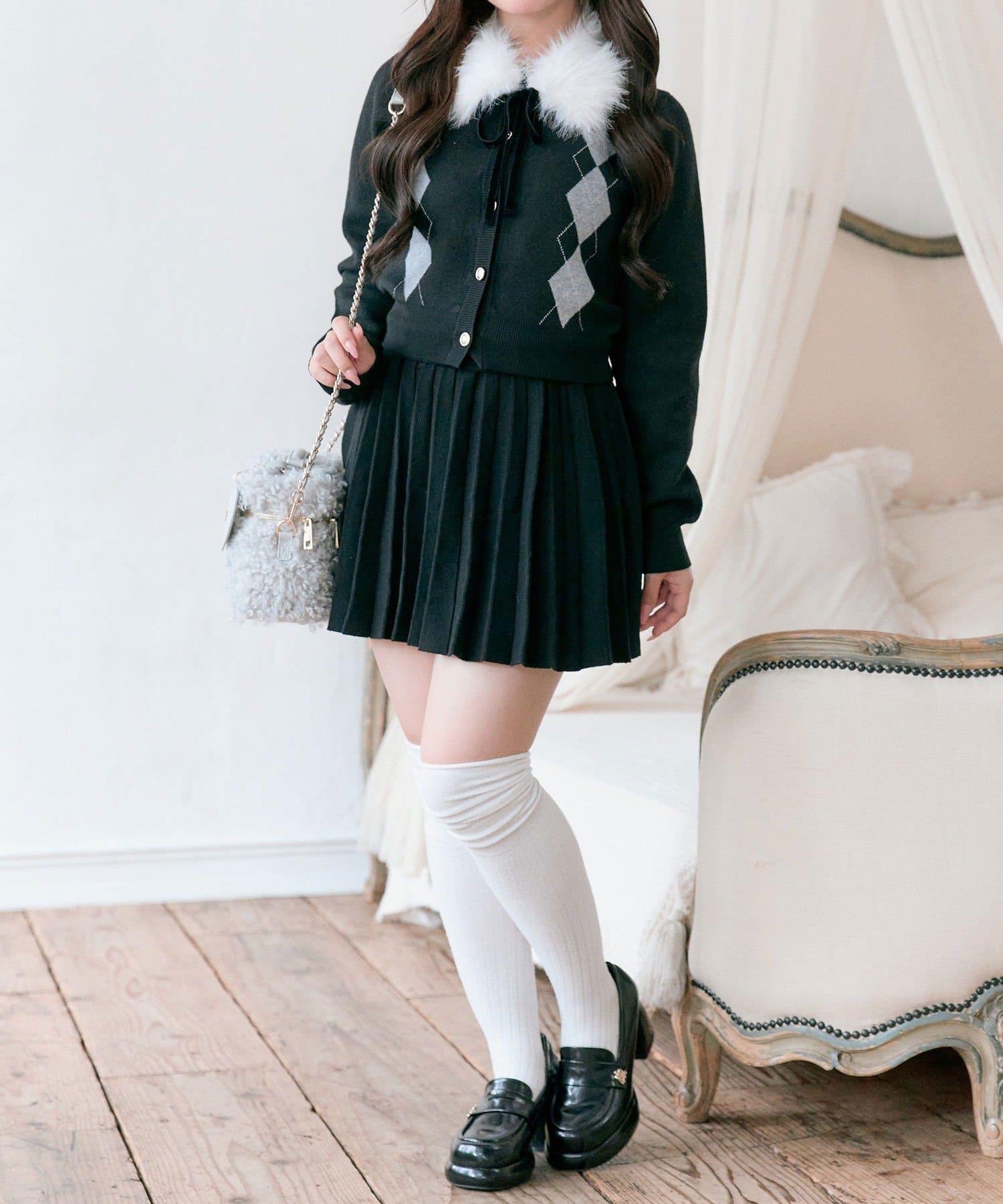 這套針織衫的毛皮飾帶搭配絲絨緞帶和閃亮紗線的菱形格紋。