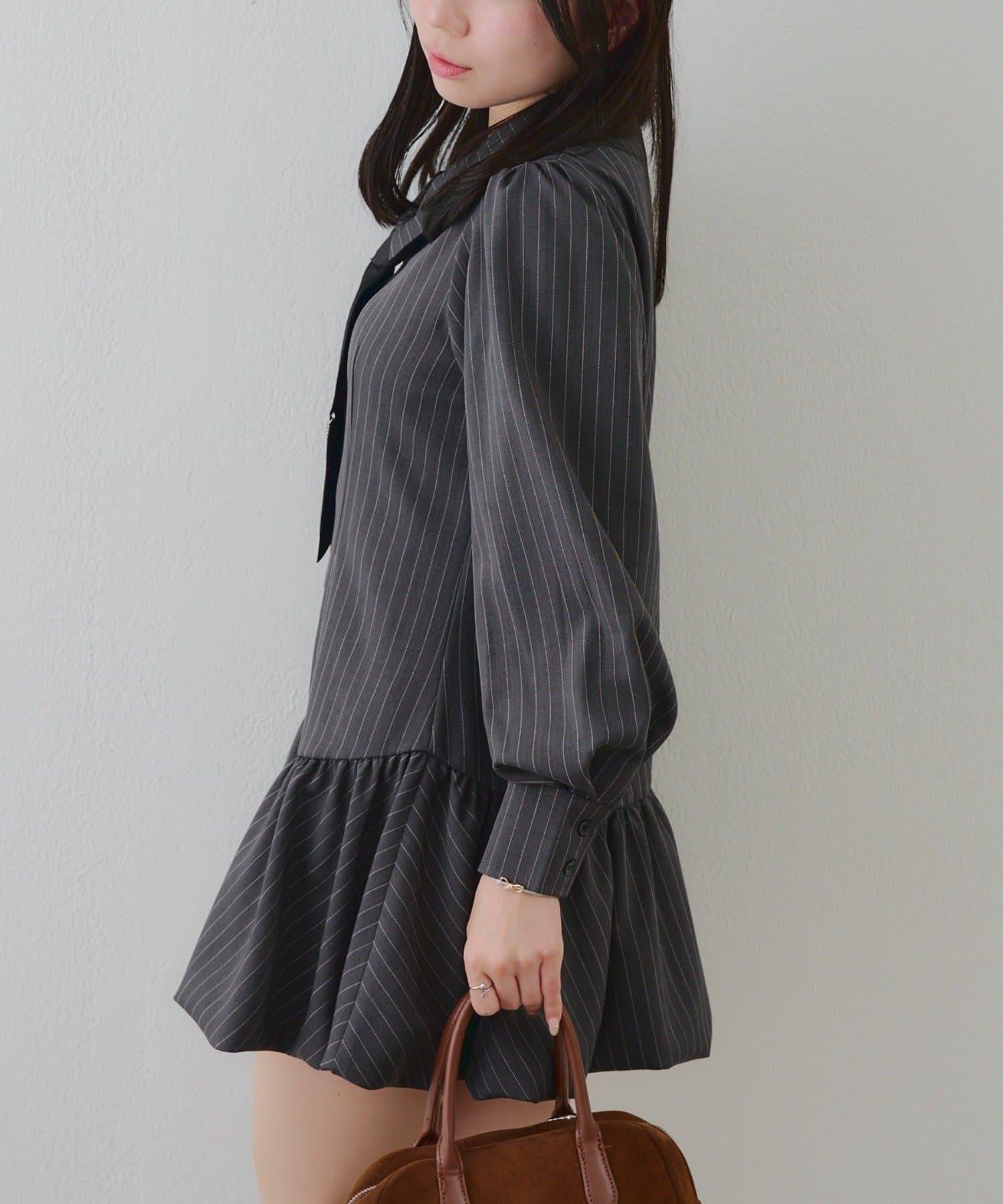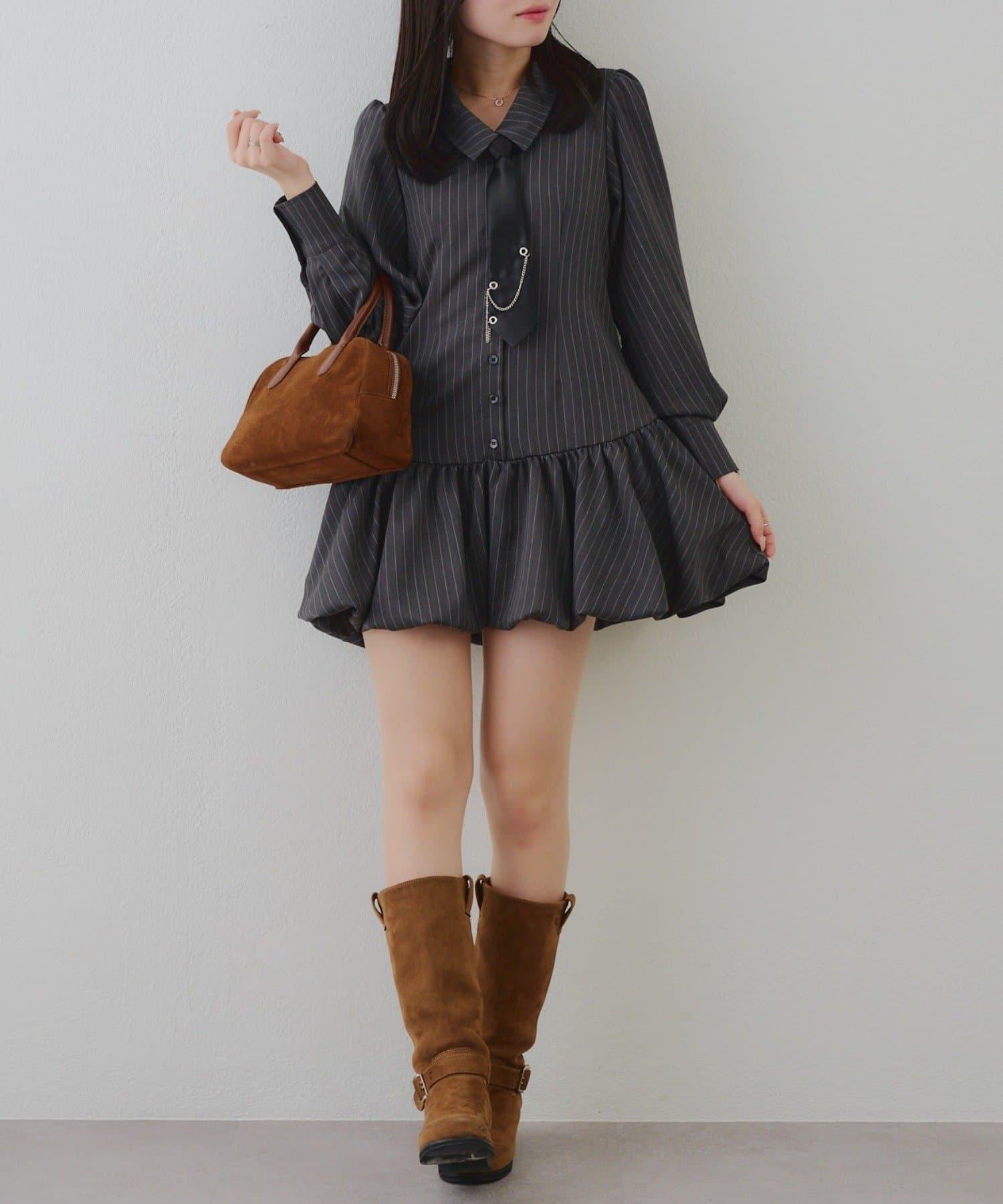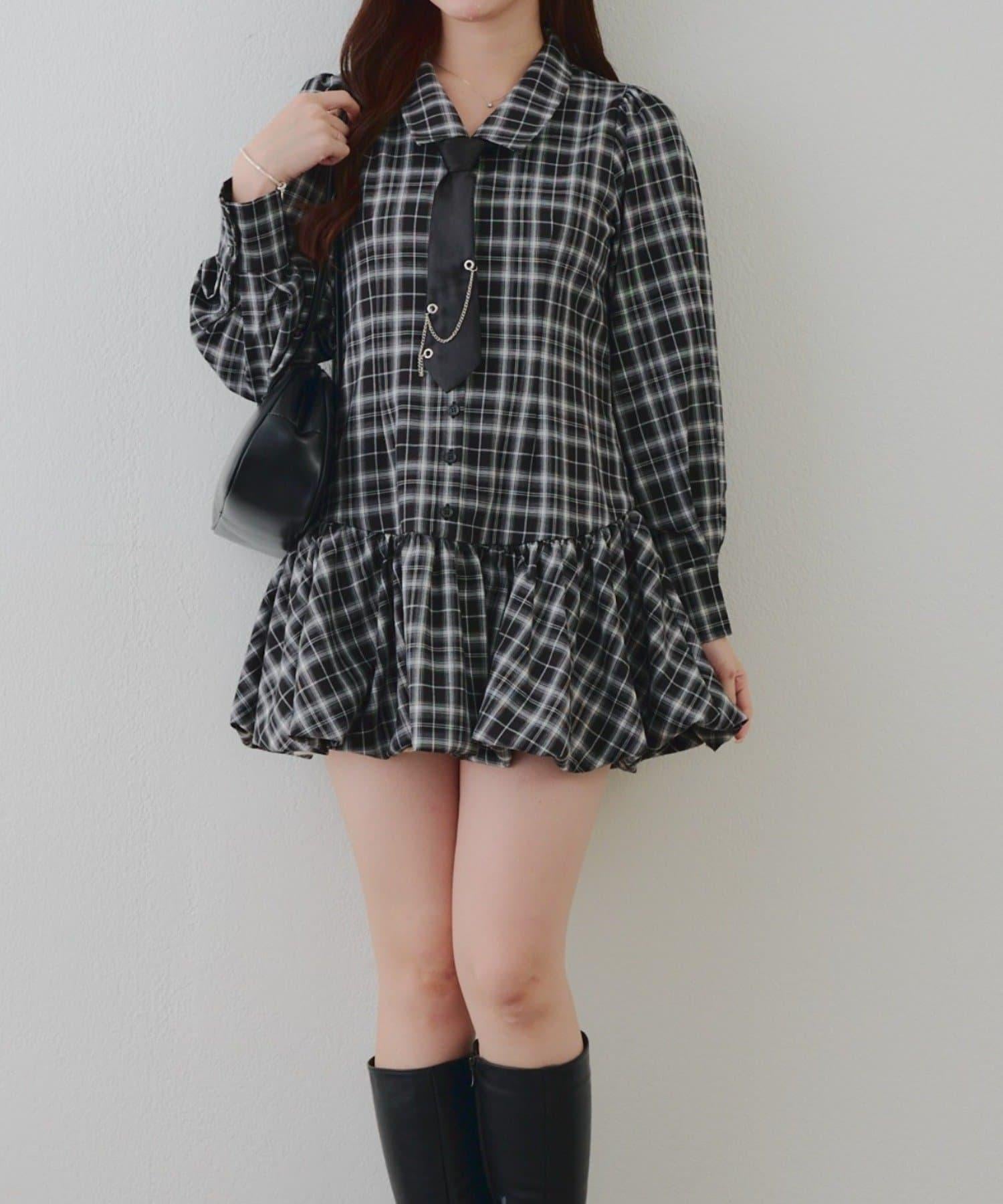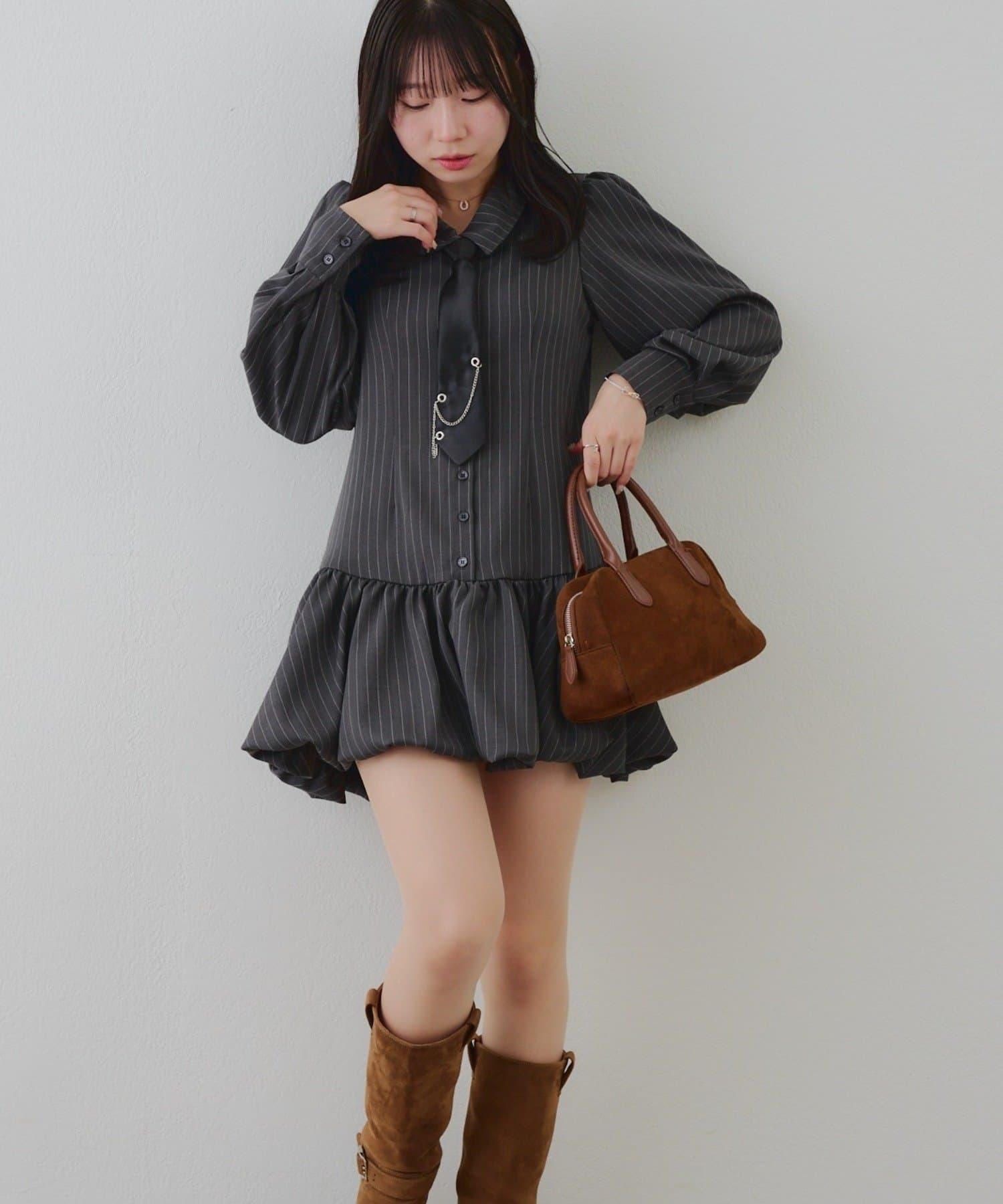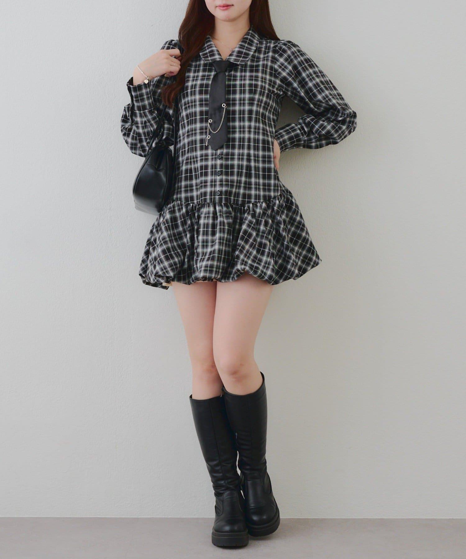 帶領帶下襬泡泡袖迷你連衣裙