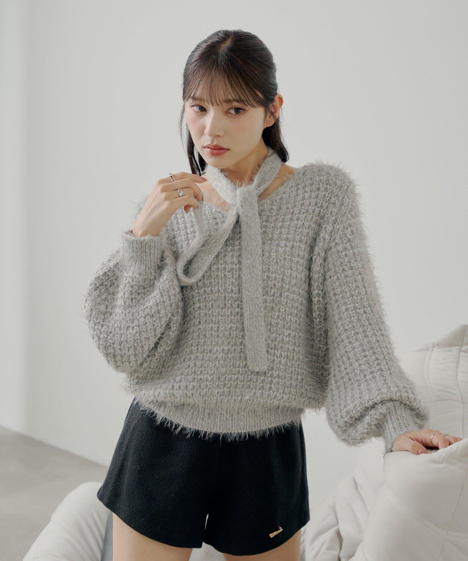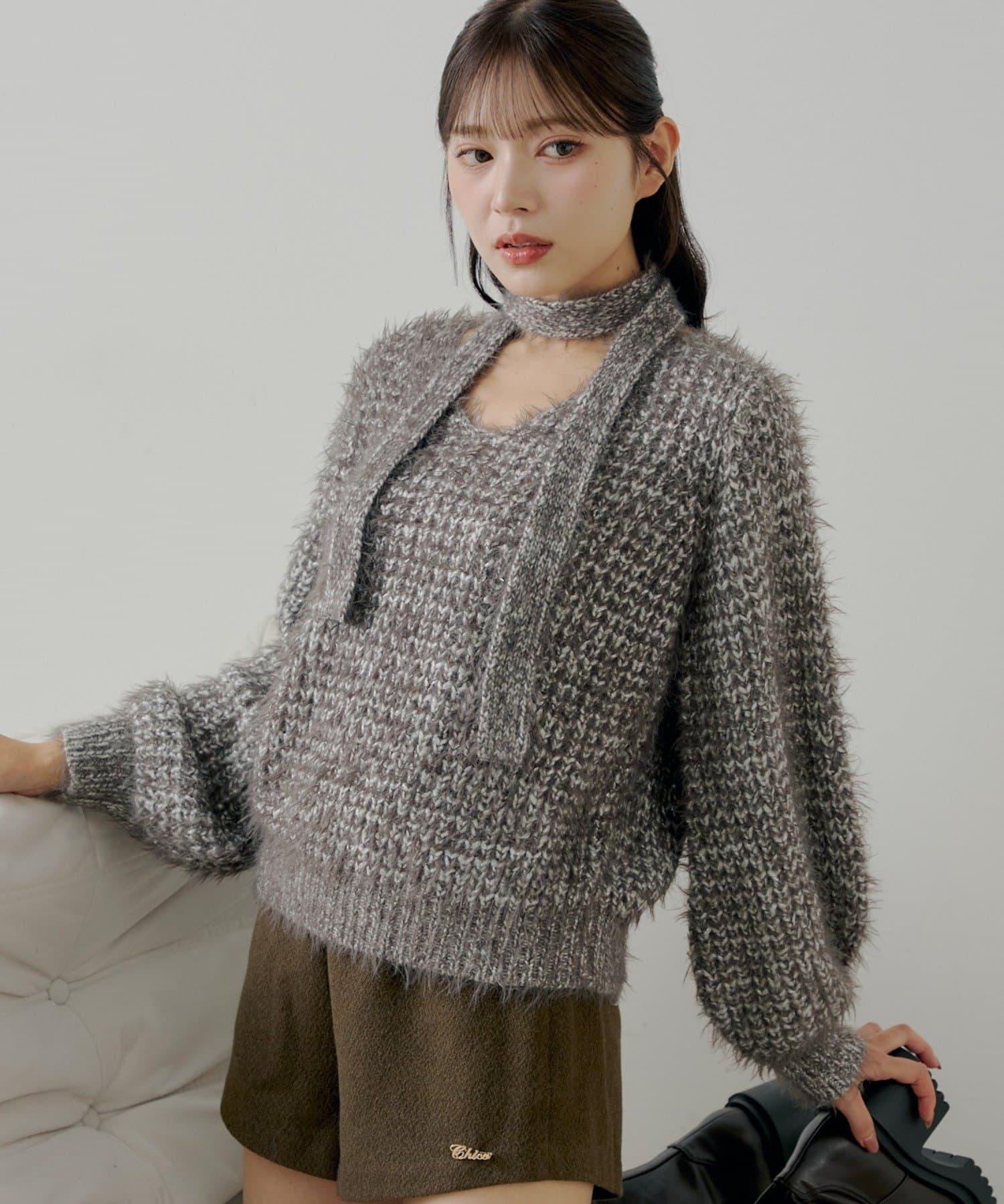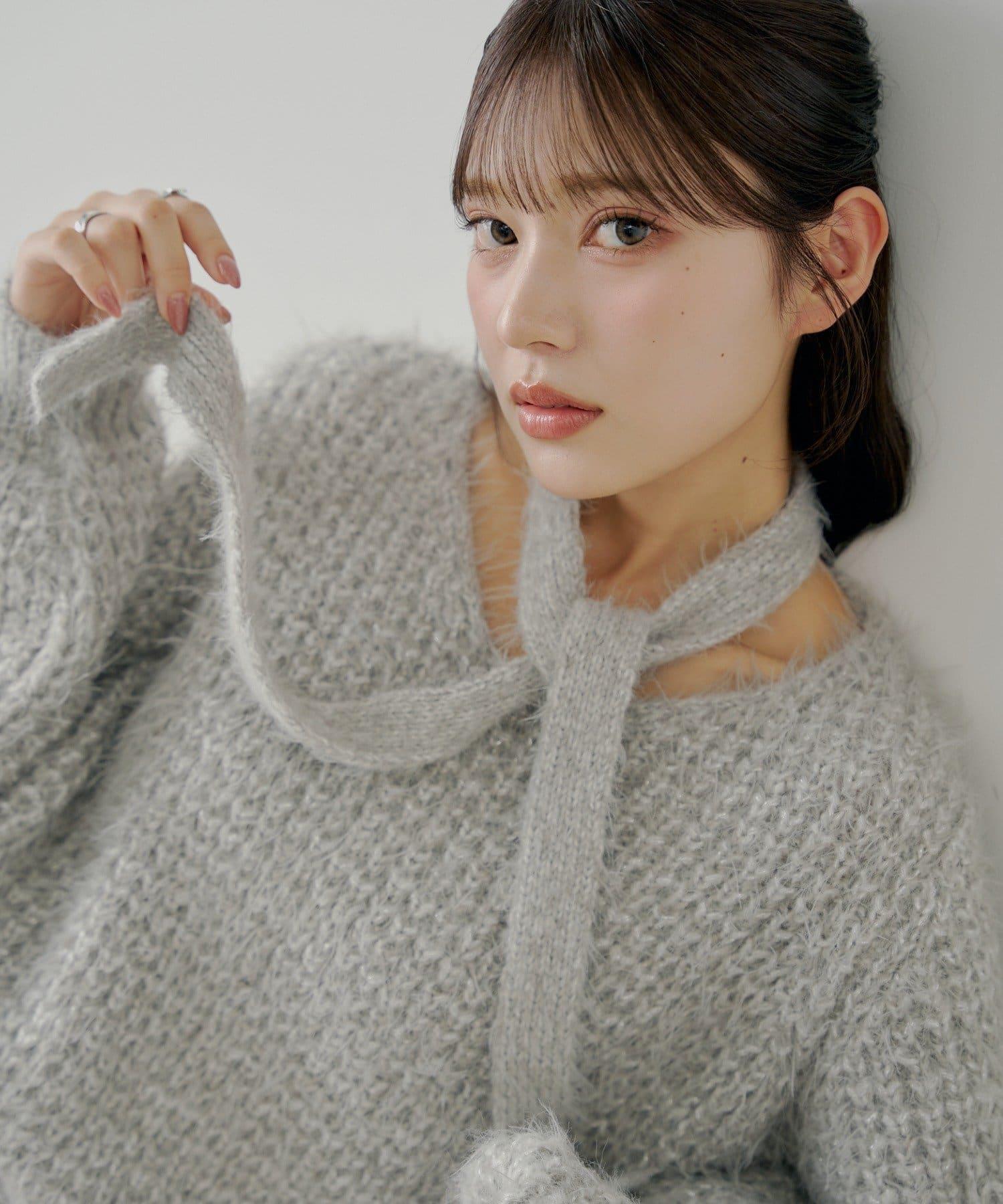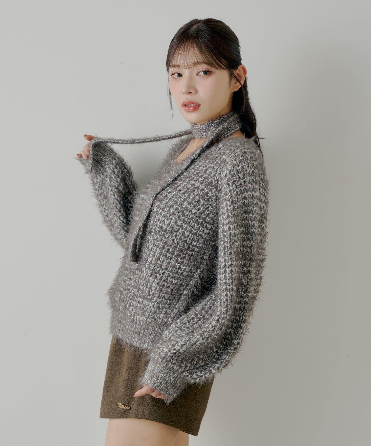 柔軟蓬鬆的質感混色寬鬆針織衫,配以領帶!