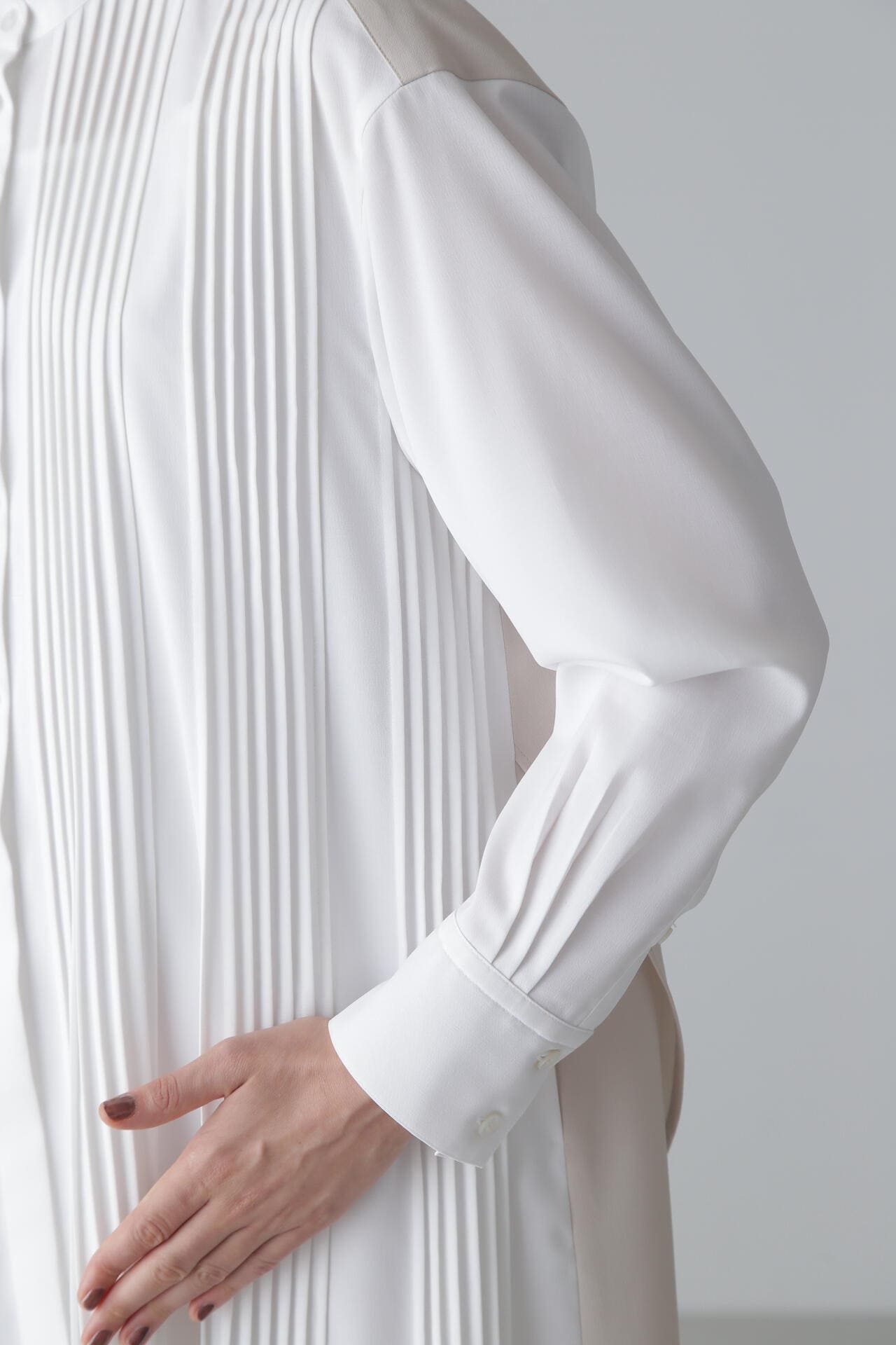這款連衣裙採用乾爽而柔軟的面料,精緻的褶襉與大膽的垂墜感並存。精緻的橫豎條紋營造出光影交錯的精緻印象。
