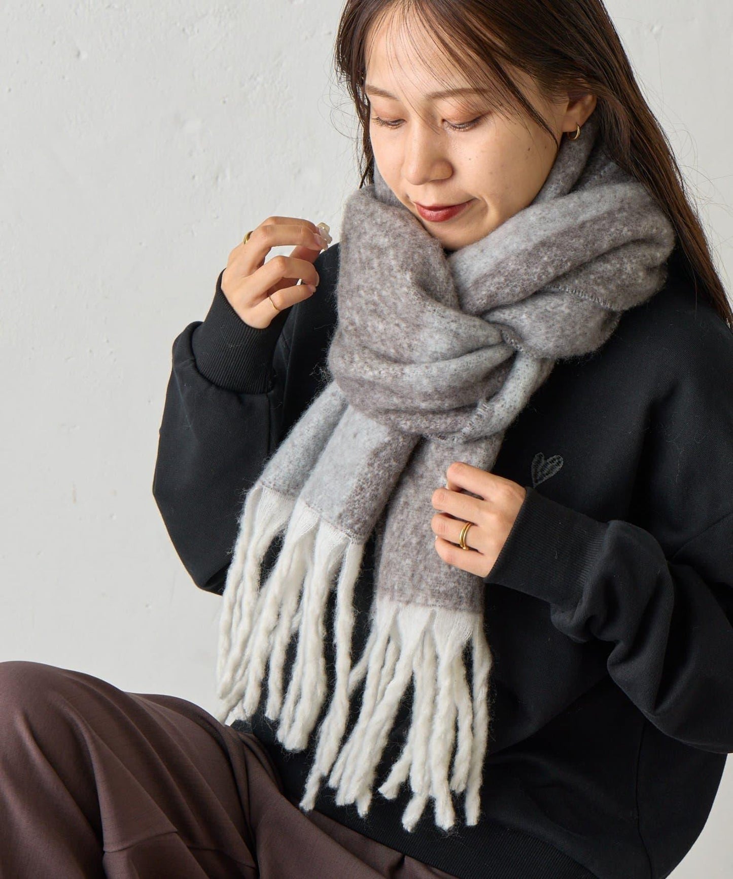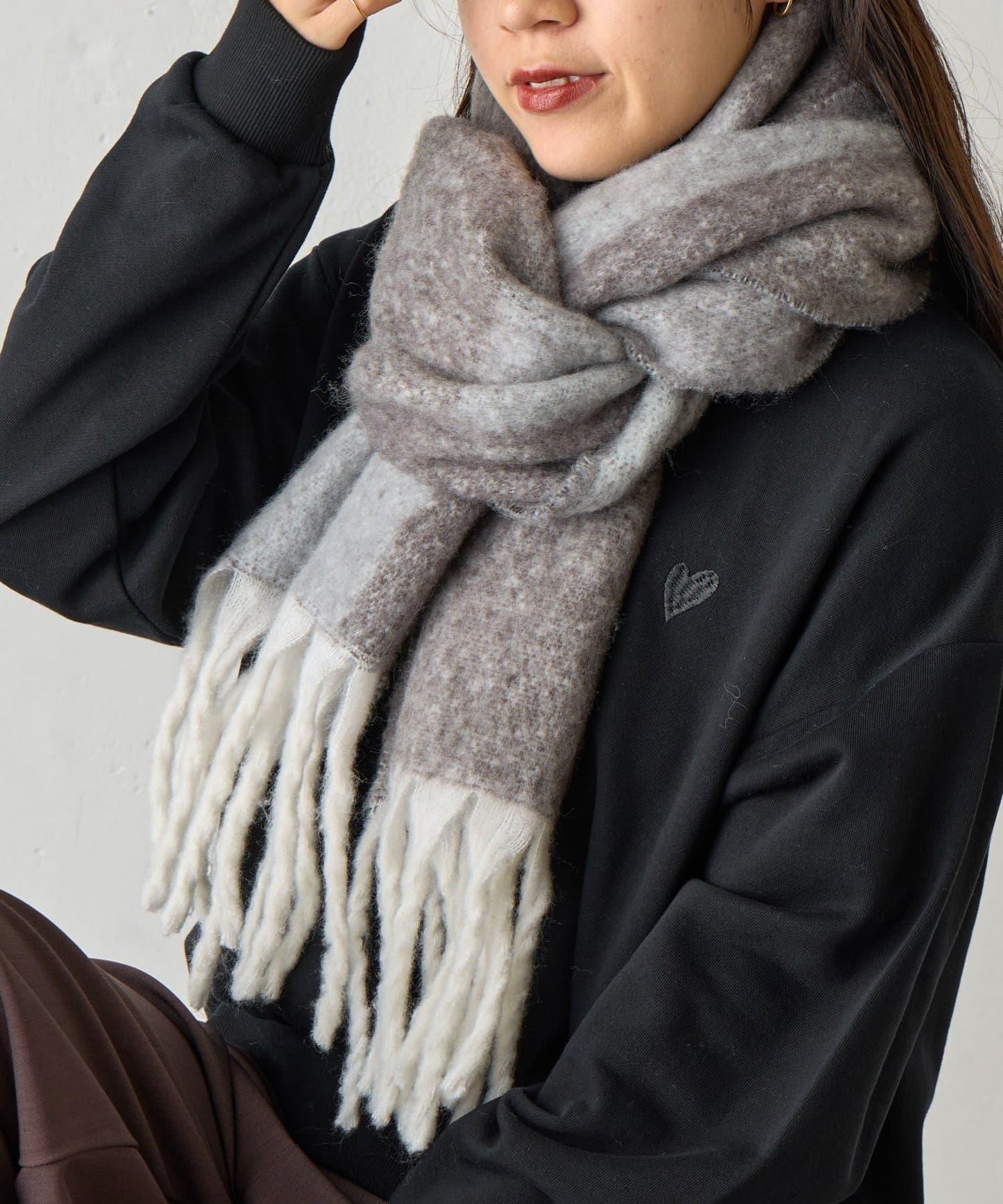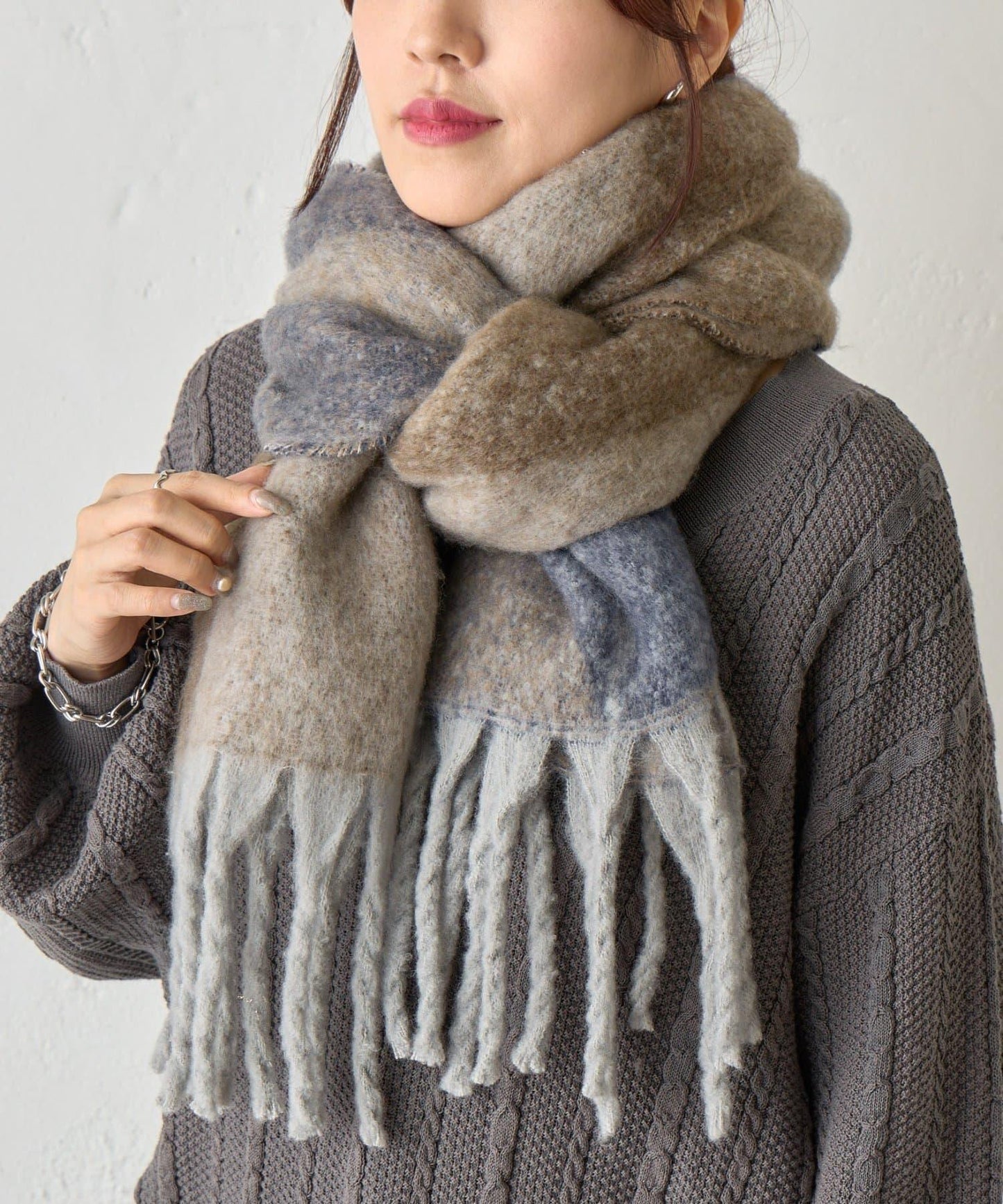 圍巾又長又寬,圍起來後體積很大,能很好地遮住脖子,即使在冬天也能穿得很暖和。