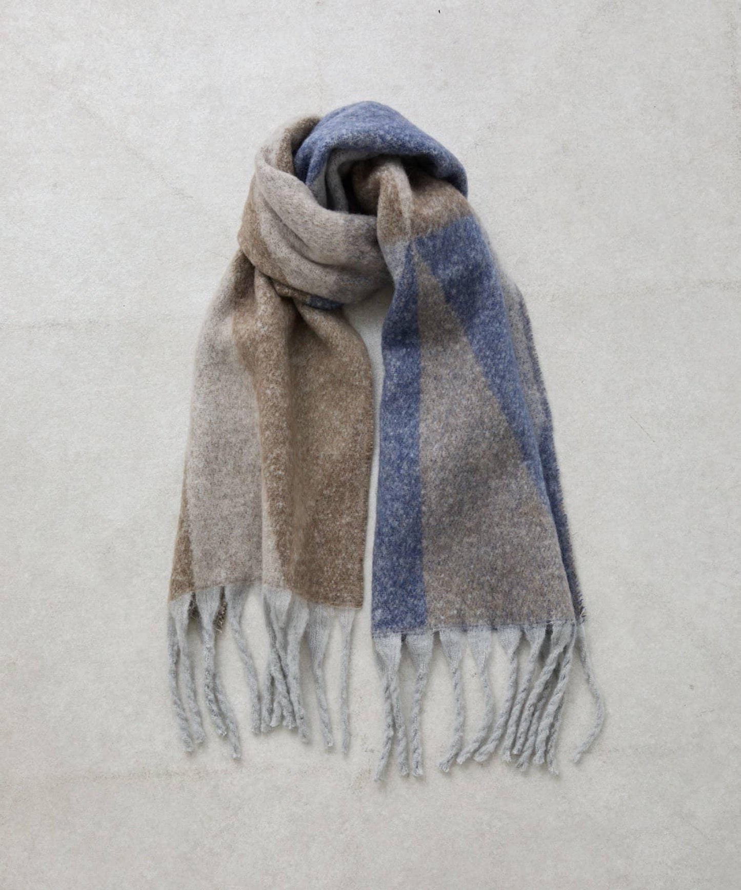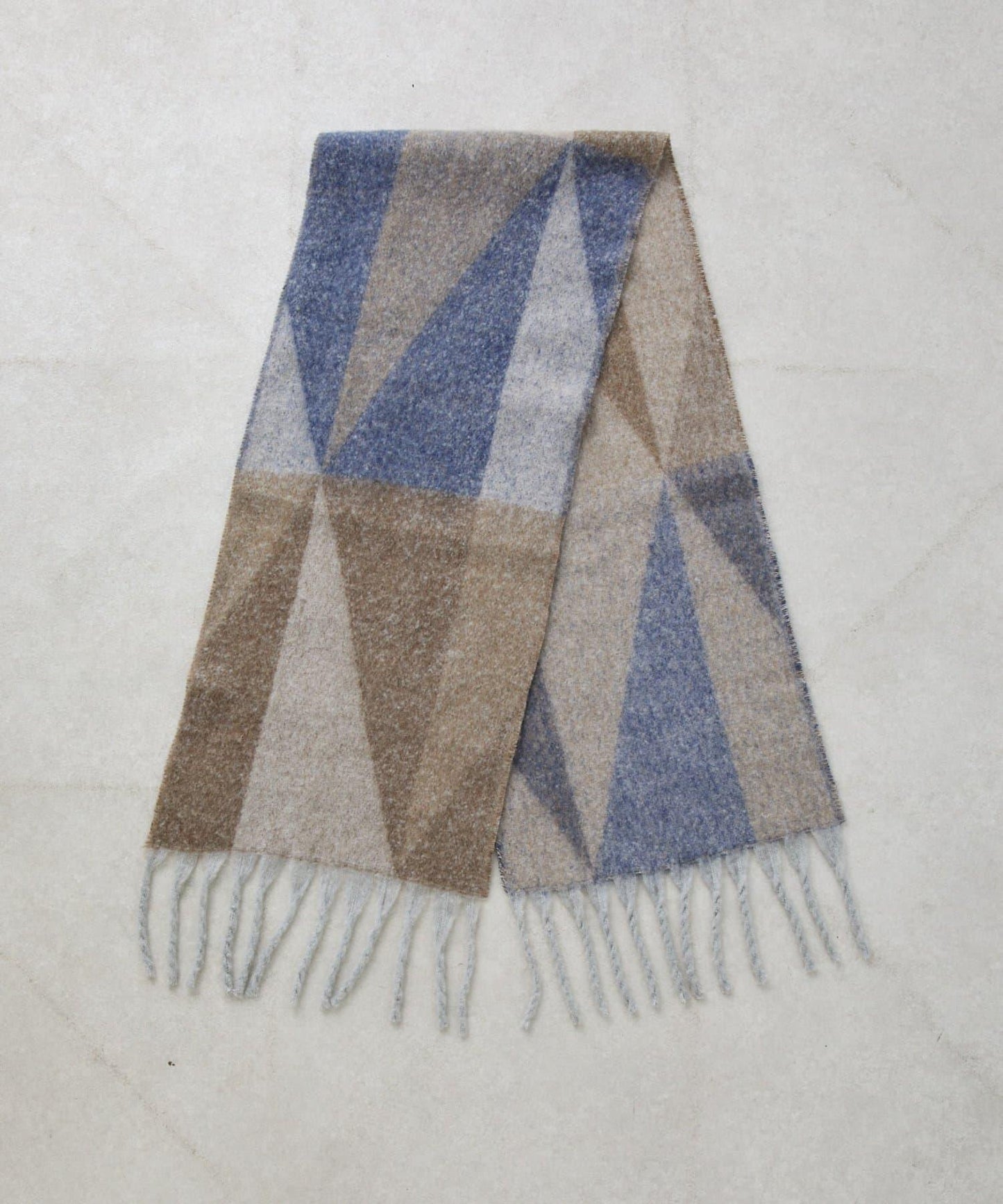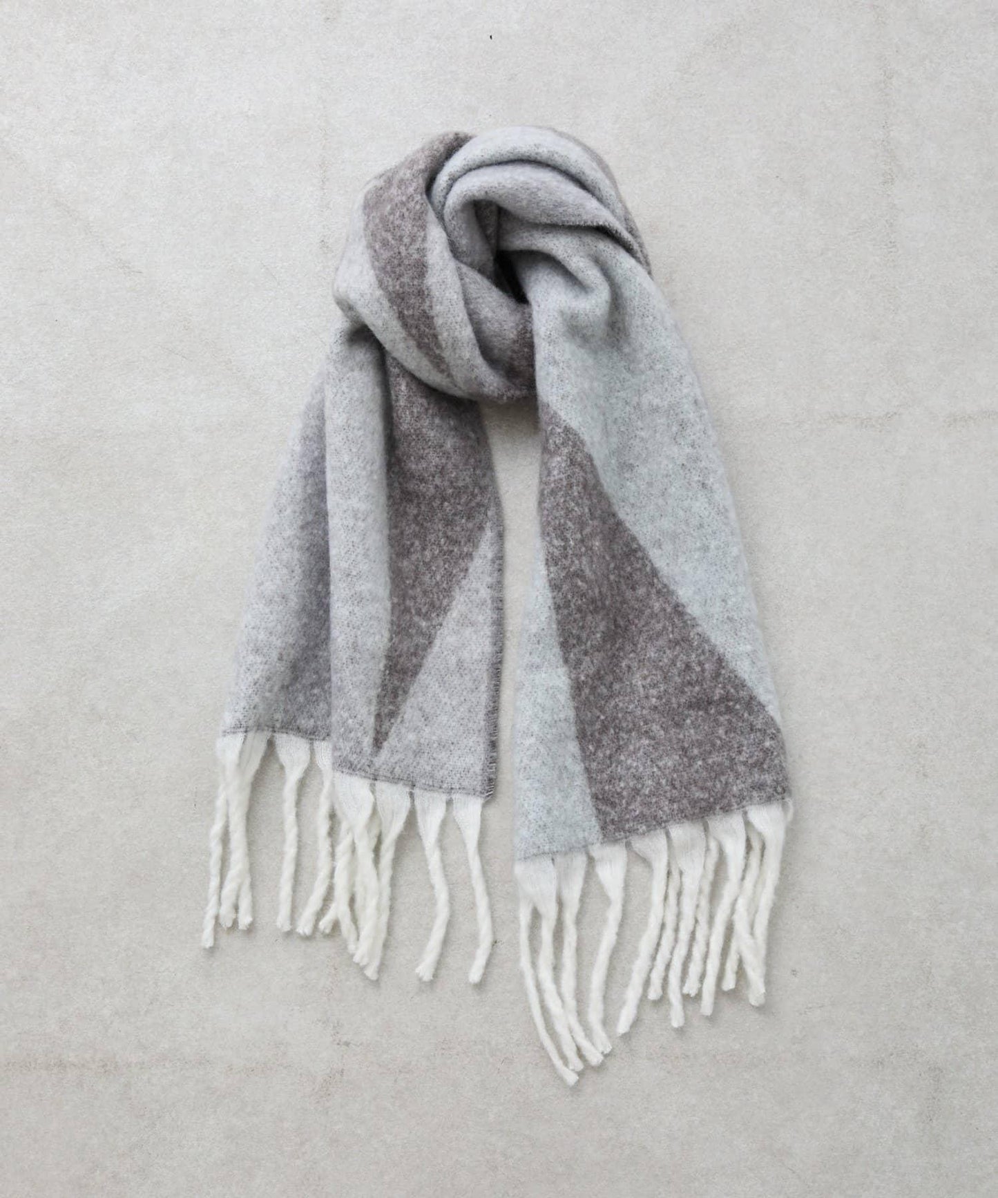 這條流蘇圍巾觸感柔軟,幾何圖案是它的亮點。