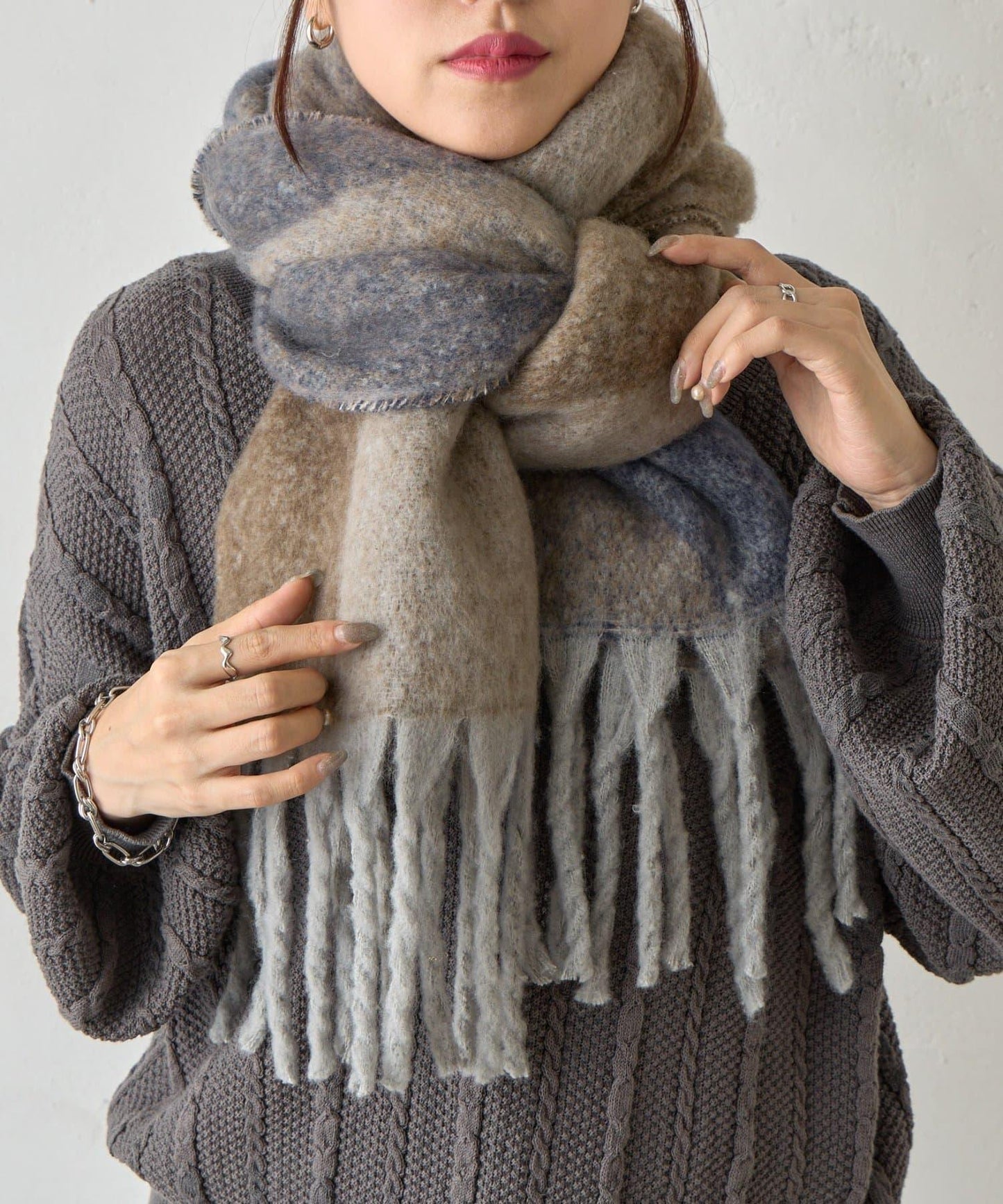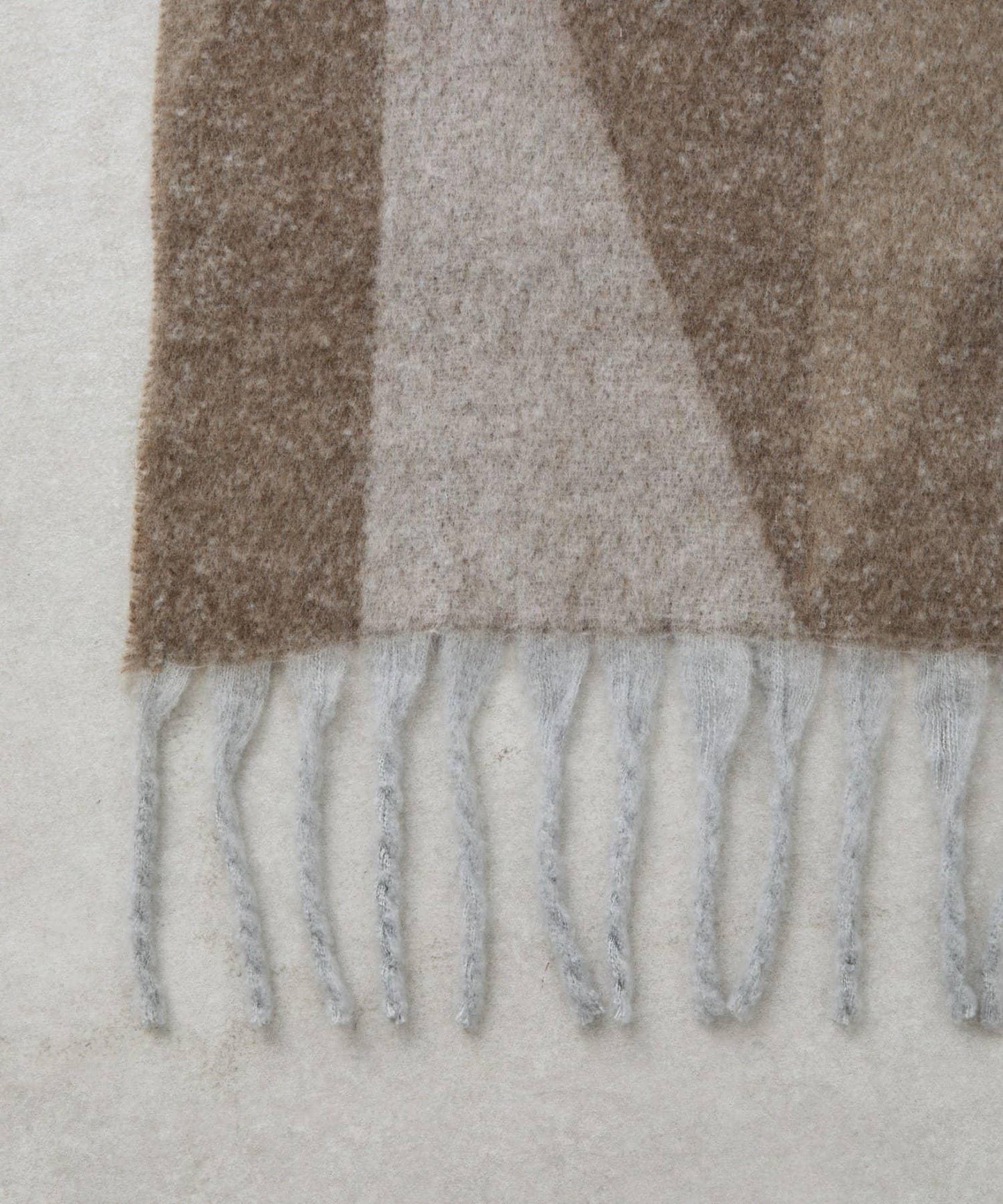 幾何圖案點綴的流蘇圍巾。