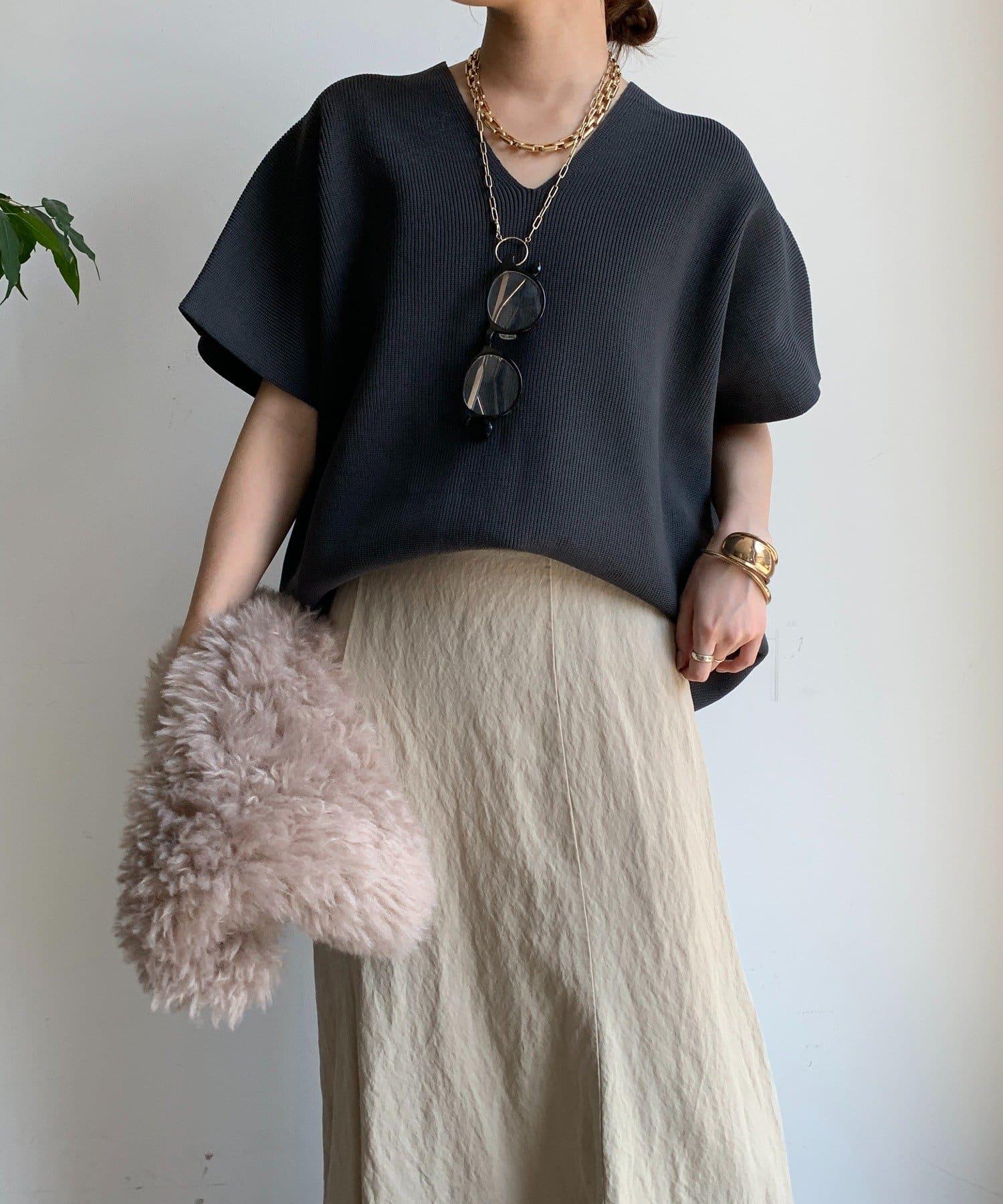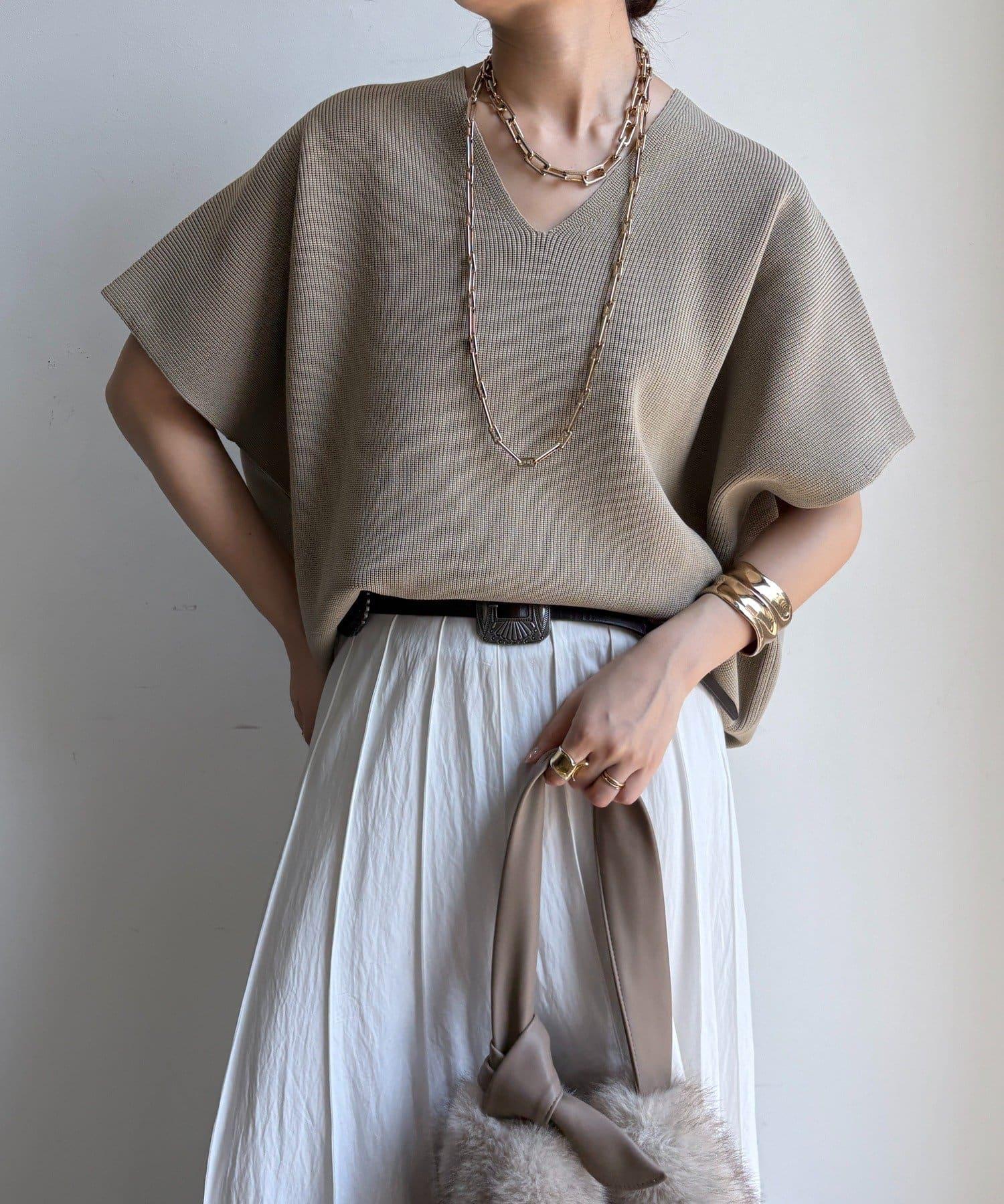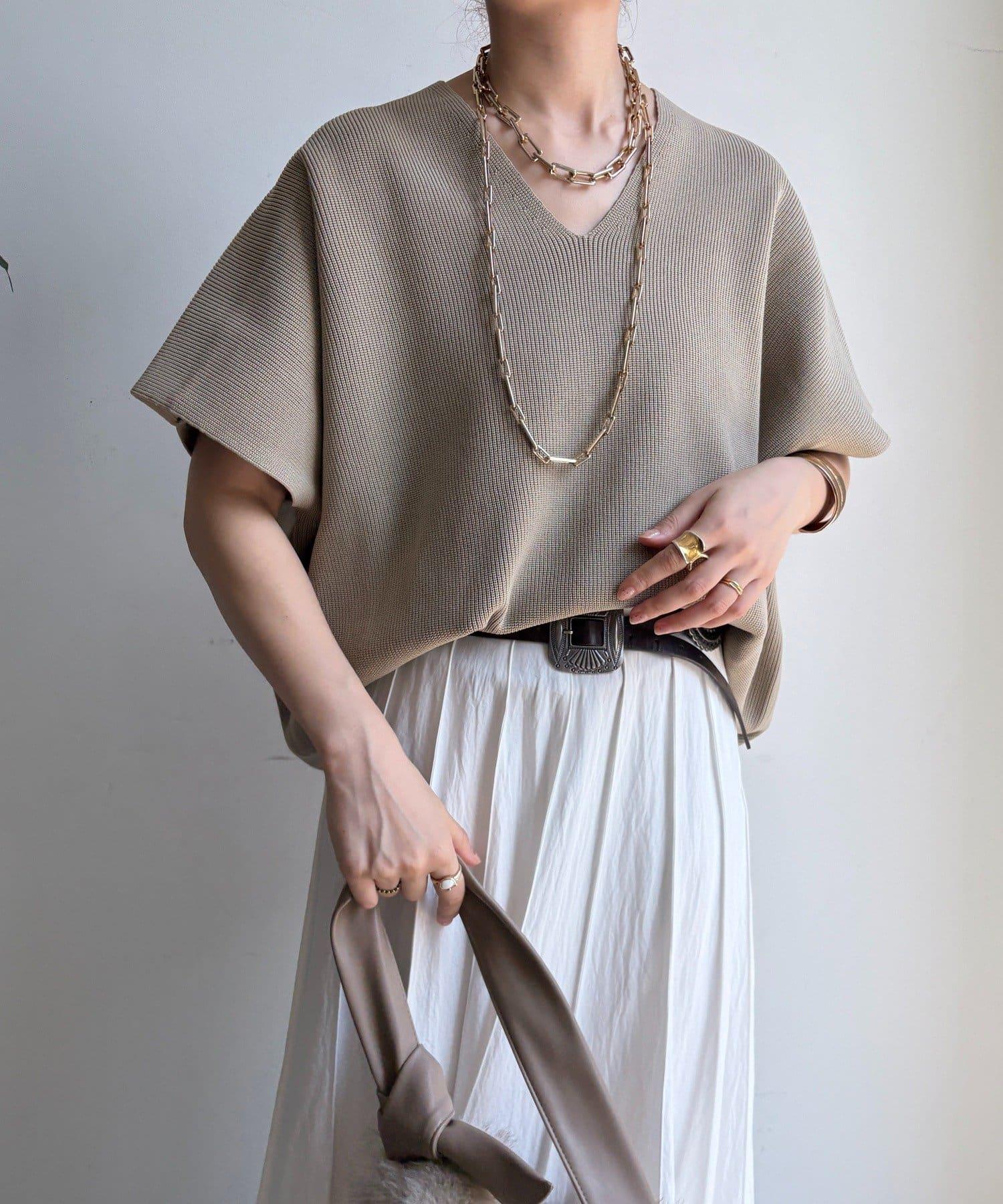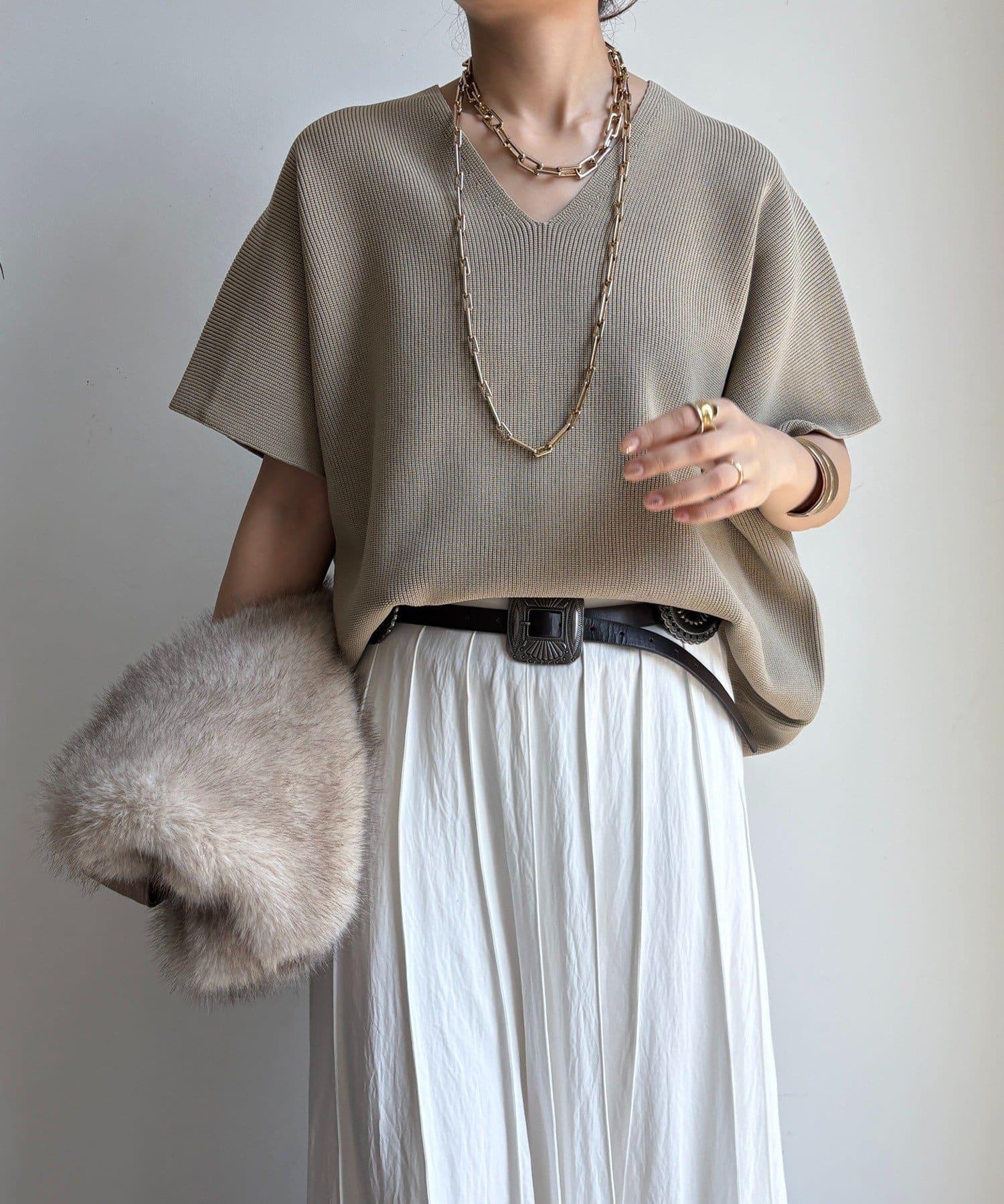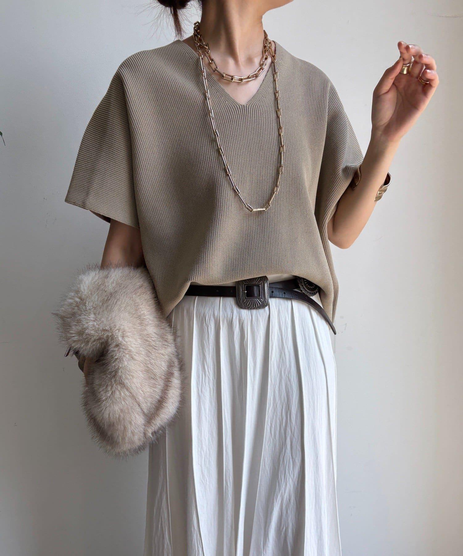 深 V 領設計讓臉部輪廓更加清晰,營造出輕鬆愉悅的感覺。