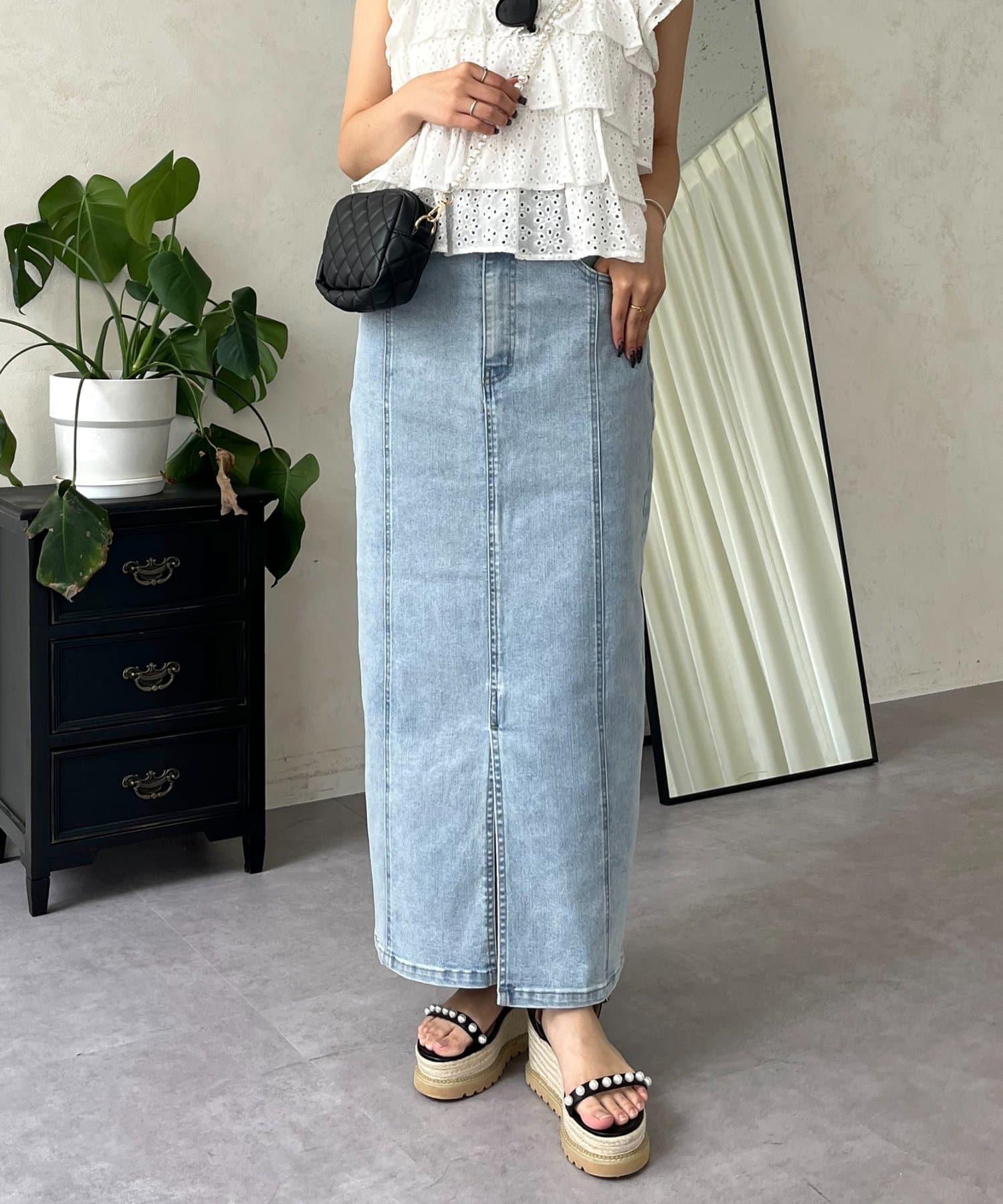 緊身廓形的牛仔裙給人以女性化的休閒印象