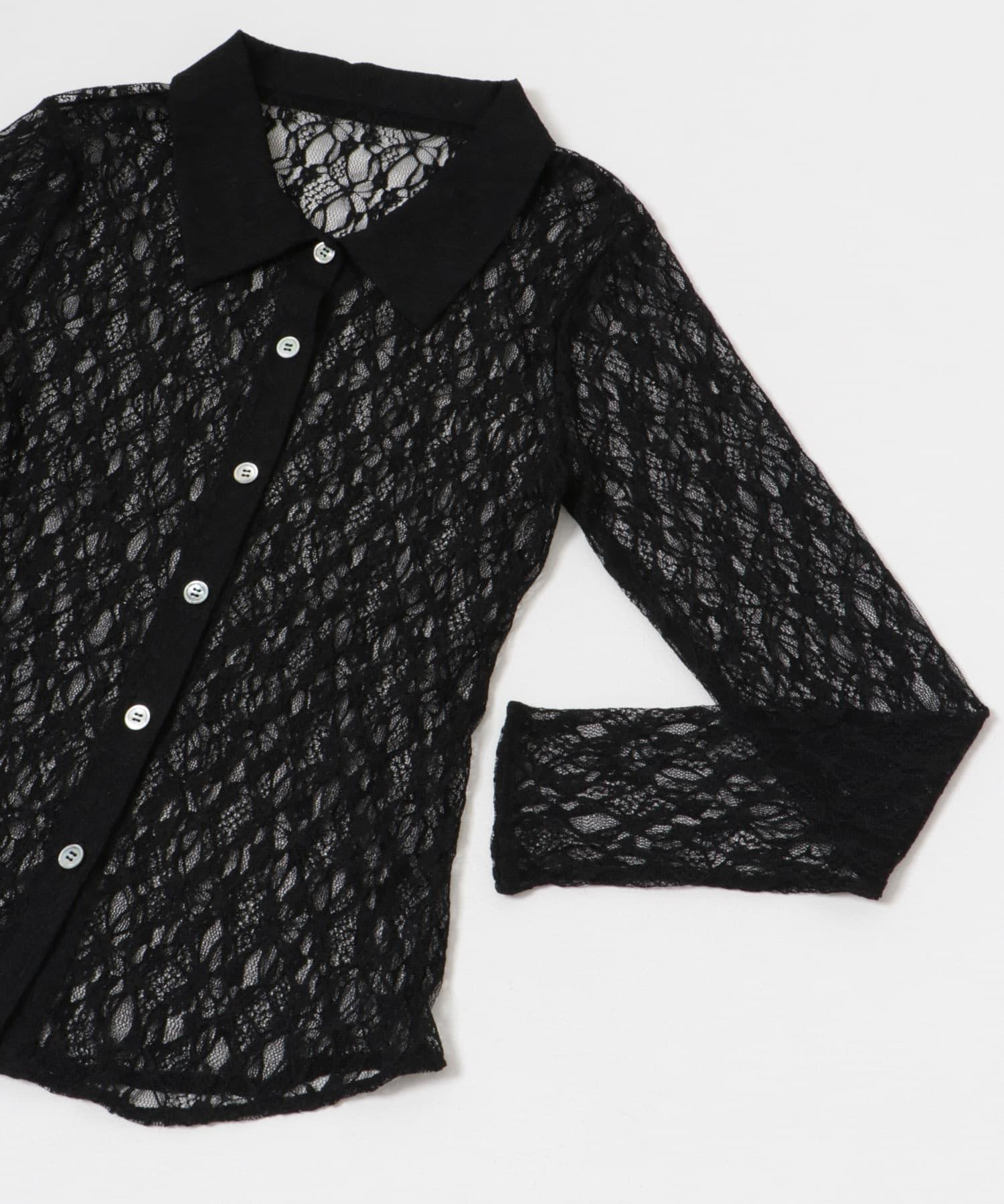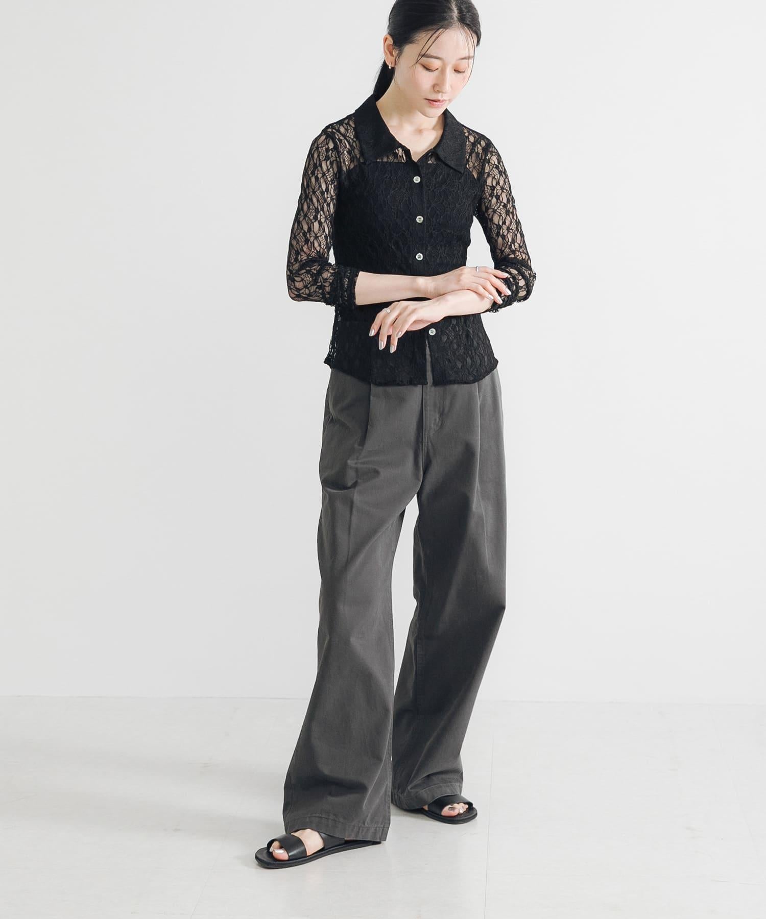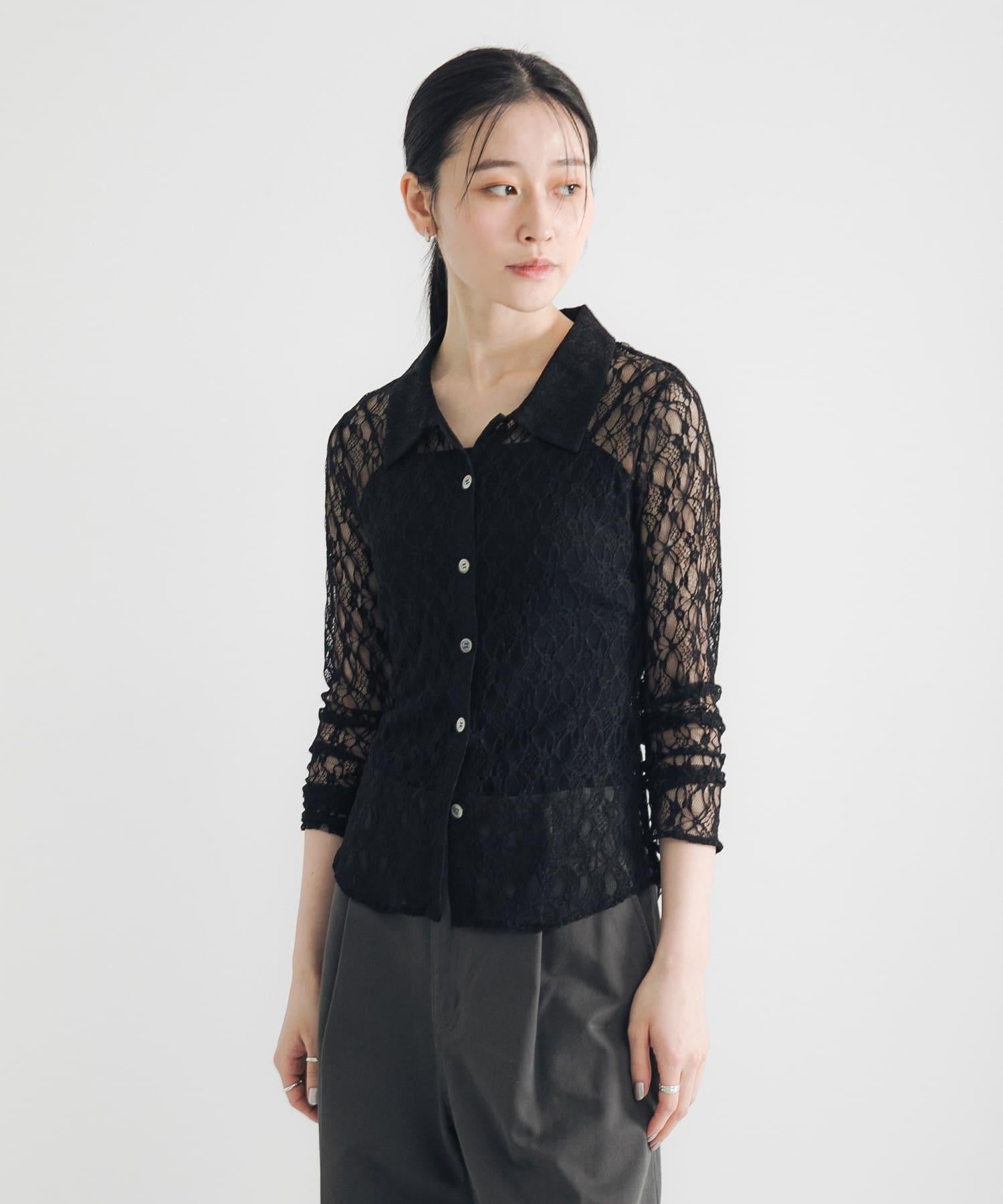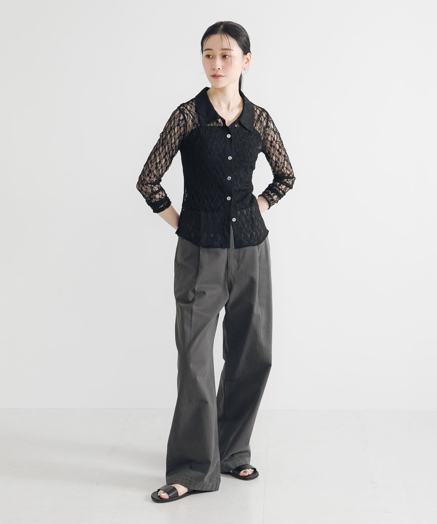 輕薄的彈力蕾絲富有彈性。上衣與皮膚很好地融合在一起,有墜感,穿起來給人乾淨利落的印象。