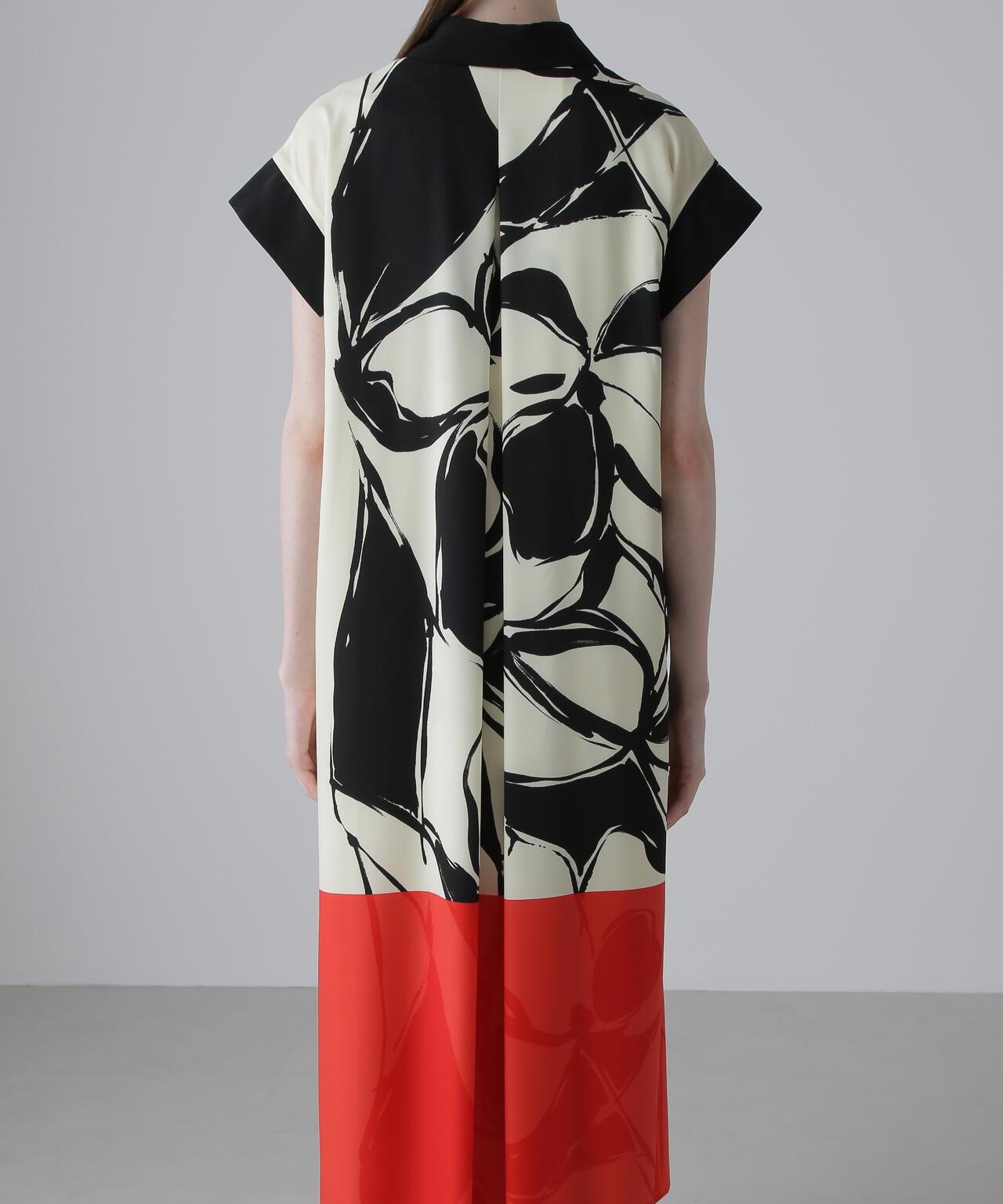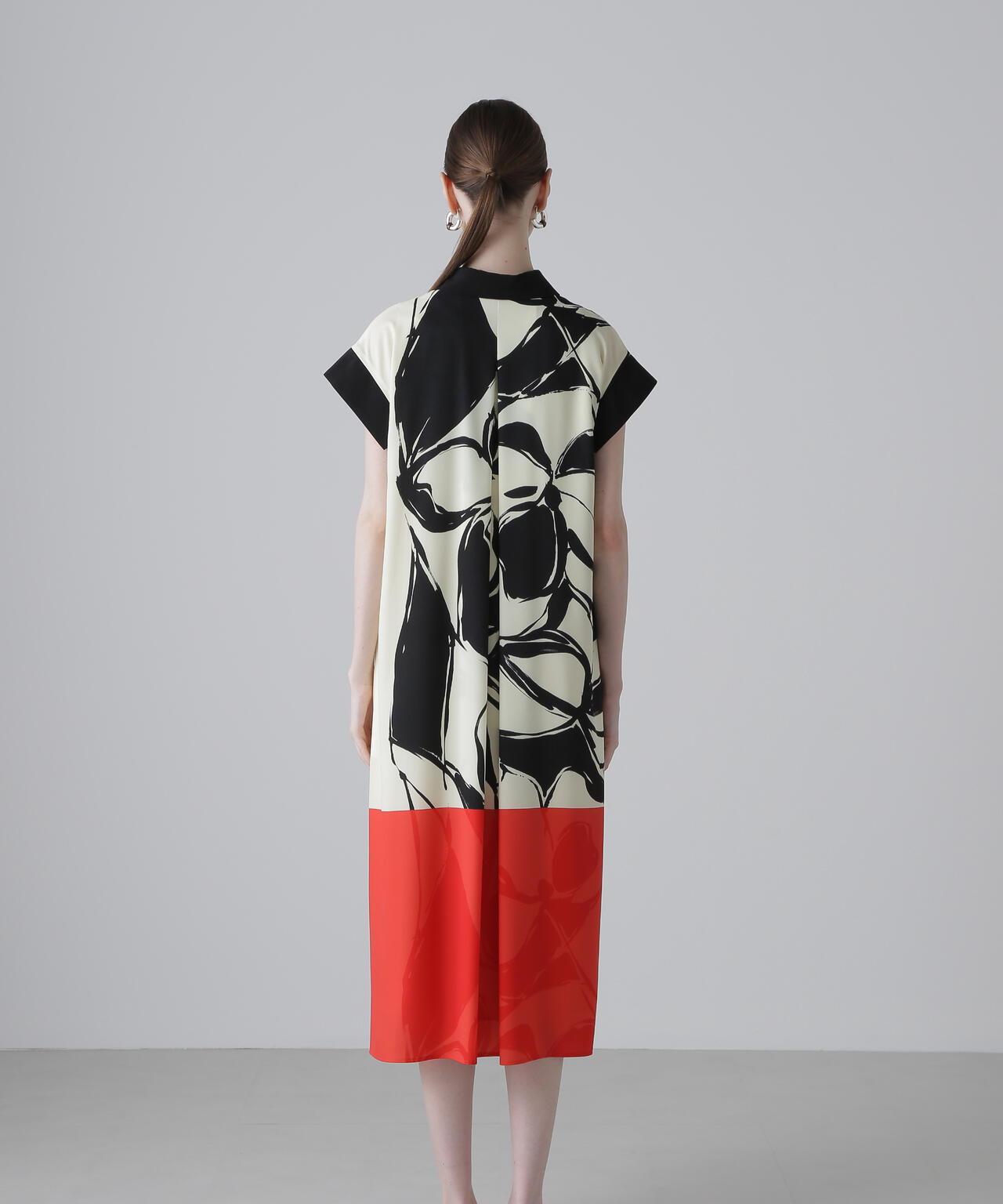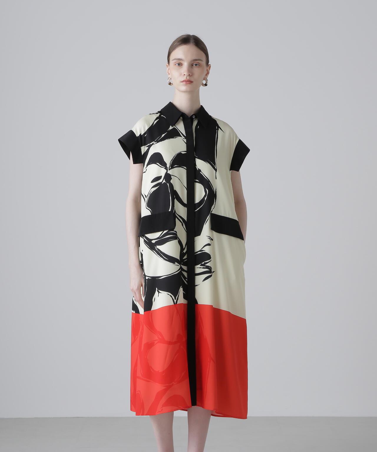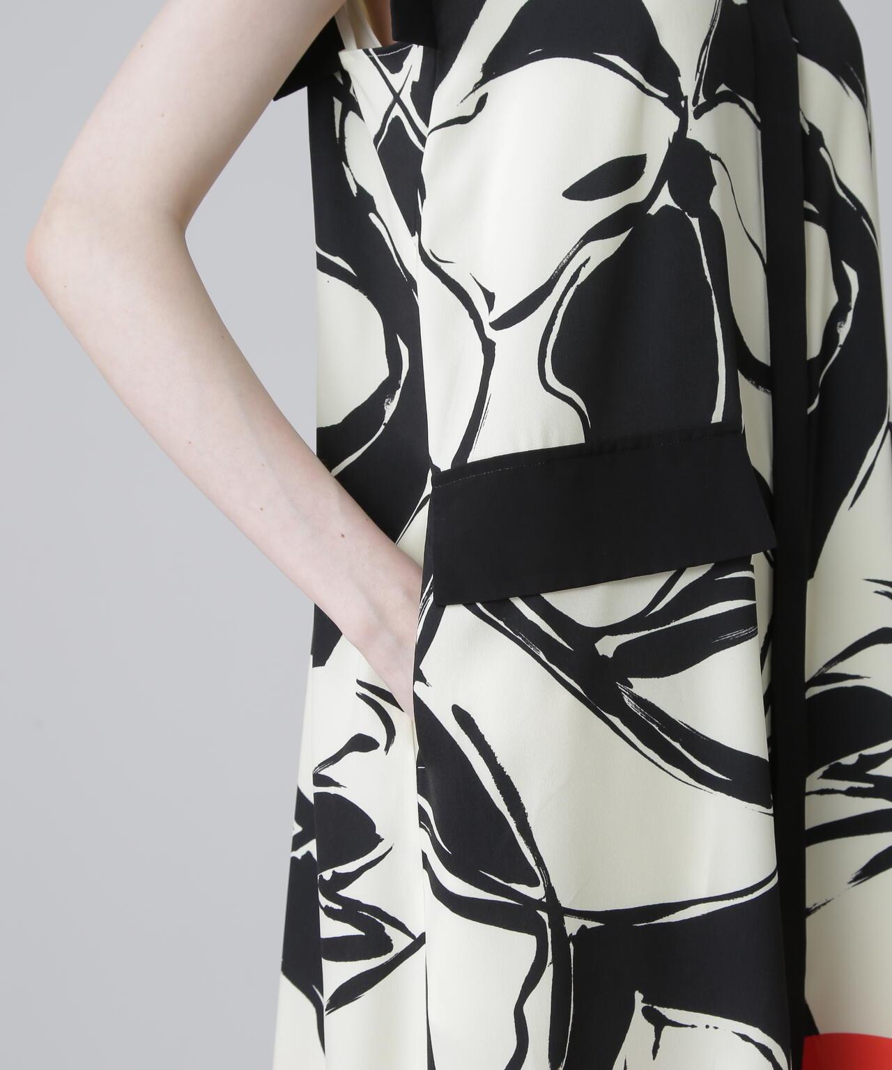 彩色疊層印花連衣裙在花朵圖案的基礎上,下襬處又增加了一條彩色透明線。圖案左右不對稱,使這款連衣裙成為一件式設計。領子、門襟、袖子和口袋均由不同的黑色面料製成。這款連衣裙採用柔軟輕盈的設計面料剪裁而成,帶有粉質觸感,並印有大膽的圖案。