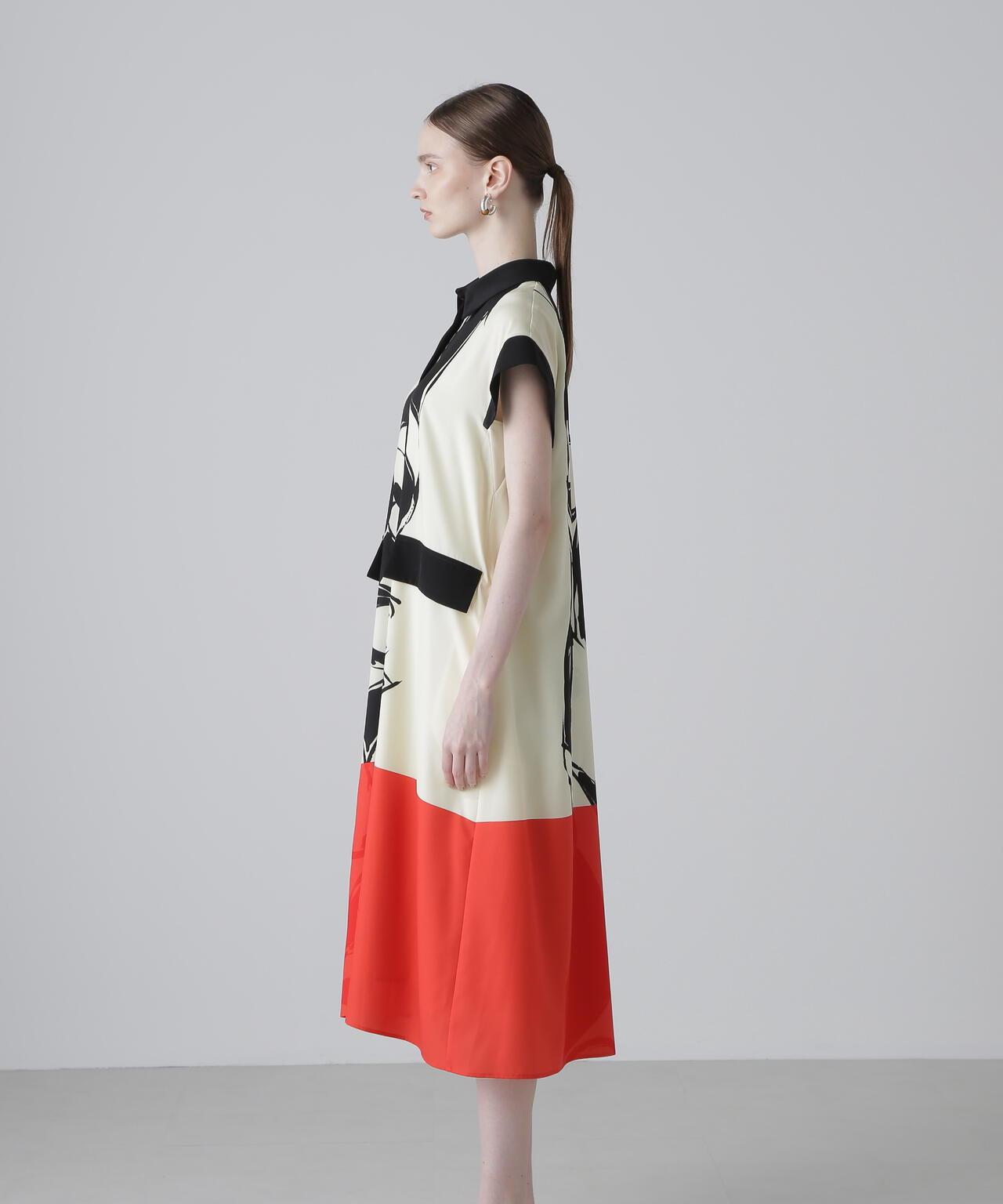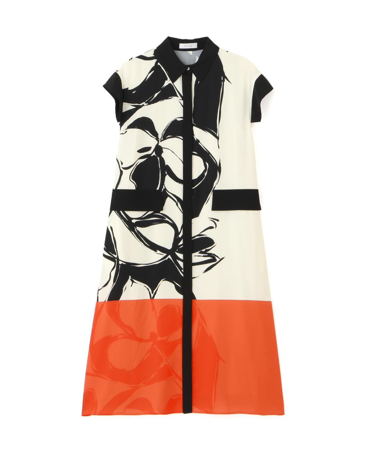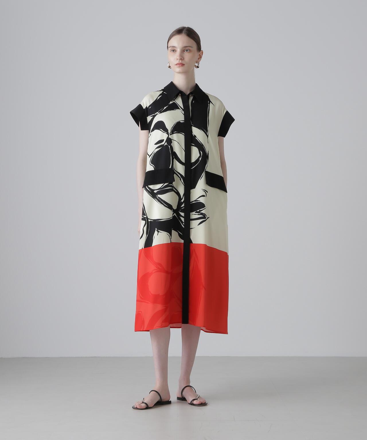 彩色疊層印花連衣裙在花朵圖案的基礎上,下襬處又增加了一條彩色透明線。圖案左右不對稱,使這款連衣裙成為一件式設計。領子、門襟、袖子和口袋均由不同的黑色面料製成。這款連衣裙採用柔軟輕盈的設計面料剪裁而成,帶有粉質觸感,並印有大膽的圖案。