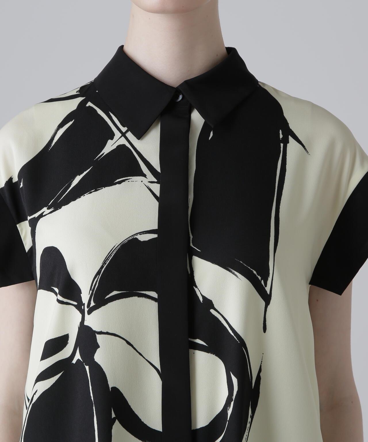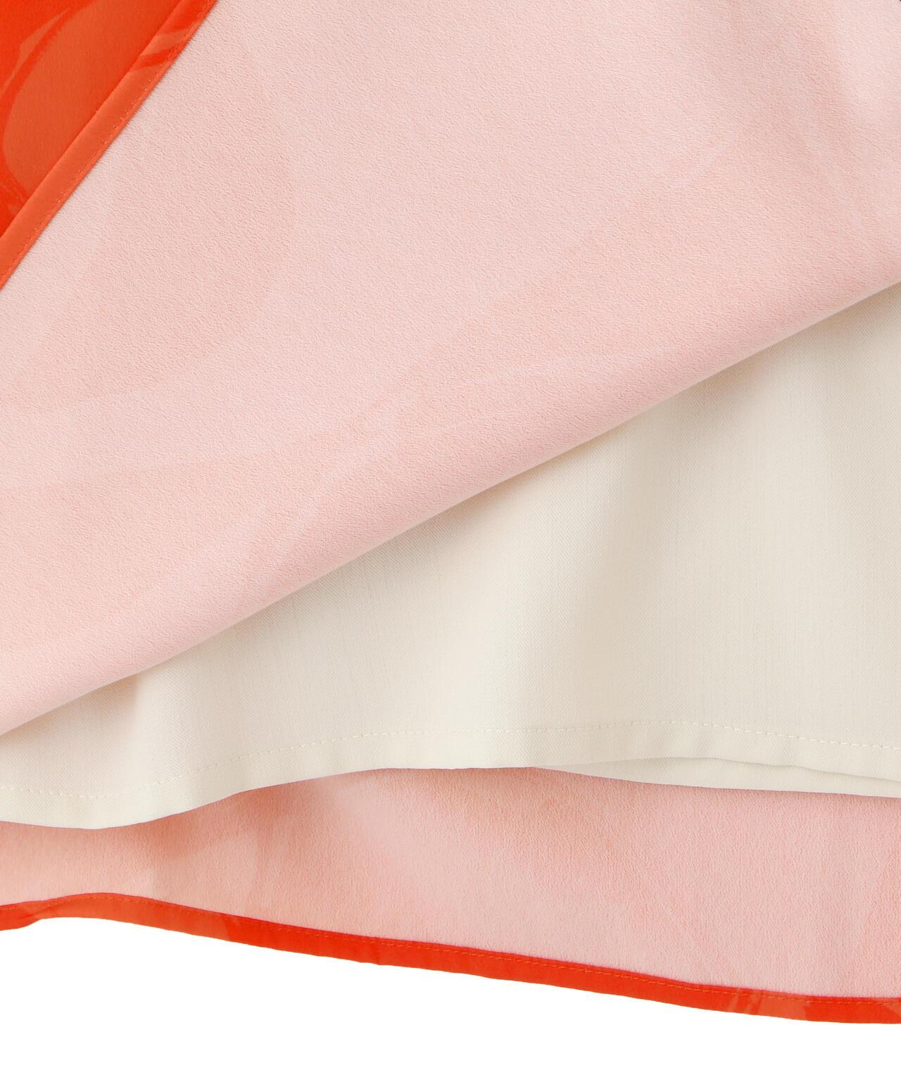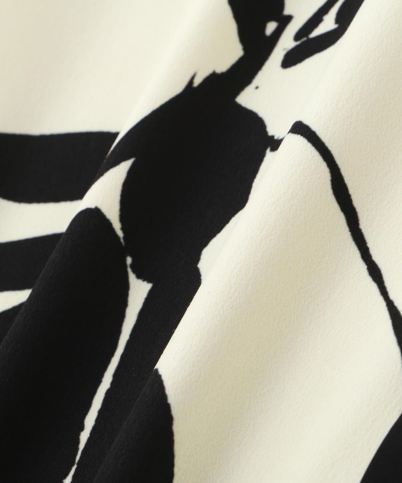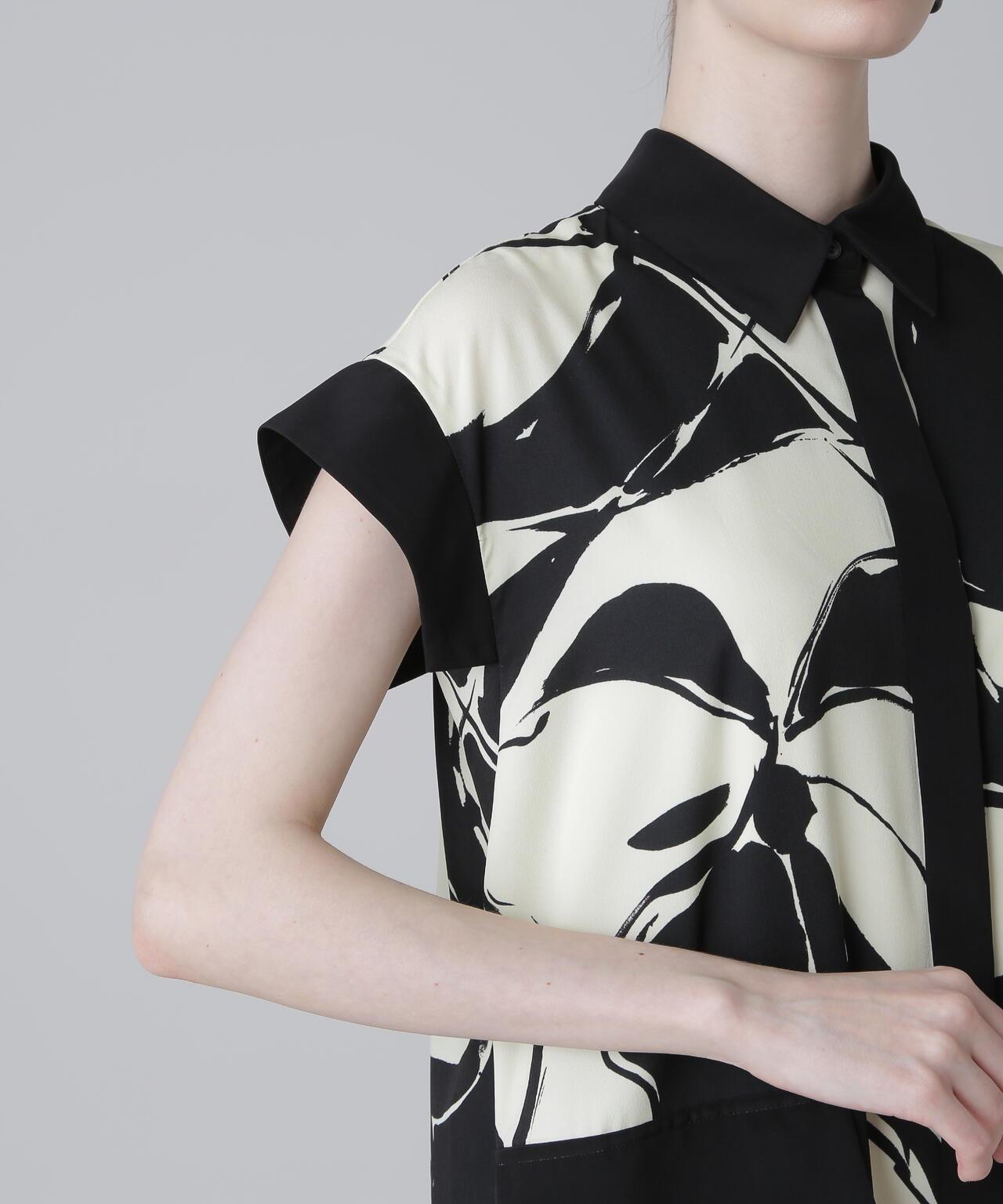彩色疊層印花連衣裙在花朵圖案的基礎上,下襬處又增加了一條彩色透明線。圖案左右不對稱,使這款連衣裙成為一件式設計。領子、門襟、袖子和口袋均由不同的黑色面料製成。這款連衣裙採用柔軟輕盈的設計面料剪裁而成,帶有粉質觸感,並印有大膽的圖案。