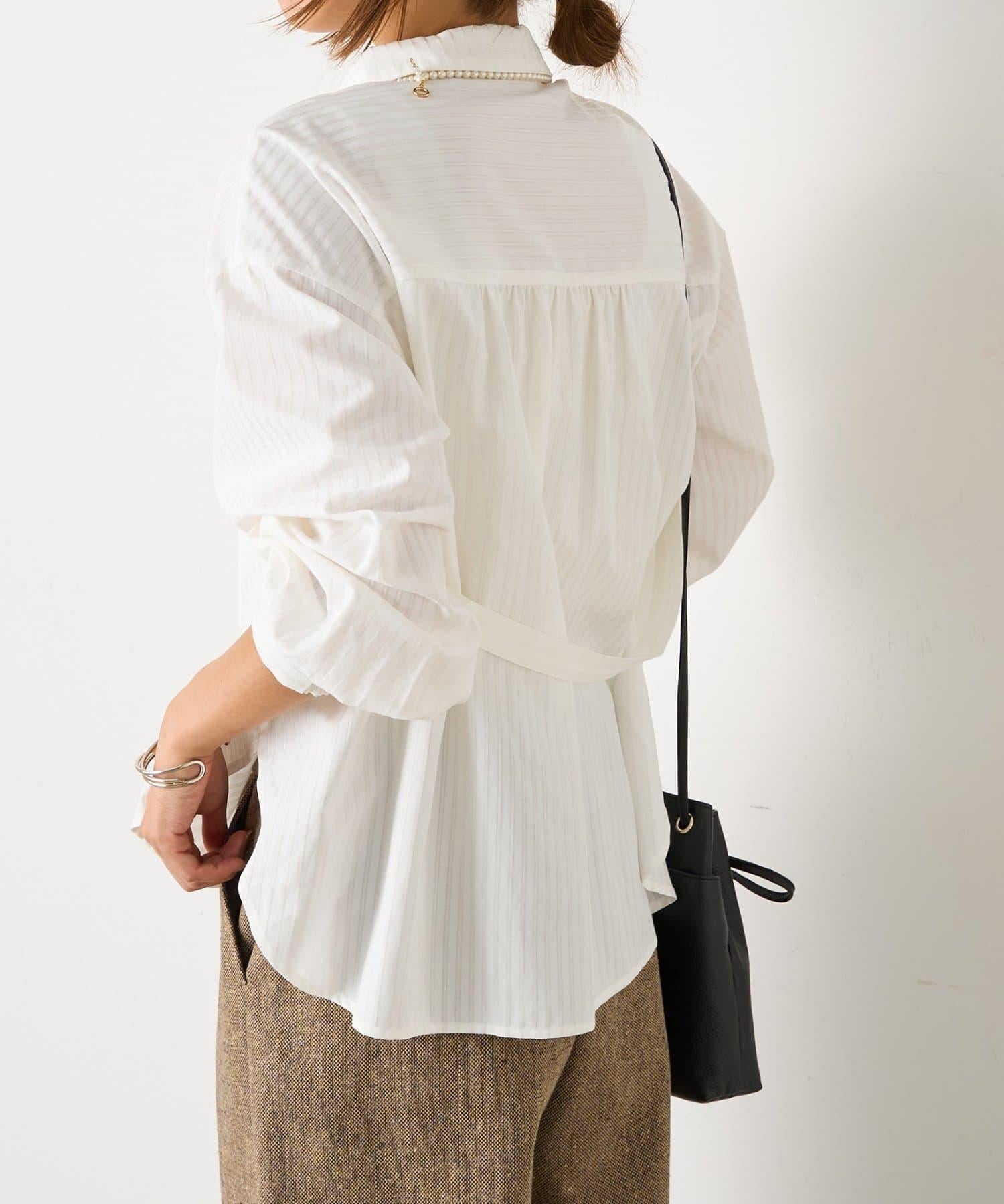 長袖襯衫,有領子,背部有標籤細節,紐扣開合。