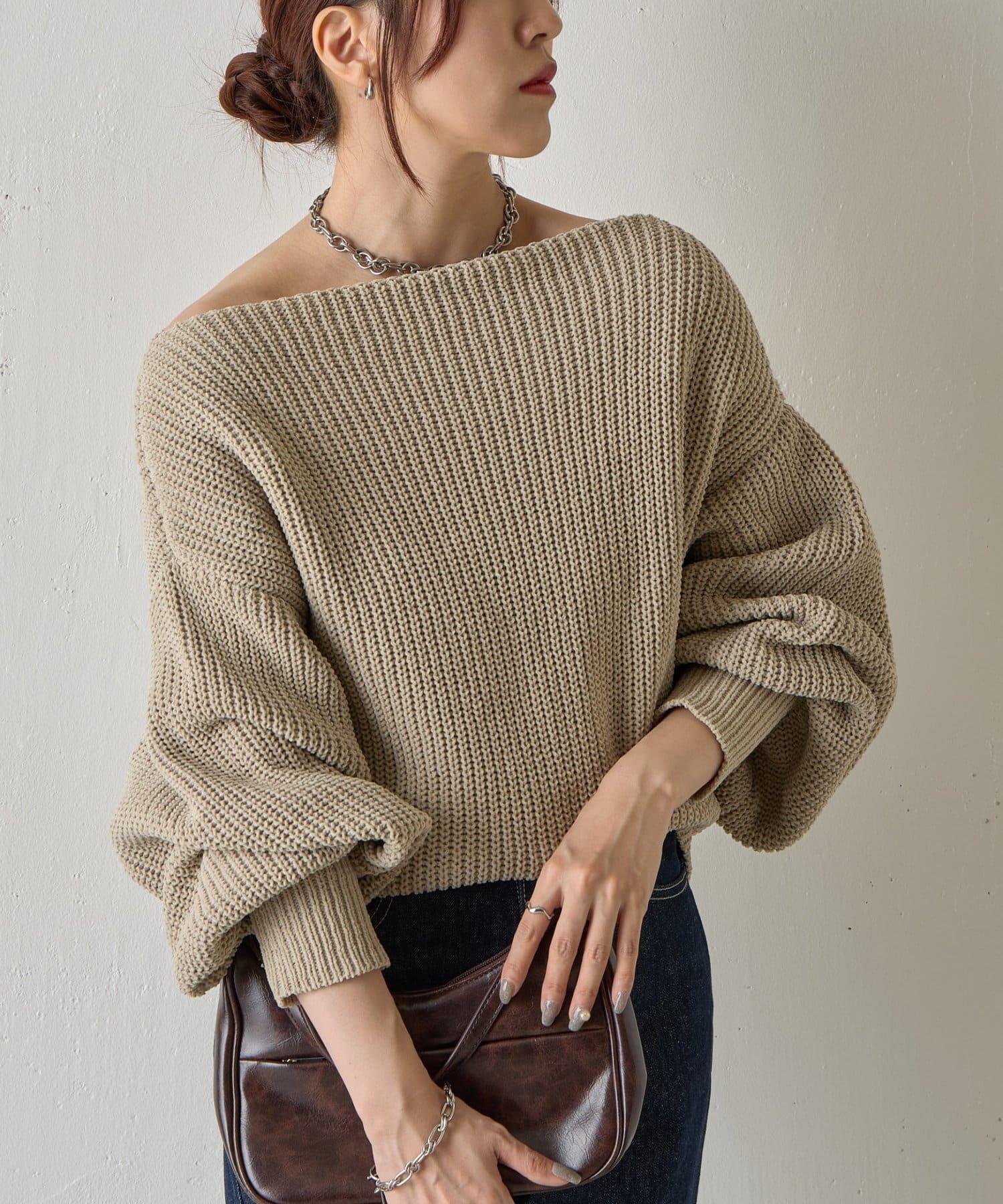 [令人印象深刻的露肩設計針織上衣]。