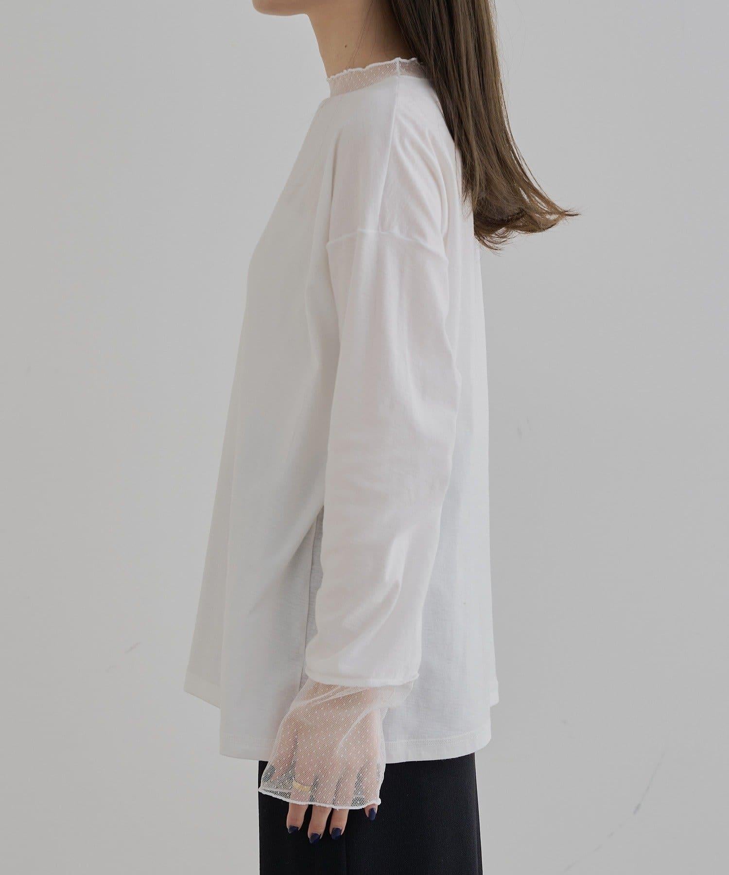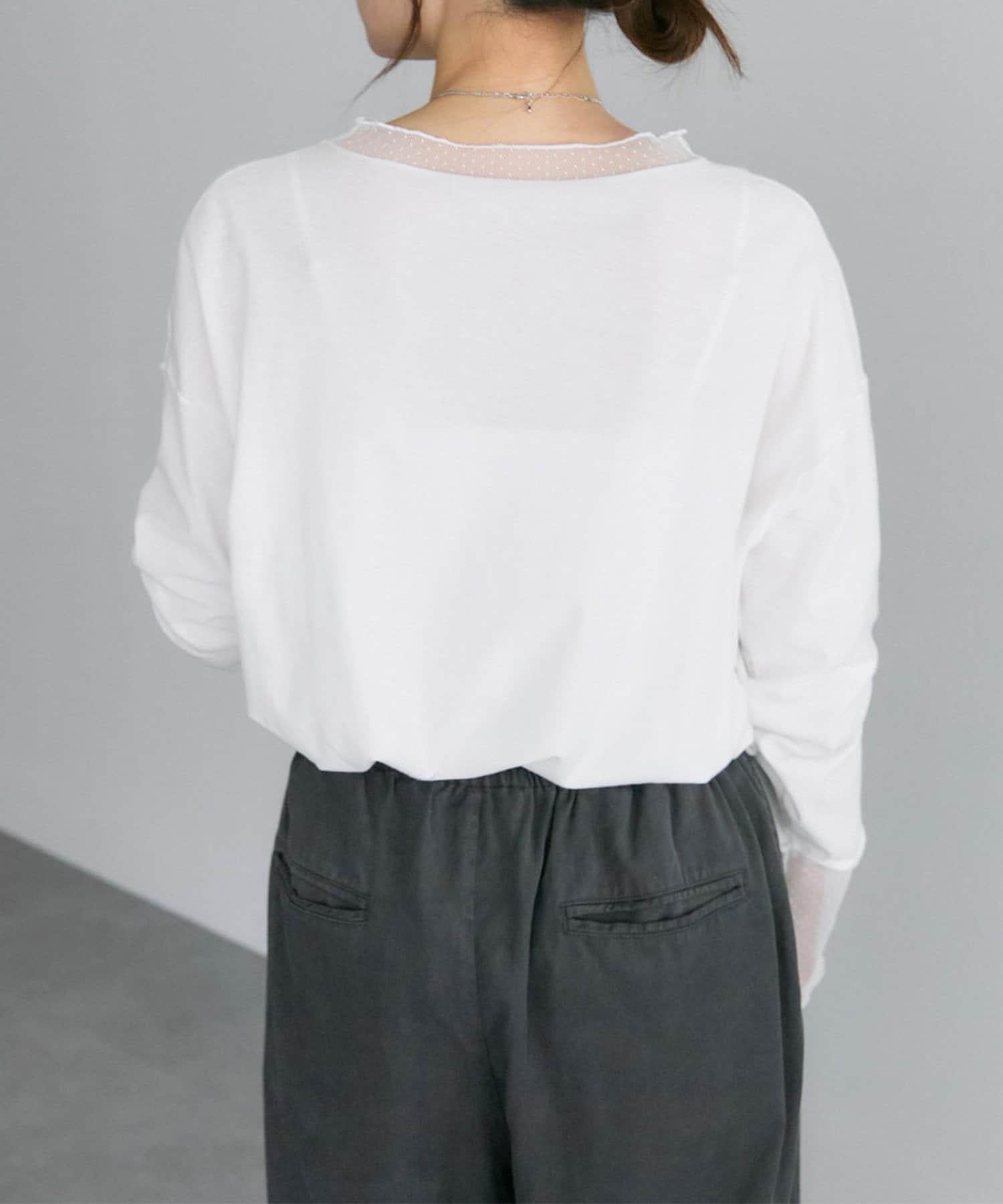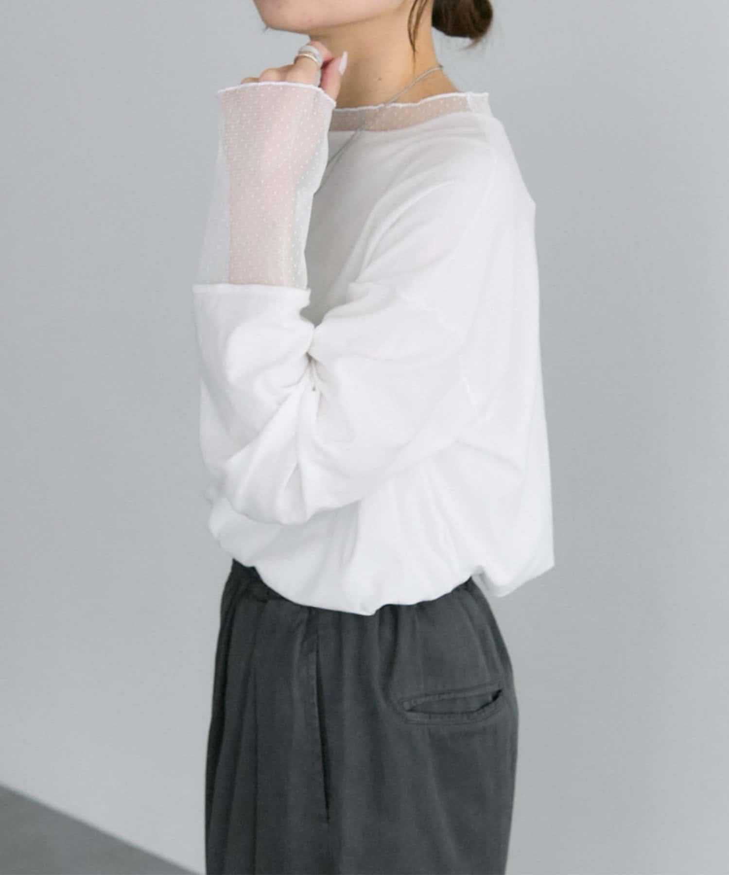這款剪裁和縫製的單品在頸部和袖子處飾有點狀薄紗。