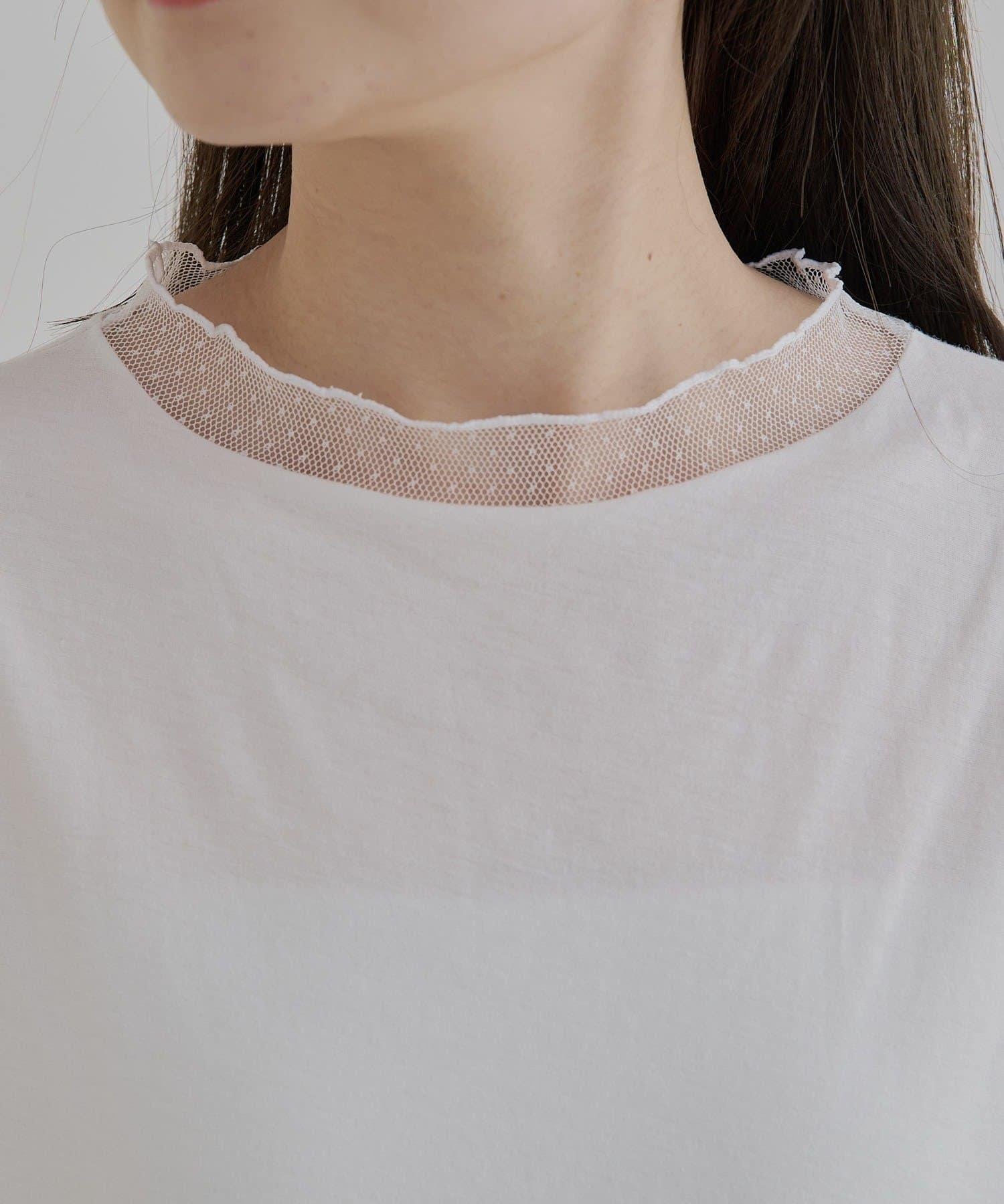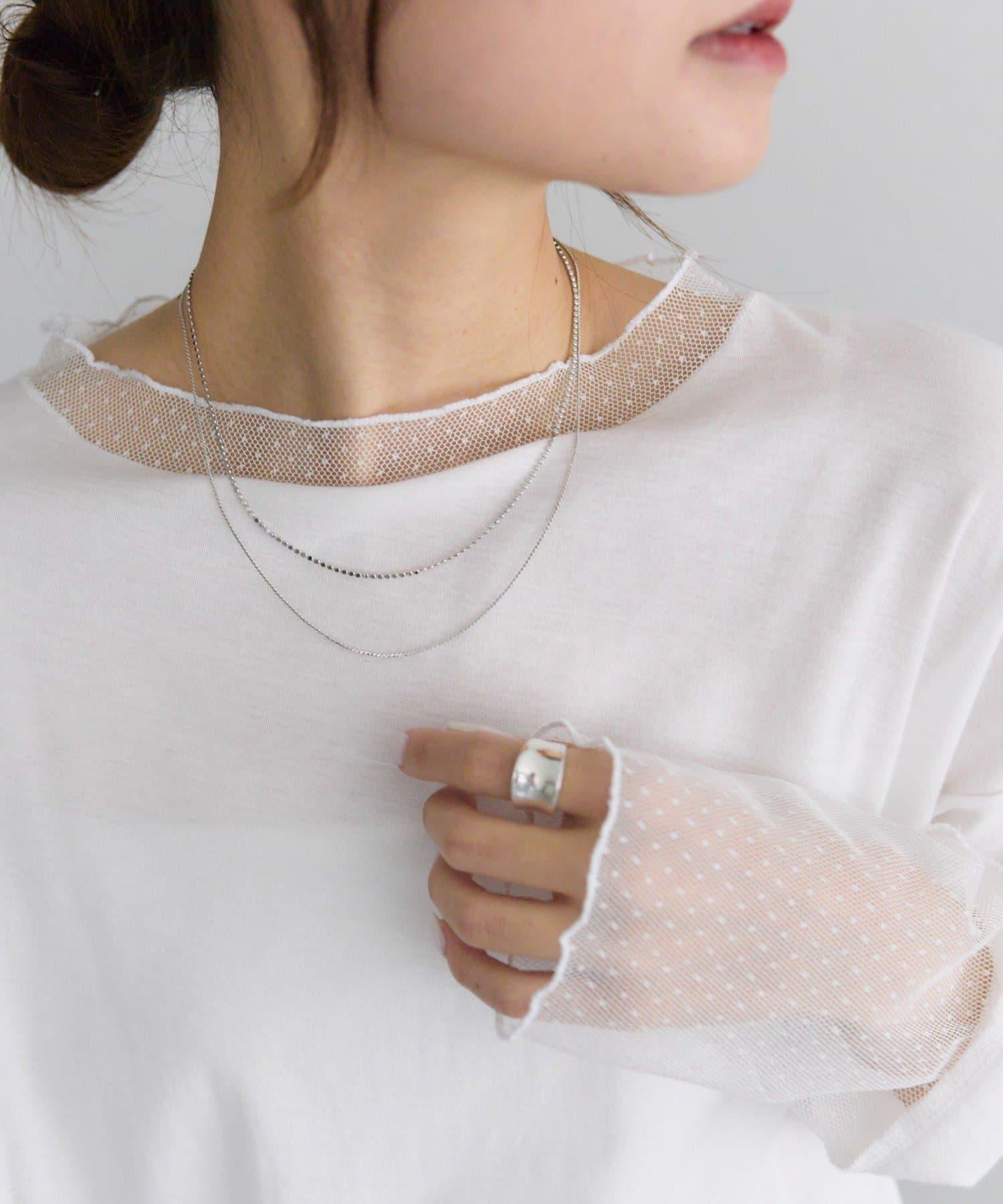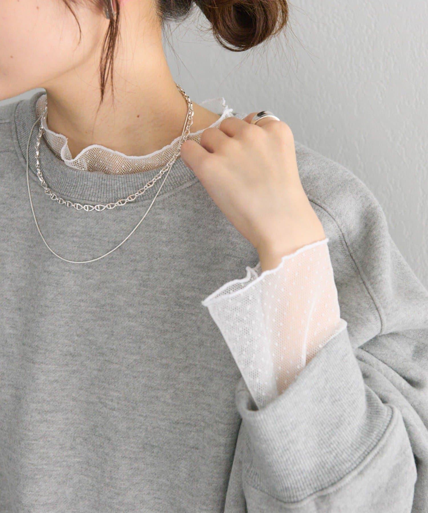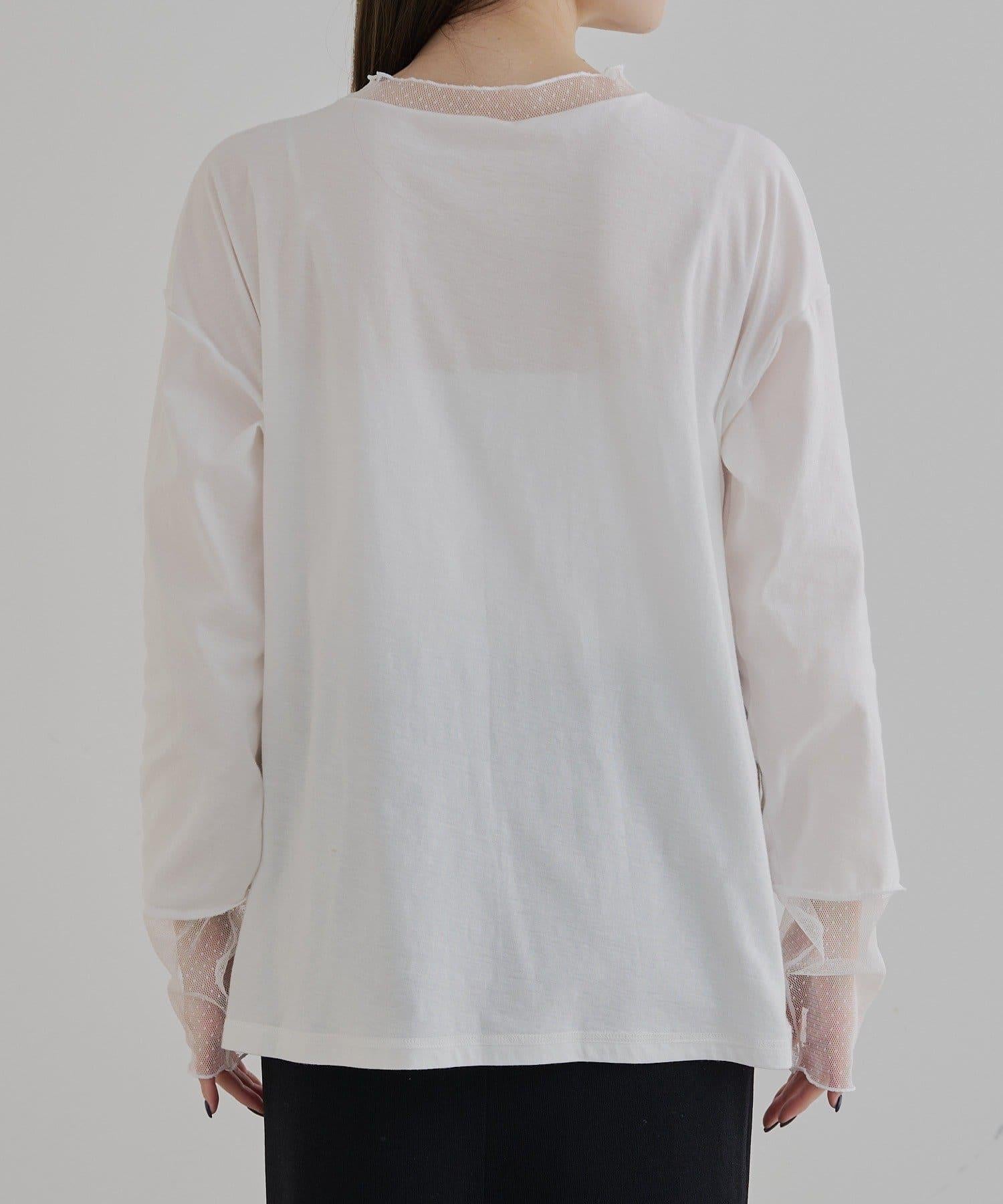 這款剪裁和縫製的單品在頸部和袖子處飾有點狀薄紗。