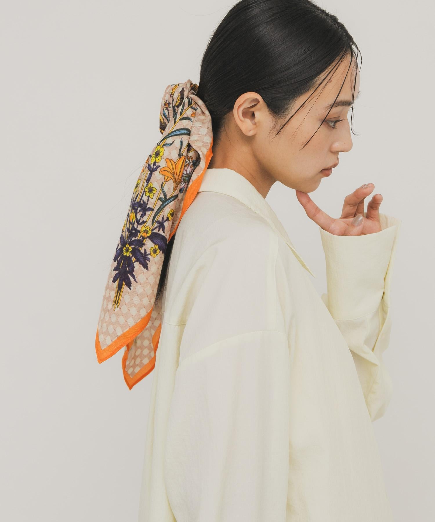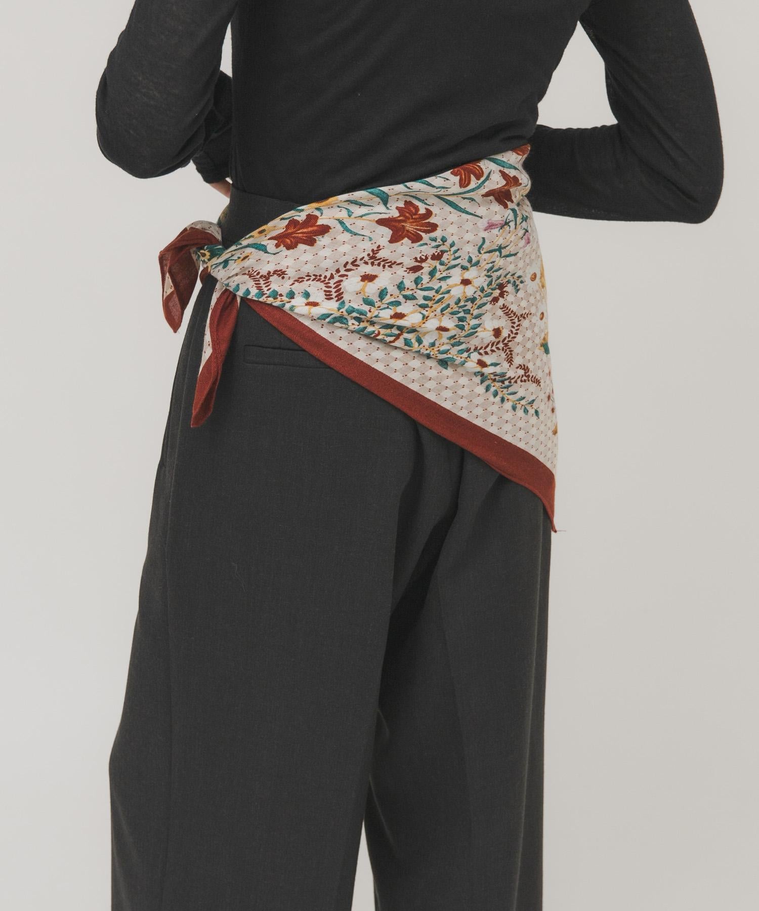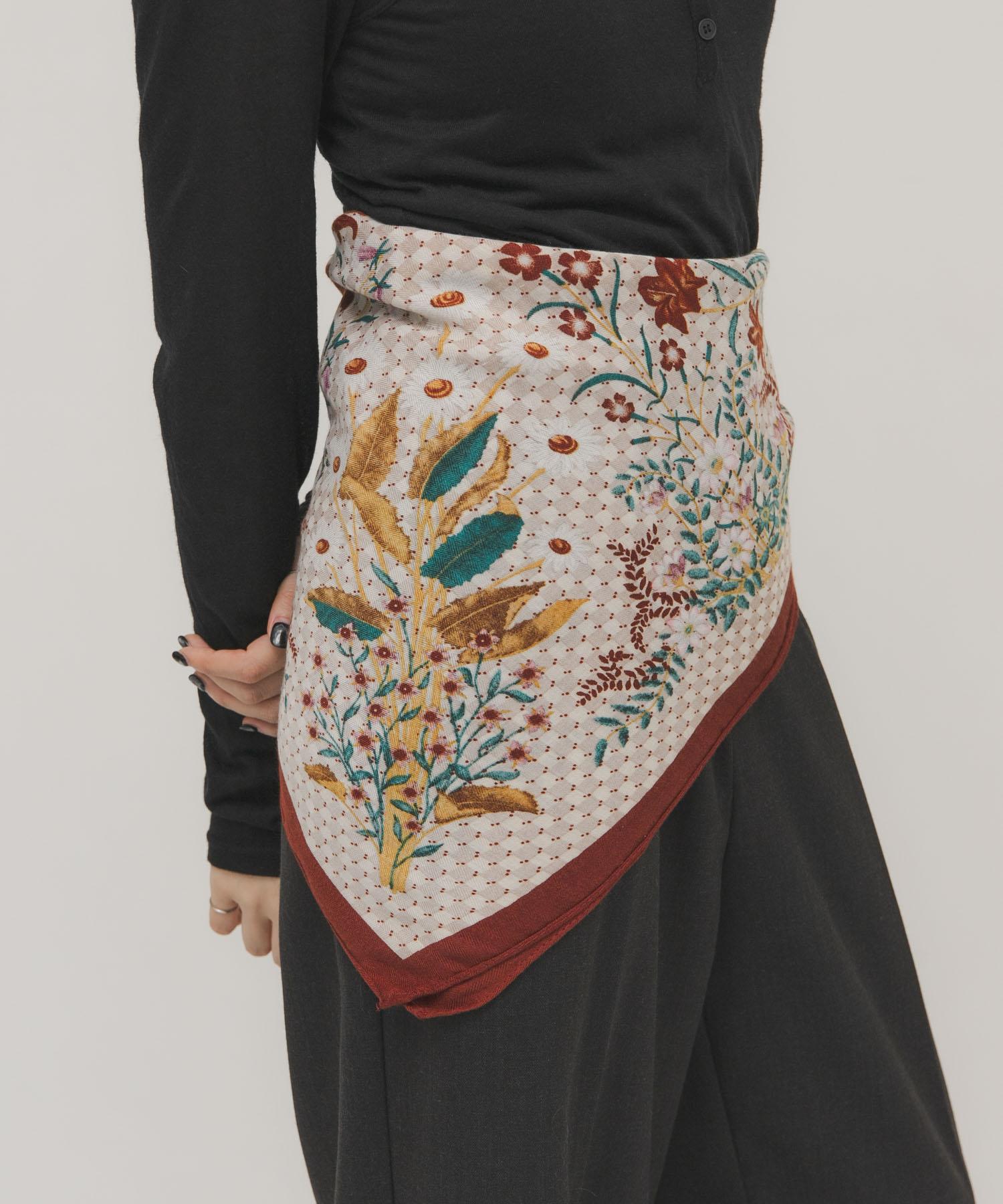 印有復古花朵的大圍巾,可隨意擺放。將它圍在腰間,搭配半身裙或掛在包包上。