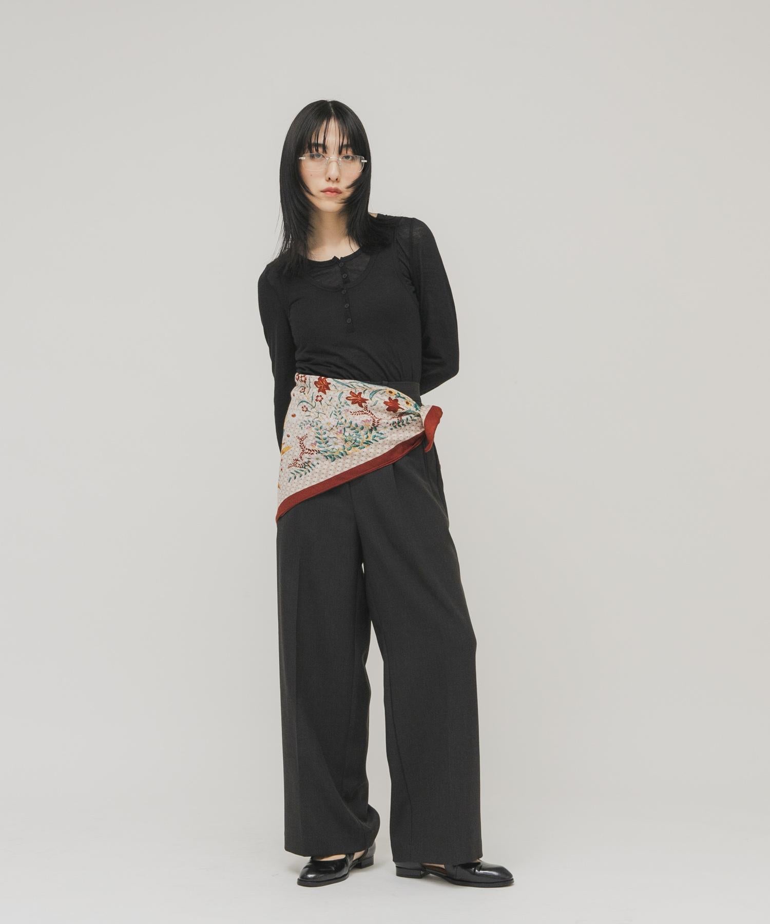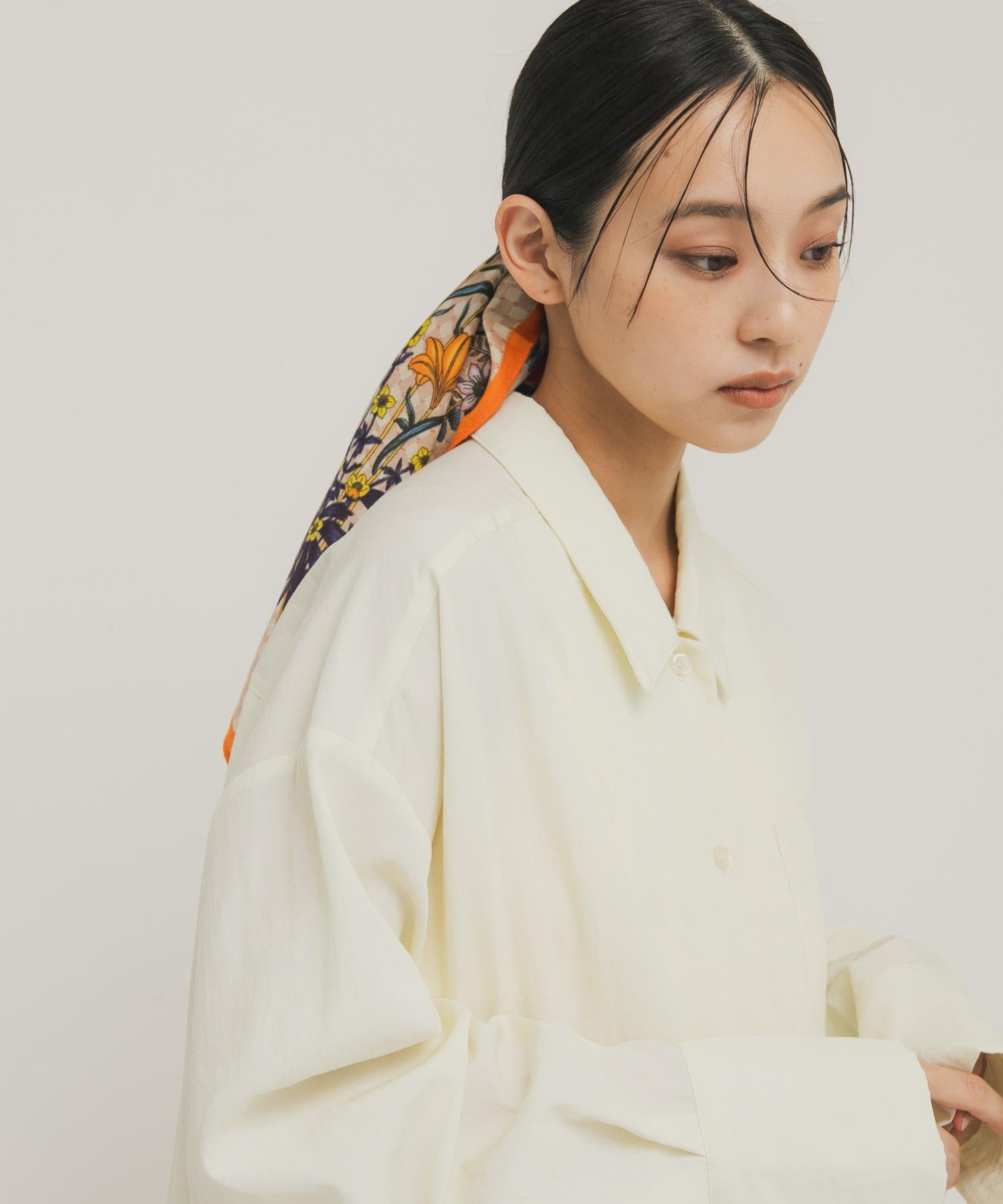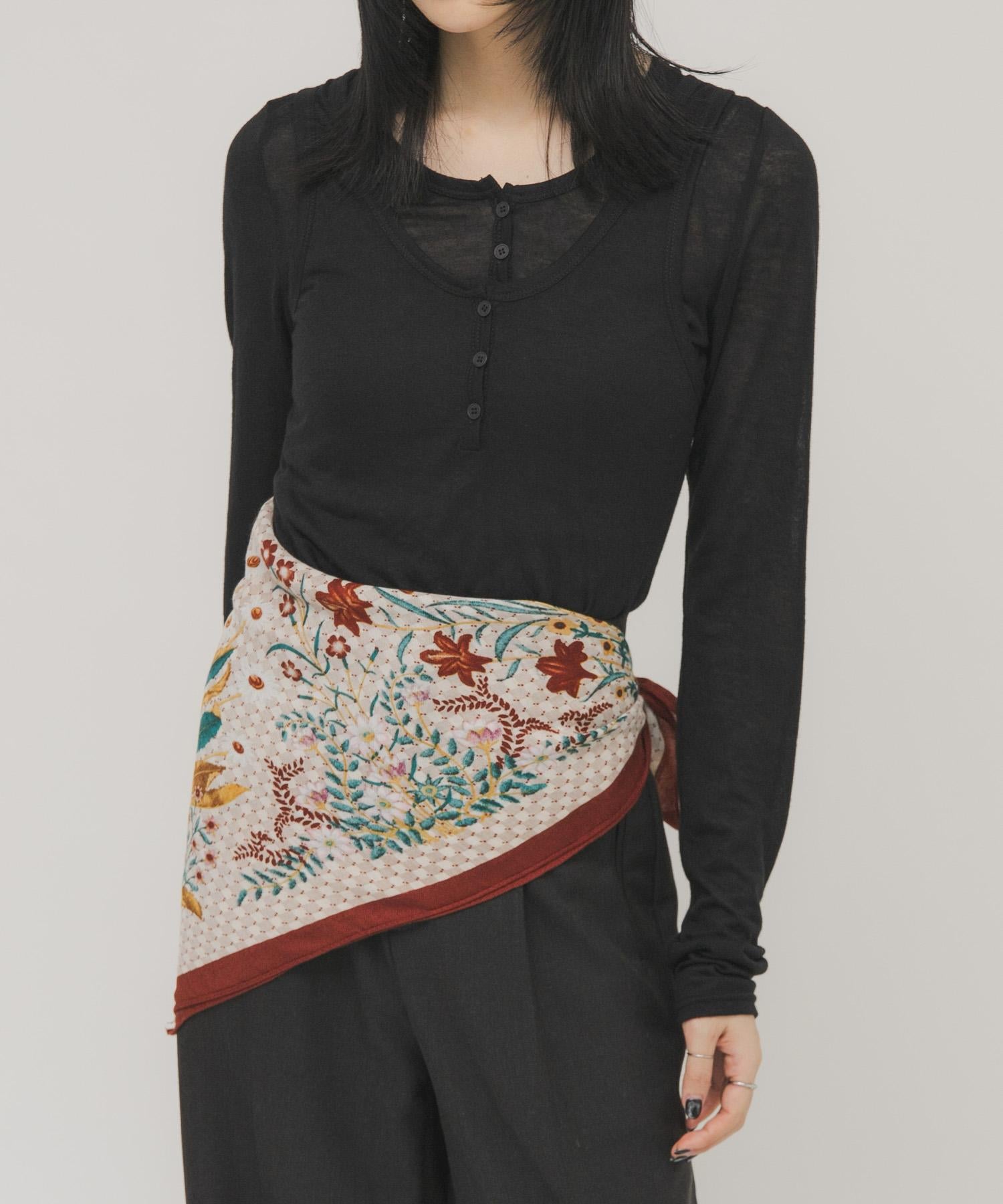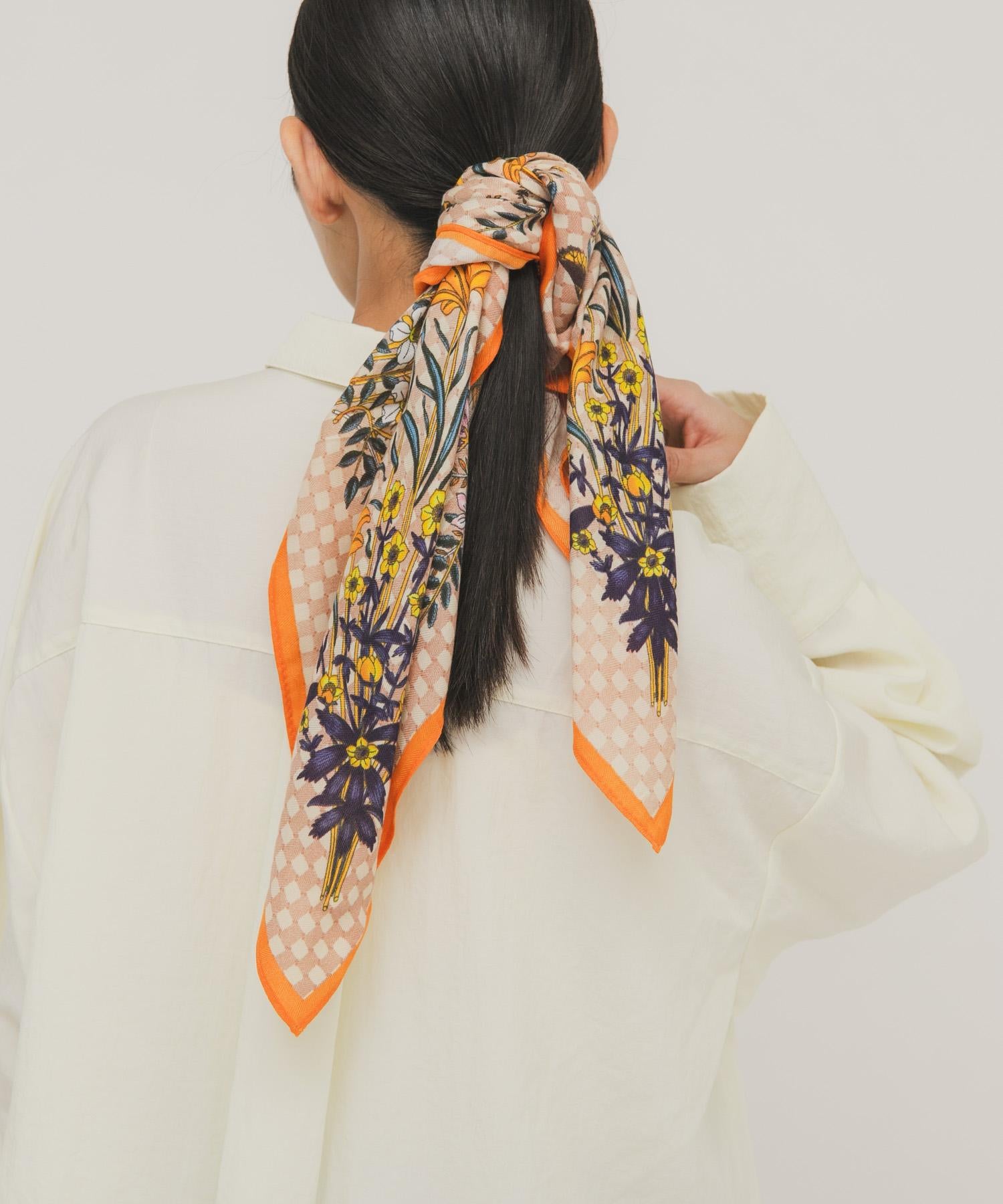 印有復古花朵的大圍巾,可隨意擺放。將它圍在腰間,搭配半身裙或掛在包包上。