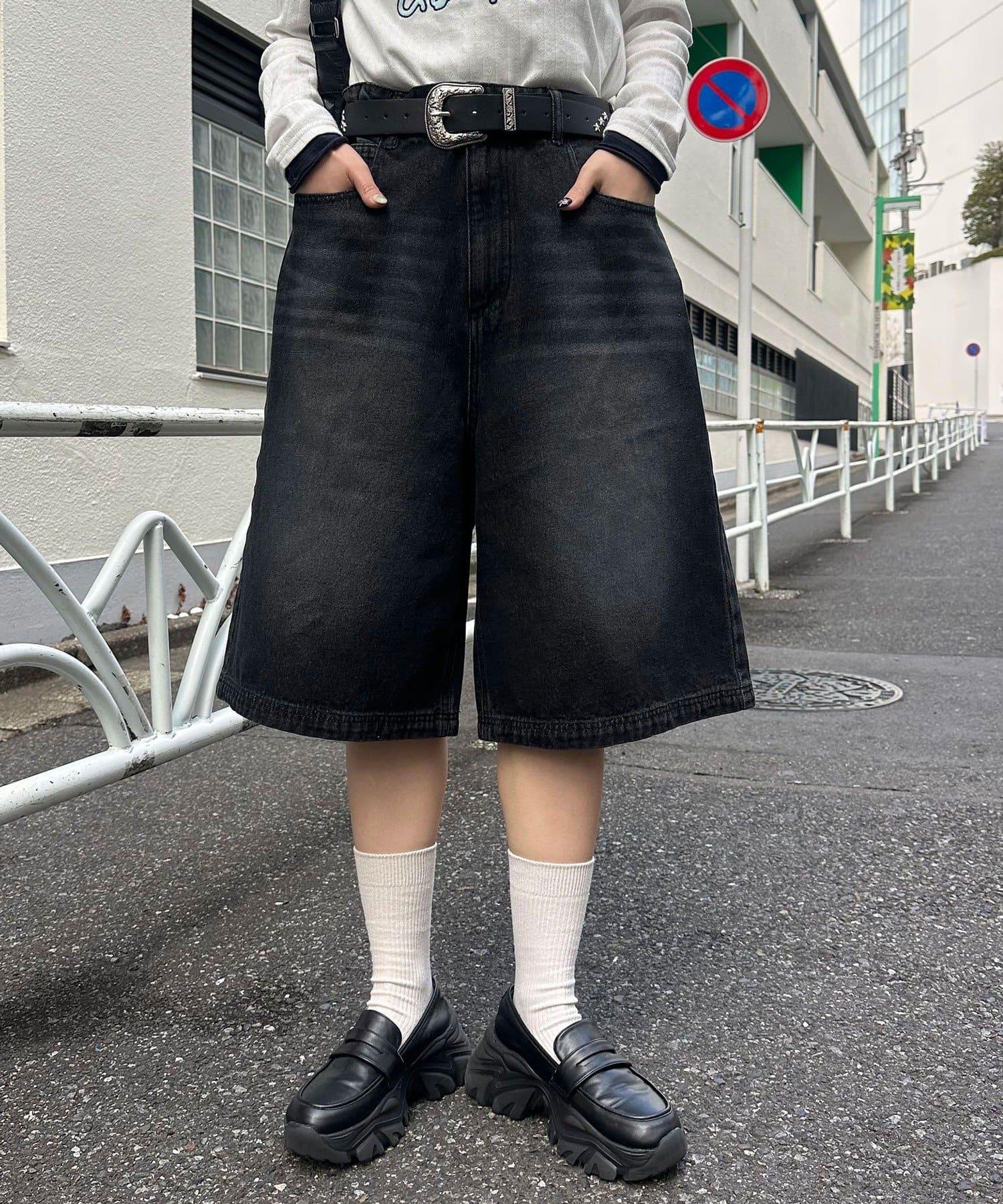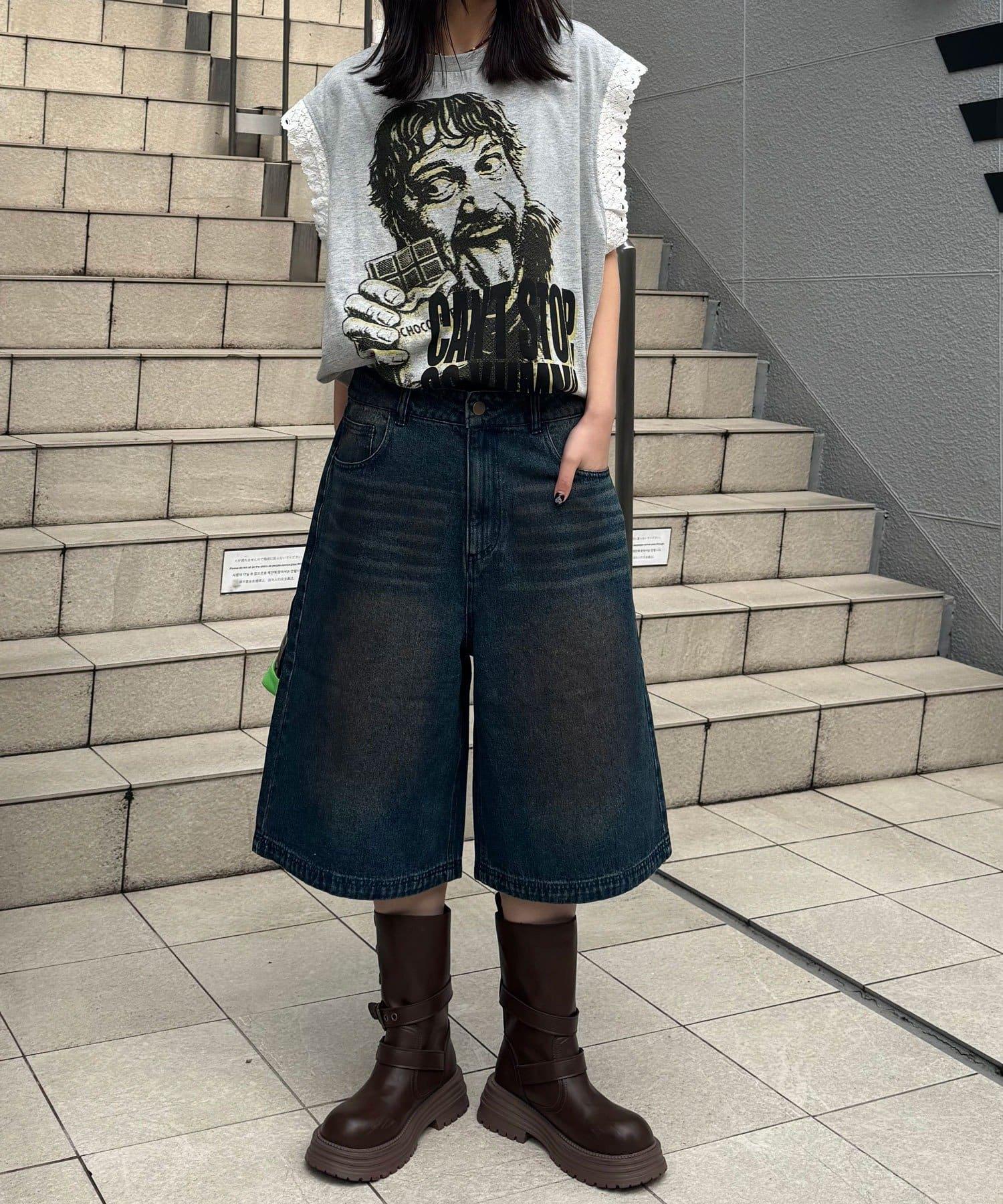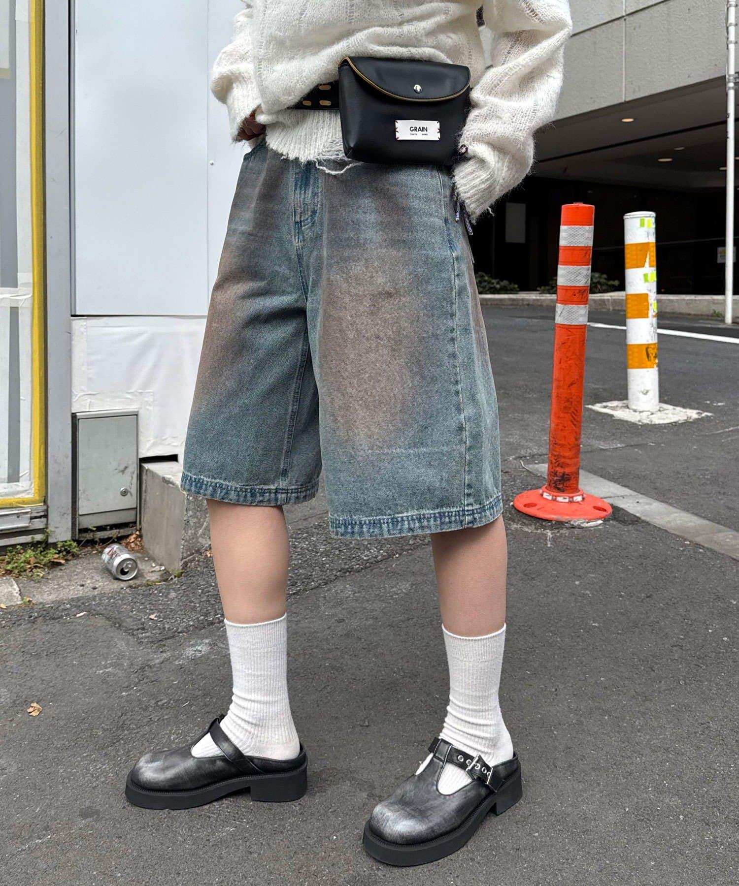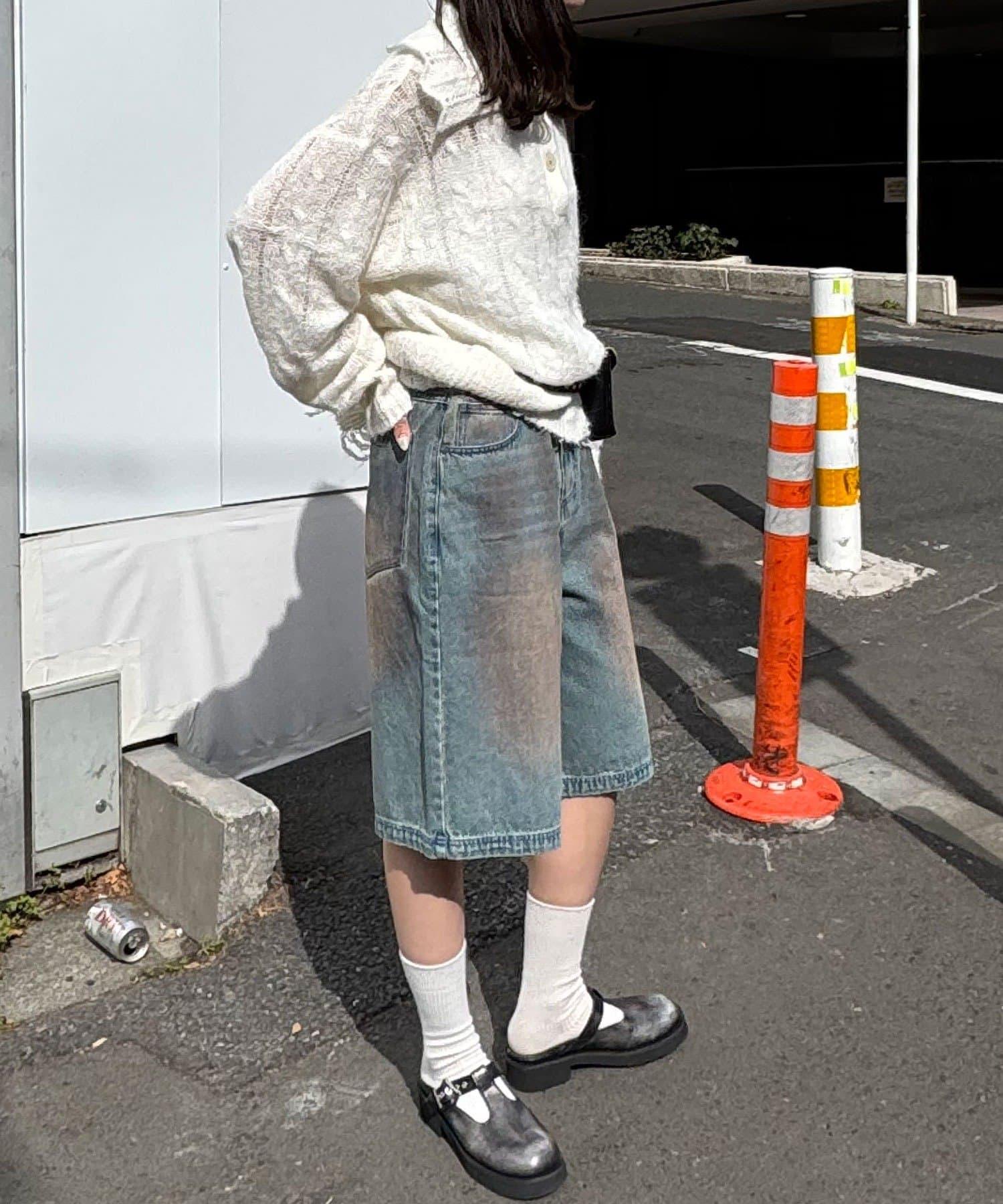 牛仔短褲採用寬鬆剪裁,褪色後的復古效果十分搶眼。