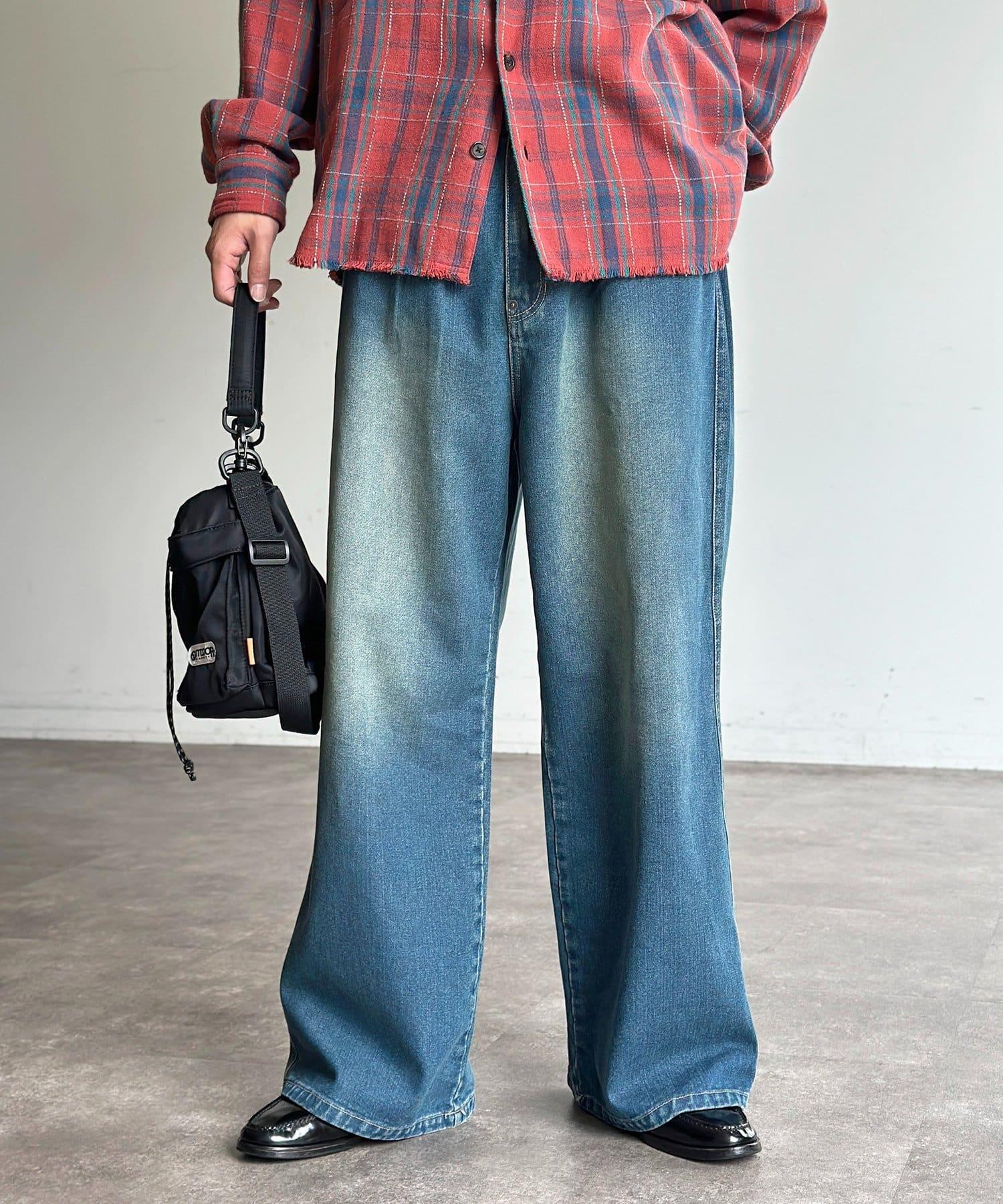 復古風格的牛仔褲,版型適度寬鬆,時尚感十足。