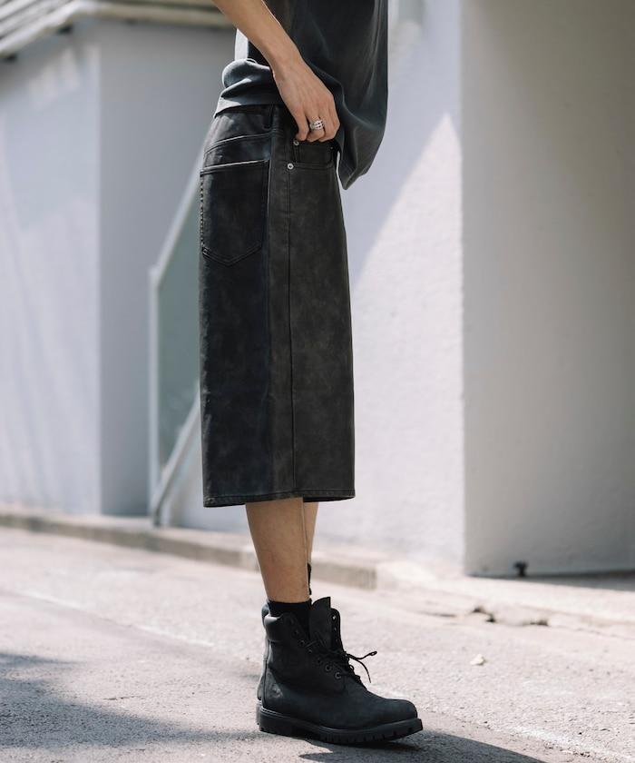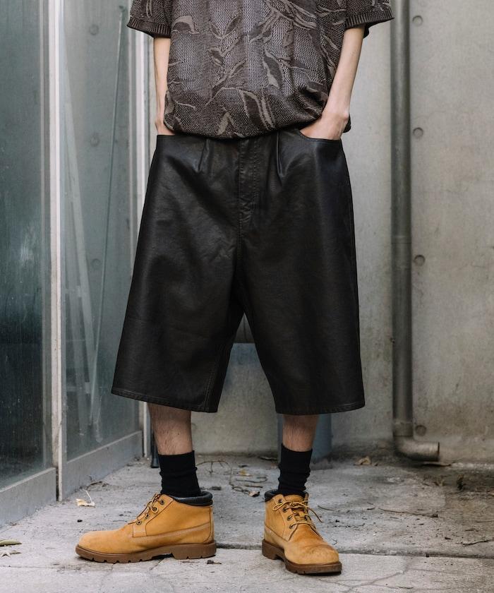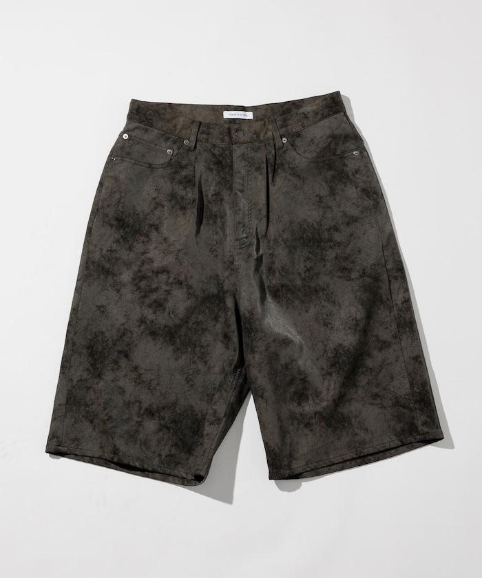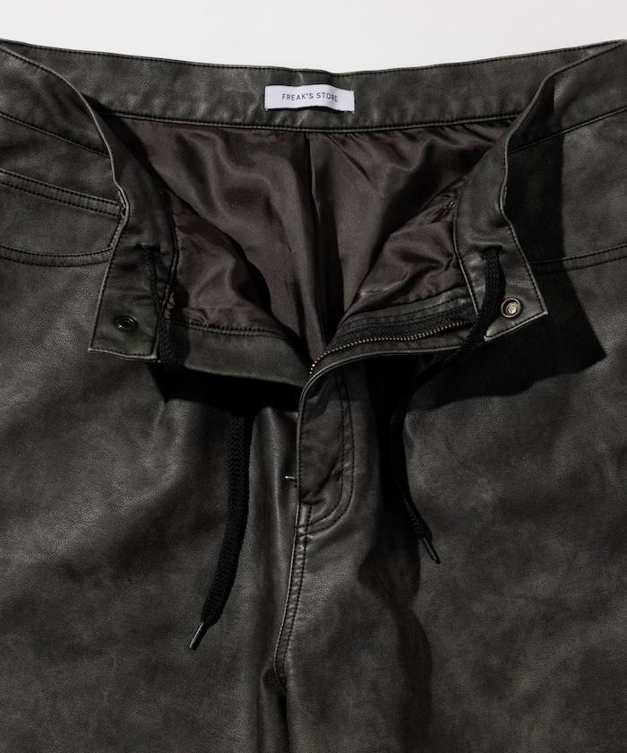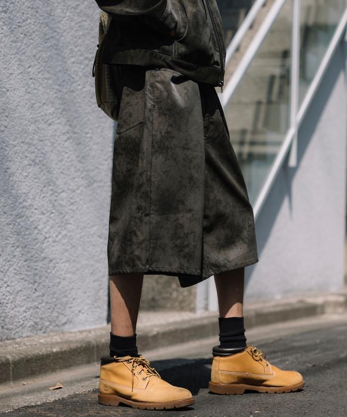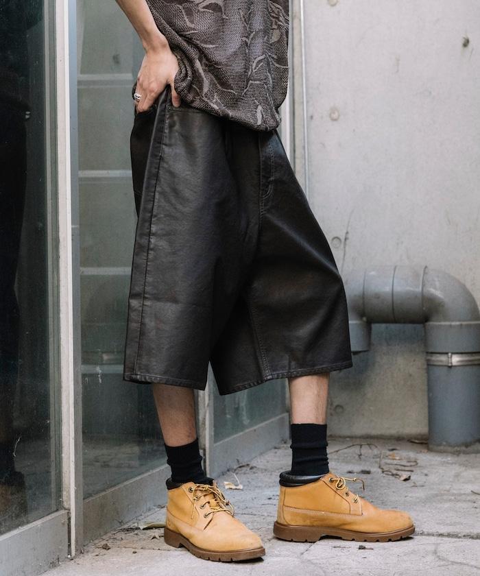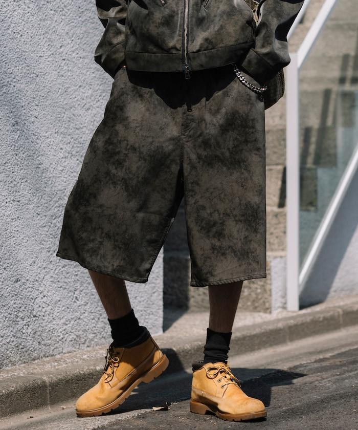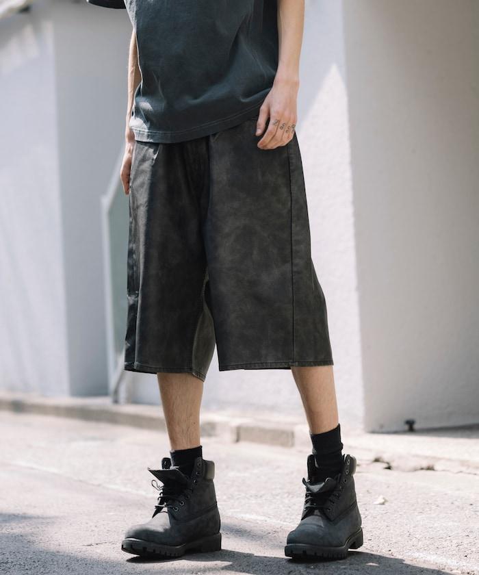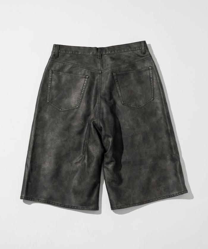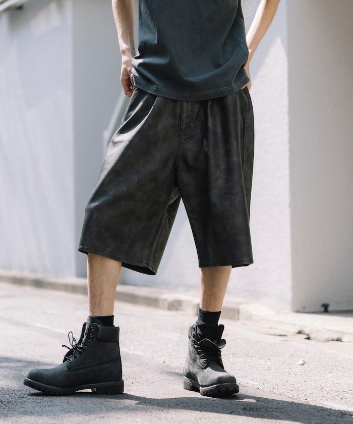 合成革寬鬆短褲,採用時尚的水洗面料。